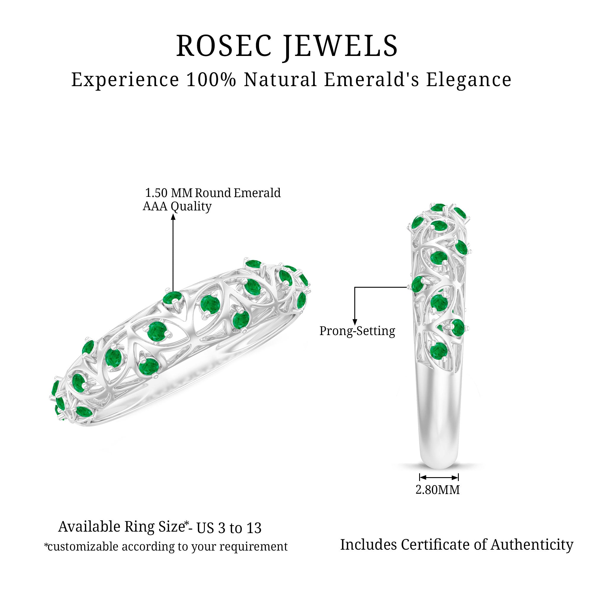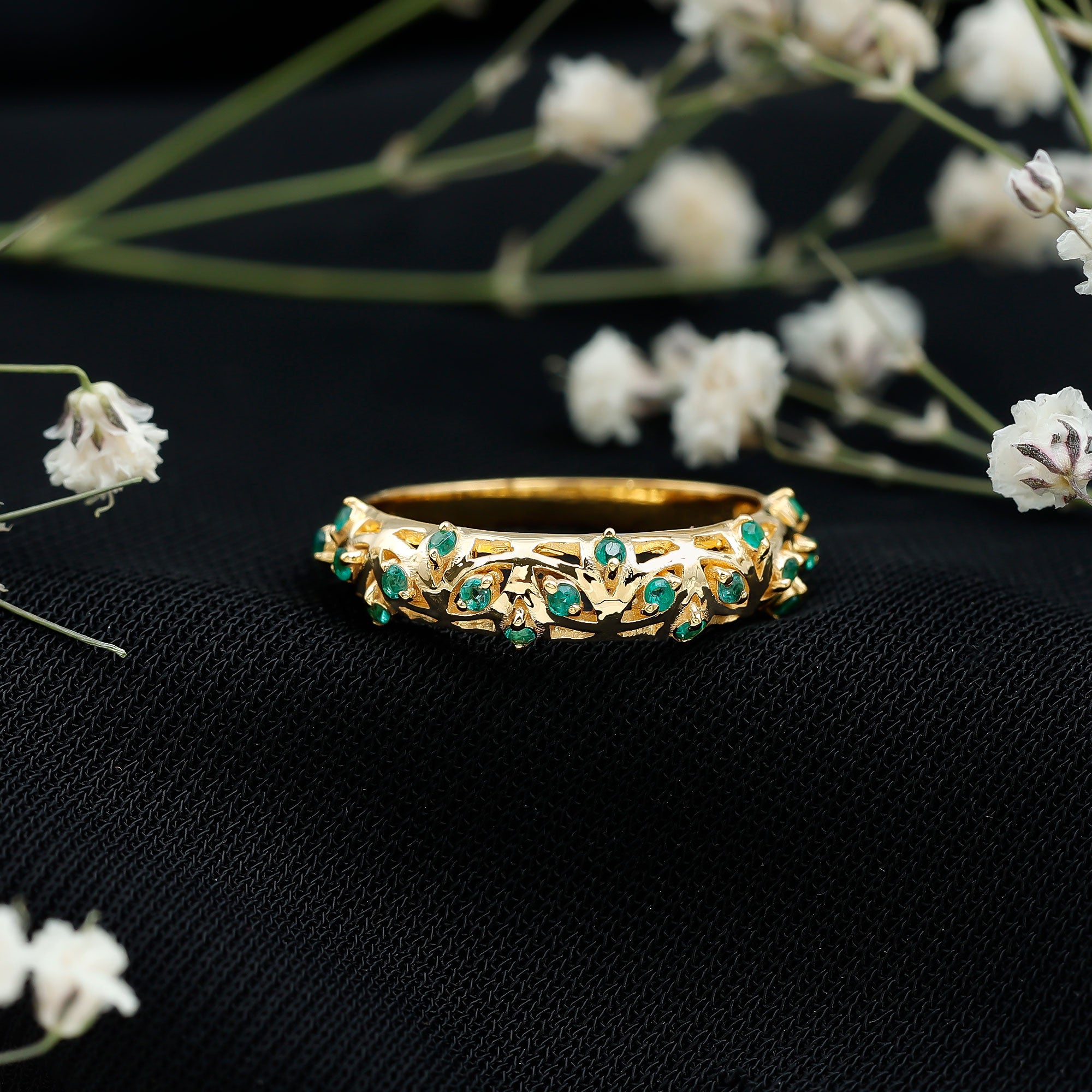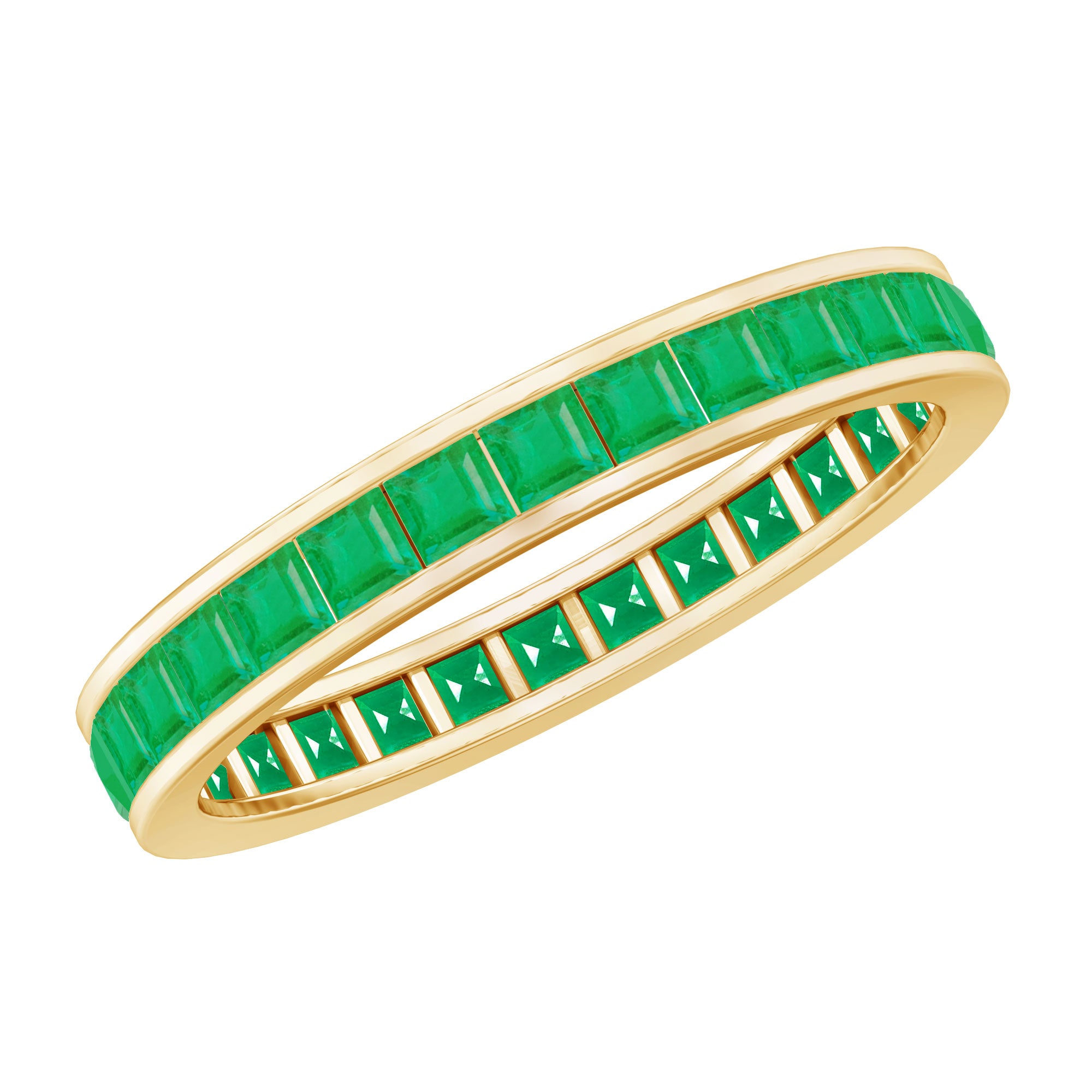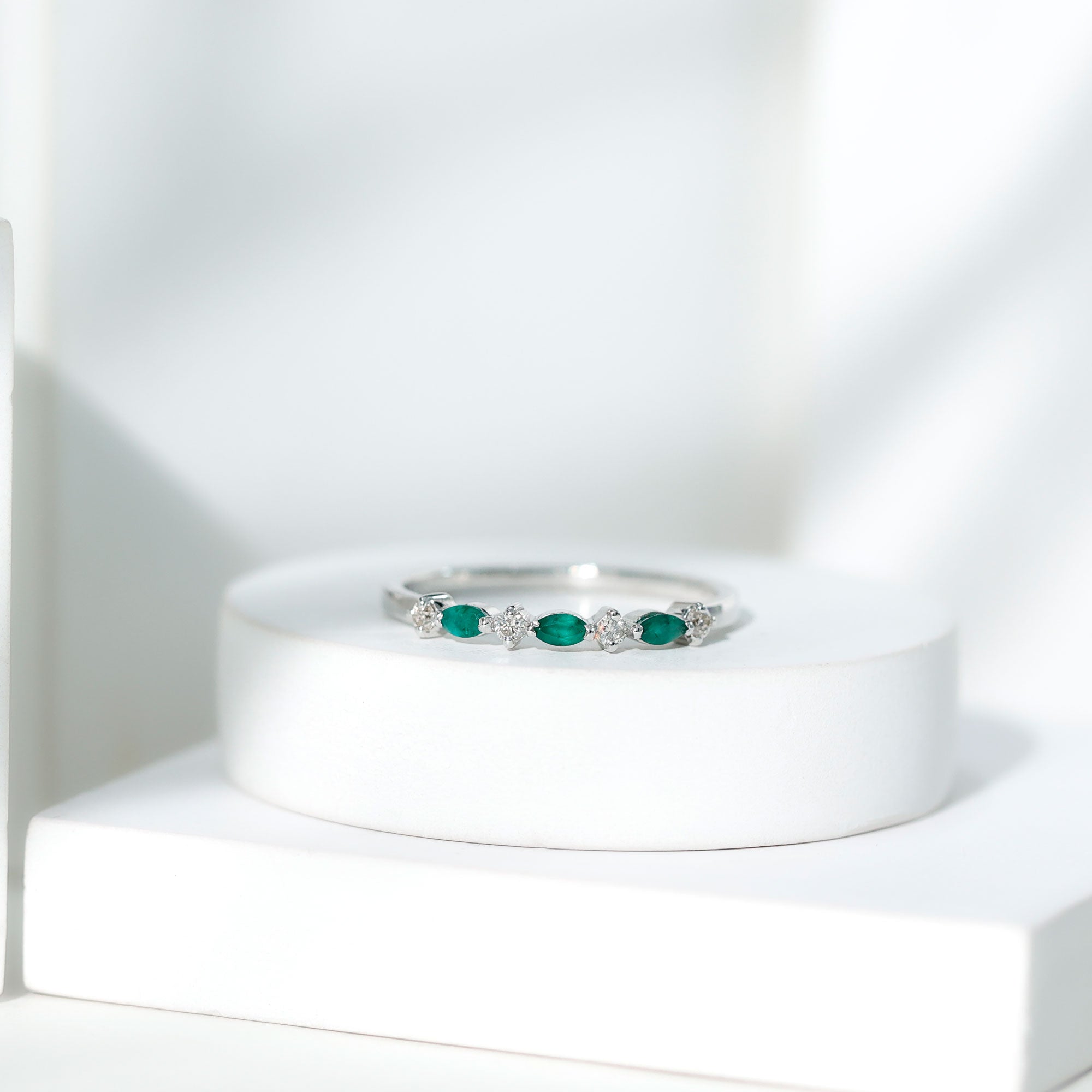Half-eternity bands offer comfort for daily wear, while full-eternity styles deliver maximum emerald coverage and visual impact.