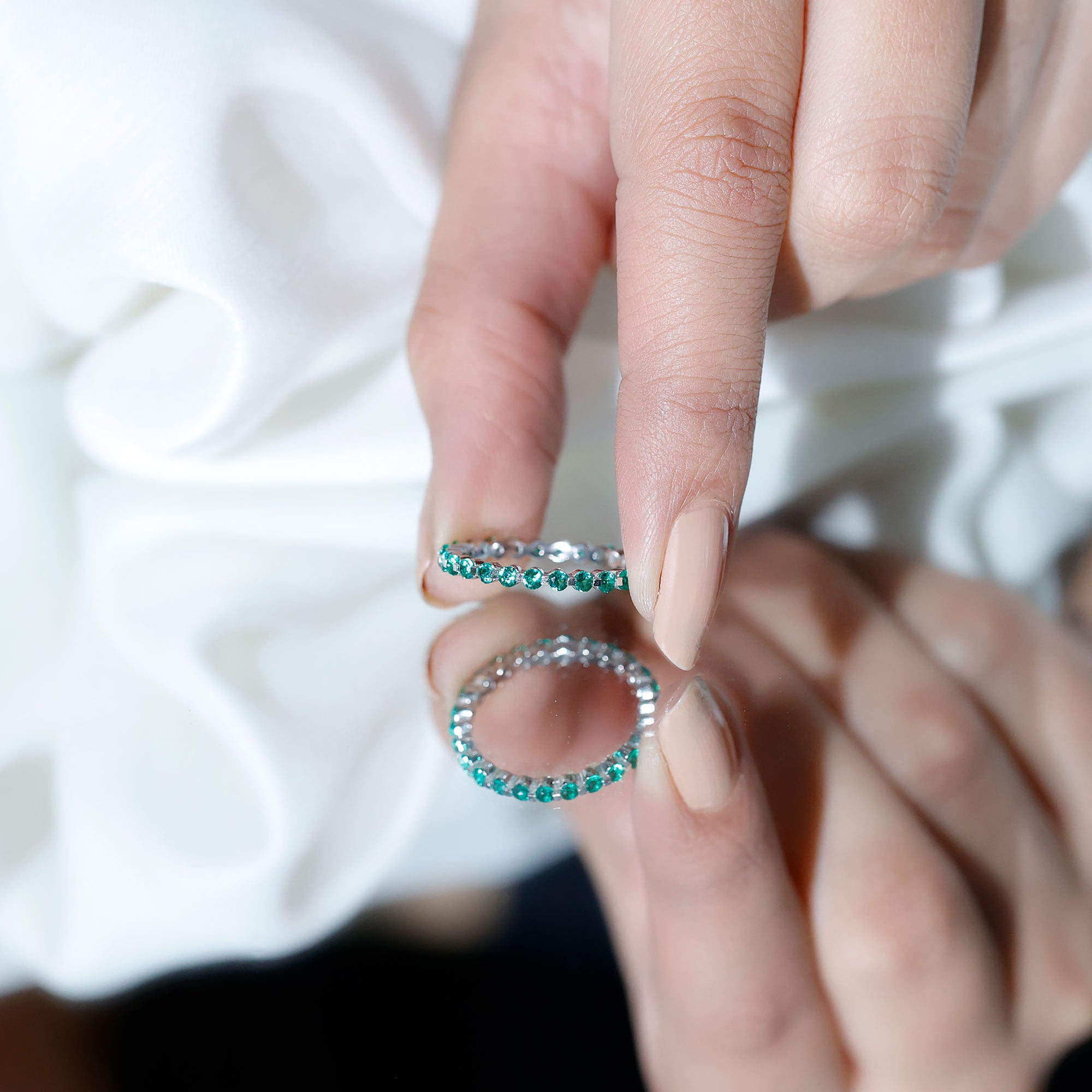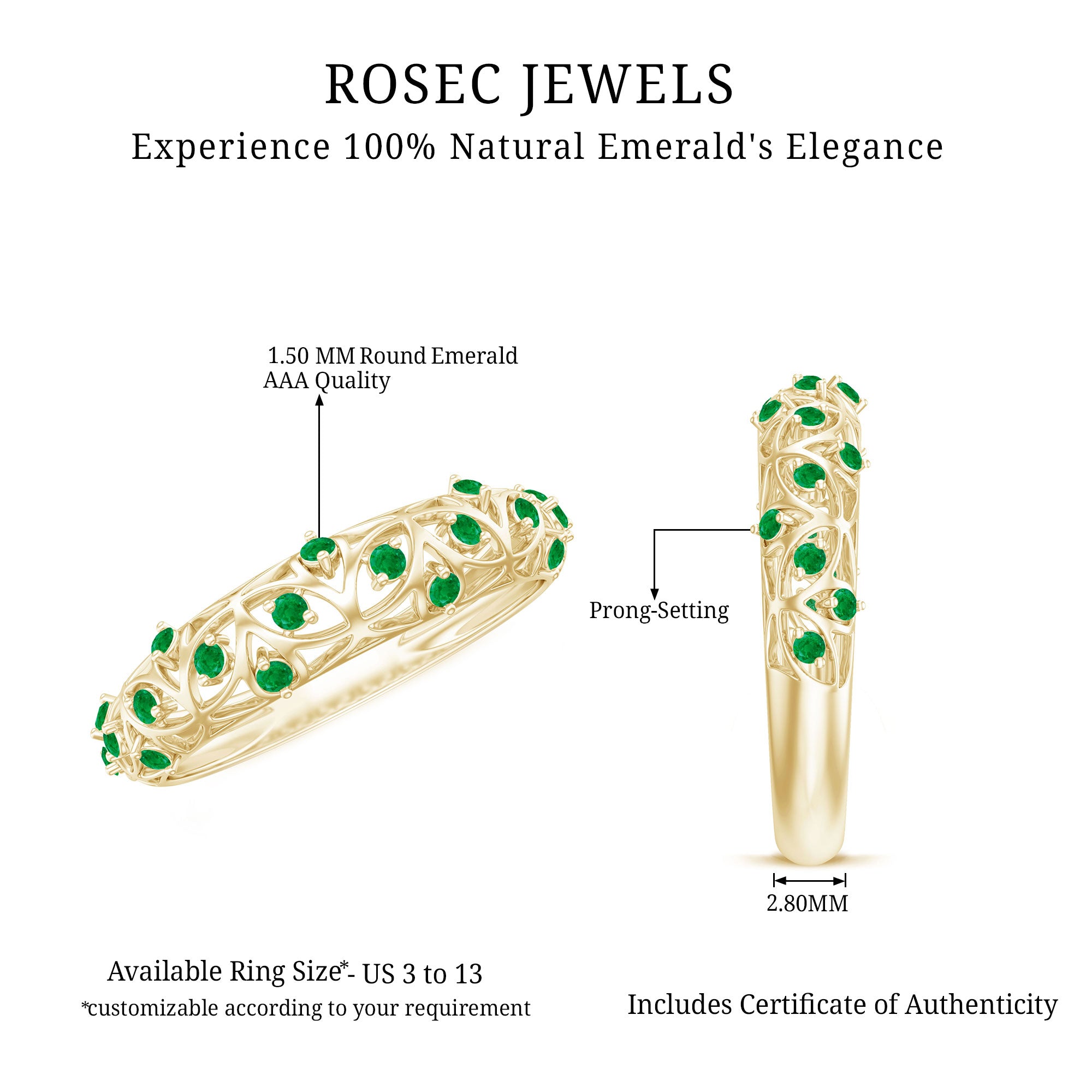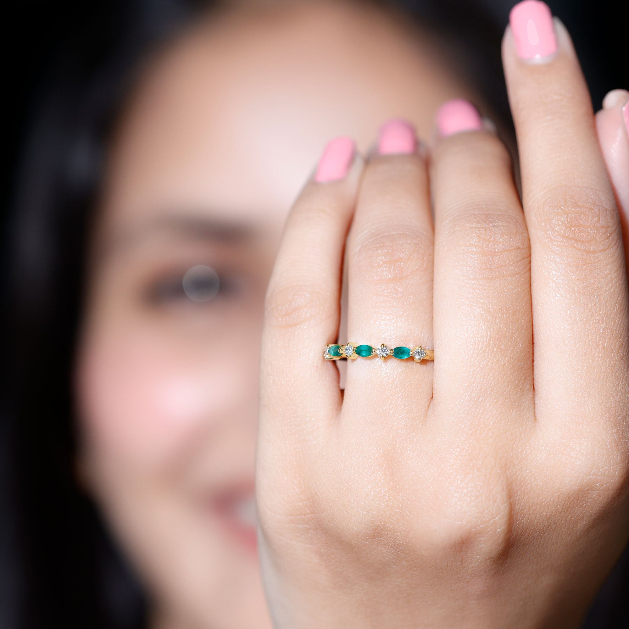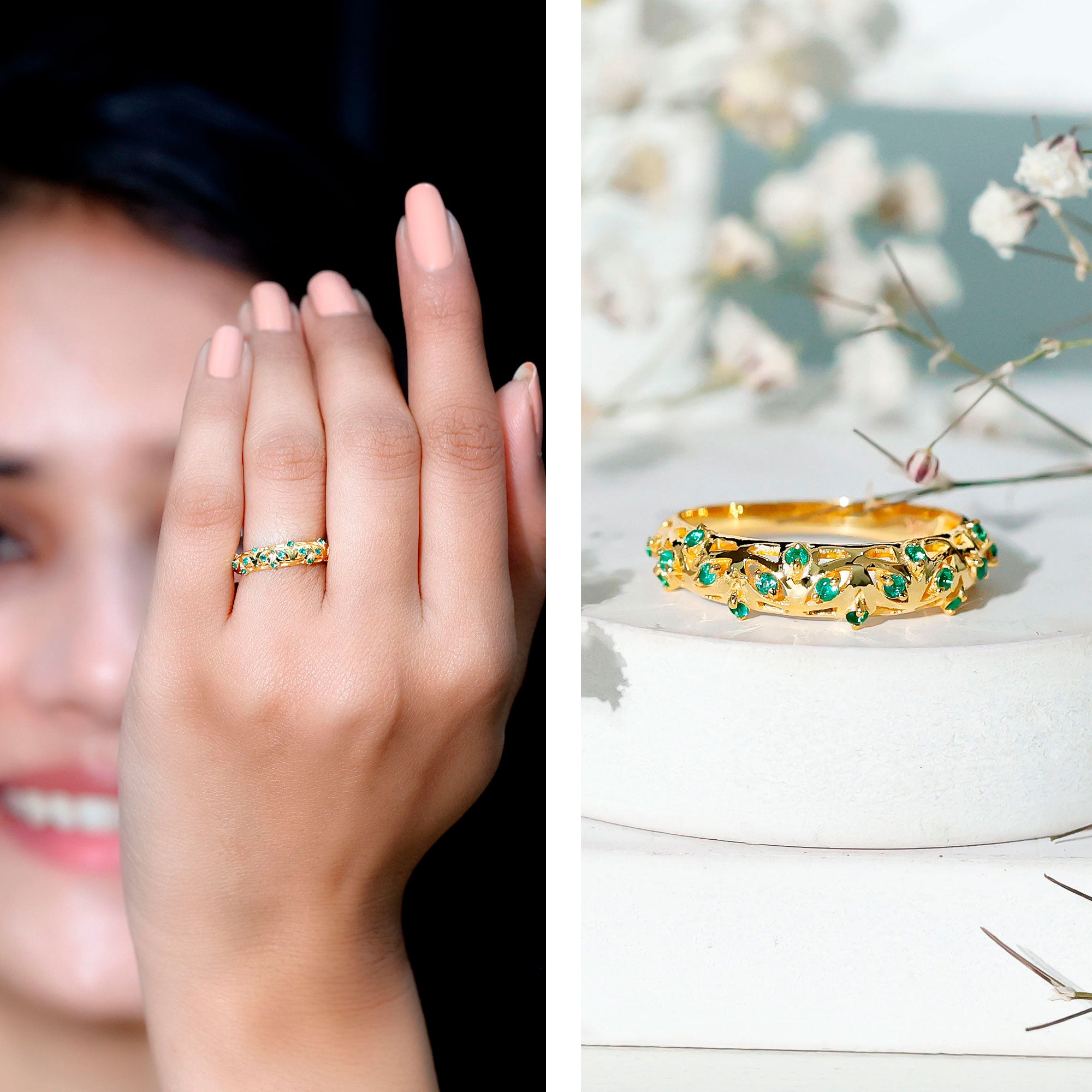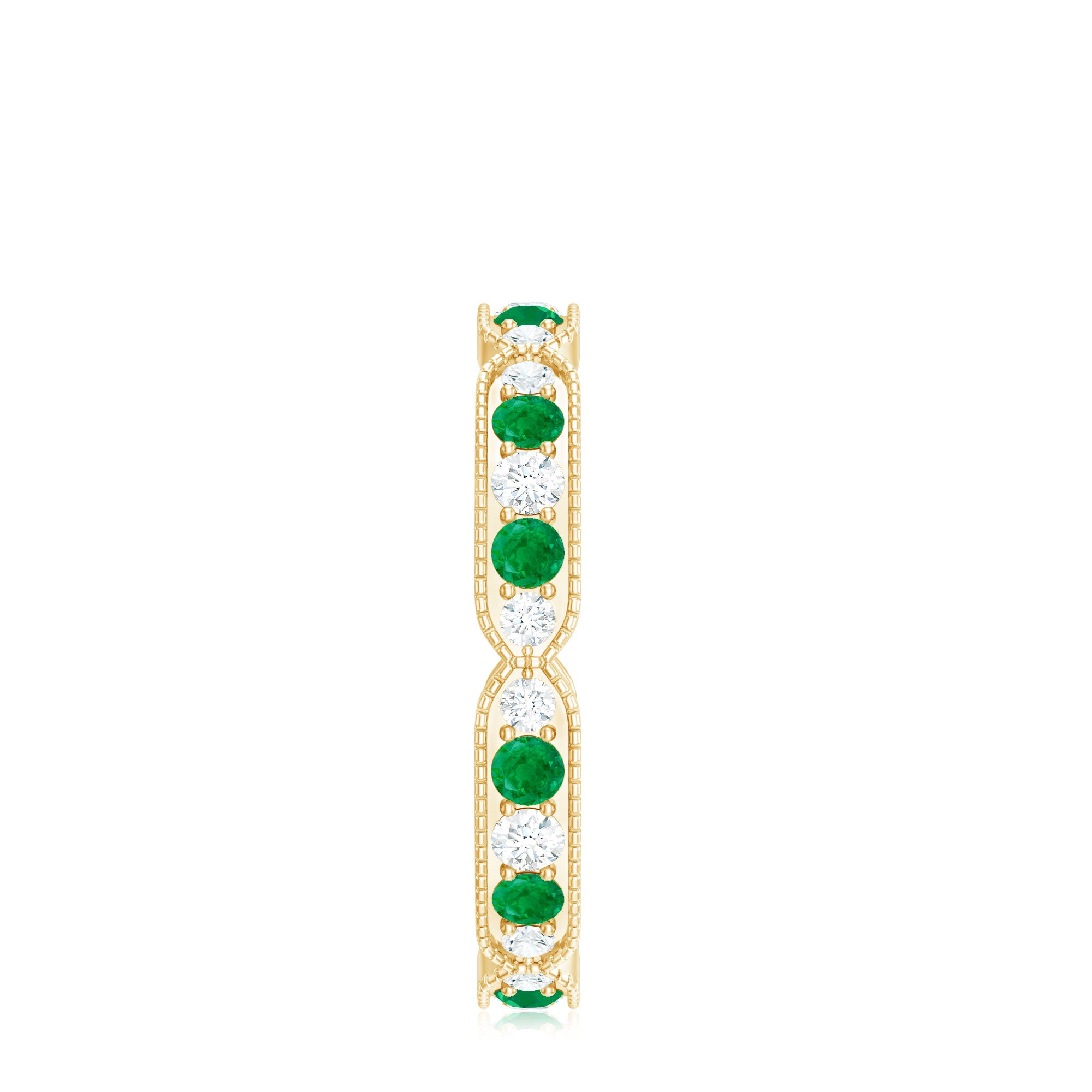 Half-eternity bands offer comfort for daily wear, while full-eternity styles deliver maximum emerald coverage and visual impact.