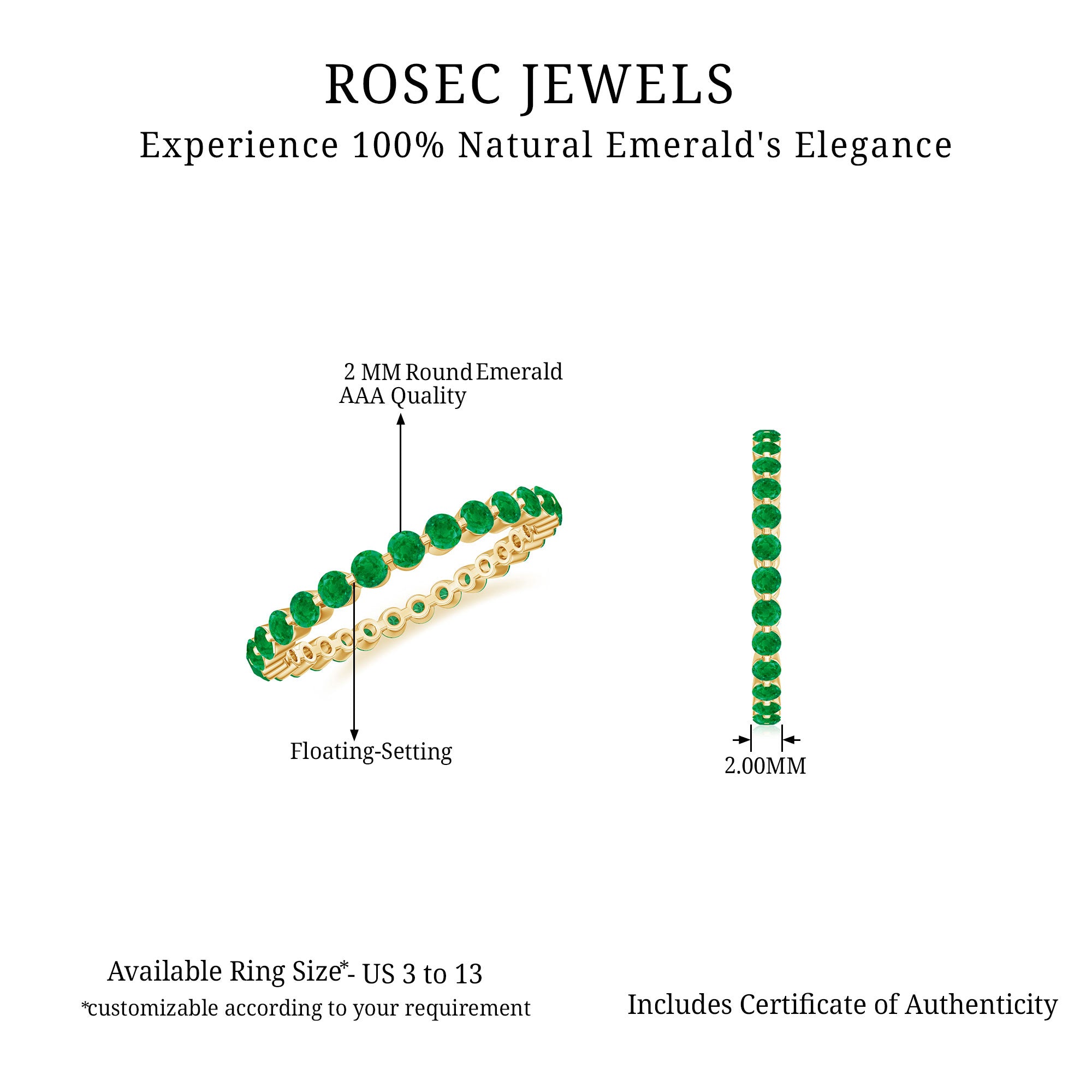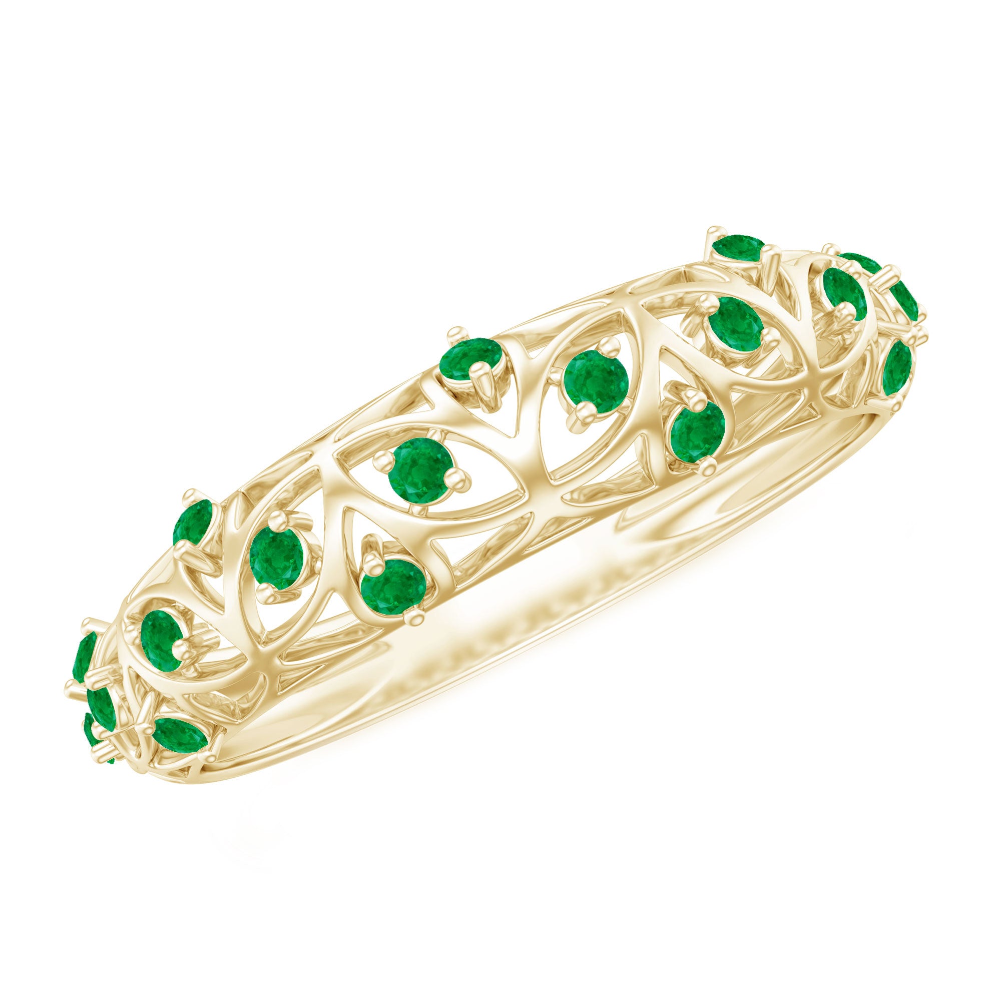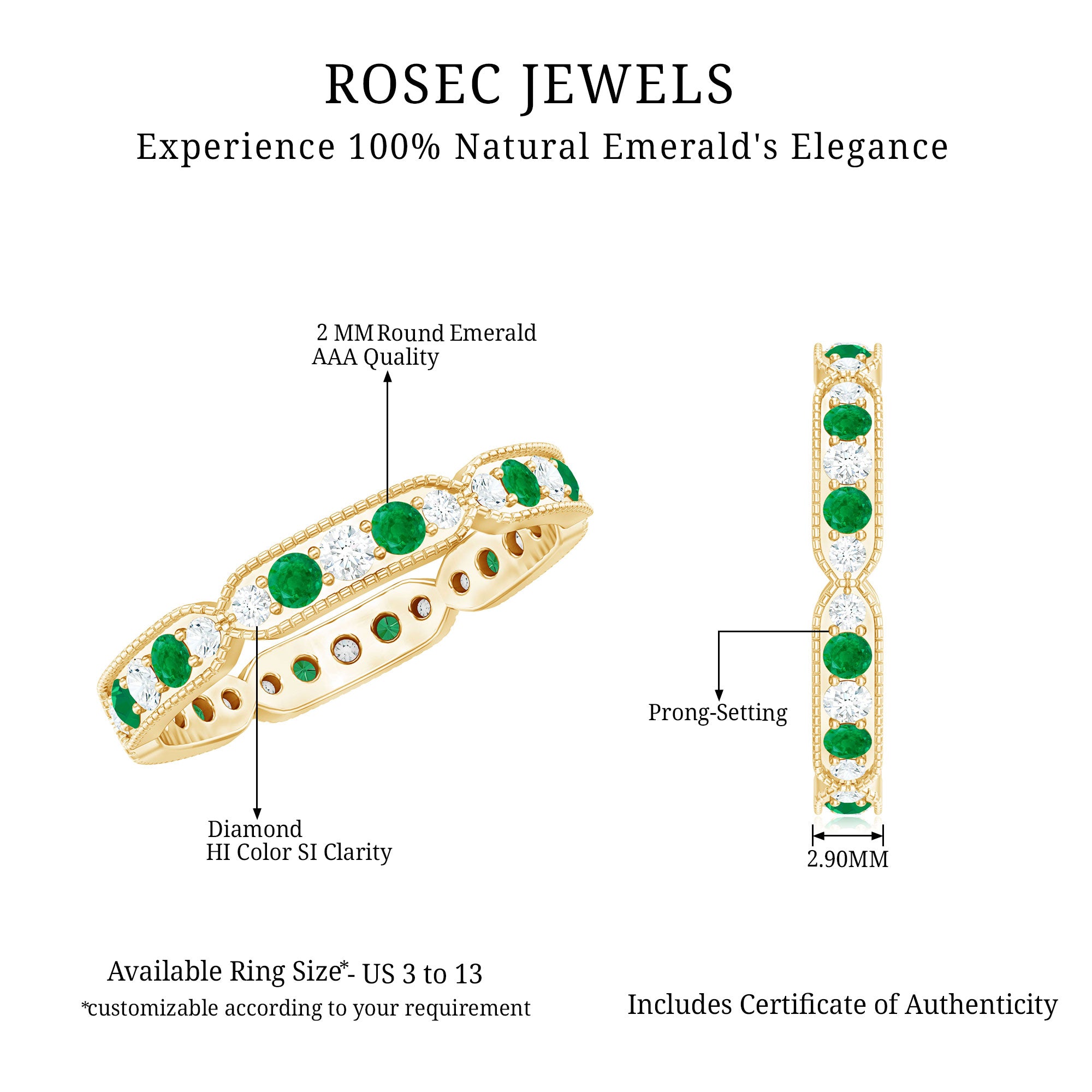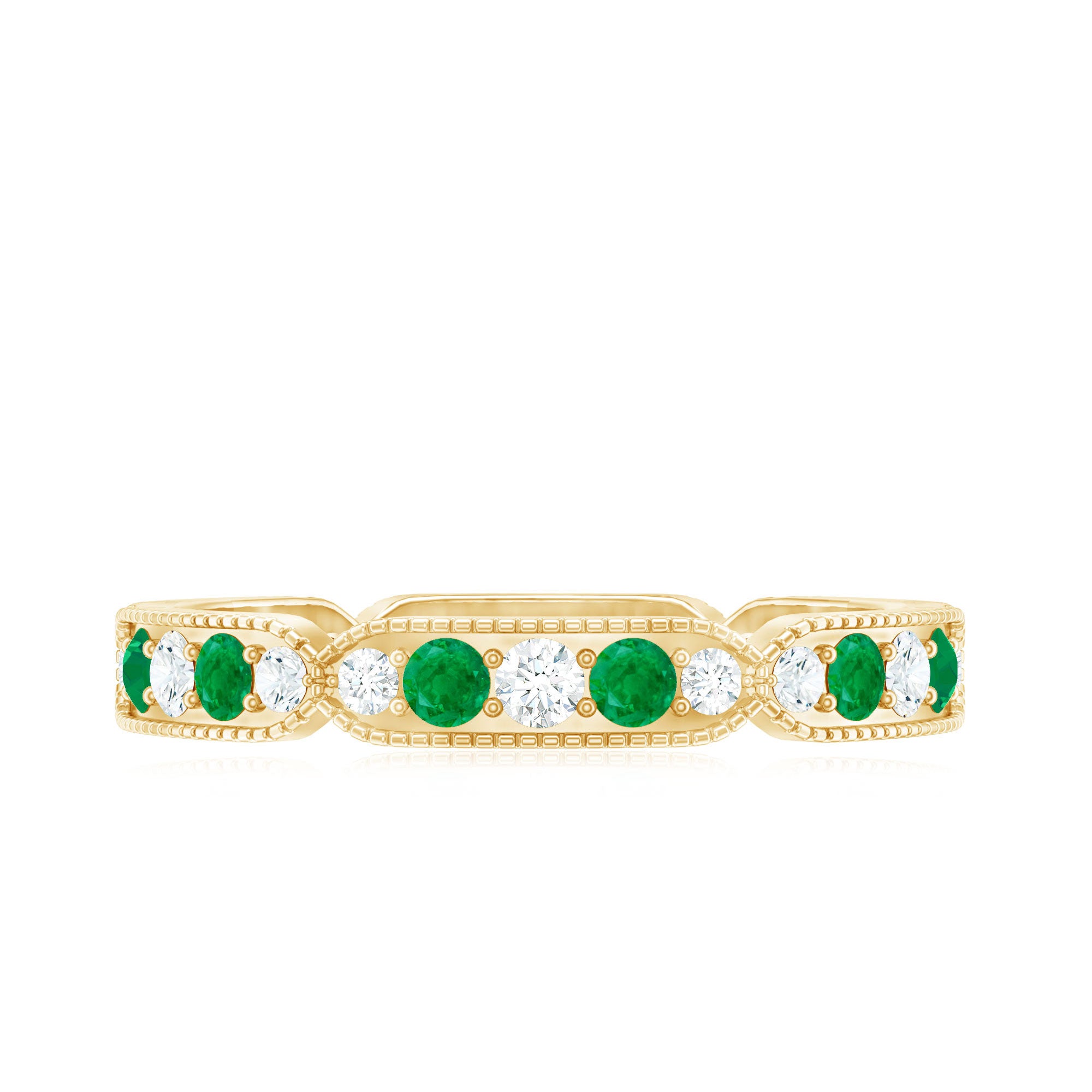 Half-eternity bands offer comfort for daily wear, while full-eternity styles deliver maximum emerald coverage and visual impact.