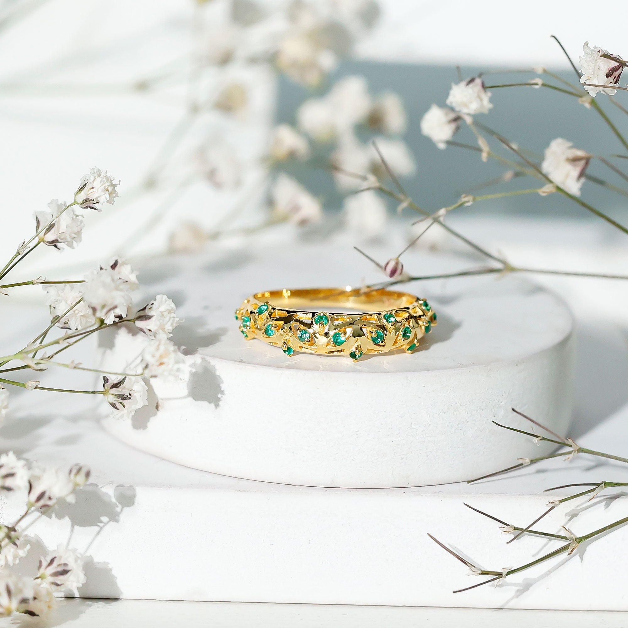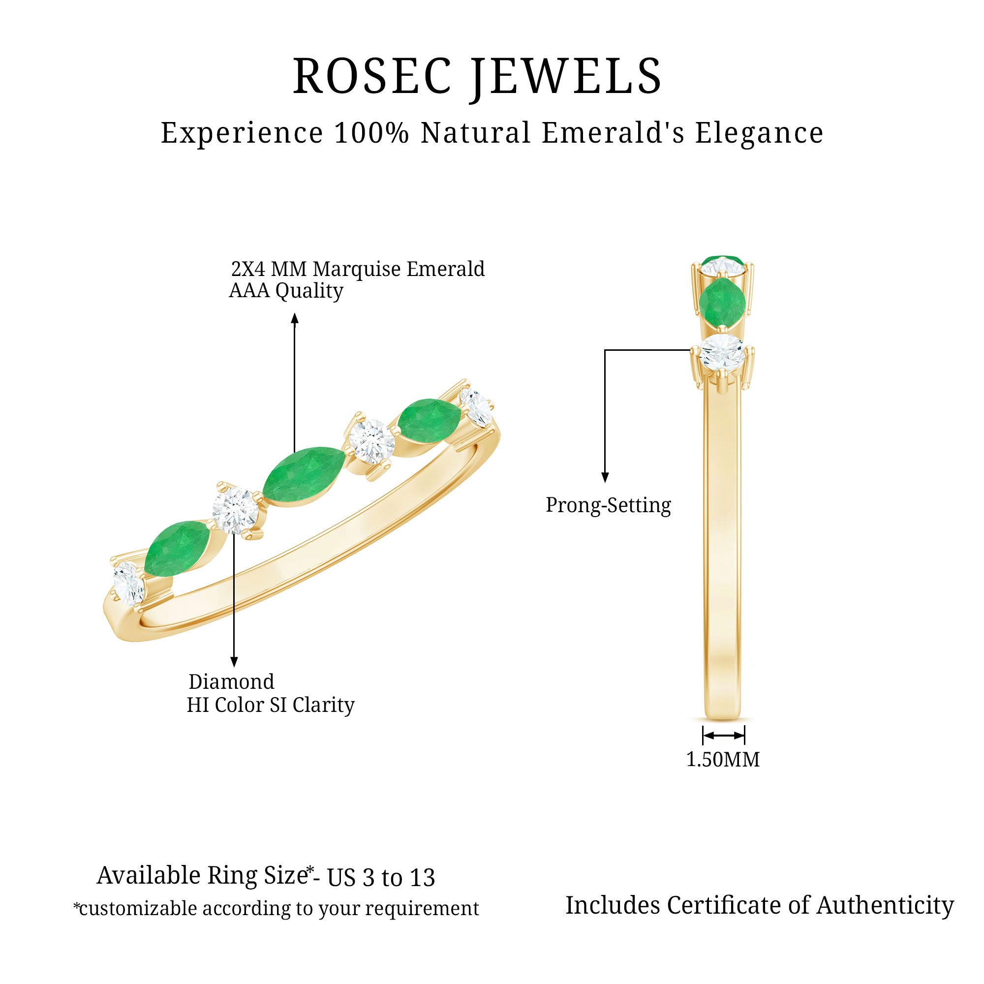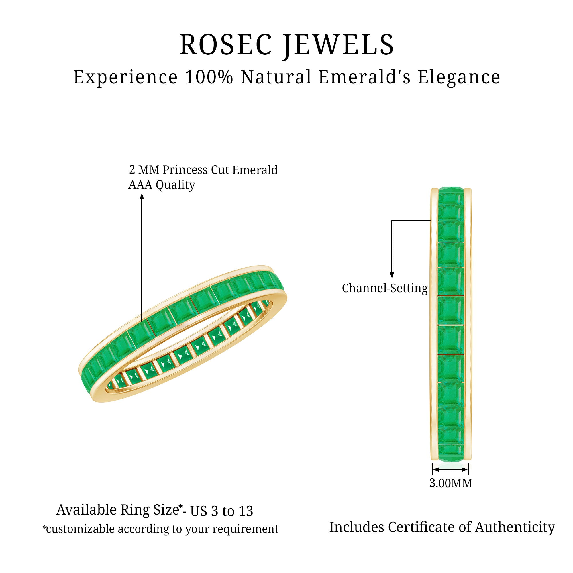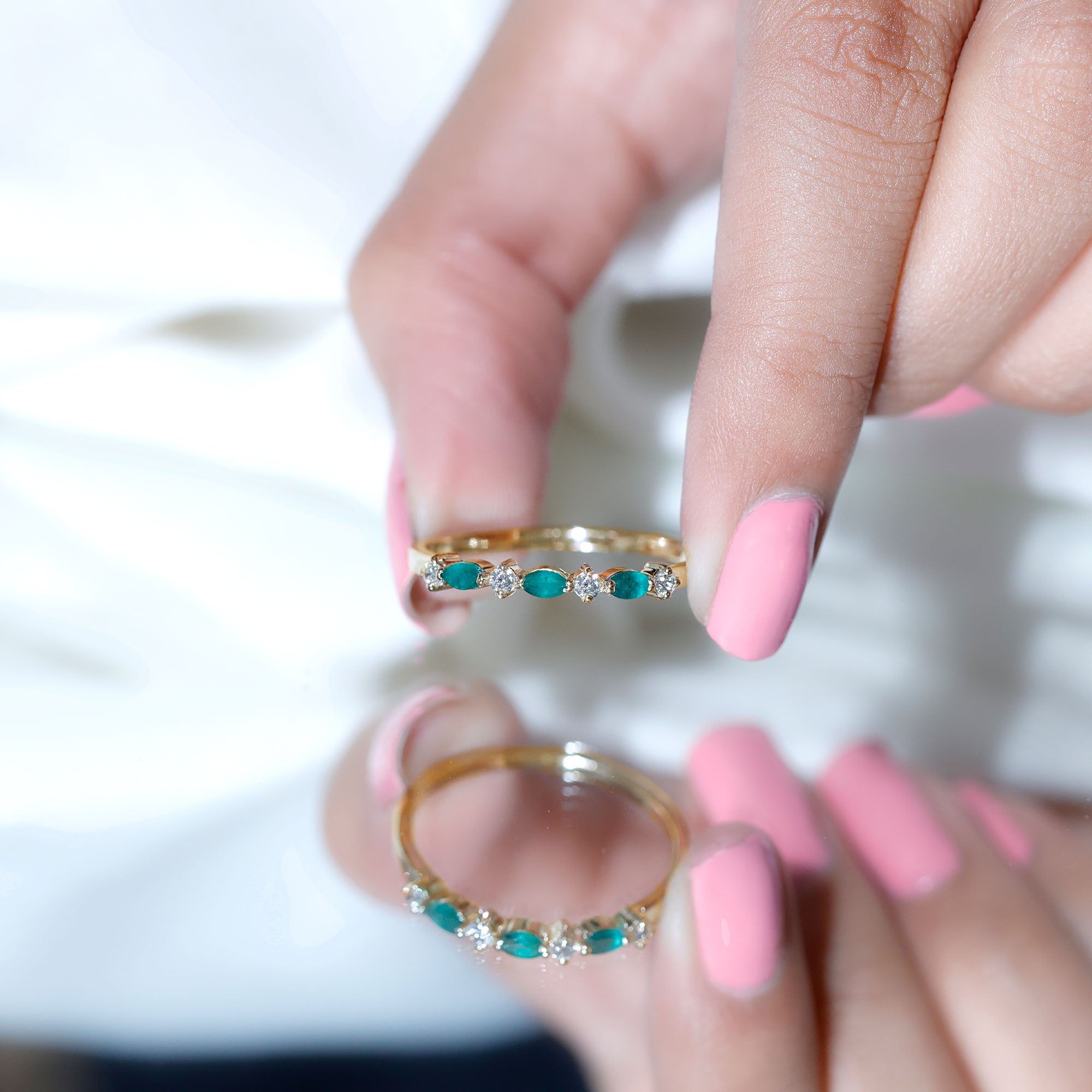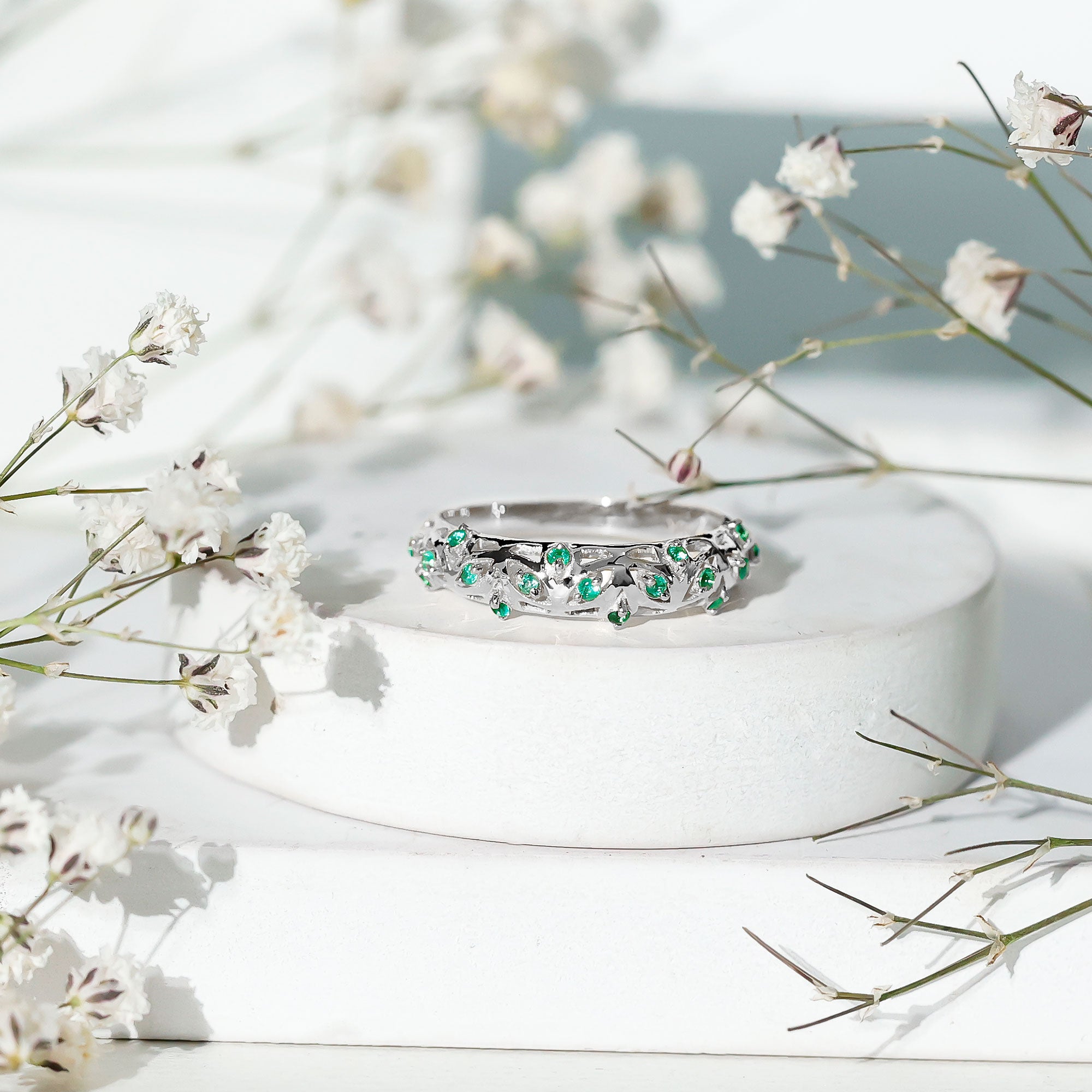Half-eternity bands offer comfort for daily wear, while full-eternity styles deliver maximum emerald coverage and visual impact.