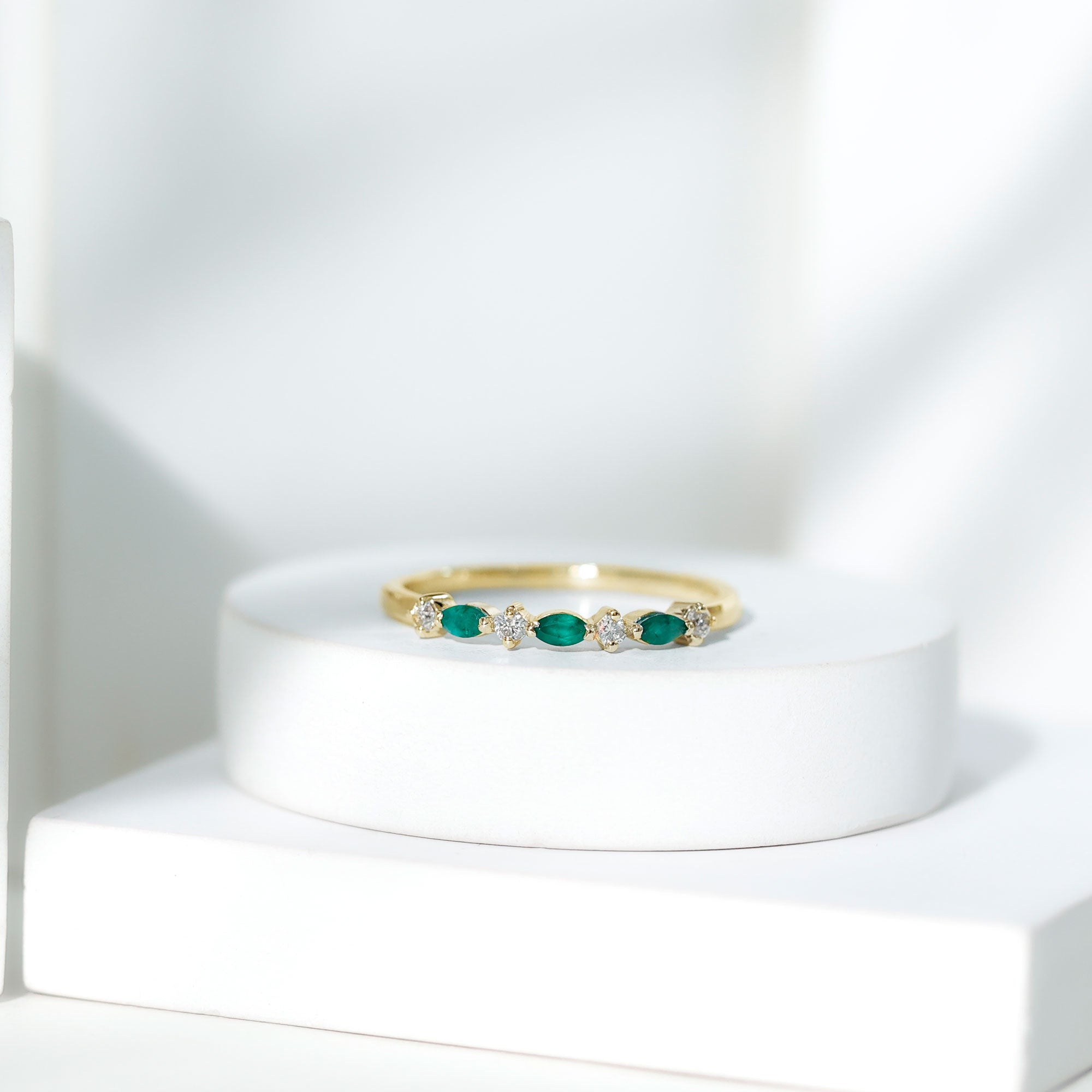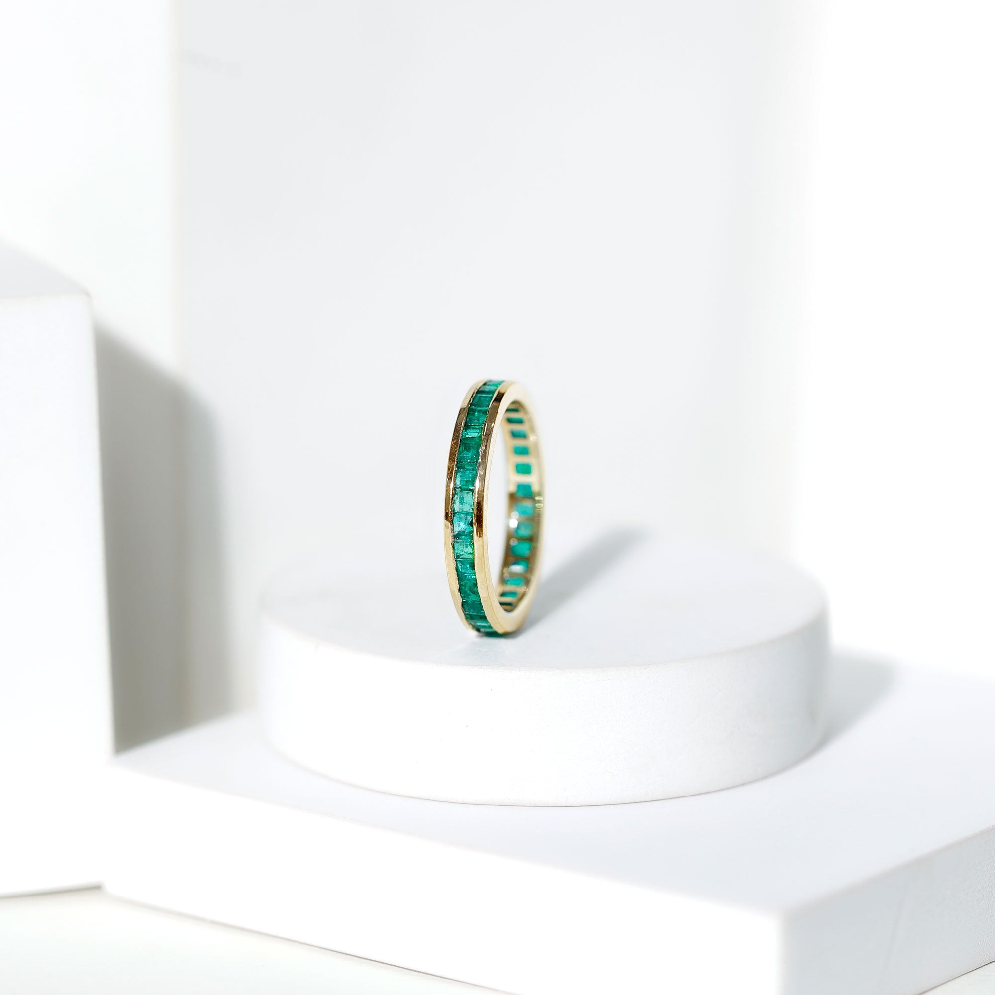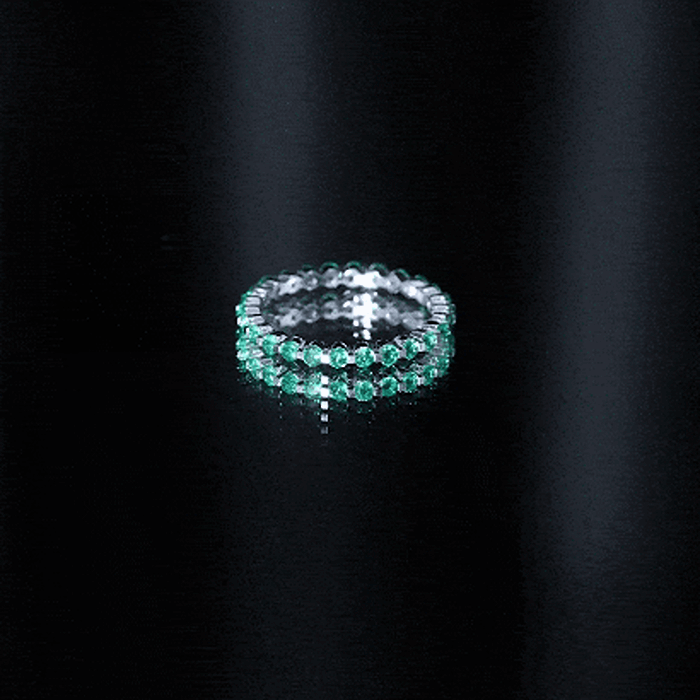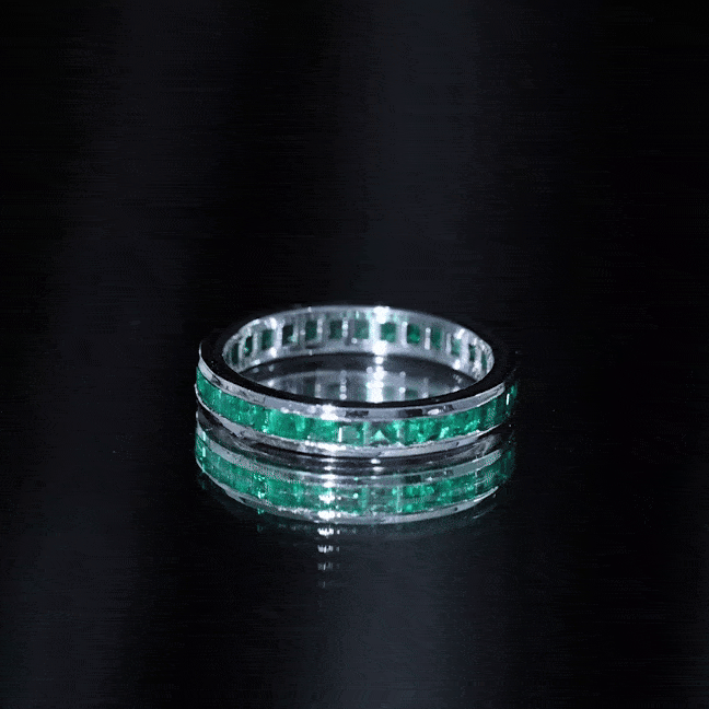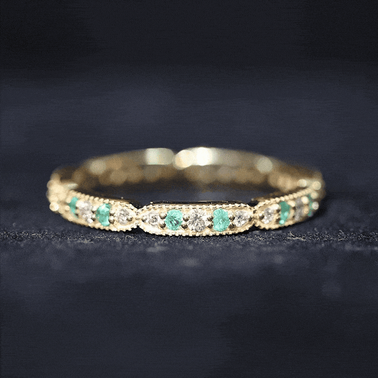 Half-eternity bands feature emeralds across the top portion of the ring, while full-eternity bands circle the entire band with gemstones.
