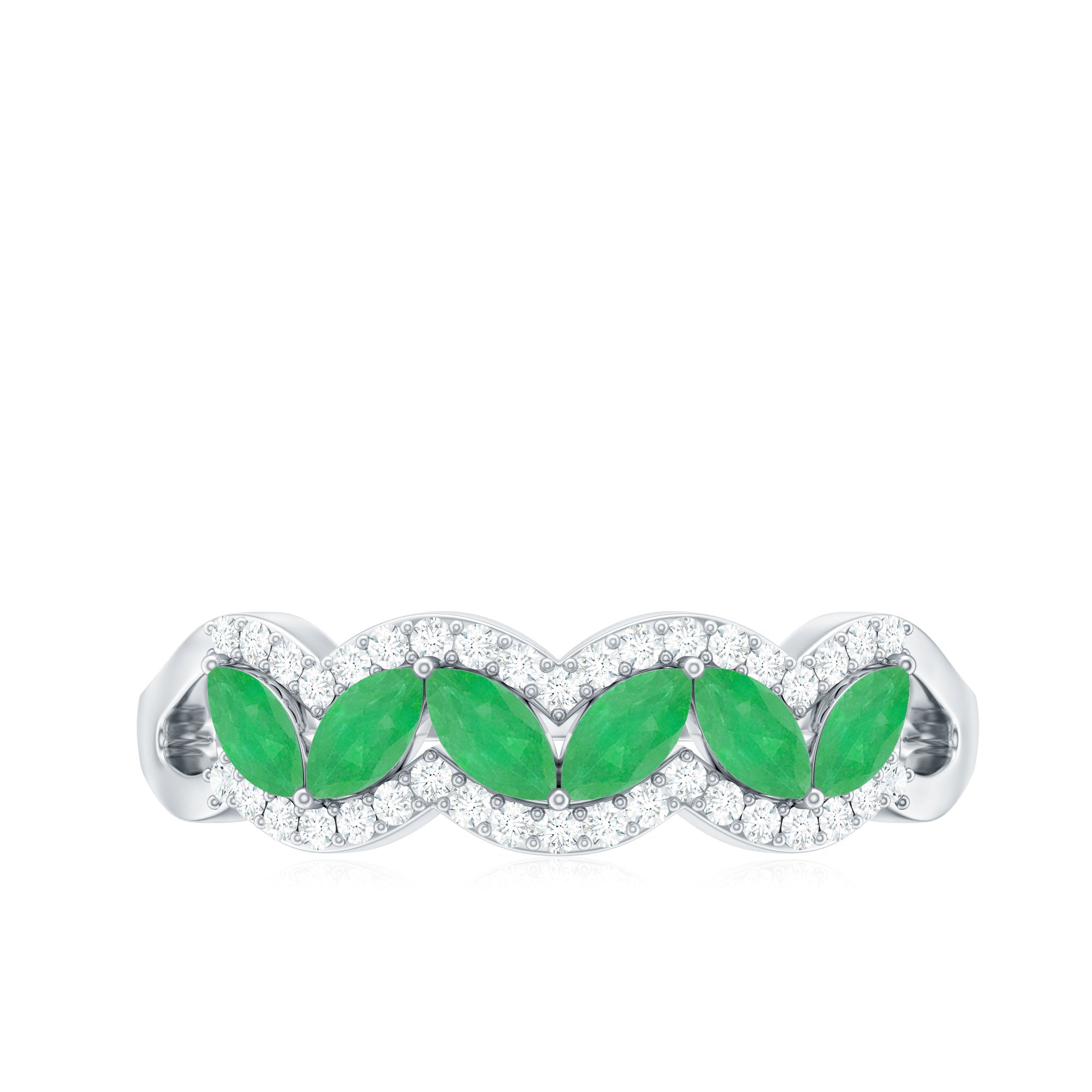 Pave setting is derived from the French word paving, our emerald wedding band setting style features small gems together creating a continuous line or a sparkly ball.