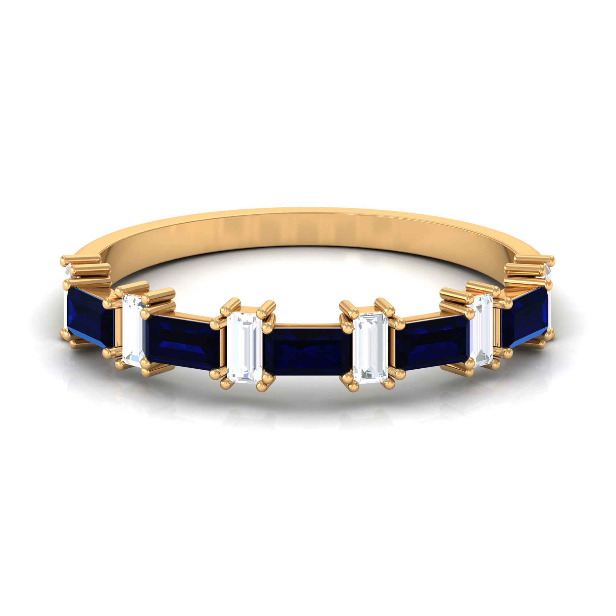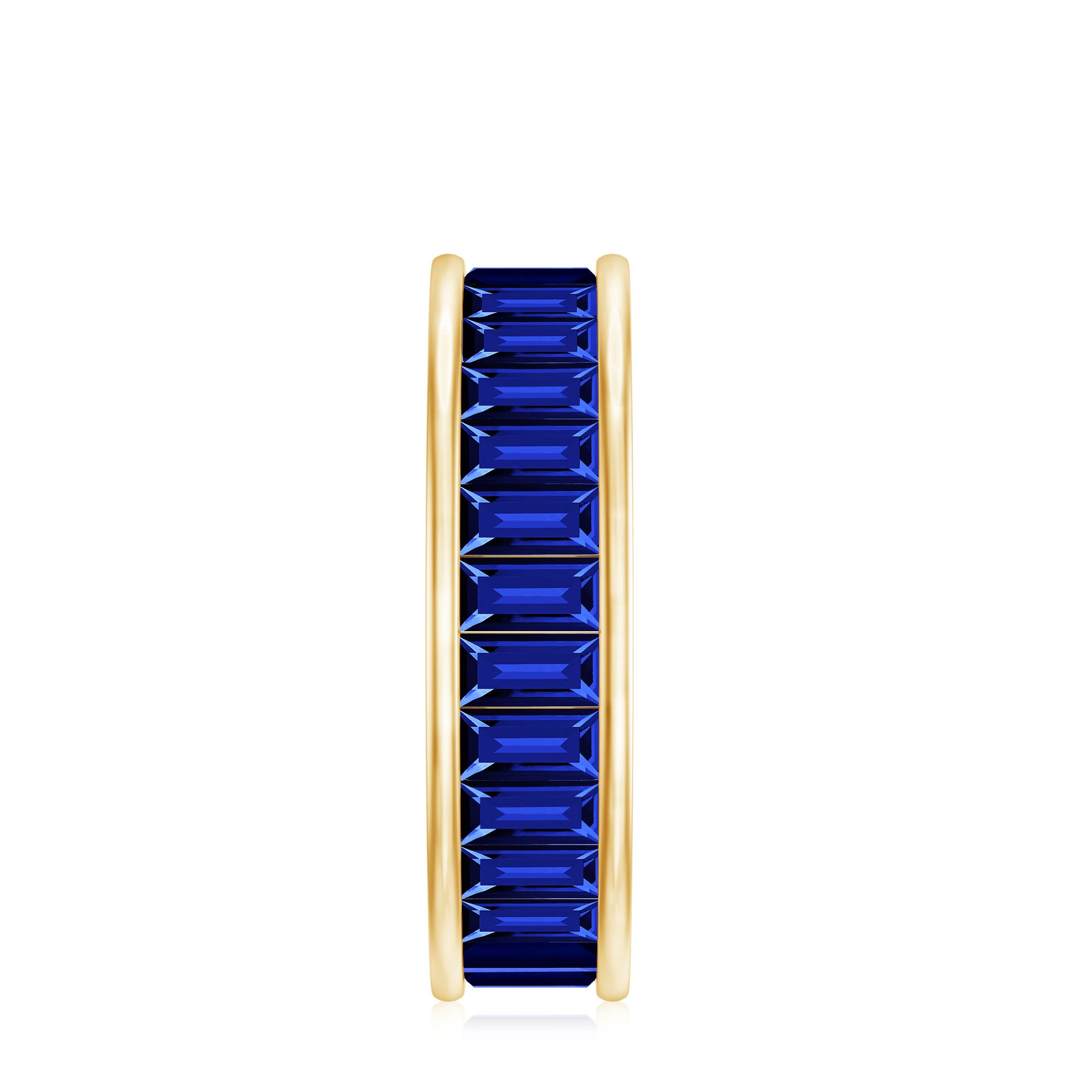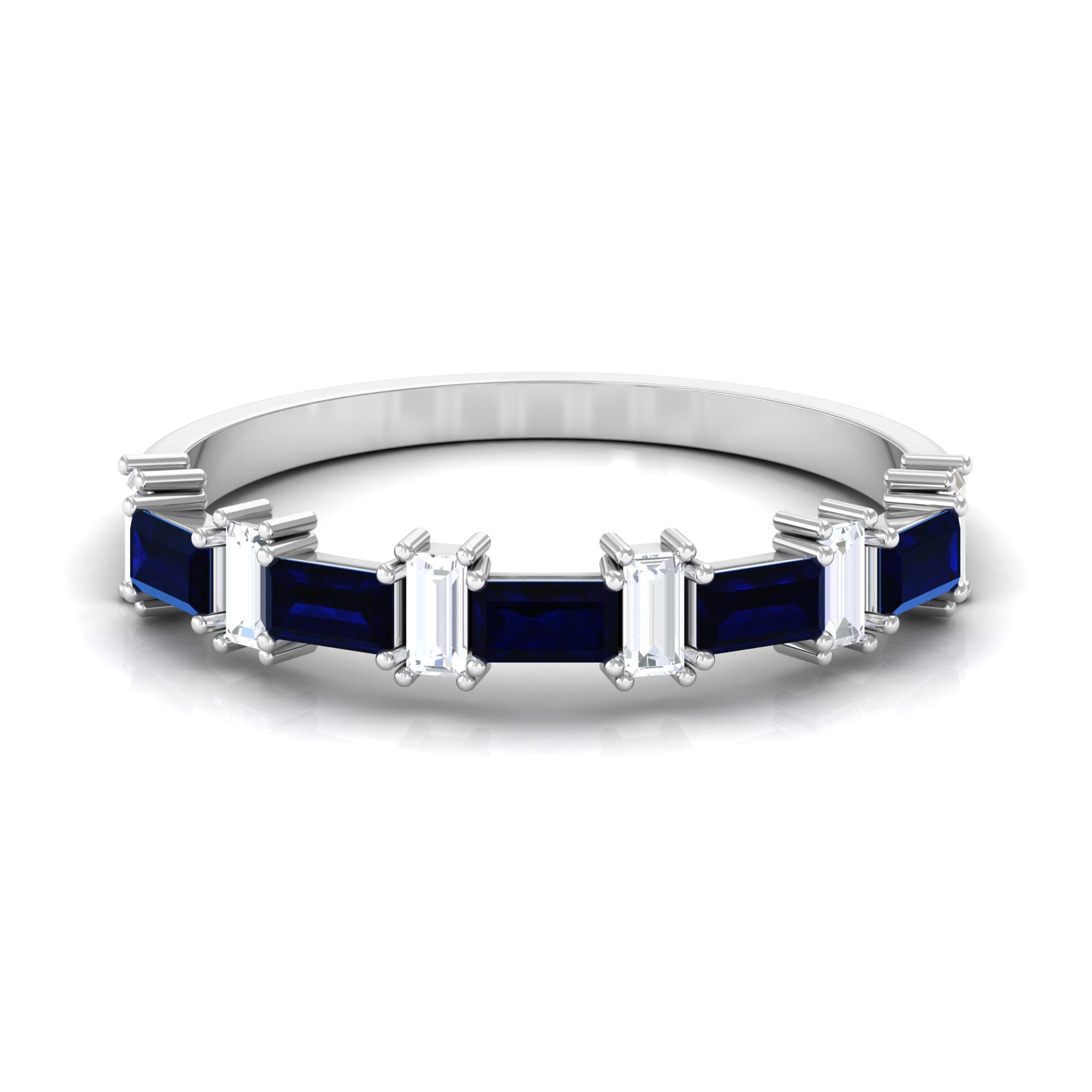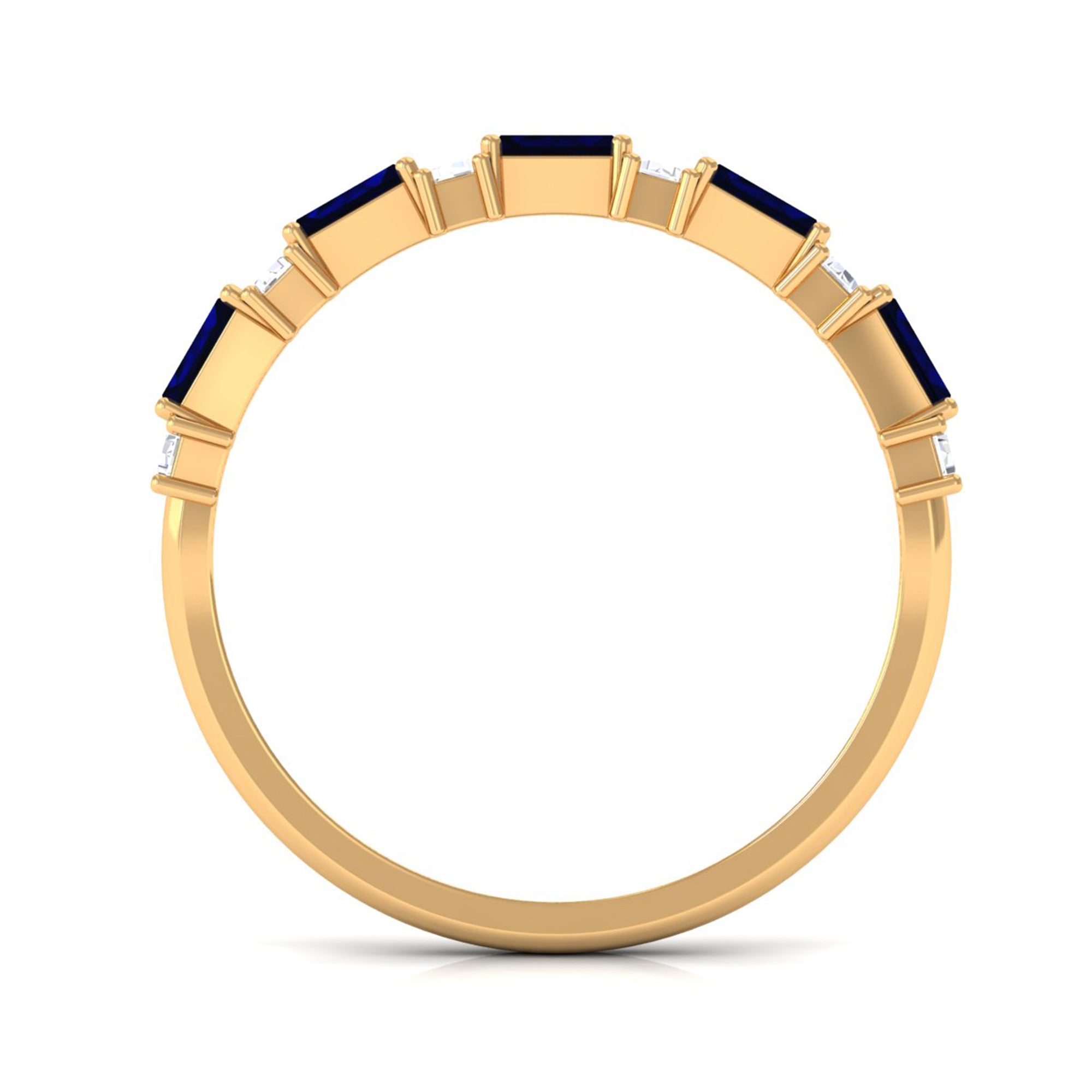 East to West eternity bands have stones arranged horizontally, often used for elongated shapes like emerald, radiant, or pear-cut stones.