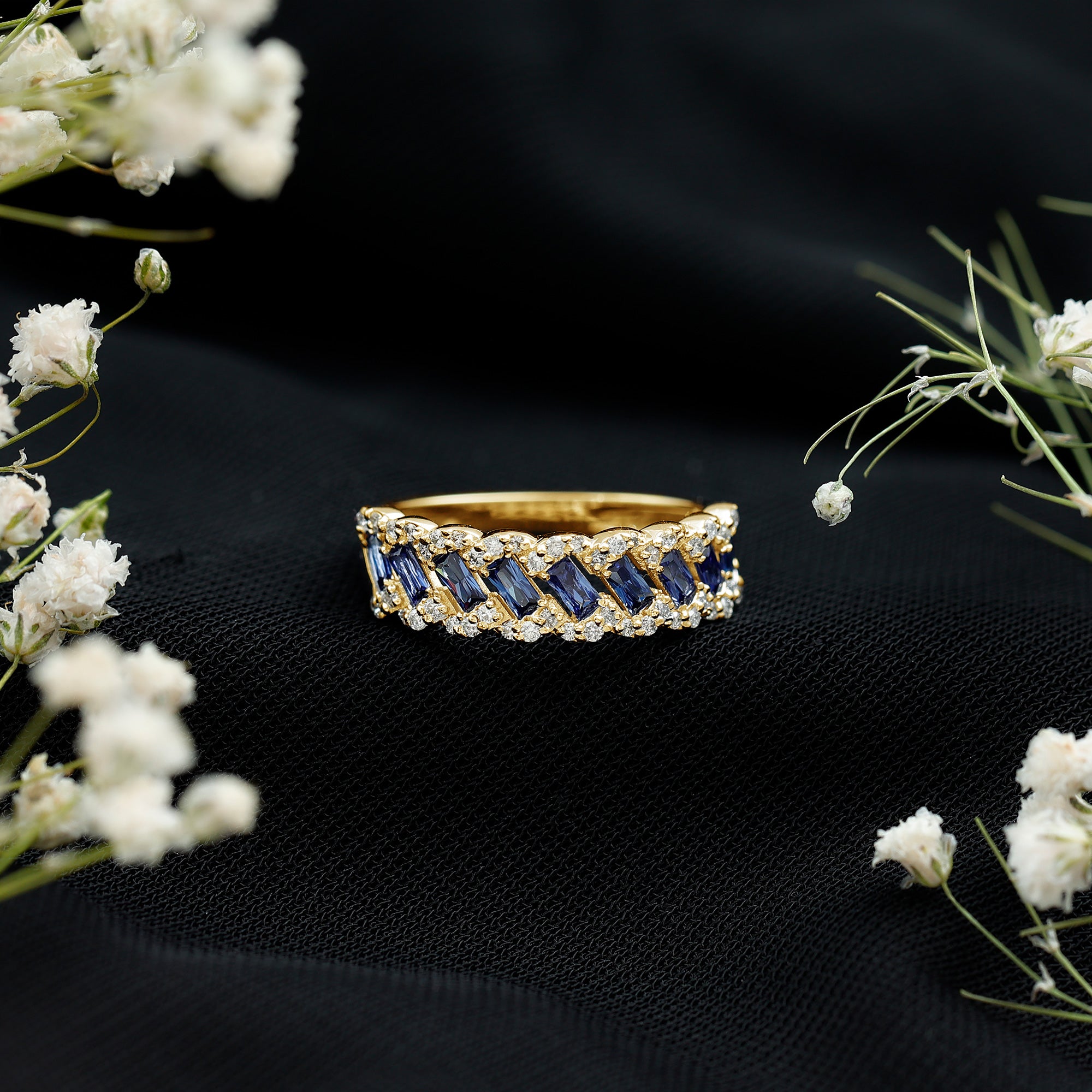 East to West eternity bands have stones arranged horizontally, often used for elongated shapes like emerald, radiant, or pear-cut stones.