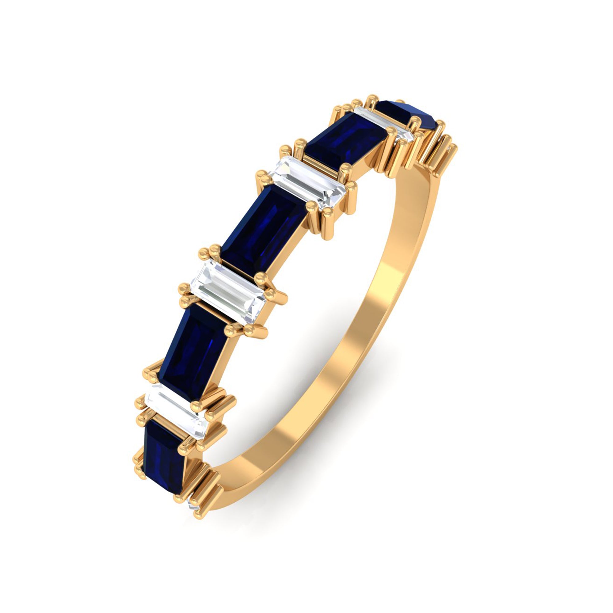 East to West eternity bands have stones arranged horizontally, often used for elongated shapes like emerald, radiant, or pear-cut stones.