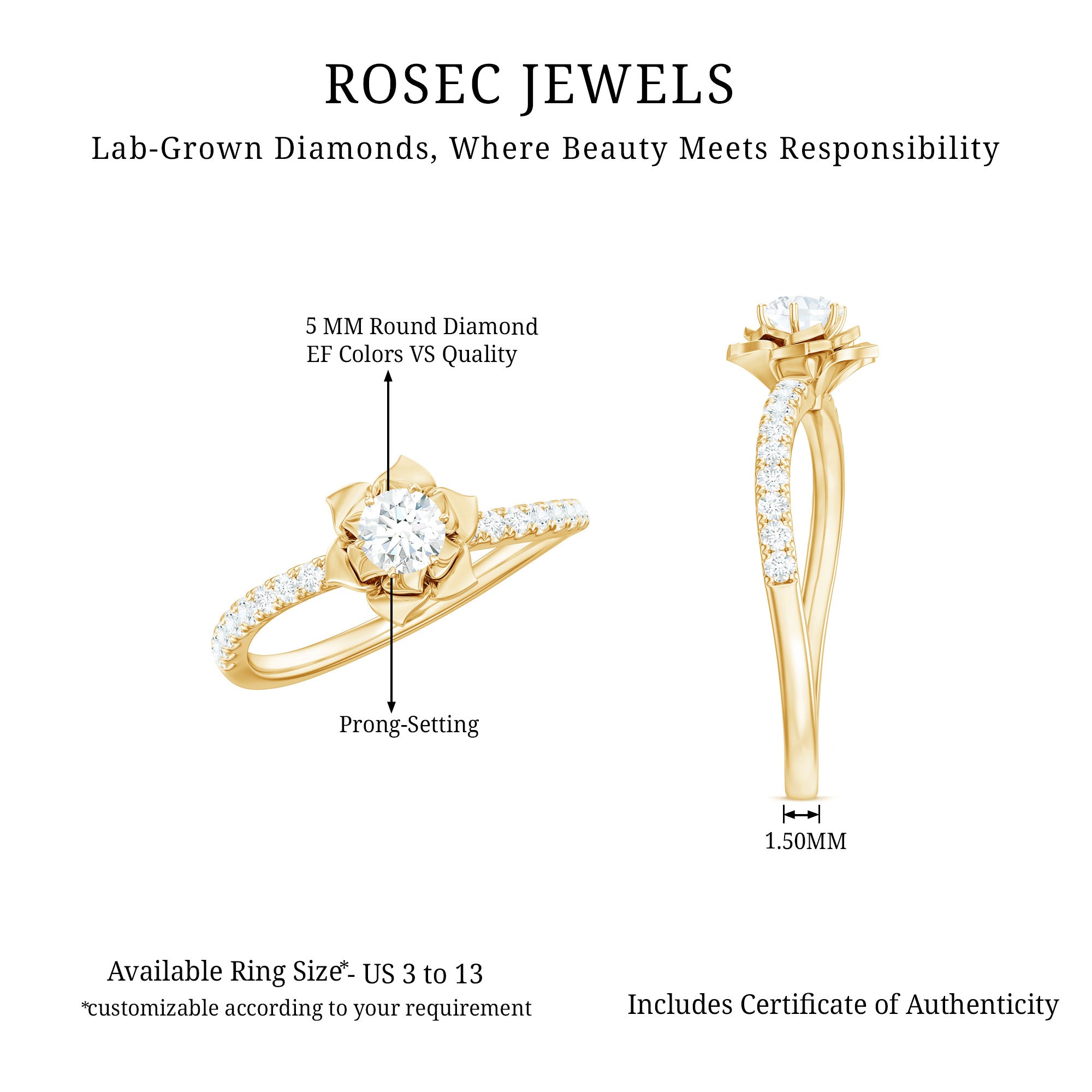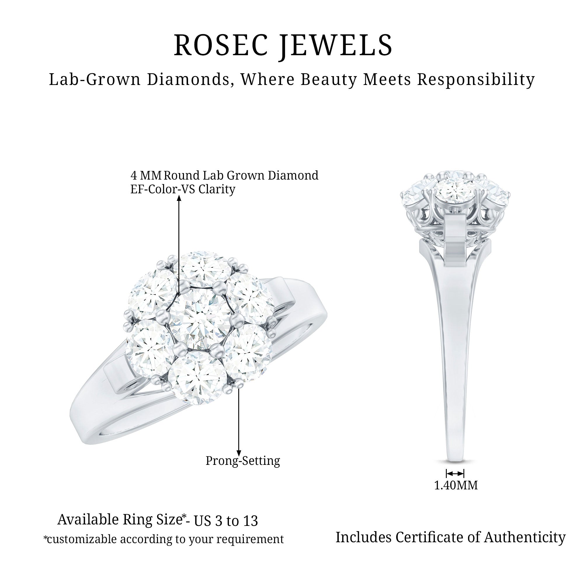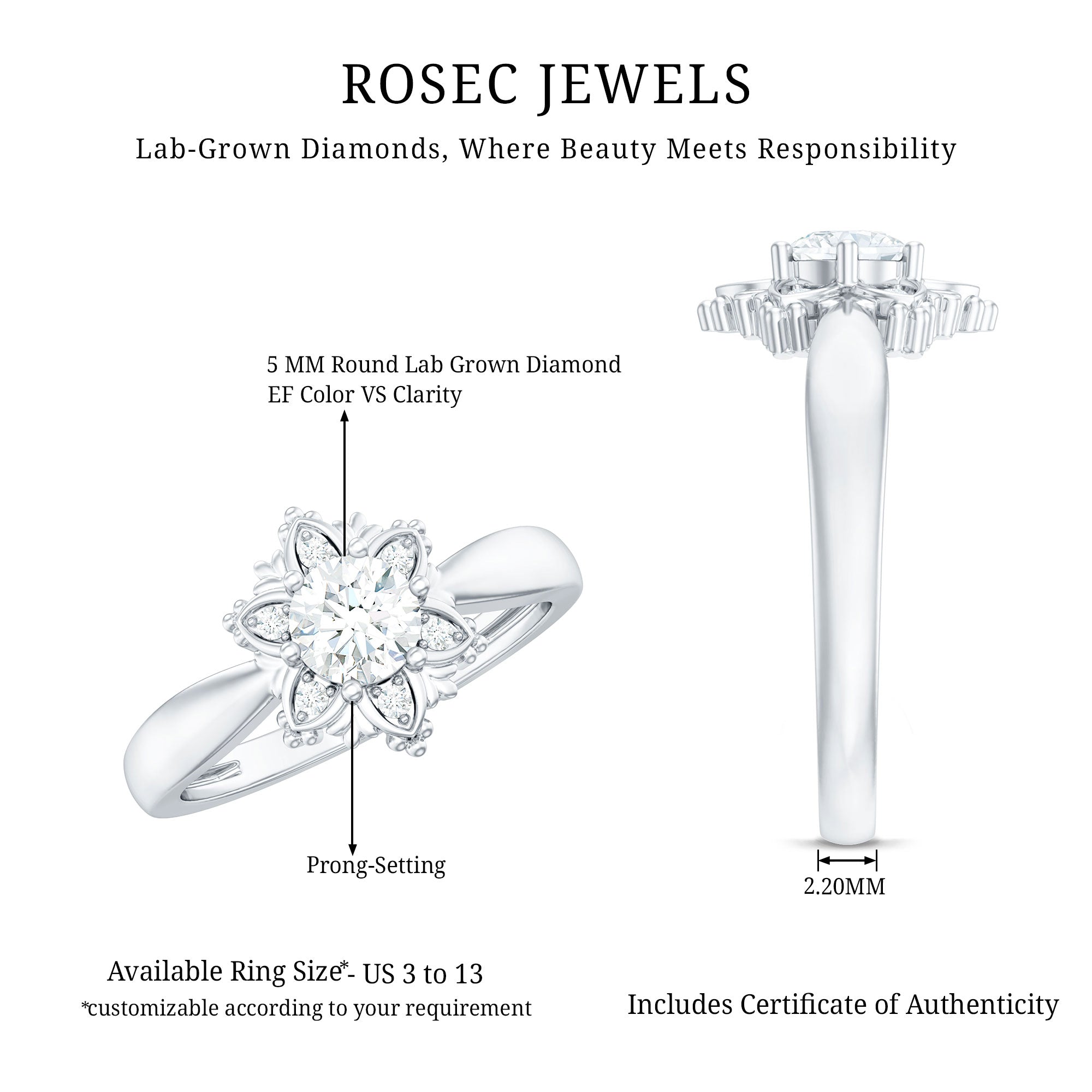 Flower Rings:- Our flower rings are inspired by nature's beauty, and are a good companion for every occasion like engagement, anniversary, birthday, and cocktail parties. Right from majestic solitaire flower rings to halo and eternity flower rings, each piece is specially designed to cater to different tastes and personalities. Even, Rosec Jewels offer you options in choosing the right gemstone for your flower ring, including diamonds, rubies, emeralds, sapphires, aquamarine, and other variety of colored gemstones.