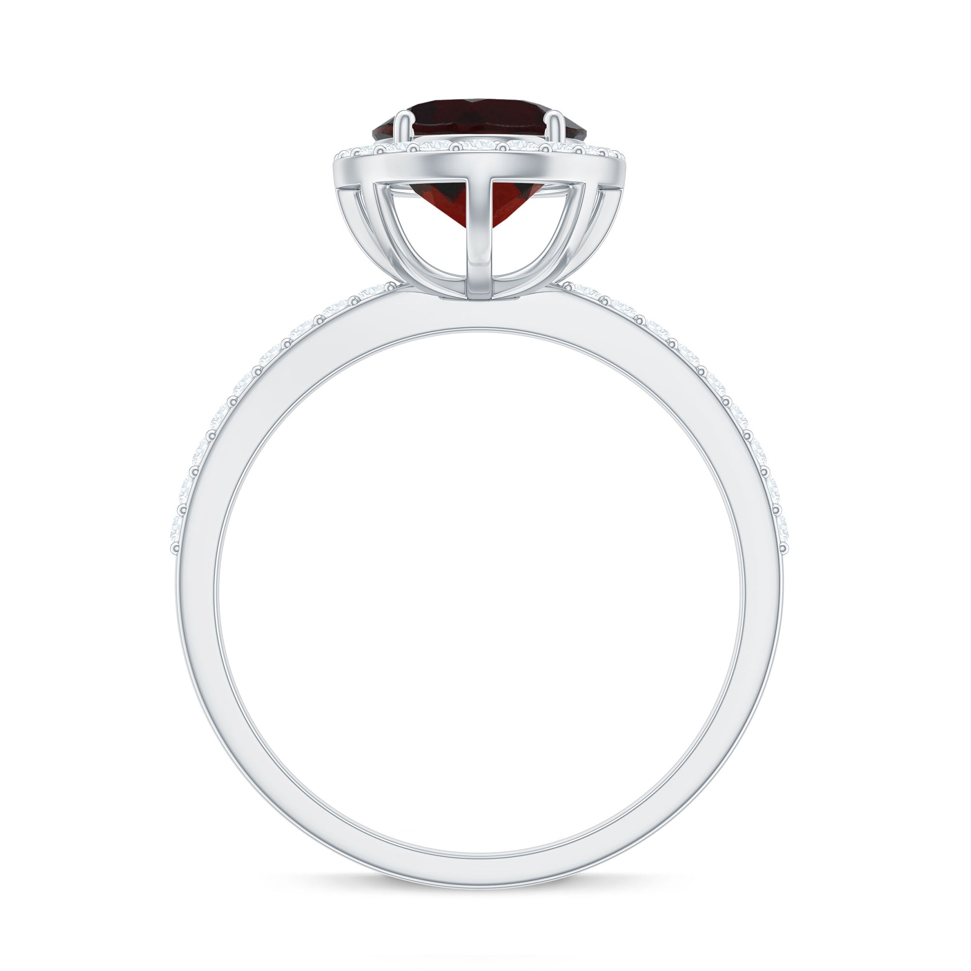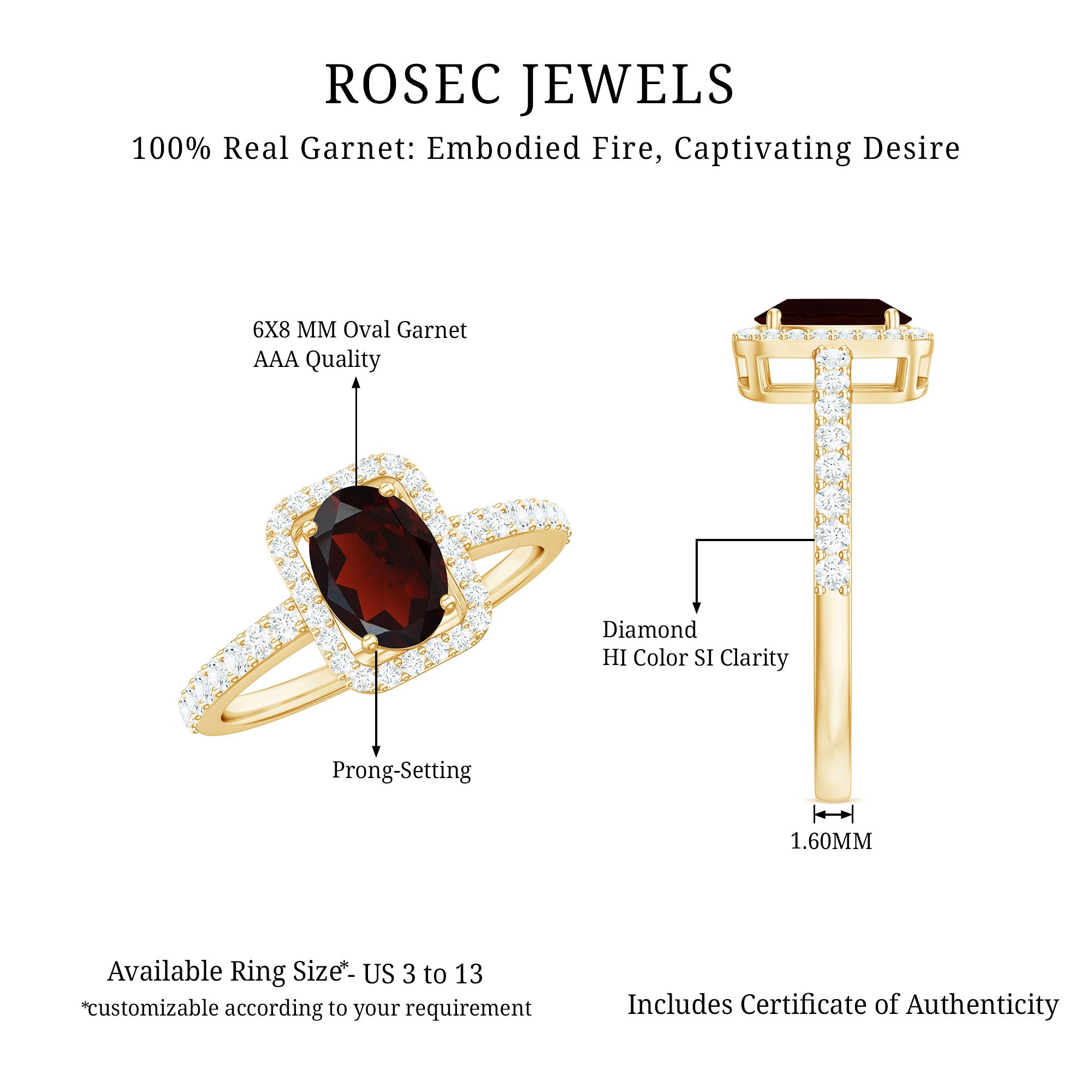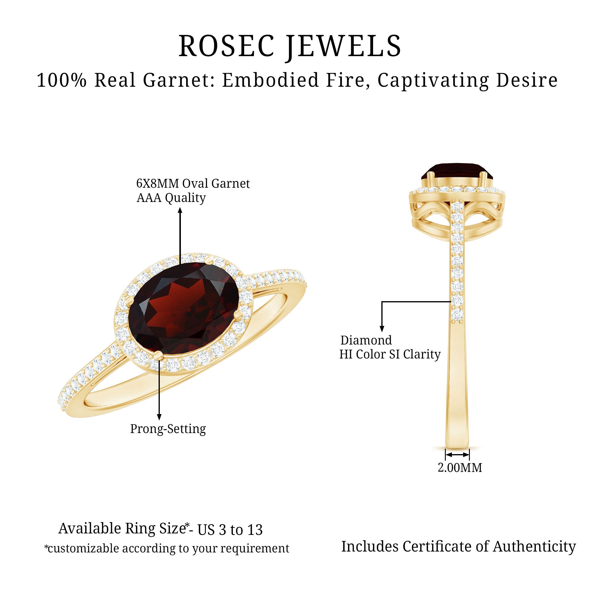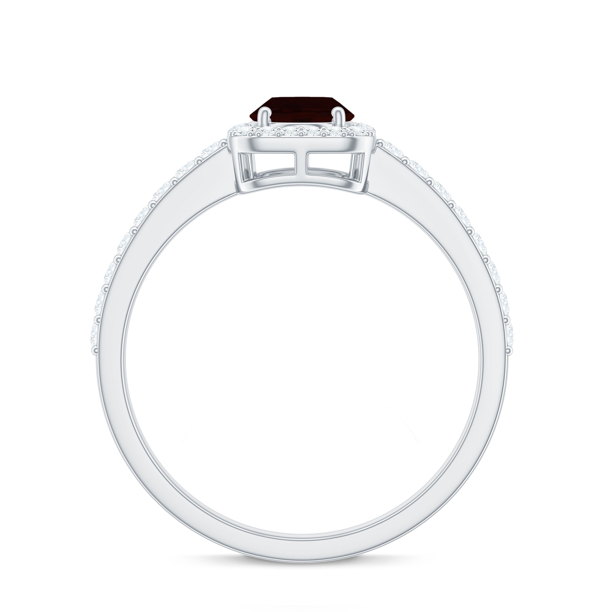 Halo Rings: - Showcases the beauty of garnet stone with a halo motif, these rings accentuate the brilliance of the center stone elegantly. Due to the diamond accents, the size of the garnet looks a bit large. The vibrant hues of red stone represent love and passion which makes them perfect for engagement rings. The halo style adds an extra layer of shine and elegance to the ring, enhancing the beauty of the ring. The Halo collection is perfect for those who always appreciate something unique and classy.