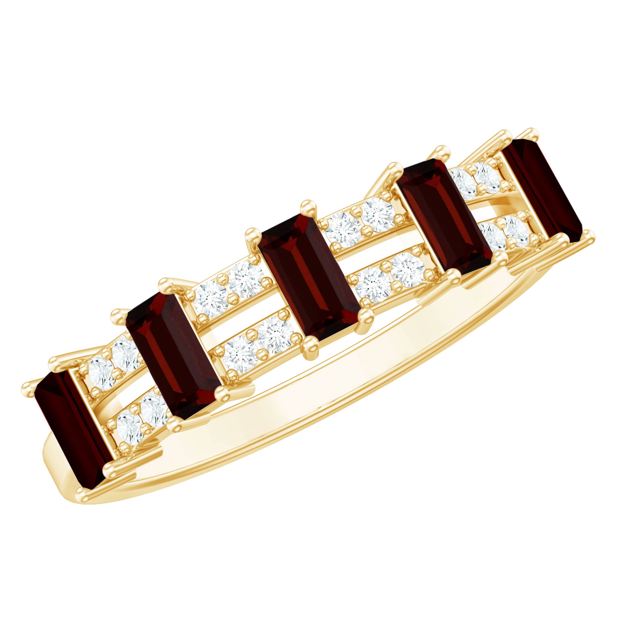 Innumerable garnet wedding band styles are created by combining different garnet shapes. The garnet rings also categorized on the basis of ring styles, most popular being the garnet eternity band for men. Metal embellishments in different adorable colors of gold namely, yellow gold, white gold and rose gold will leave the grooms with plethora of engagement rings and wedding bands to choose from.