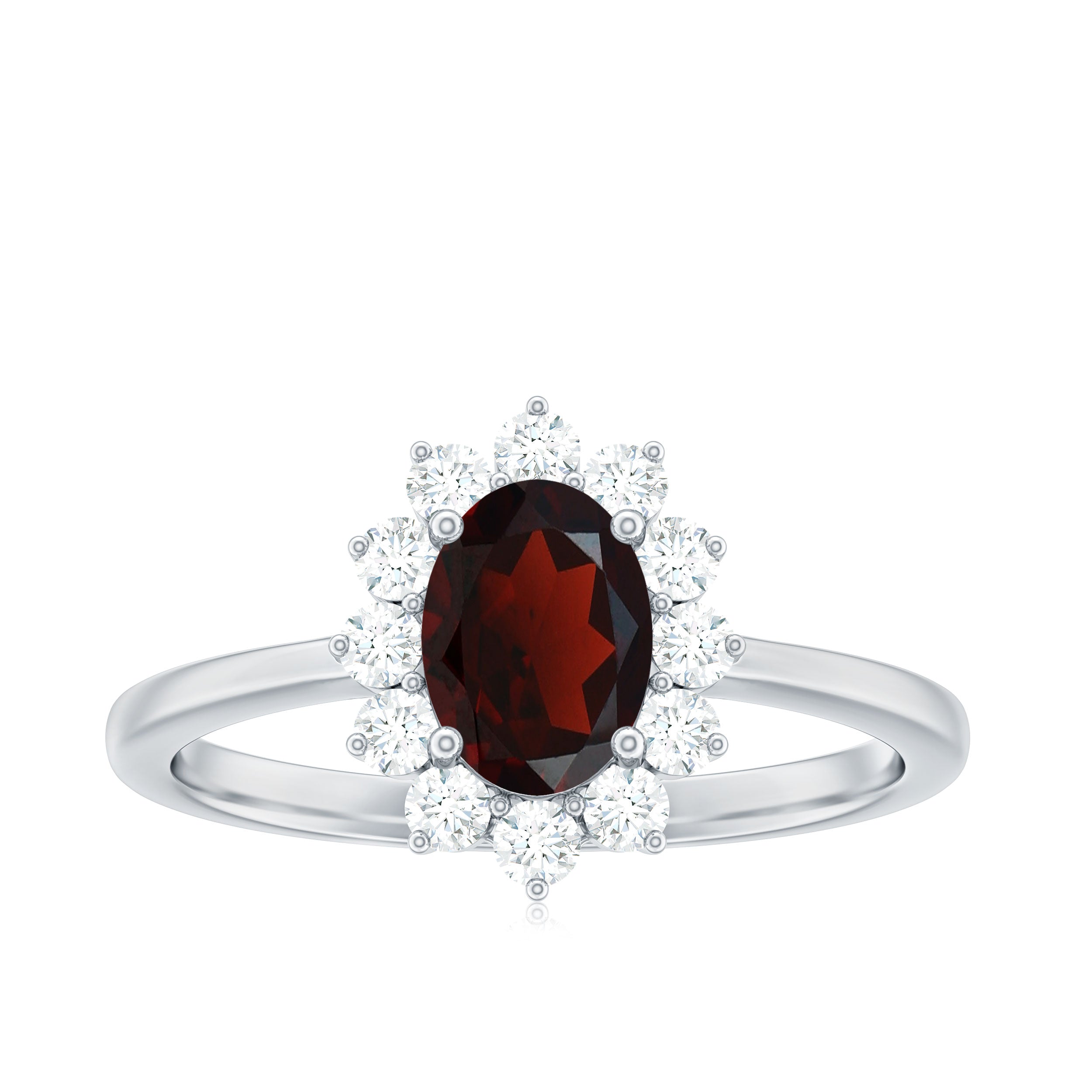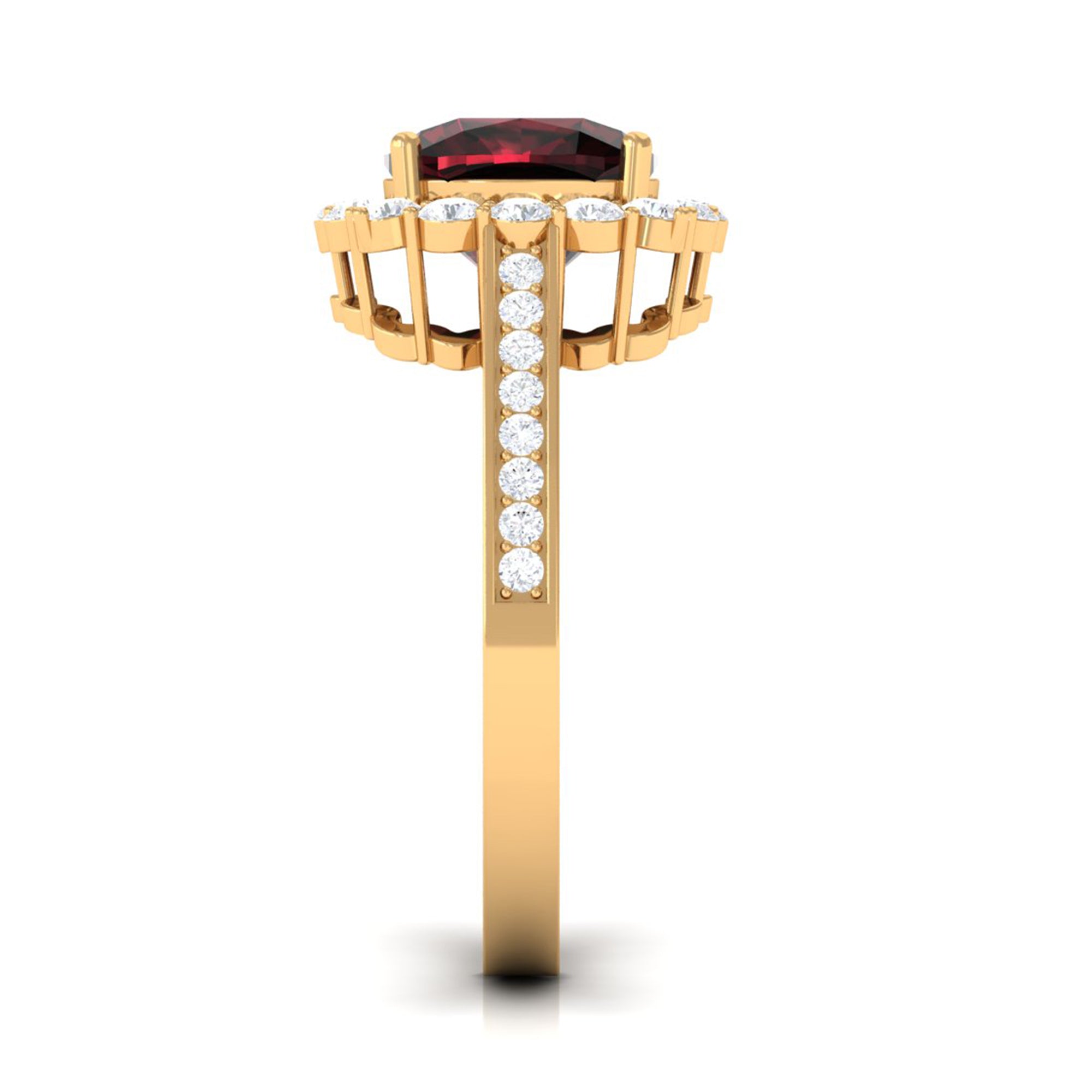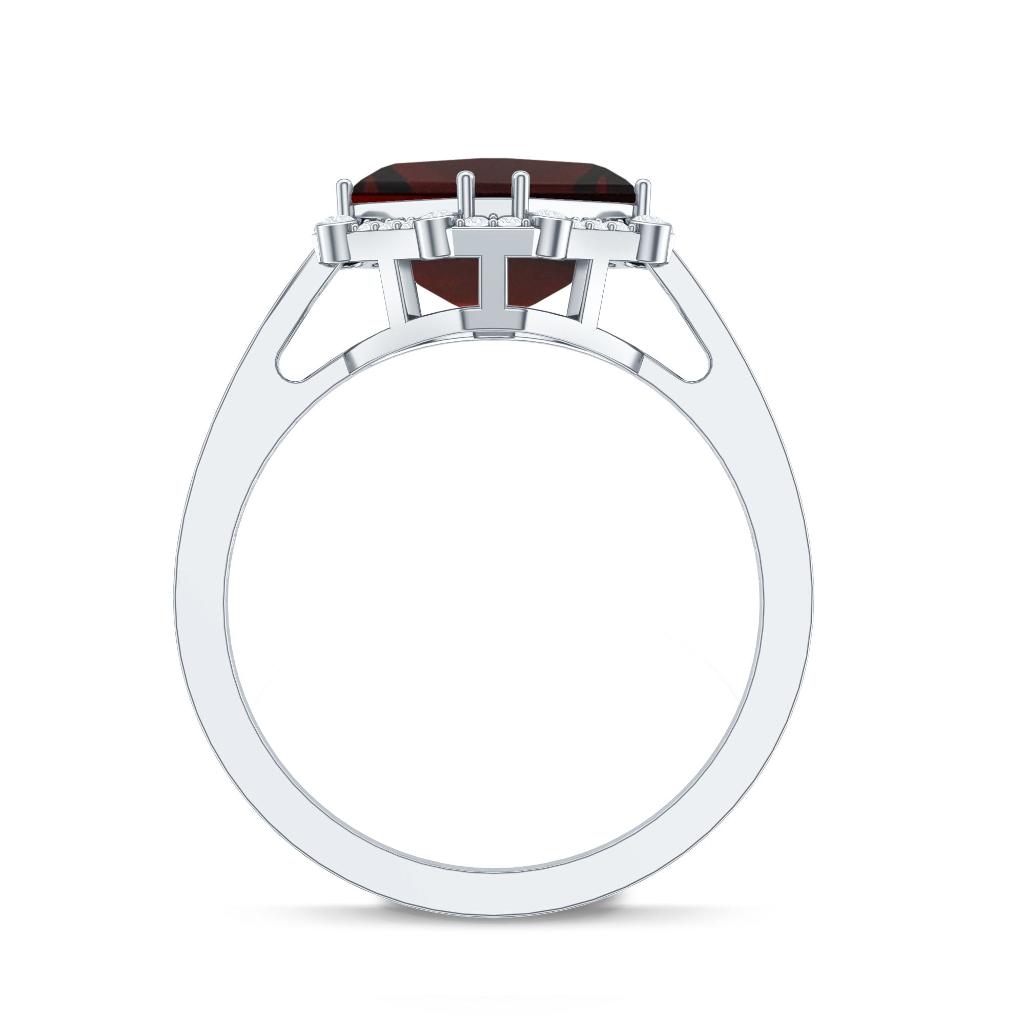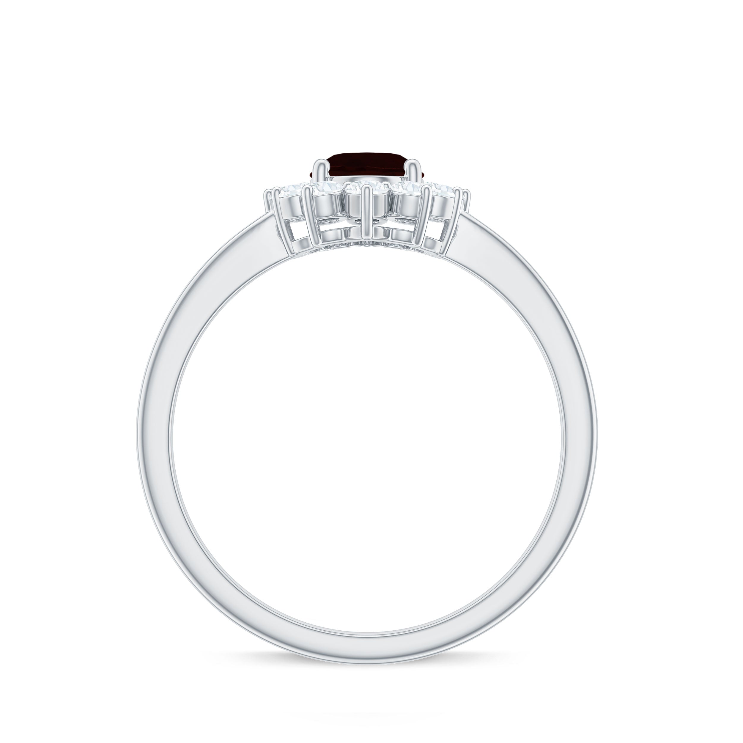Garnet Halo Rings: - A fascinating twist on the traditional Solitaire Ring is the “halo ring”, which features a circle of diamond or moissanite surrounding the garnet solitaire. The Halo isn't just about adding sparkle; it adds versatility to the ring. Furthermore, it draws more focus to the garnet, creating the illusion of a larger stone. The halo style makes the ring more unique and attractive.