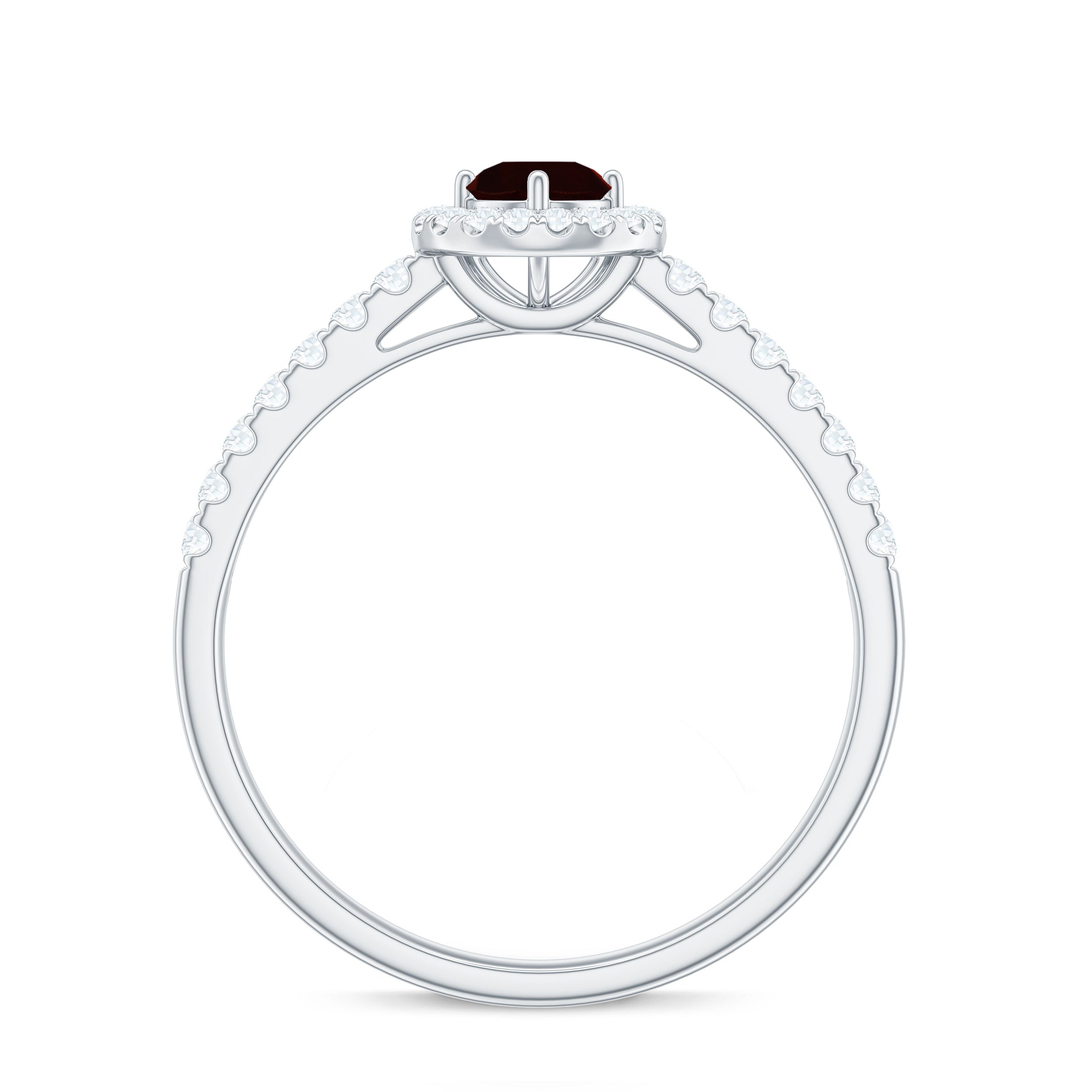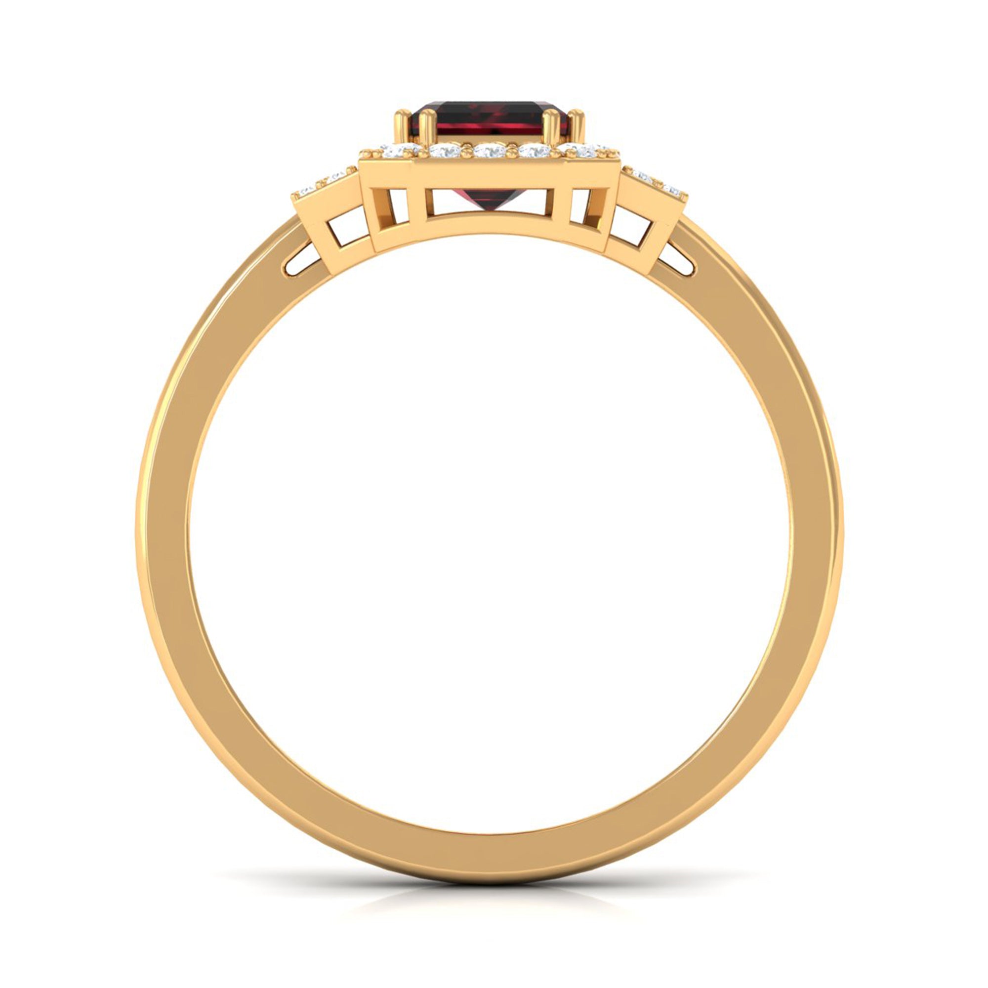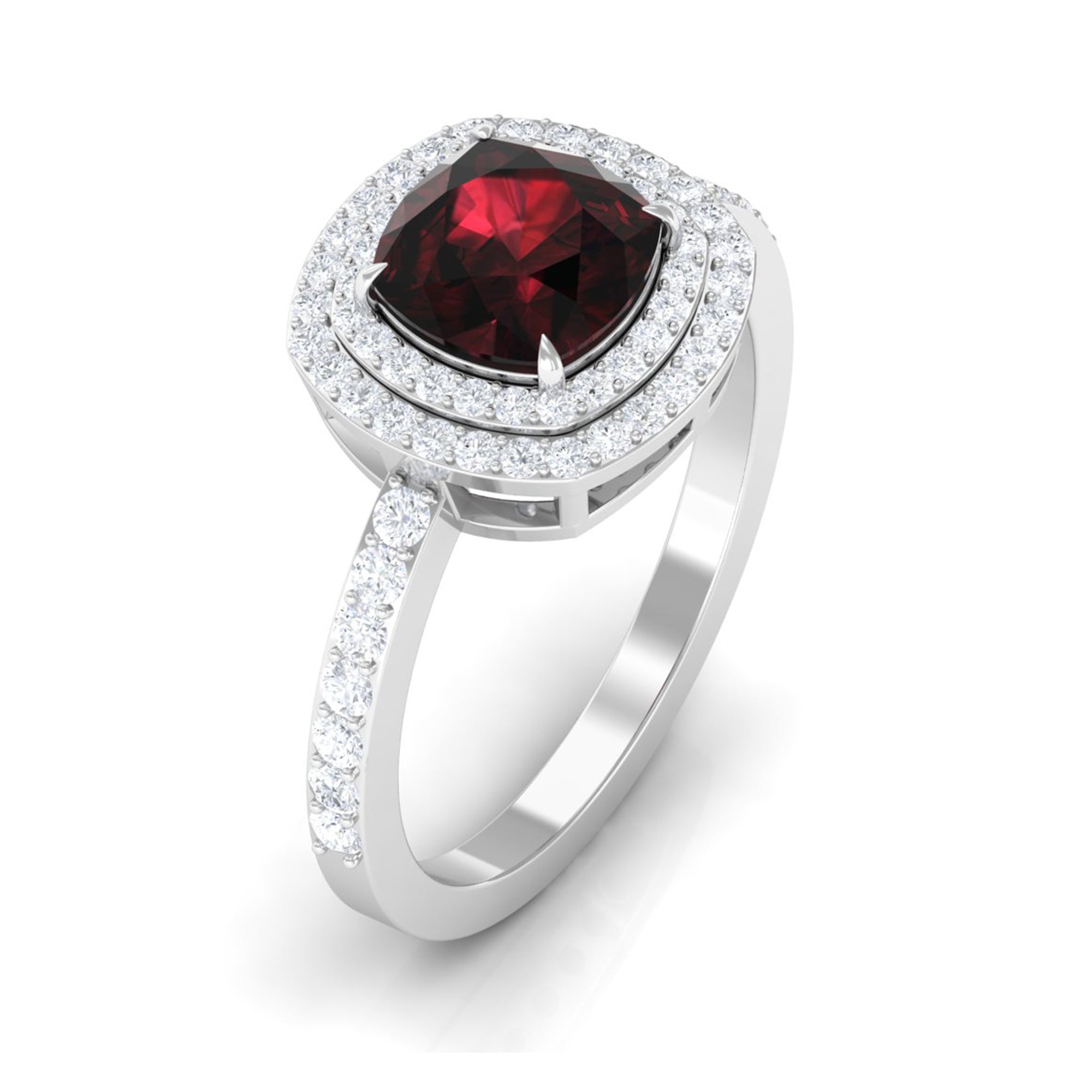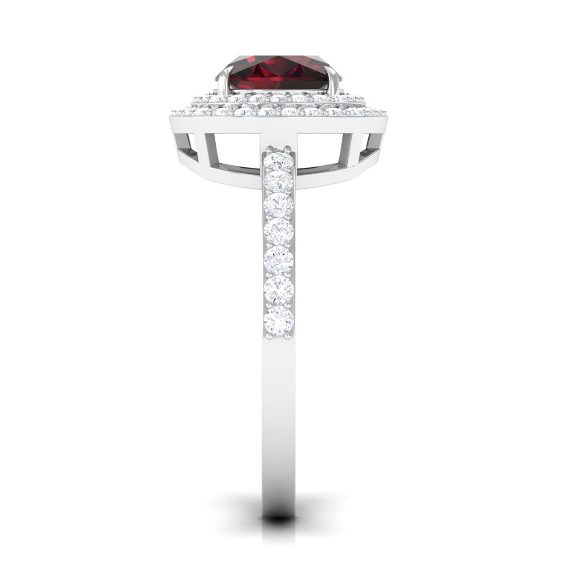 Garnet Halo Rings: - A fascinating twist on the traditional Solitaire Ring is the “halo ring”, which features a circle of diamond or moissanite surrounding the garnet solitaire. The Halo isn't just about adding sparkle; it adds versatility to the ring. Furthermore, it draws more focus to the garnet, creating the illusion of a larger stone. The halo style makes the ring more unique and attractive.