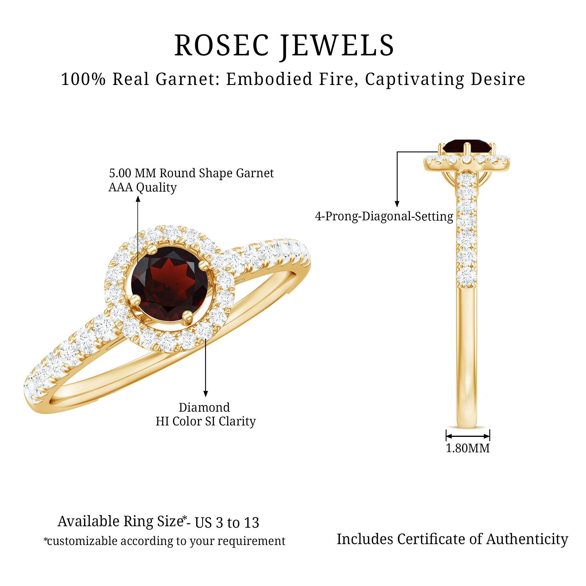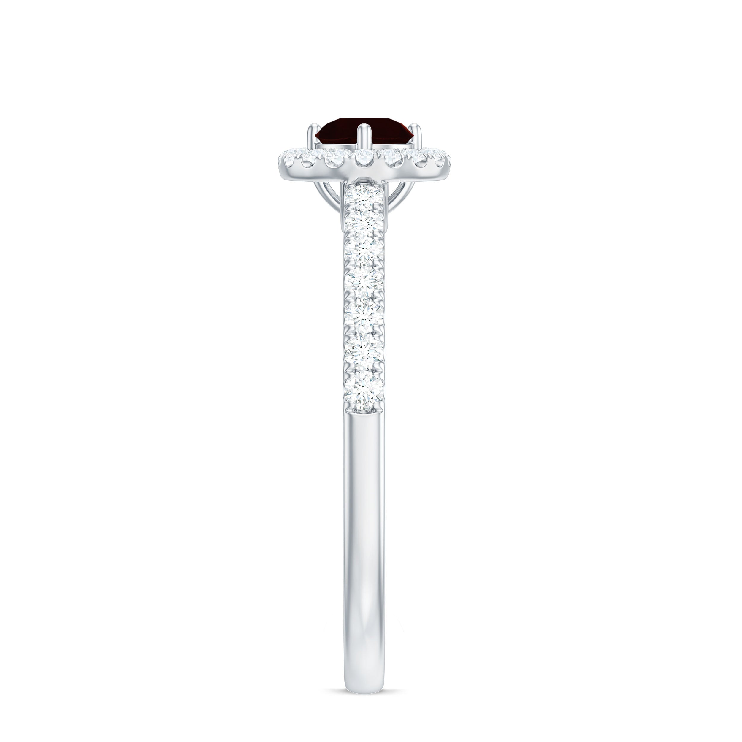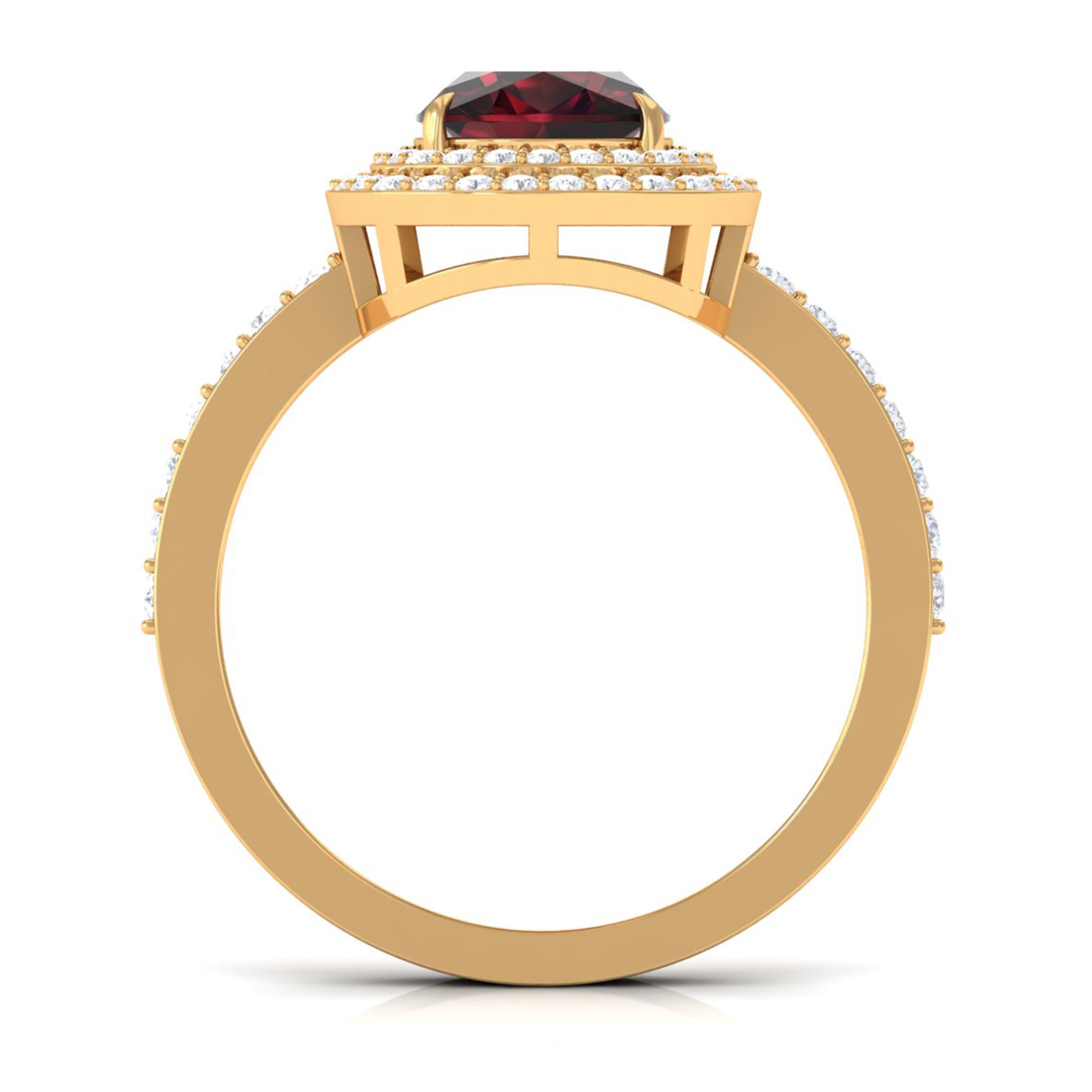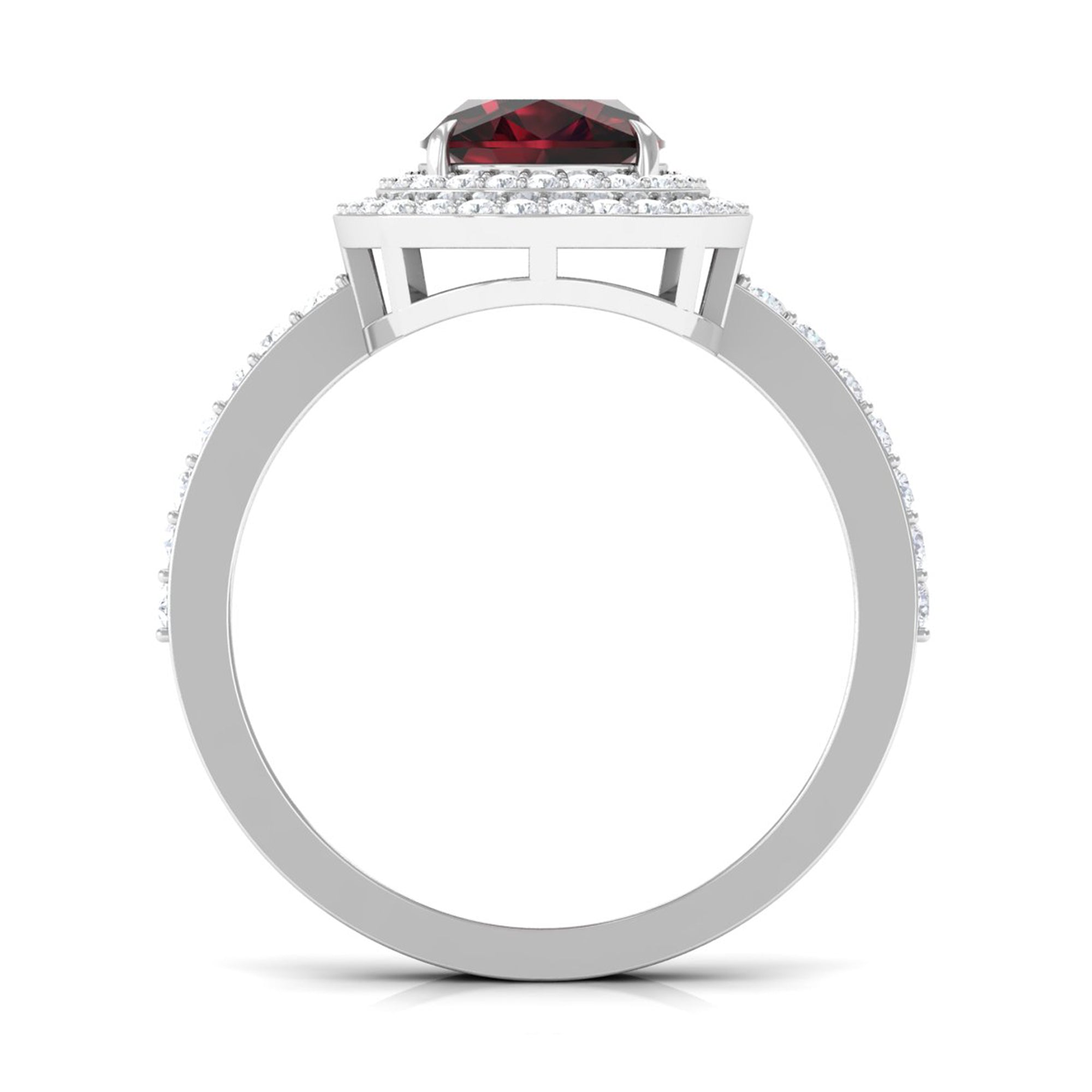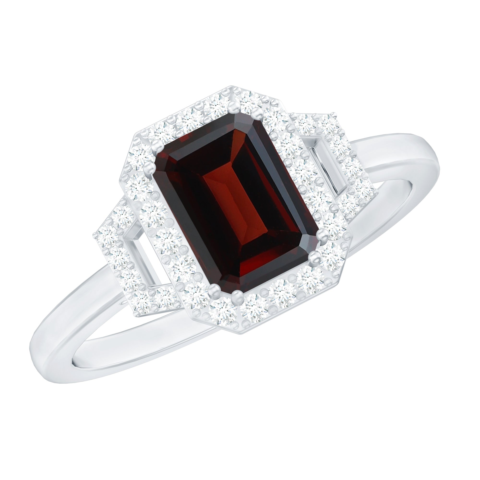 Garnet Halo Rings: - A fascinating twist on the traditional Solitaire Ring is the “halo ring”, which features a circle of diamond or moissanite surrounding the garnet solitaire. The Halo isn't just about adding sparkle; it adds versatility to the ring. Furthermore, it draws more focus to the garnet, creating the illusion of a larger stone. The halo style makes the ring more unique and attractive.