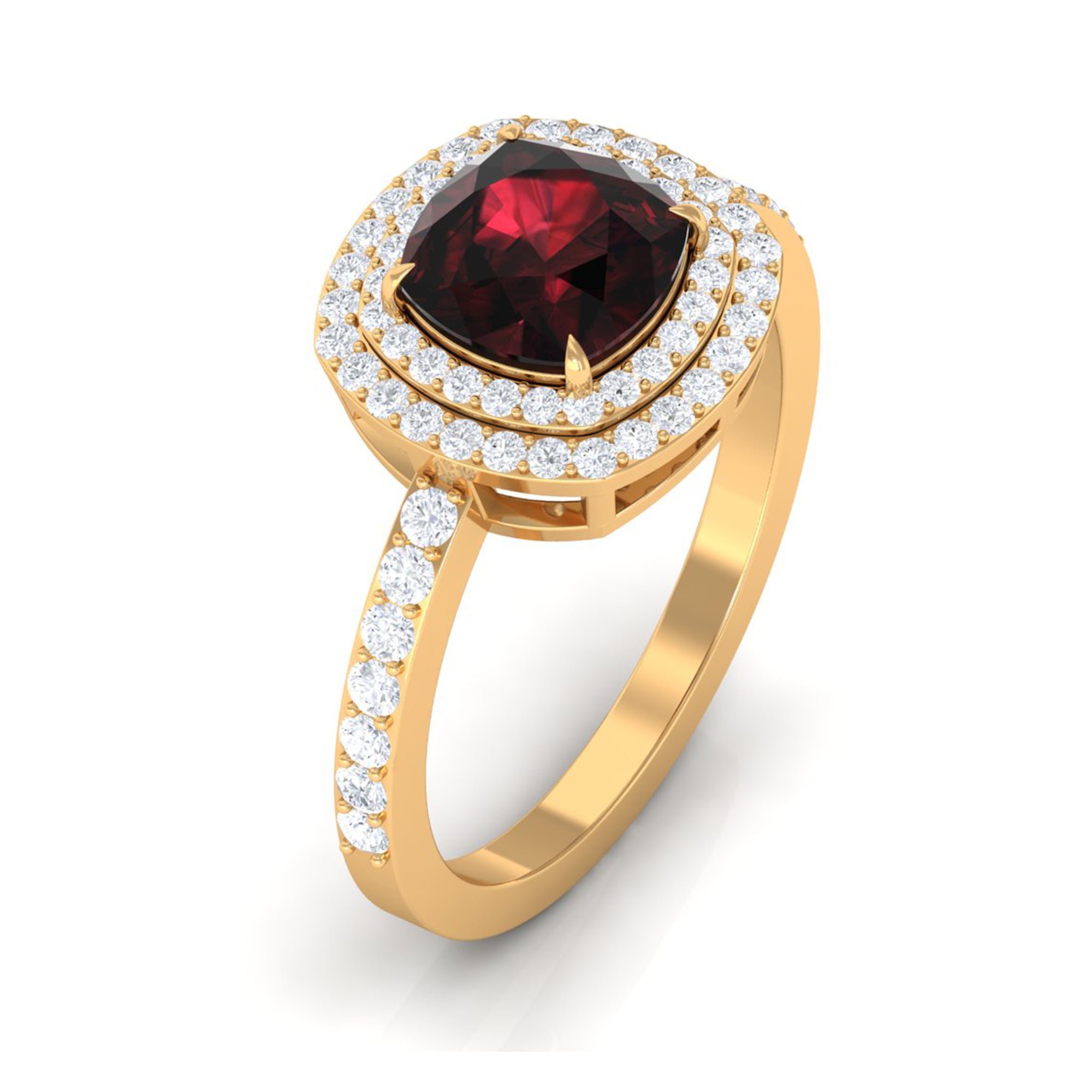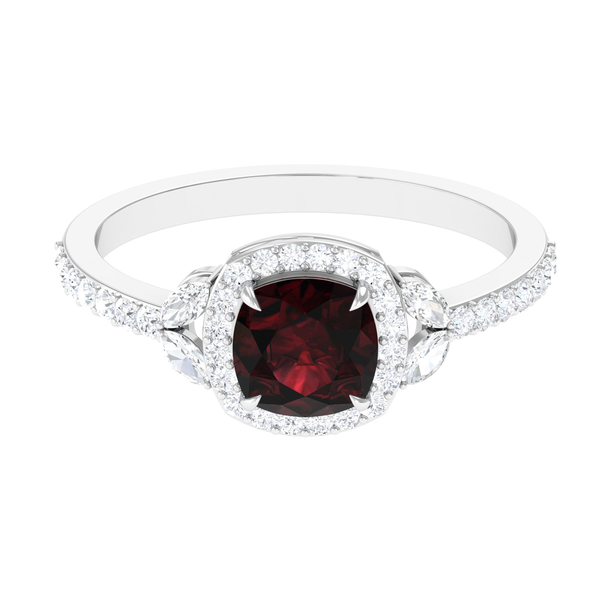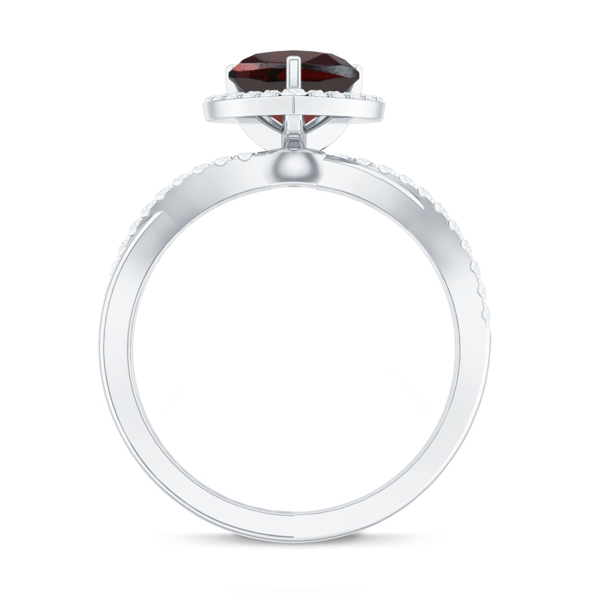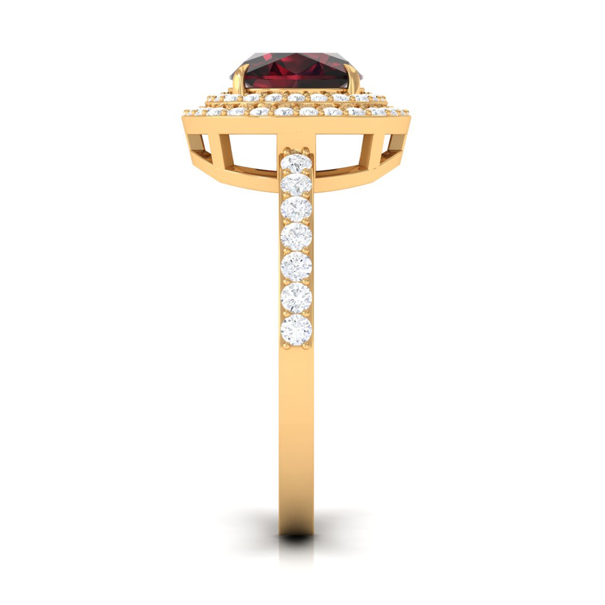 Garnet Halo Rings: - A fascinating twist on the traditional Solitaire Ring is the “halo ring”, which features a circle of diamond or moissanite surrounding the garnet solitaire. The Halo isn't just about adding sparkle; it adds versatility to the ring. Furthermore, it draws more focus to the garnet, creating the illusion of a larger stone. The halo style makes the ring more unique and attractive.