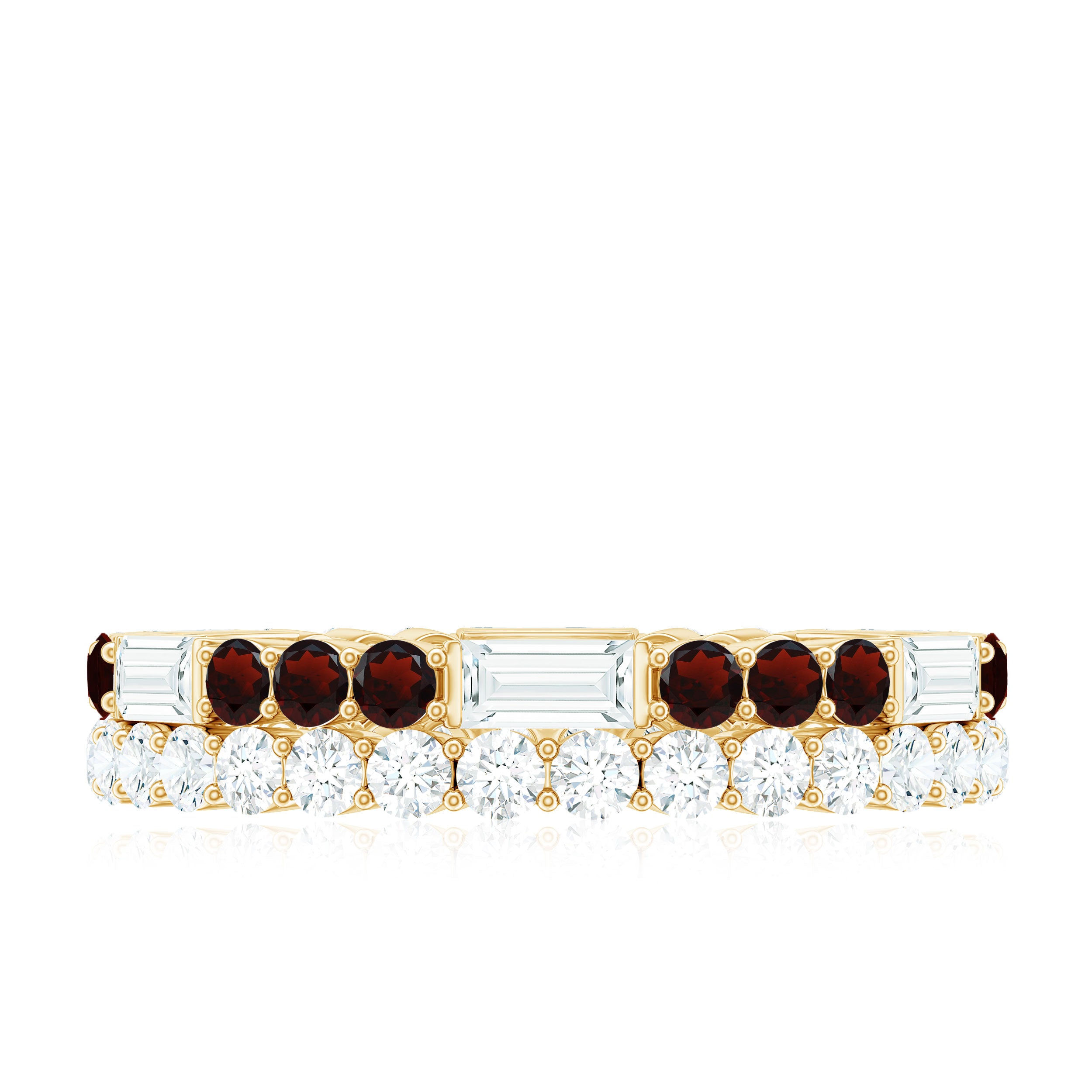When worn as a wedding band, garnets can be a symbolism of love and life force, while a eternity wedding band in itself will symbolize a promise of love for eternity.