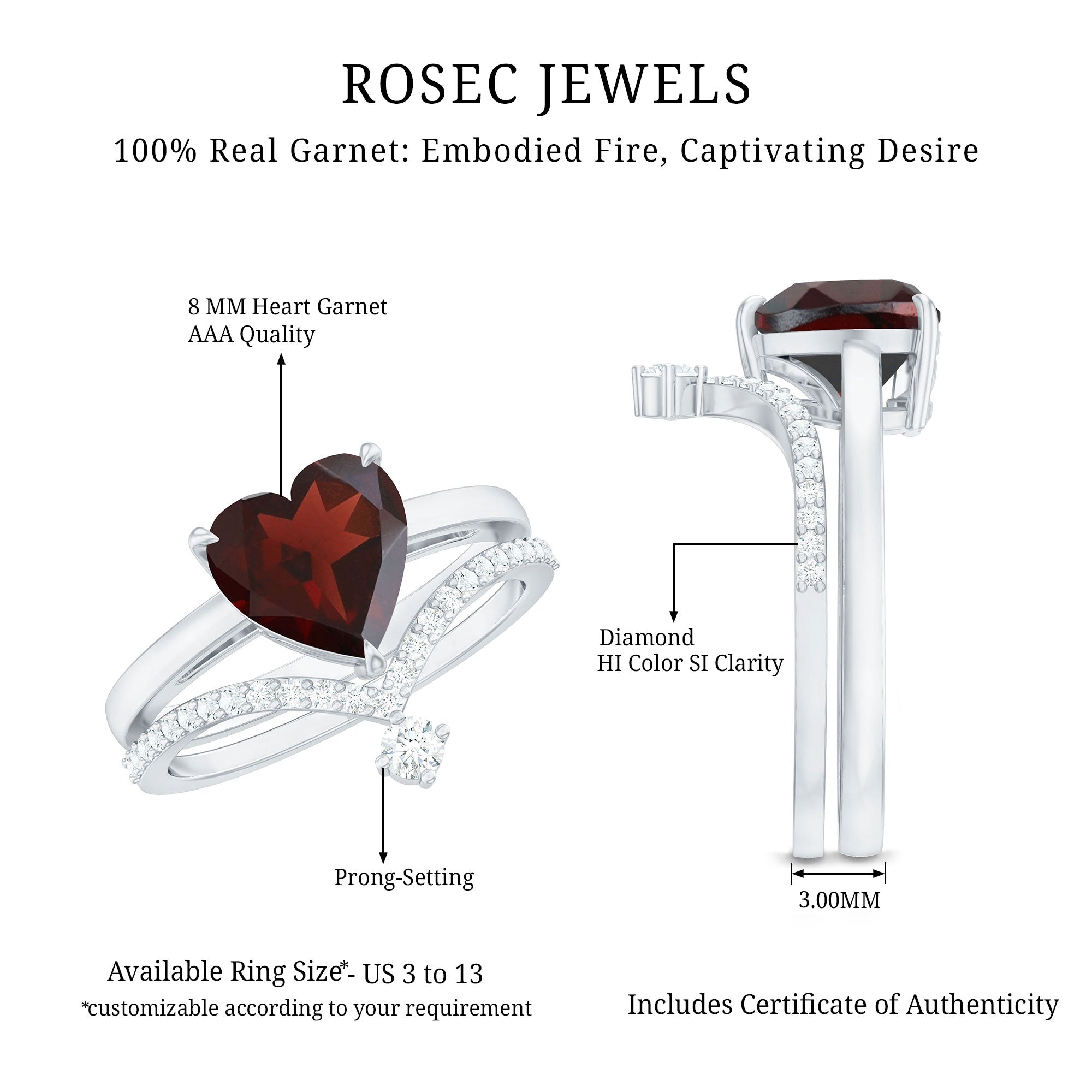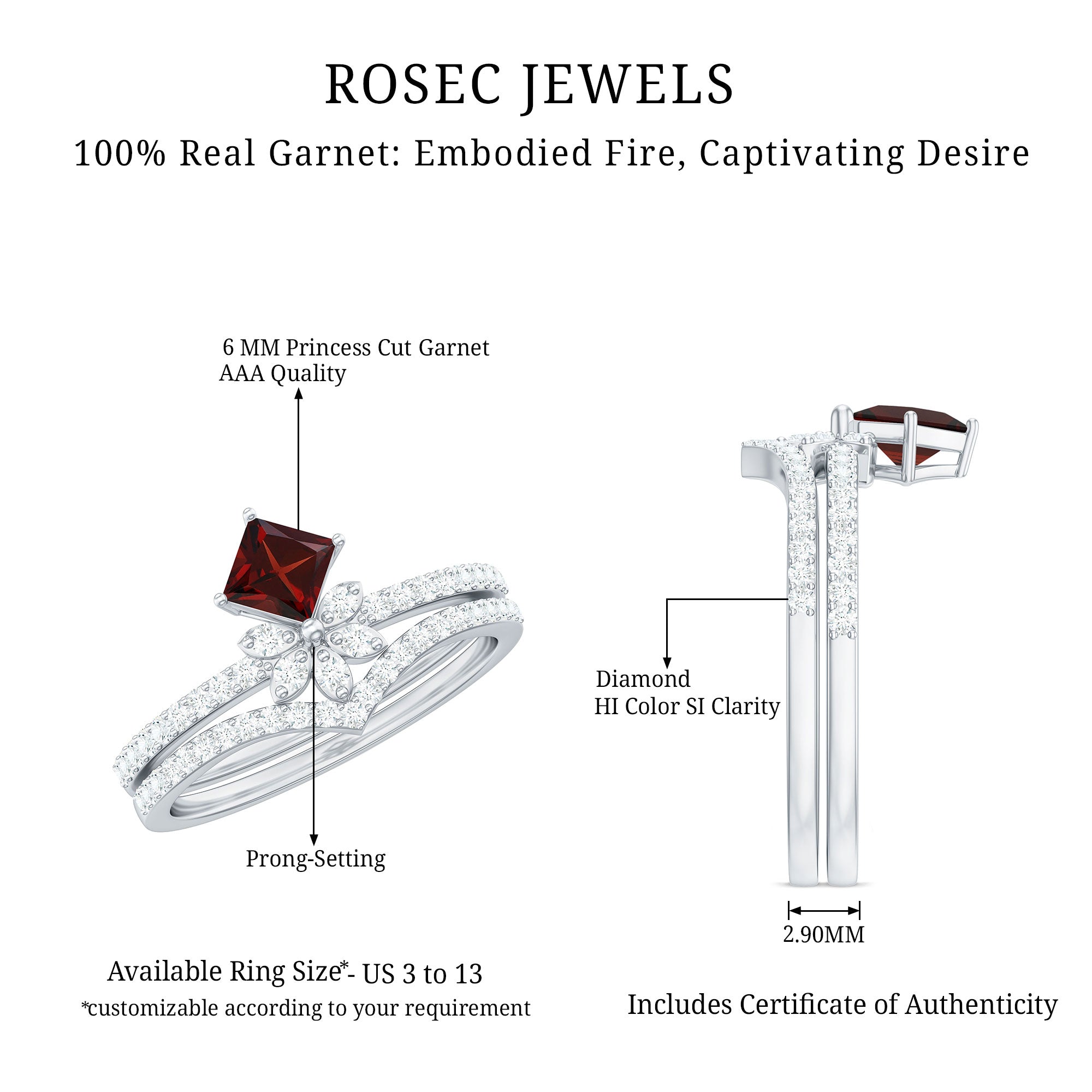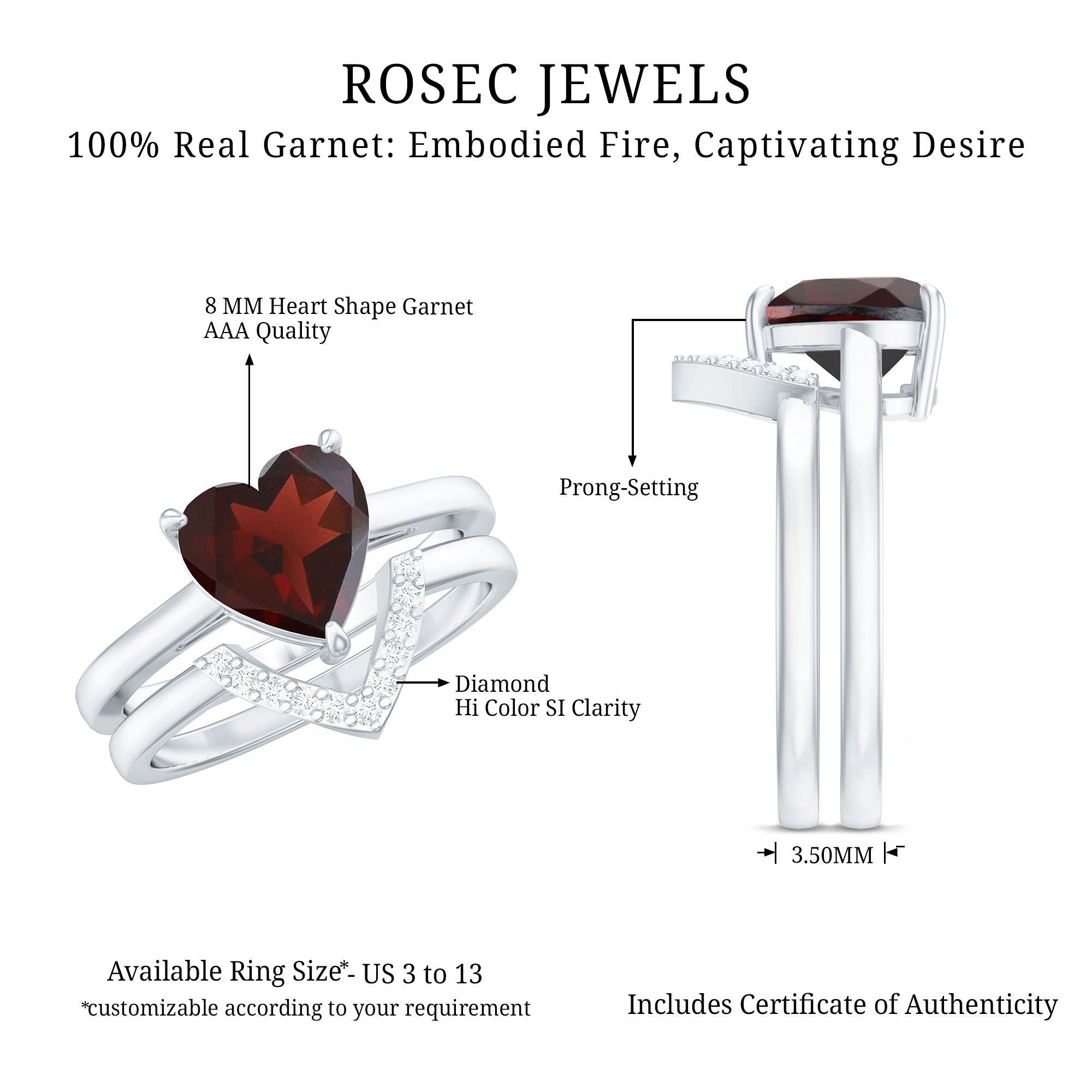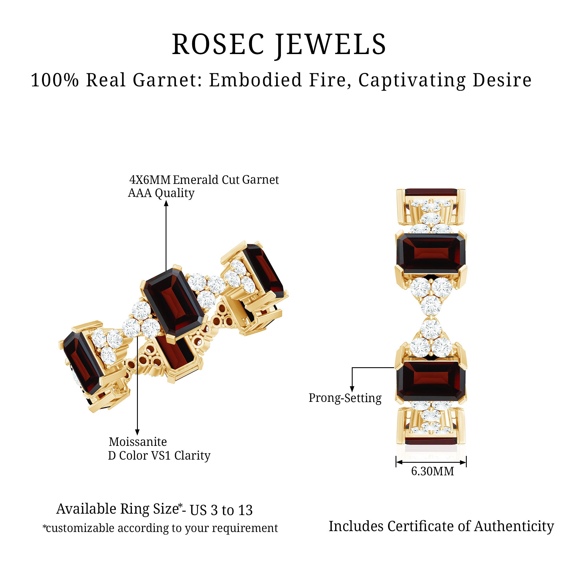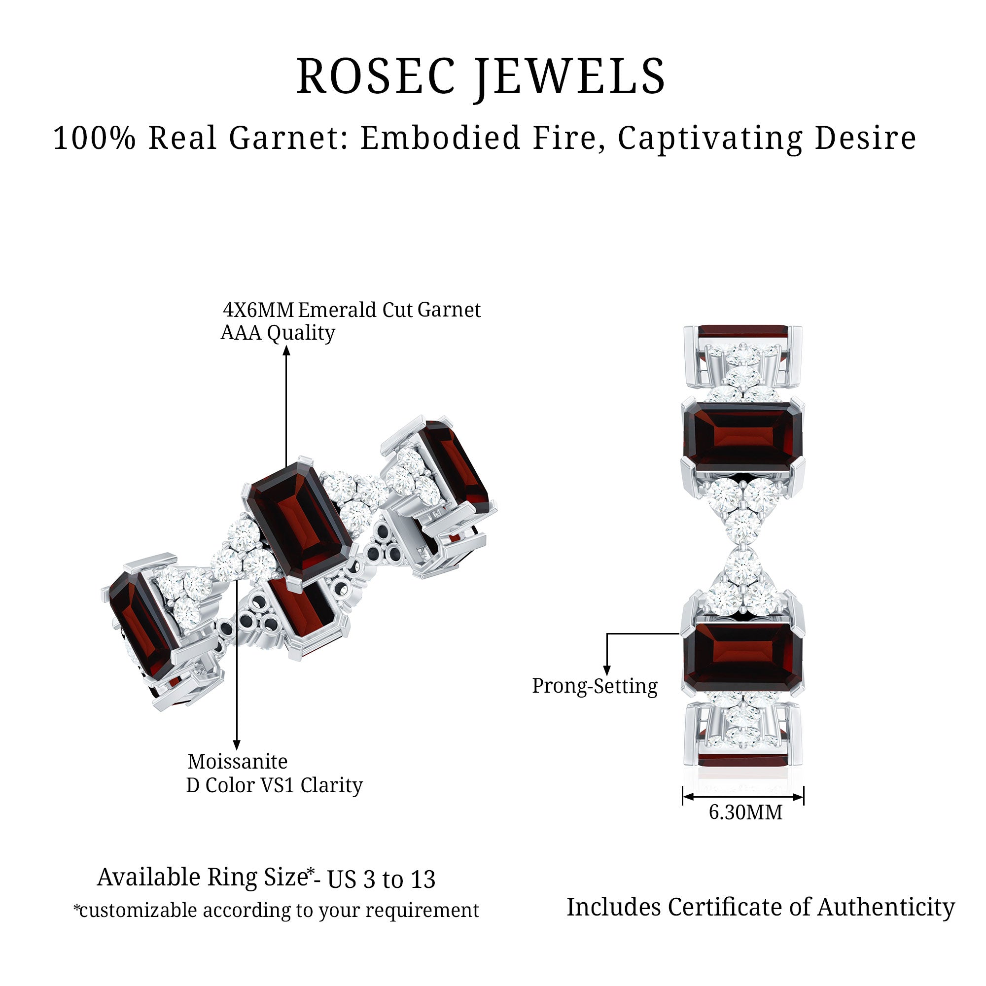 Garnet wedding rings from Rosec Jewels will leave your better half astound when the wedding ring slides down her finger, a moment that is going to sit in her memory forever. Featuring natural garnets, the member of silicate family of minerals and have loved for their wide spectrum of colors of almost all the shades. This great diversity in helps jewelers to employ red garnets while handcrafting garnet rings for women. Our artisans are as well after curating January birthstone rings for wedding that boast of fine and delicate designs.