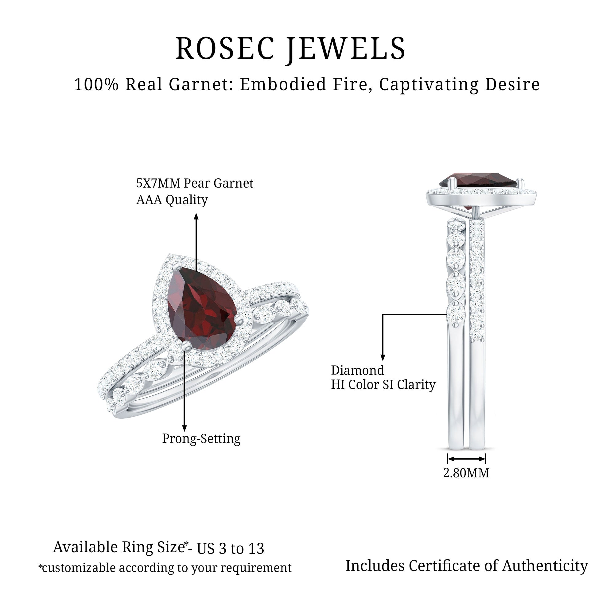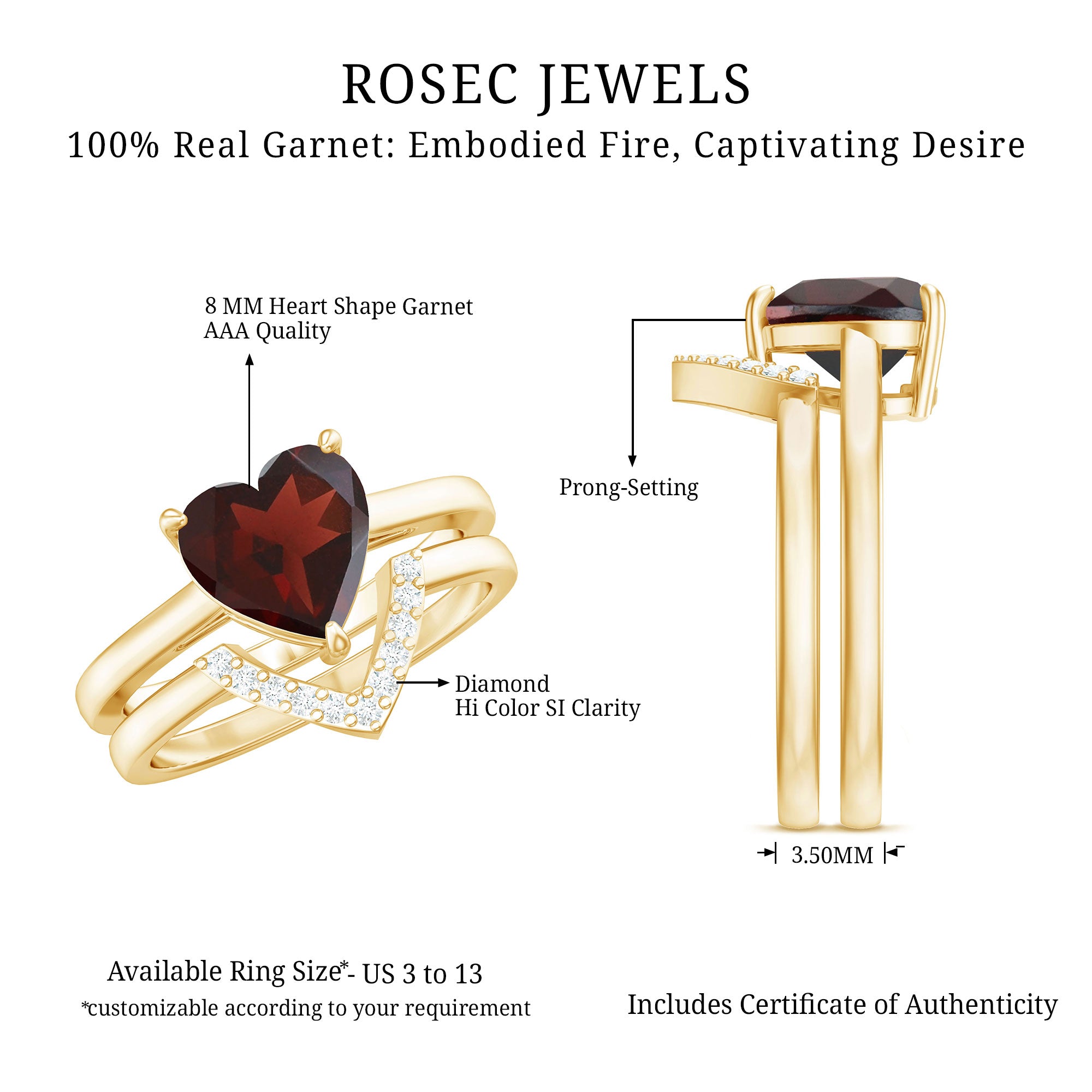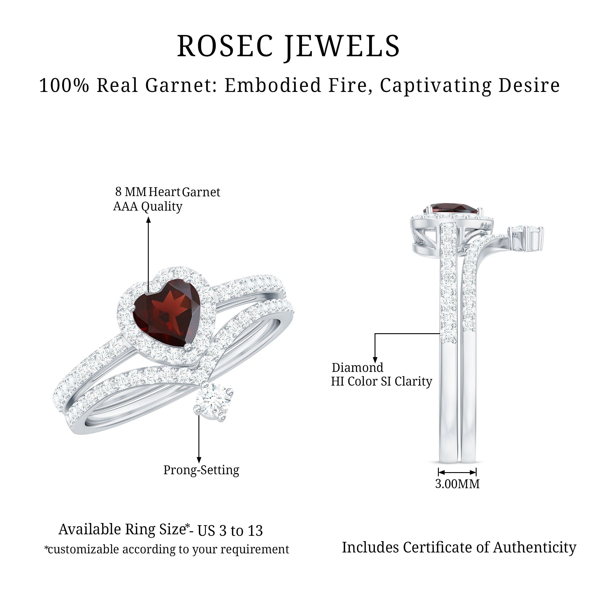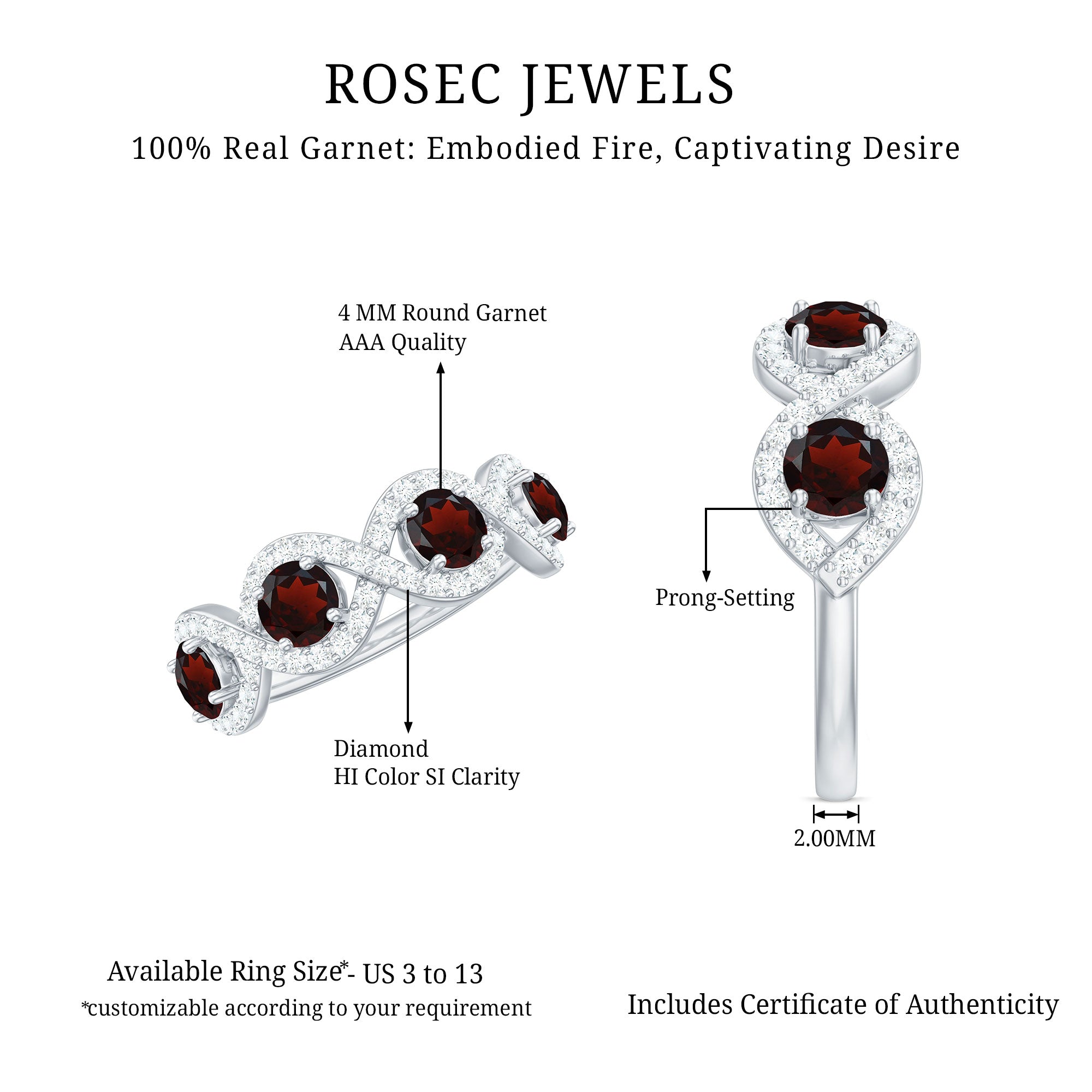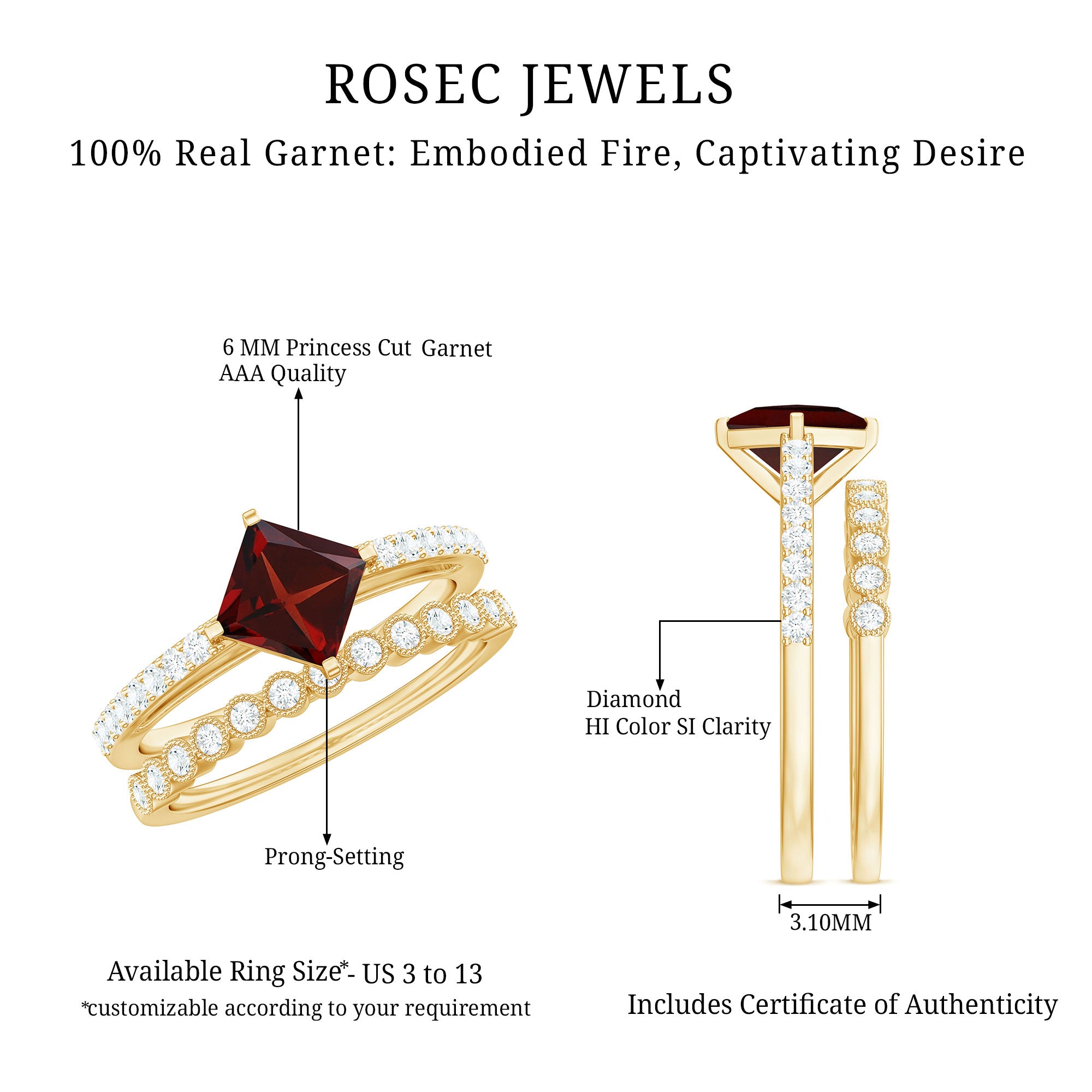 Garnet wedding rings from Rosec Jewels will leave your better half astound when the wedding ring slides down her finger, a moment that is going to sit in her memory forever. Featuring natural garnets, the member of silicate family of minerals and have loved for their wide spectrum of colors of almost all the shades. This great diversity in helps jewelers to employ red garnets while handcrafting garnet rings for women. Our artisans are as well after curating January birthstone rings for wedding that boast of fine and delicate designs.