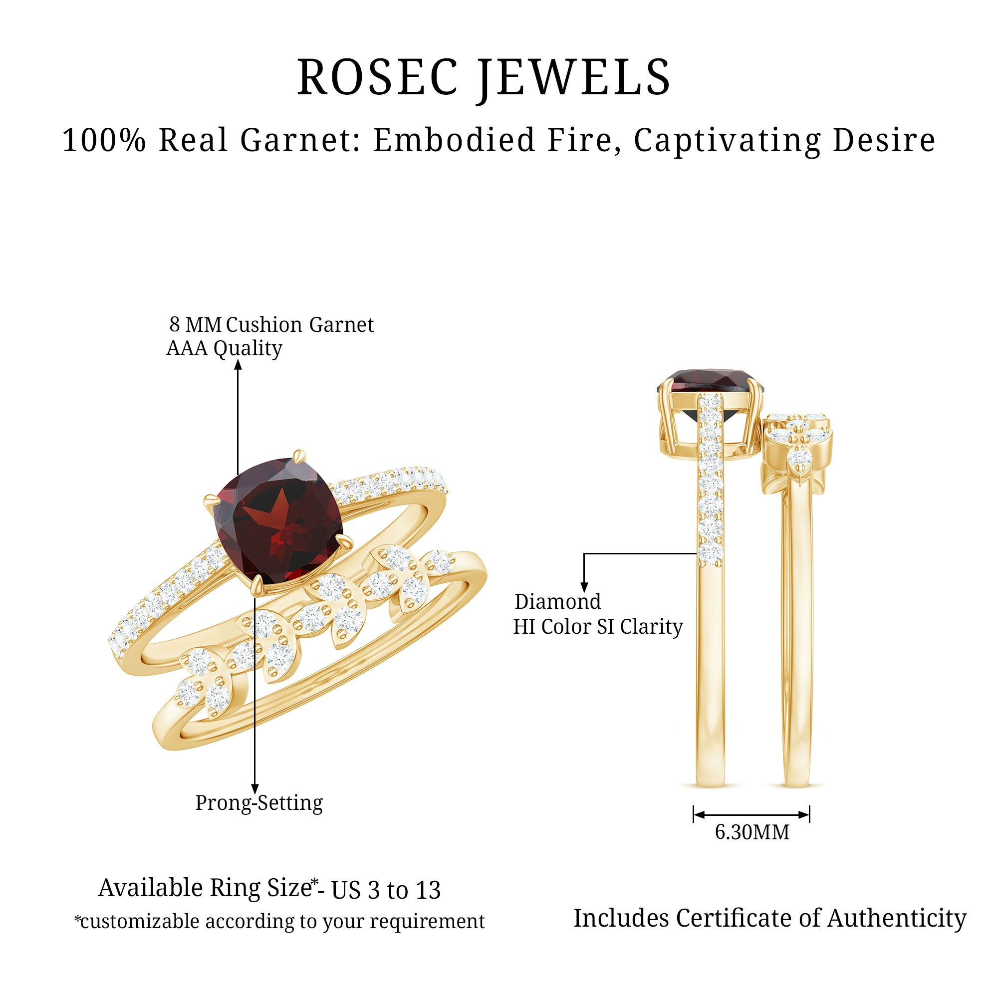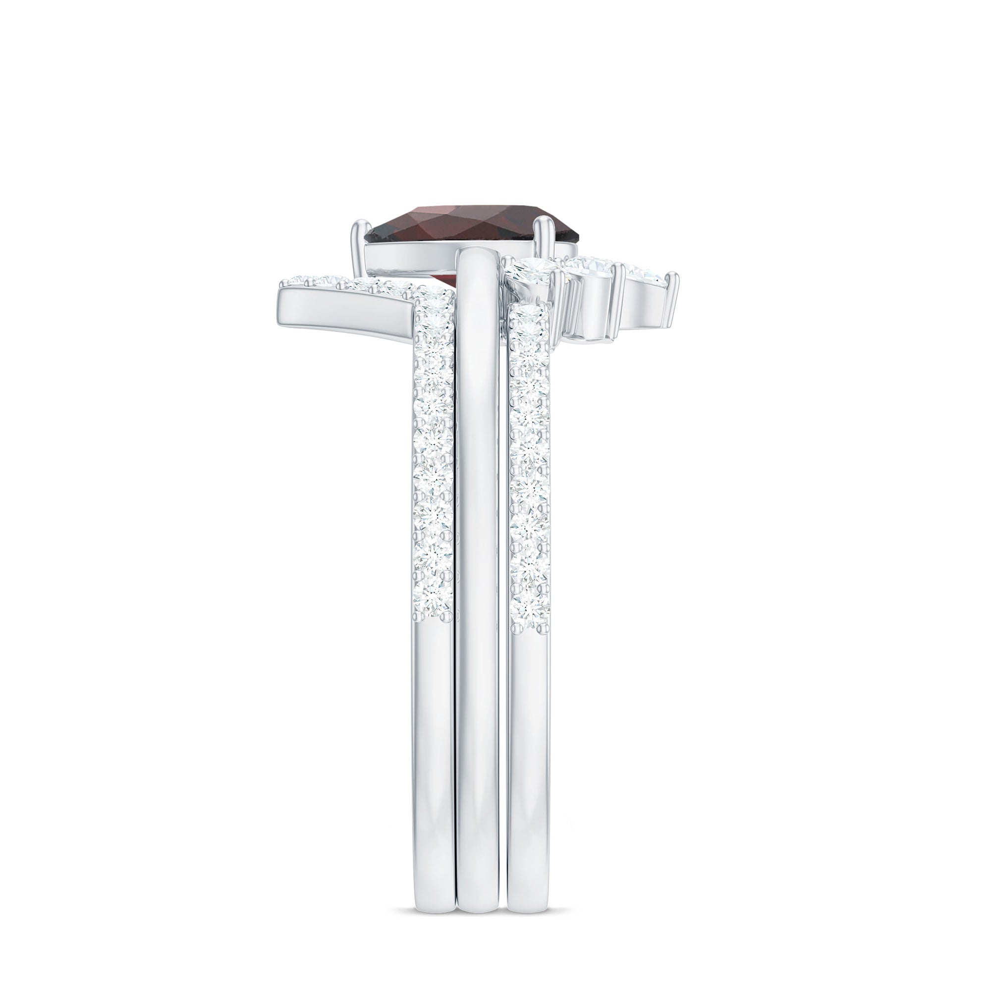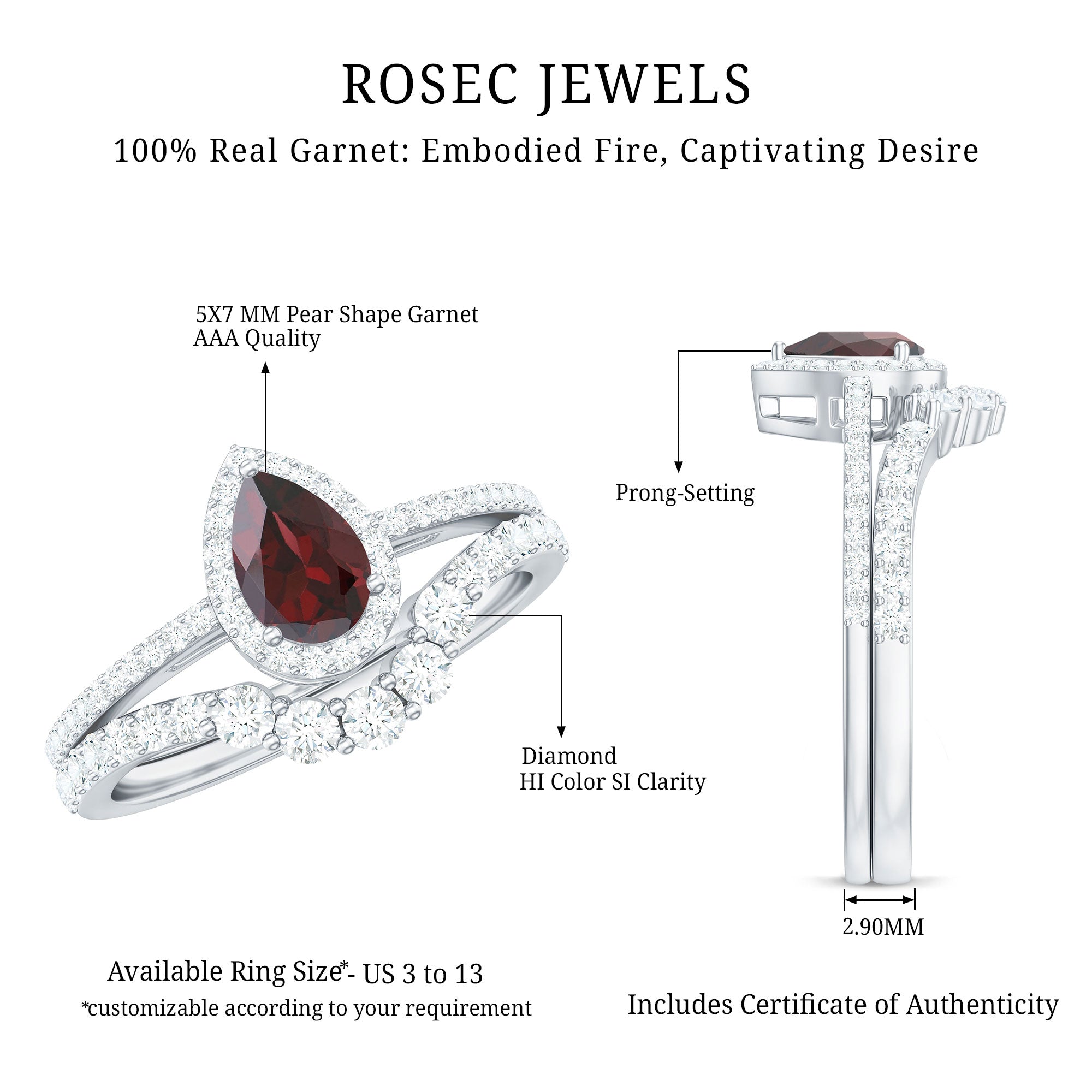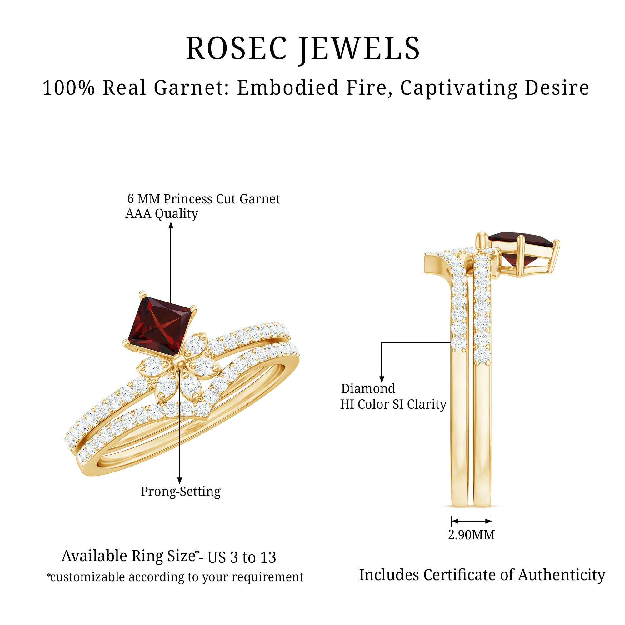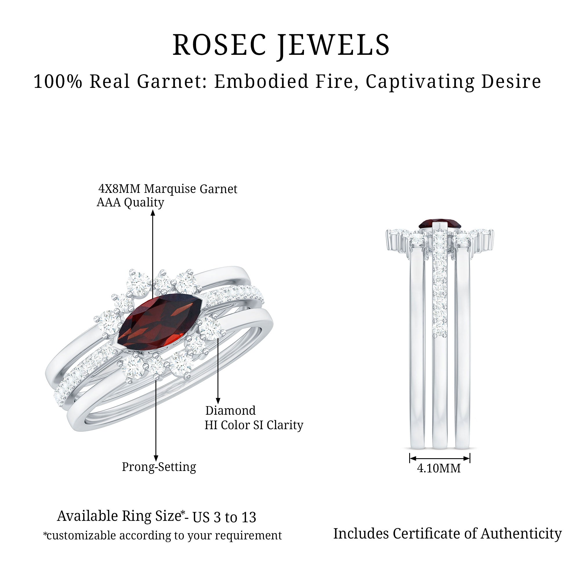Garnet wedding rings from Rosec Jewels will leave your better half astound when the wedding ring slides down her finger, a moment that is going to sit in her memory forever. Featuring natural garnets, the member of silicate family of minerals and have loved for their wide spectrum of colors of almost all the shades. This great diversity in helps jewelers to employ red garnets while handcrafting garnet rings for women. Our artisans are as well after curating January birthstone rings for wedding that boast of fine and delicate designs.