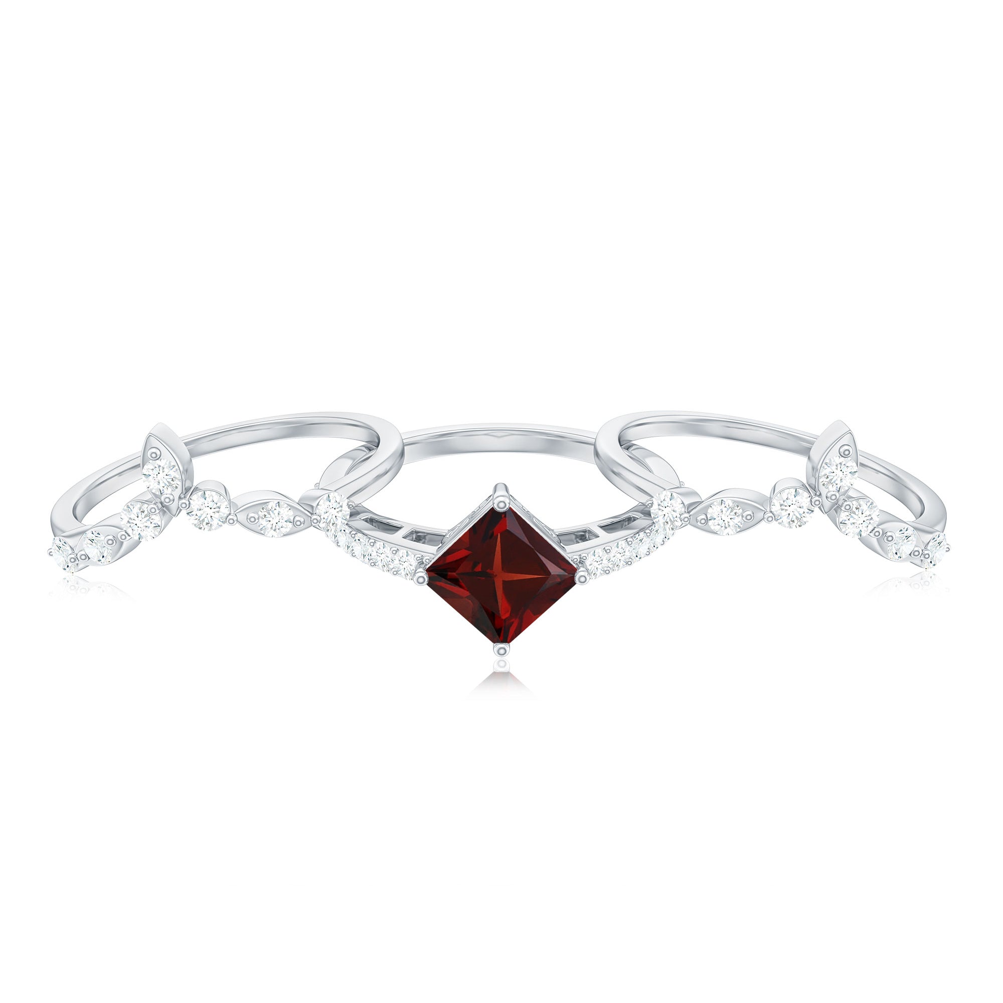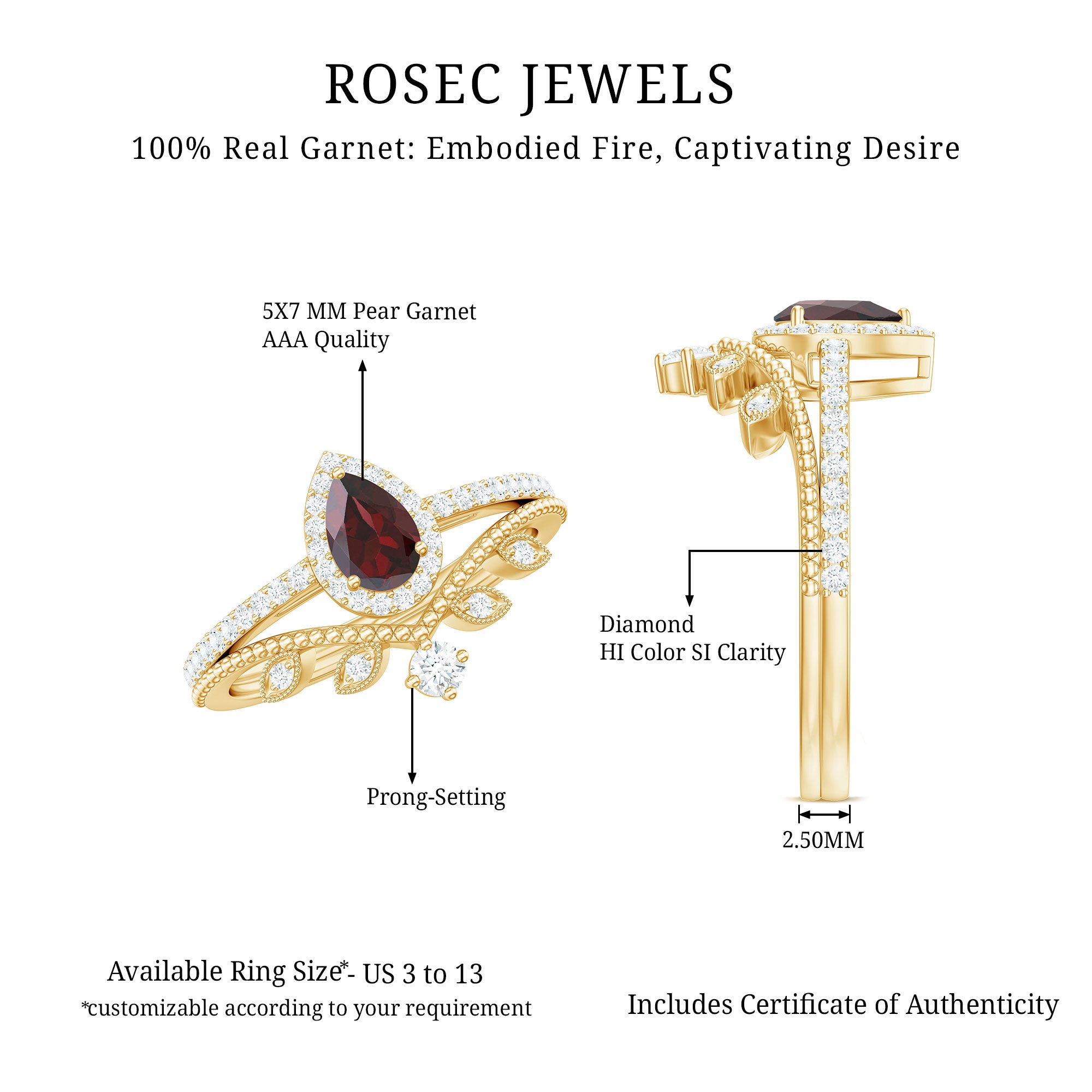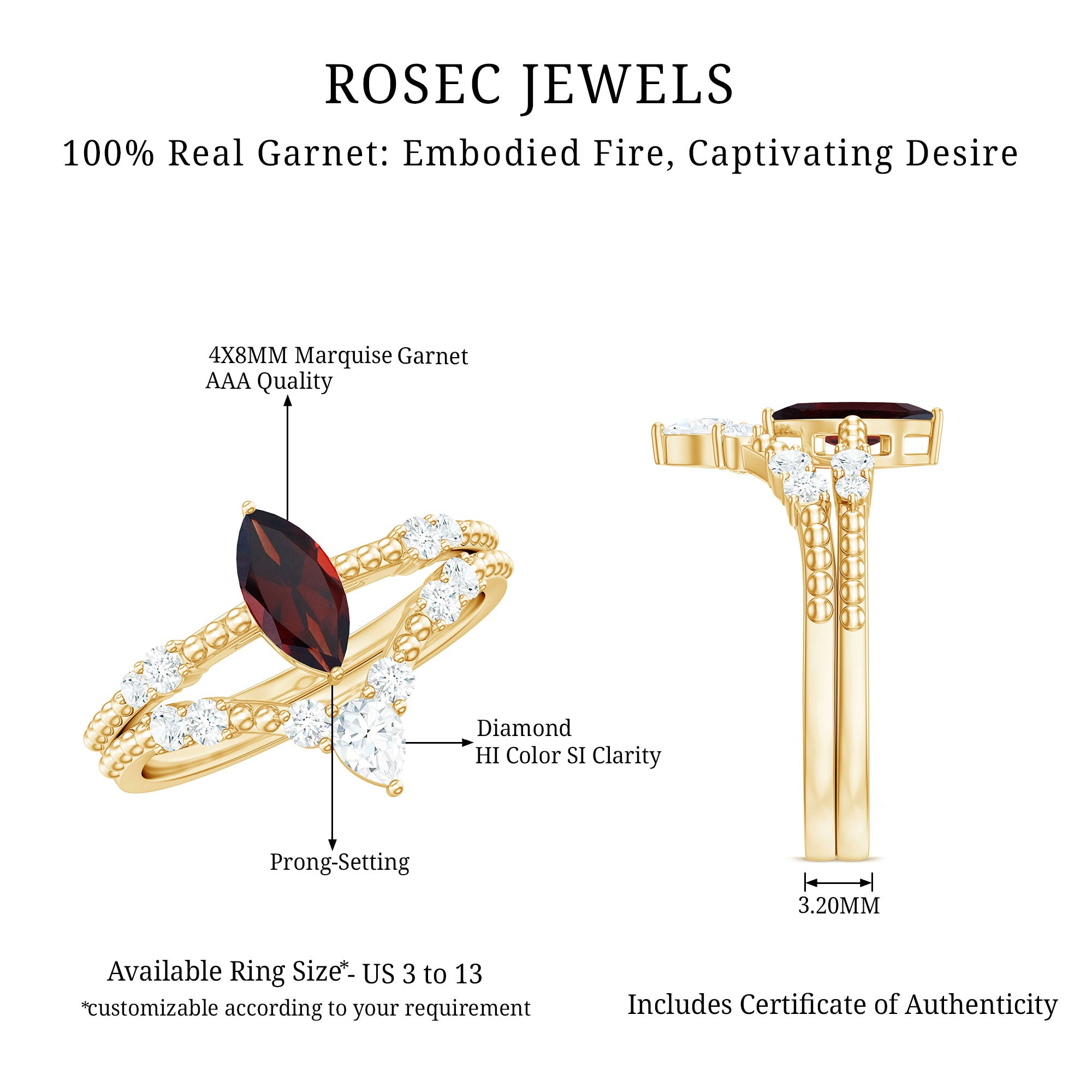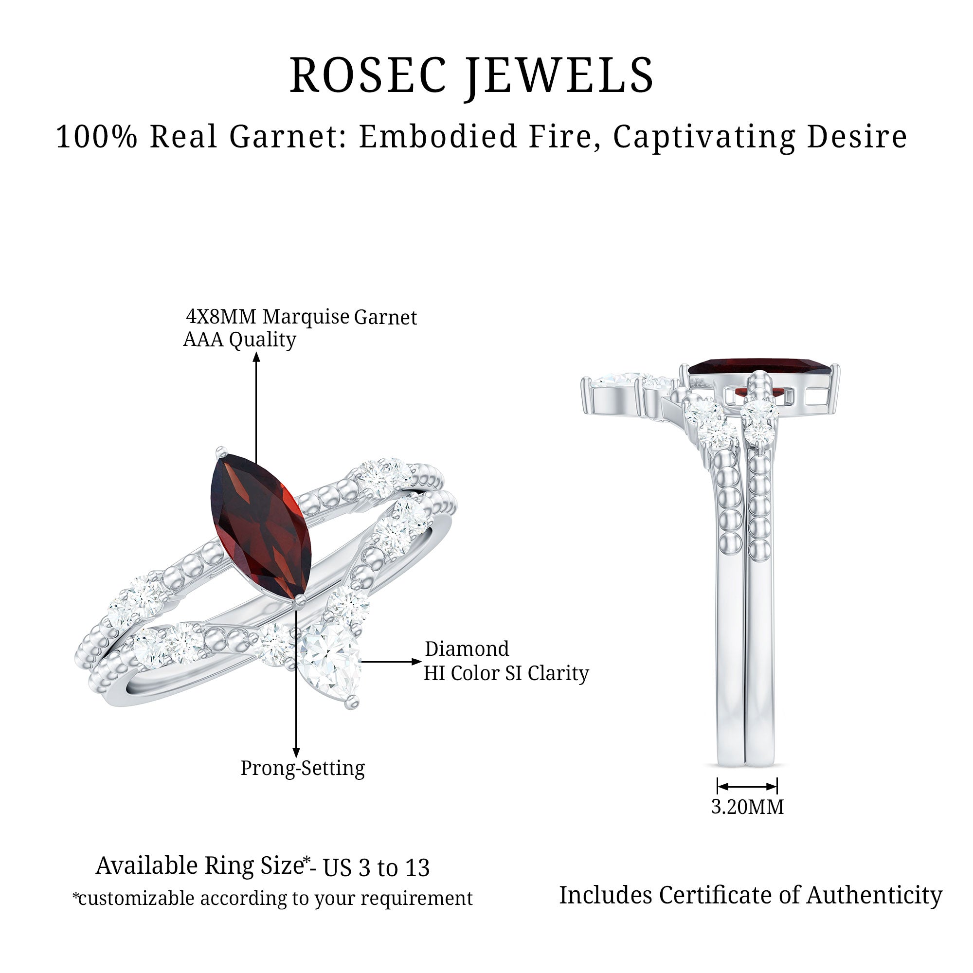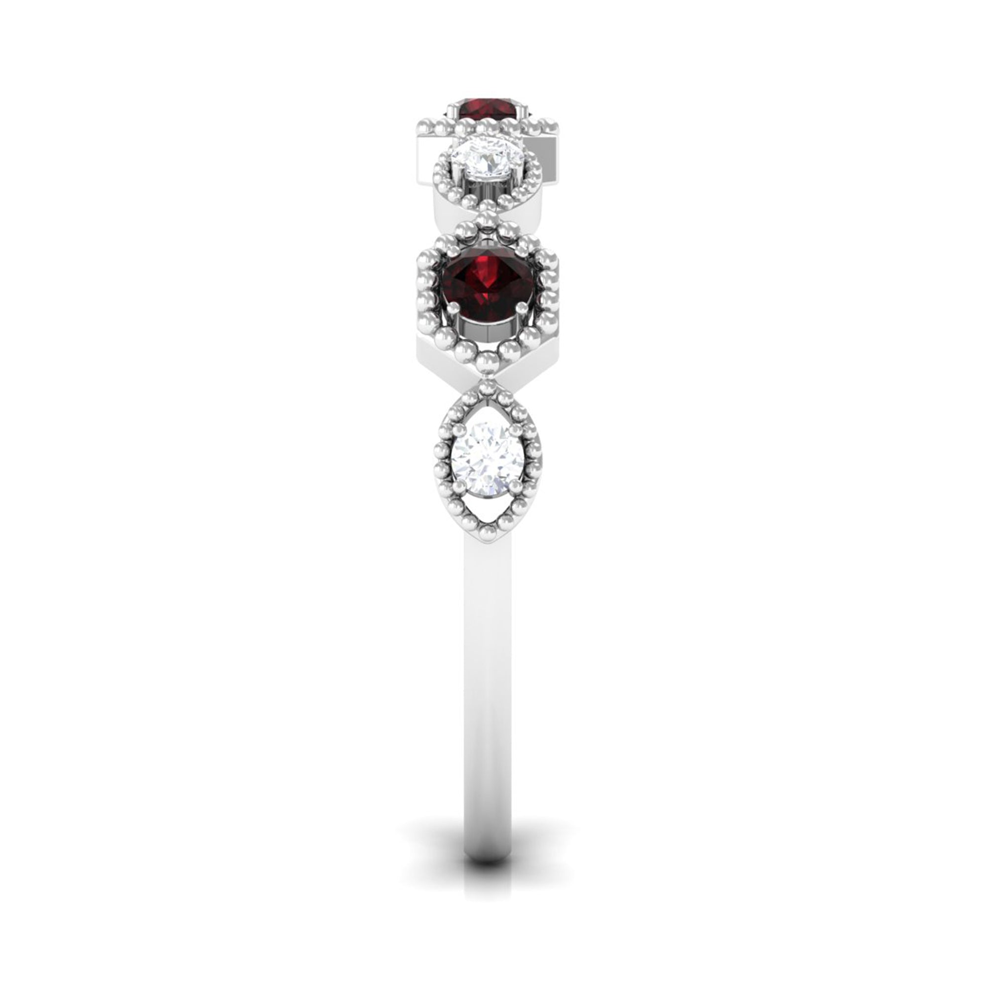 Garnet wedding rings from Rosec Jewels will leave your better half astound when the wedding ring slides down her finger, a moment that is going to sit in her memory forever. Featuring natural garnets, the member of silicate family of minerals and have loved for their wide spectrum of colors of almost all the shades. This great diversity in helps jewelers to employ red garnets while handcrafting garnet rings for women. Our artisans are as well after curating January birthstone rings for wedding that boast of fine and delicate designs.