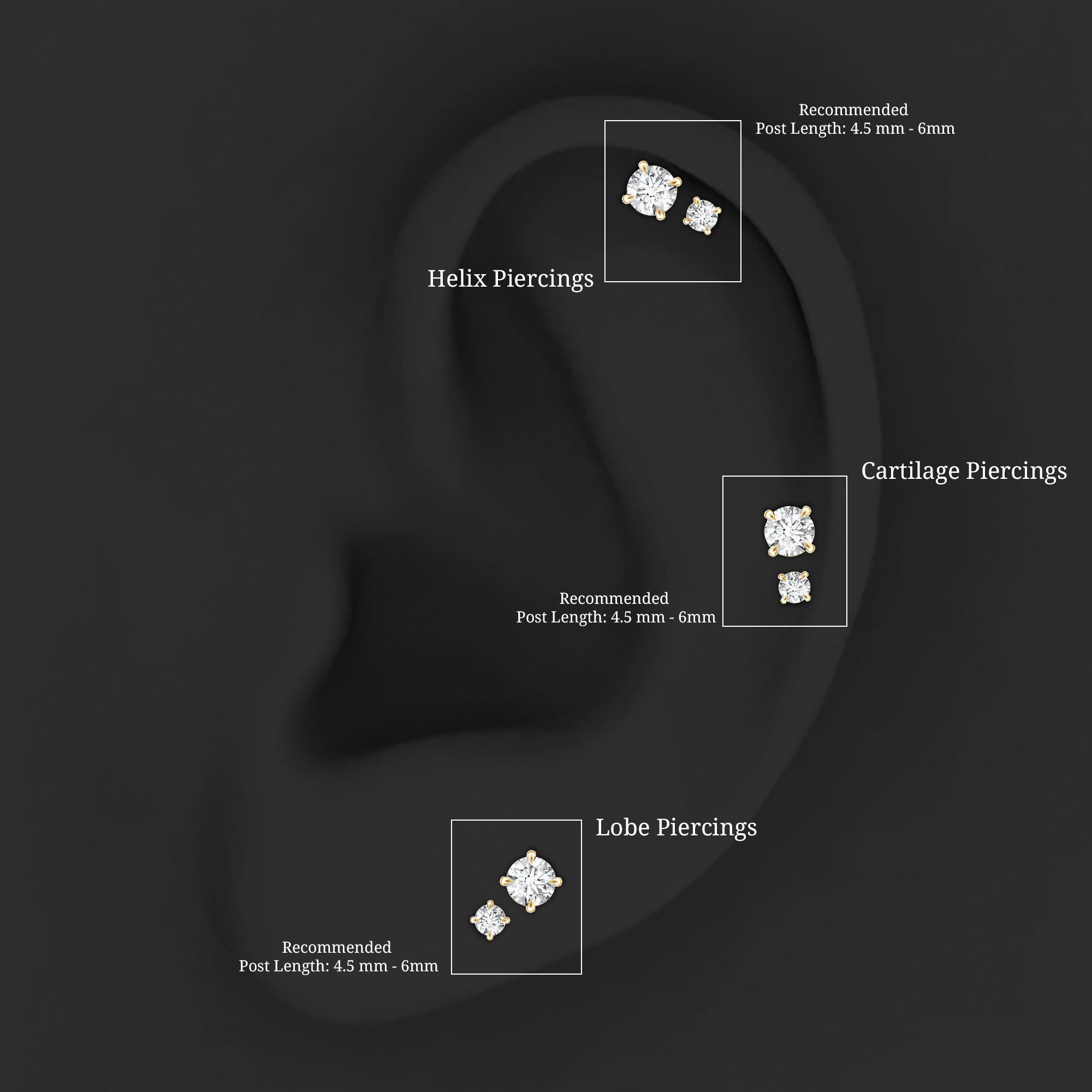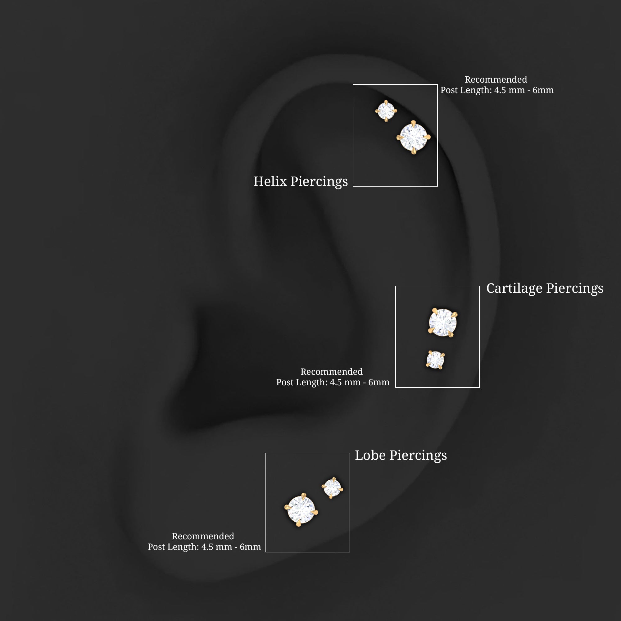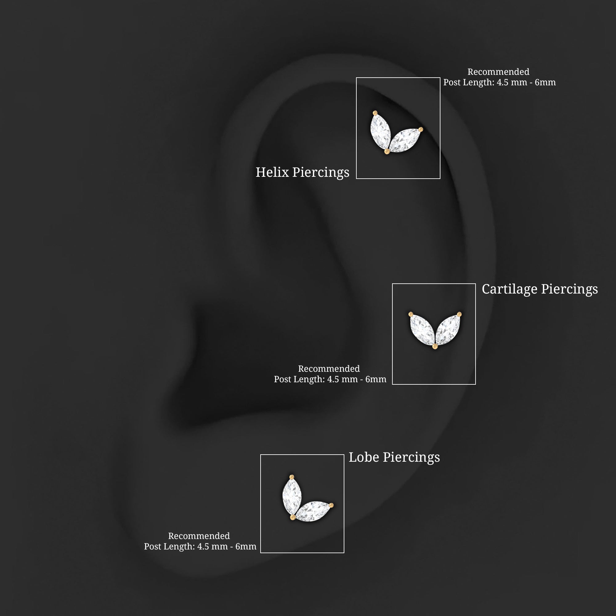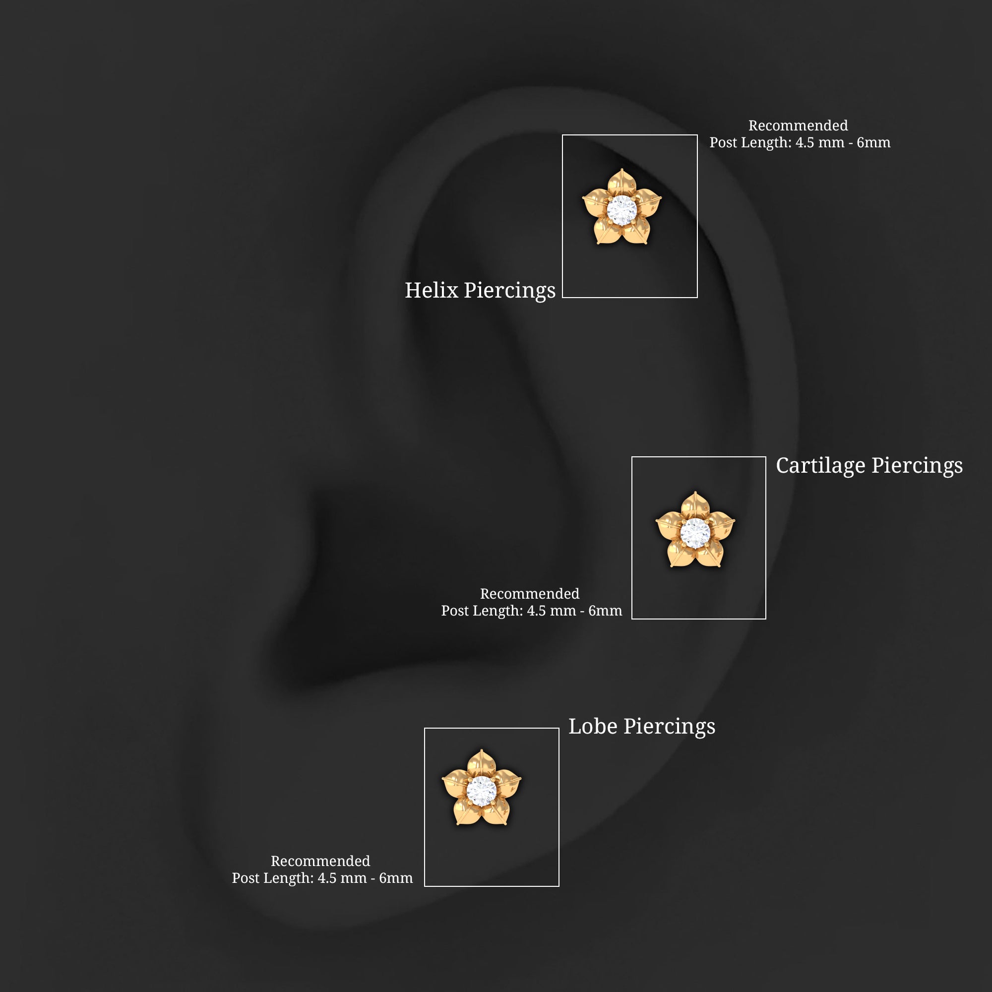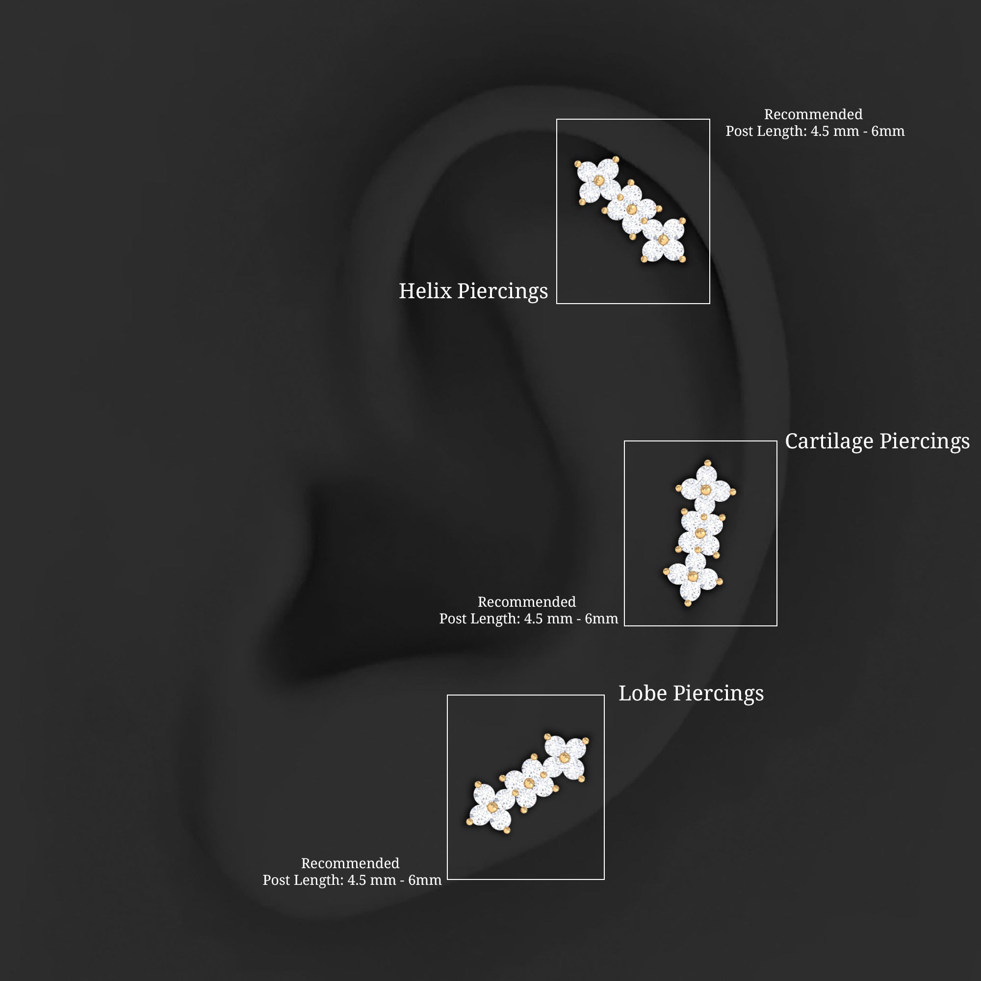 Stud Earrings: - Basically, helix stud earrings can be worn anywhere from the lower part of the earlobe to the upper curve of the ear. They offer a versatile range of designs, encompassing drop studs, heart-shaped studs, solitary studs, infinity helix studs, halo studs designed specifically for helix piercings. Our Earring for Helix Piercing stands out as an ideal choice for everyday wear, boasting both style and comfort without causing any irritation.