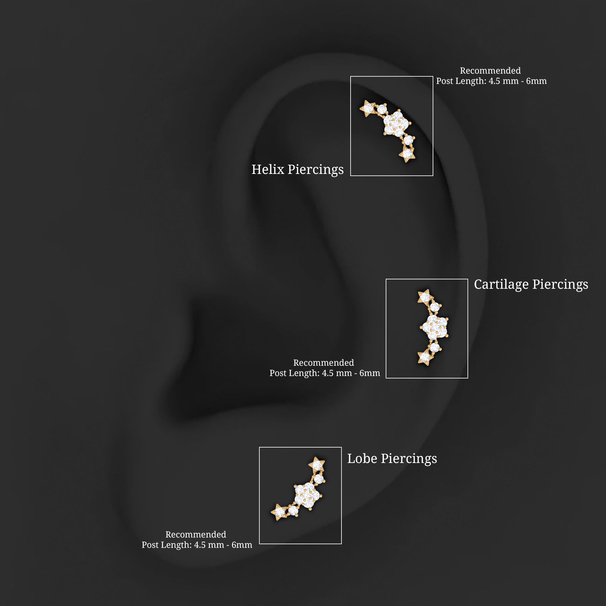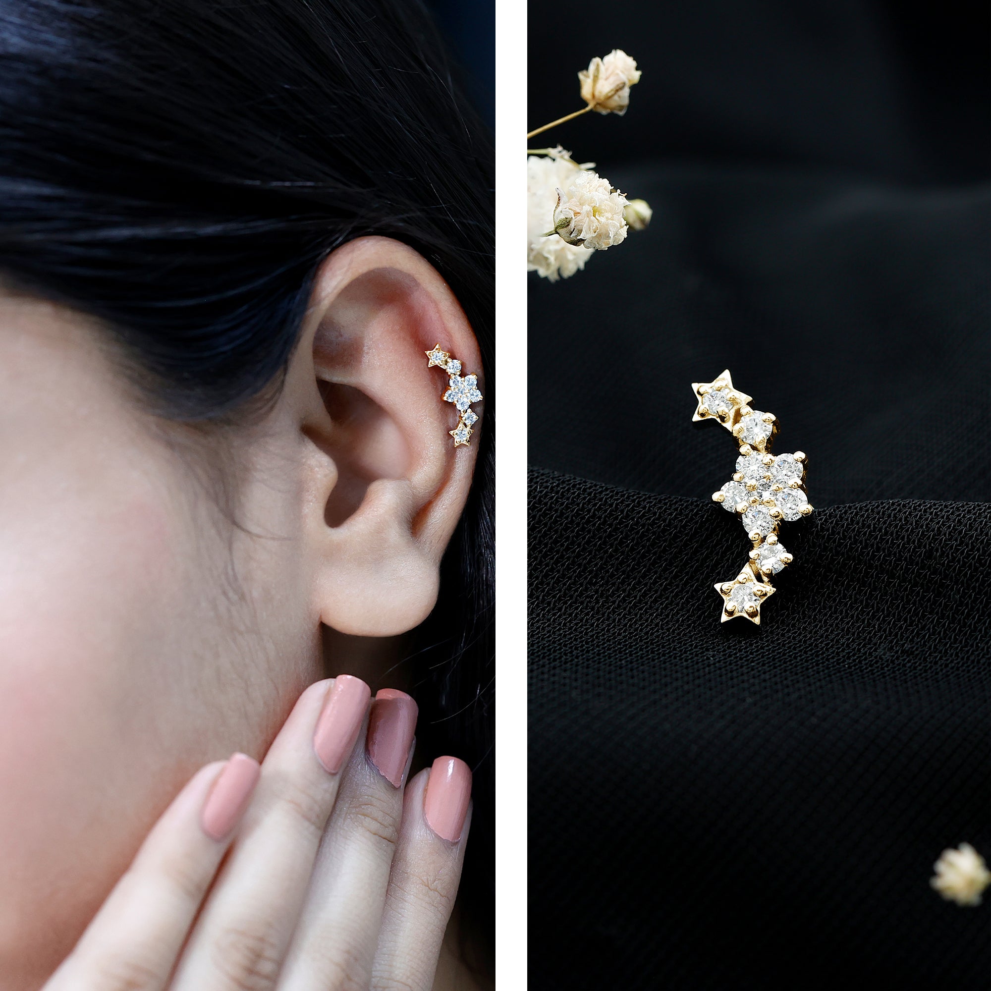 The main reason for buying the earring for helix piercing is that they comes in diver styles like hoop earrings, stud earrings, crawler earrings, chain earrings, climber earrings, celestial earrings, and cluster earrings, all are perfect for helix piercing.
