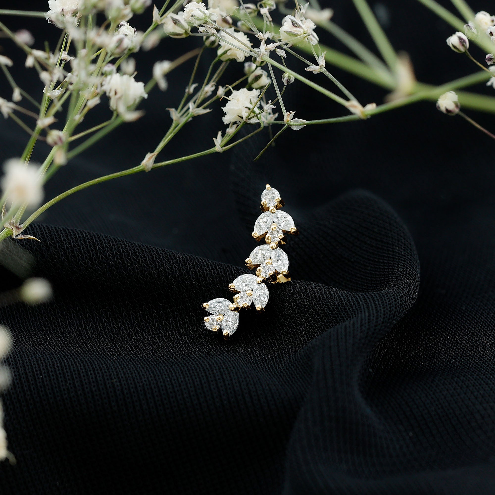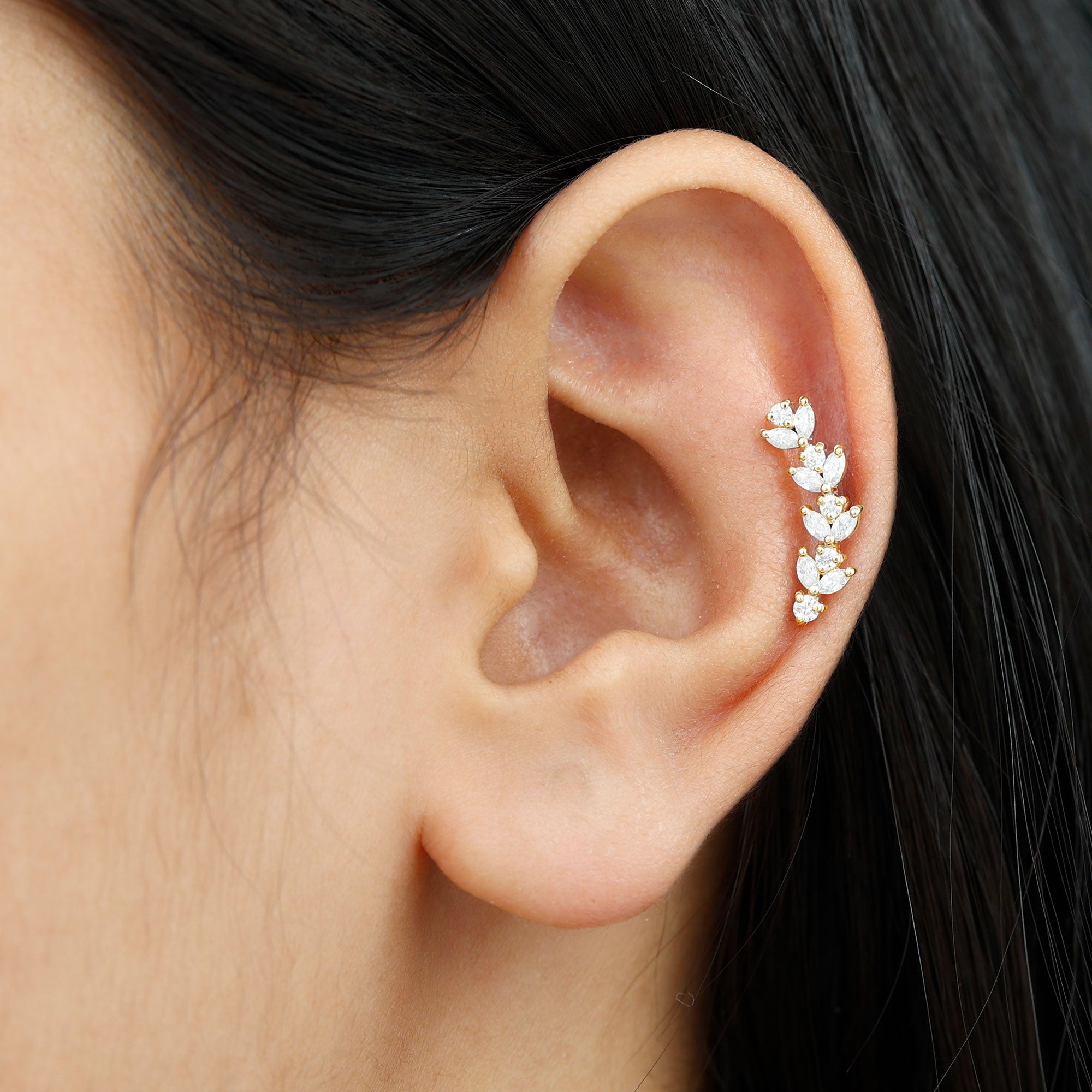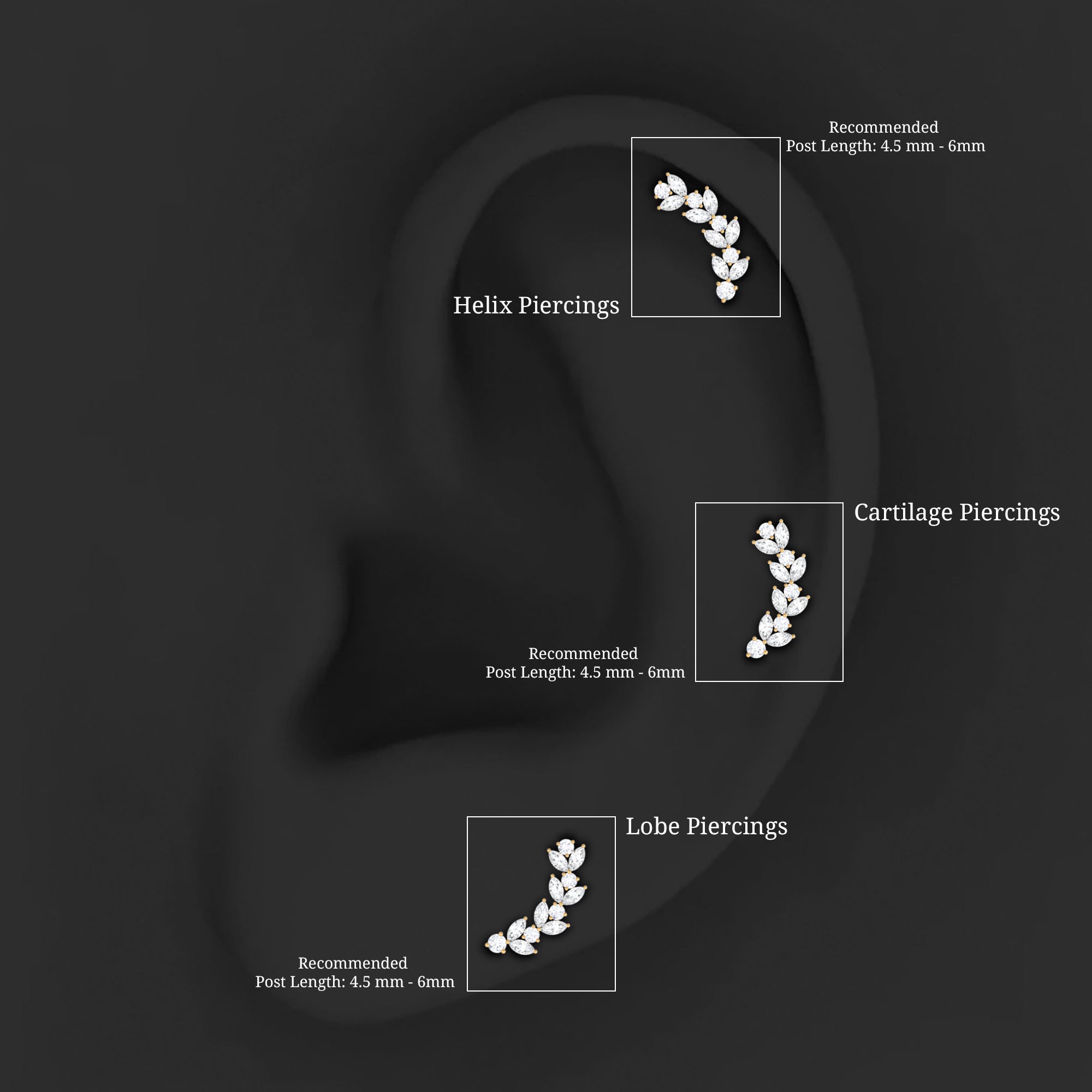 Climber Earrings: - they are precisely made to flaunt on the earlobe. These type of earrings has a curved shape, elegantly showing off the curve of the ear elegantly, and create a classic look. The earrings look like you get multiple piercings without the actual need. They're ideal for individuals seeking a classy and stylish appearance without enduring the discomfort of additional piercings.