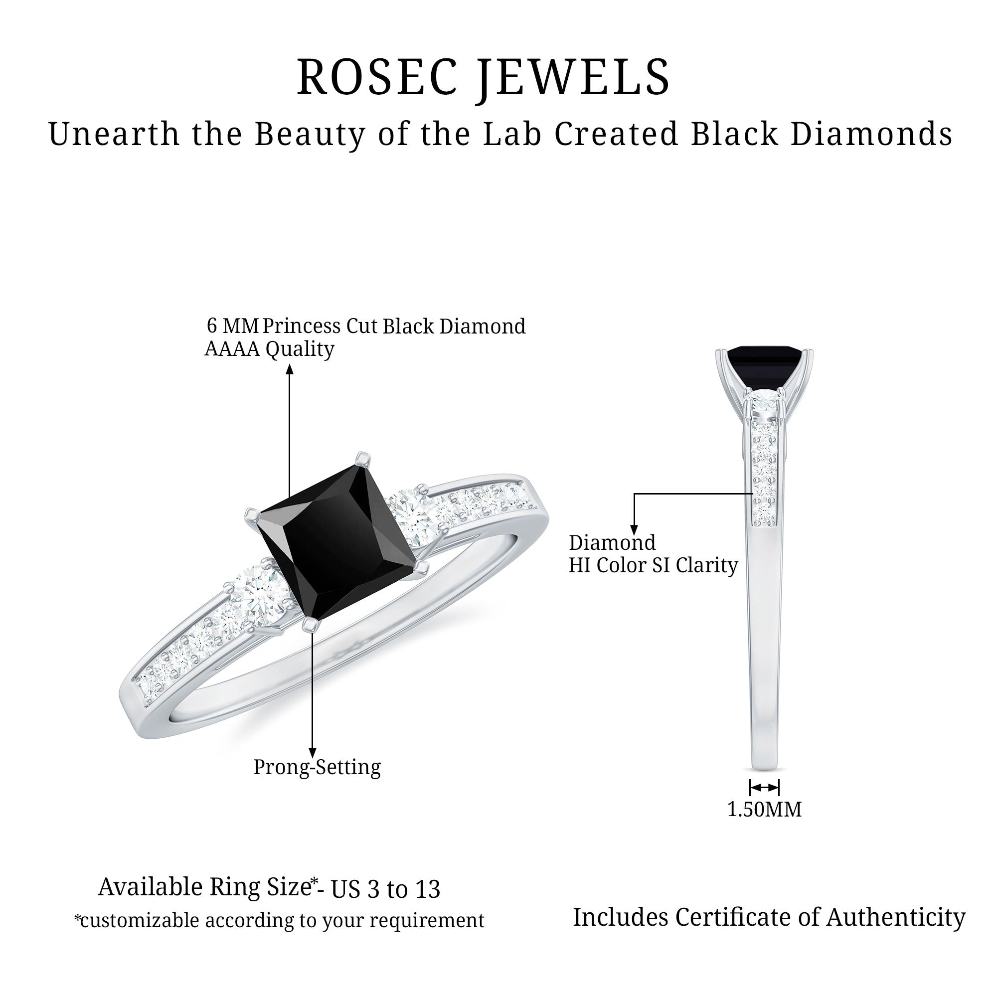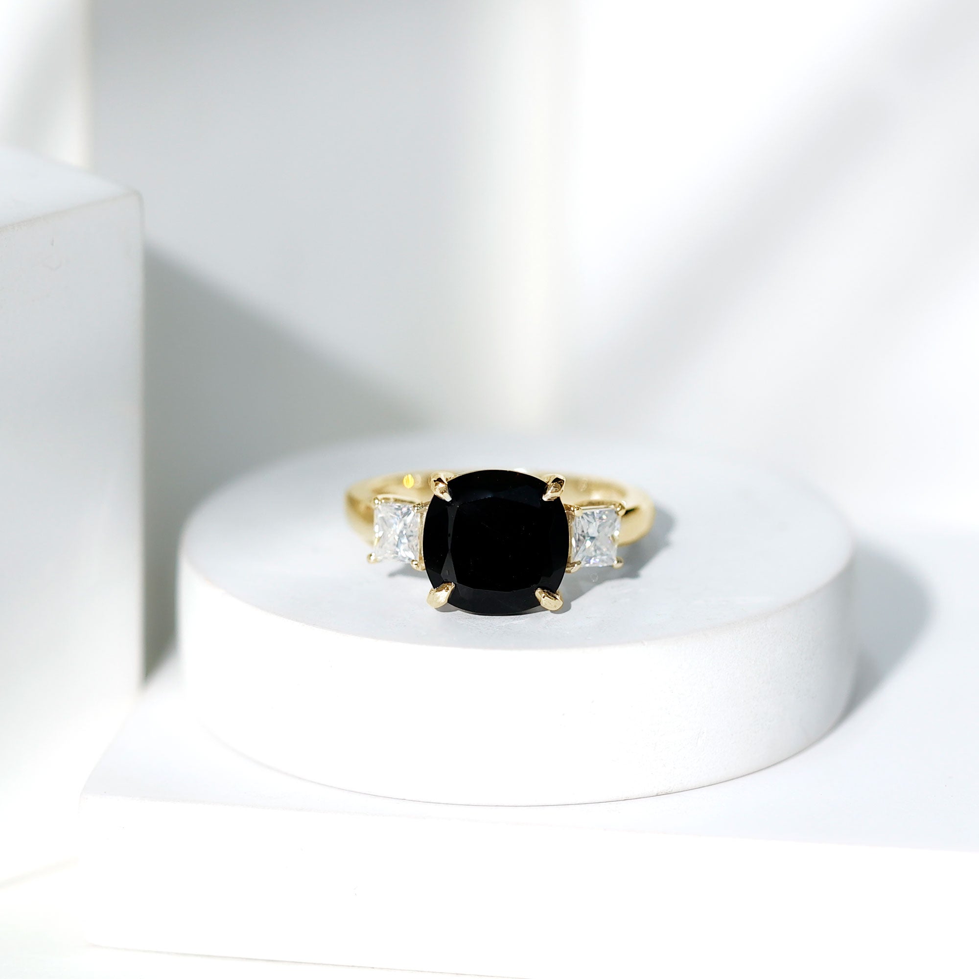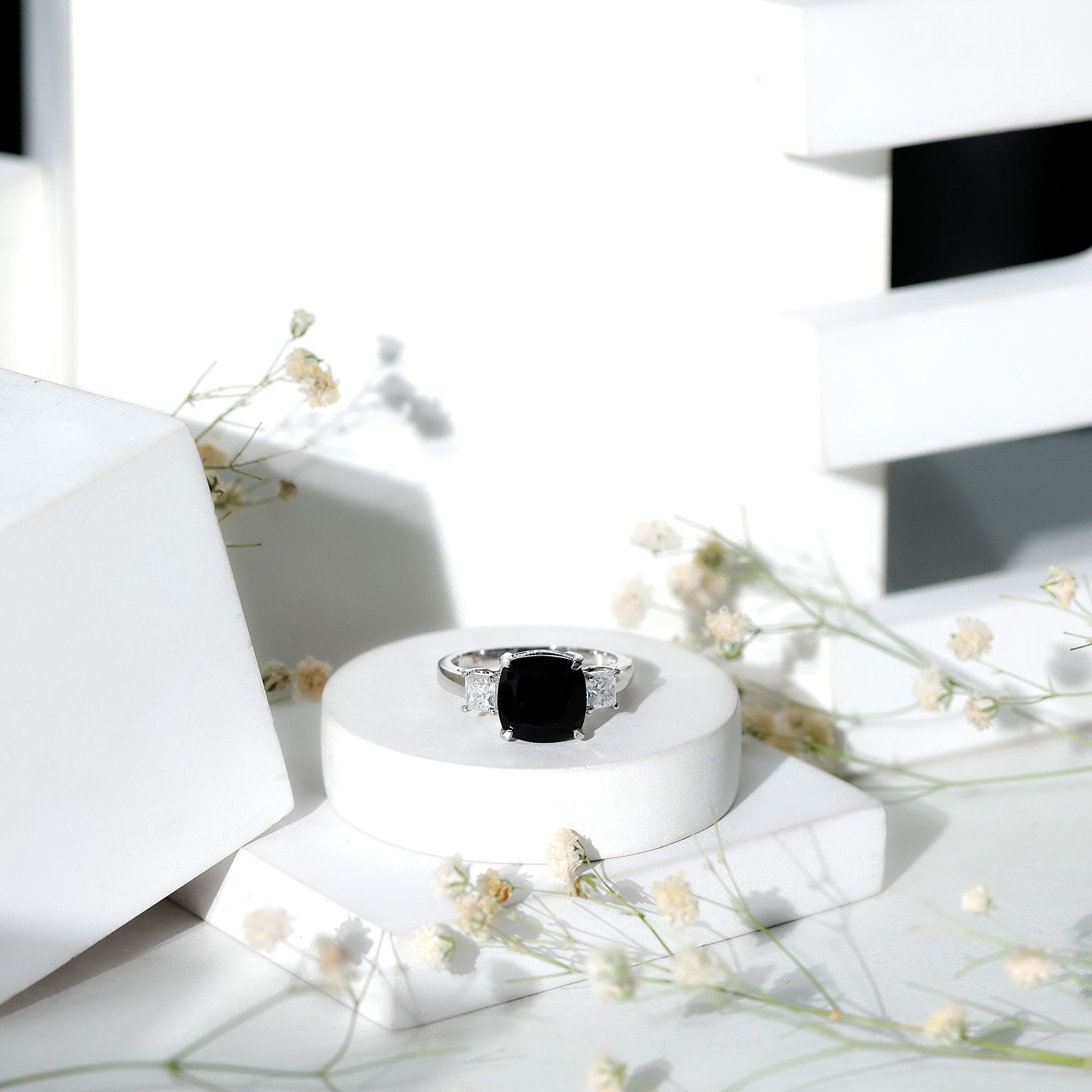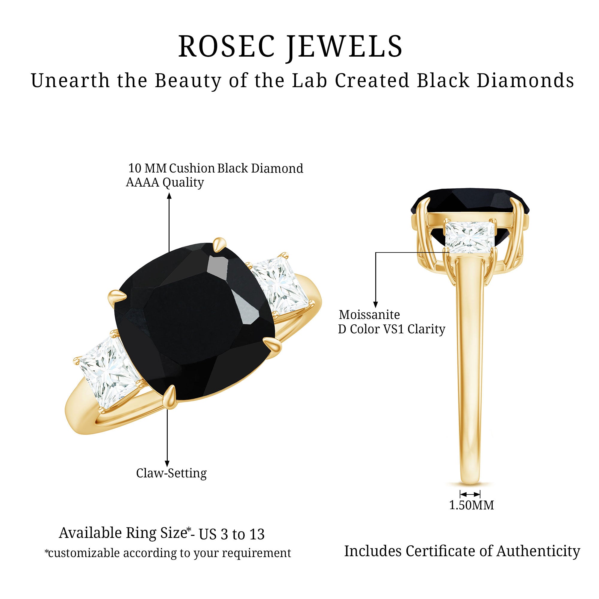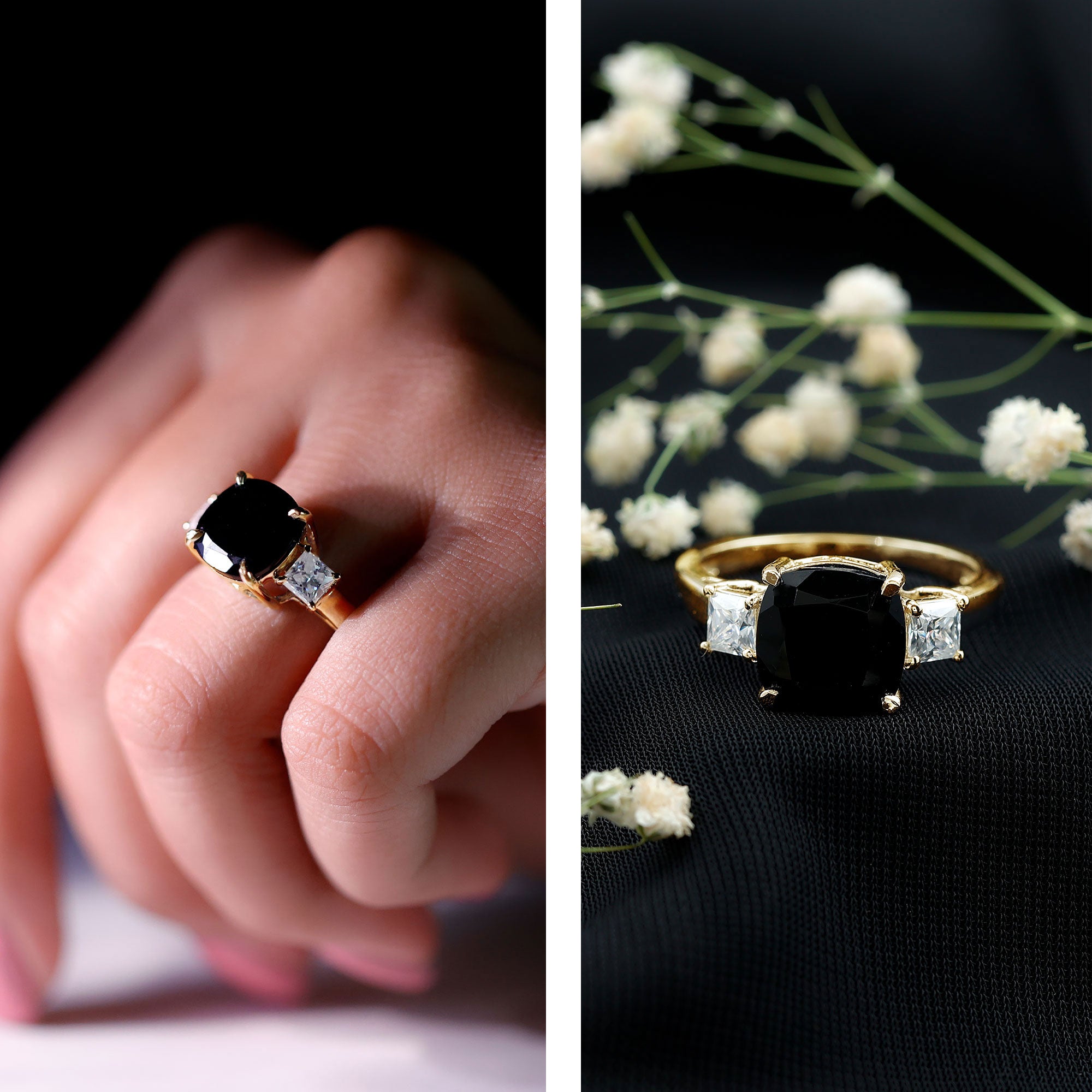 Three Stone lab Created Engagement Ring in Black Diamonds: These rings symbolizing past, present and future of couples relationship through three gemstones are beautiful as well as meaningful choices. These similar or different gemstones add a sentimental value, promising a shared future.