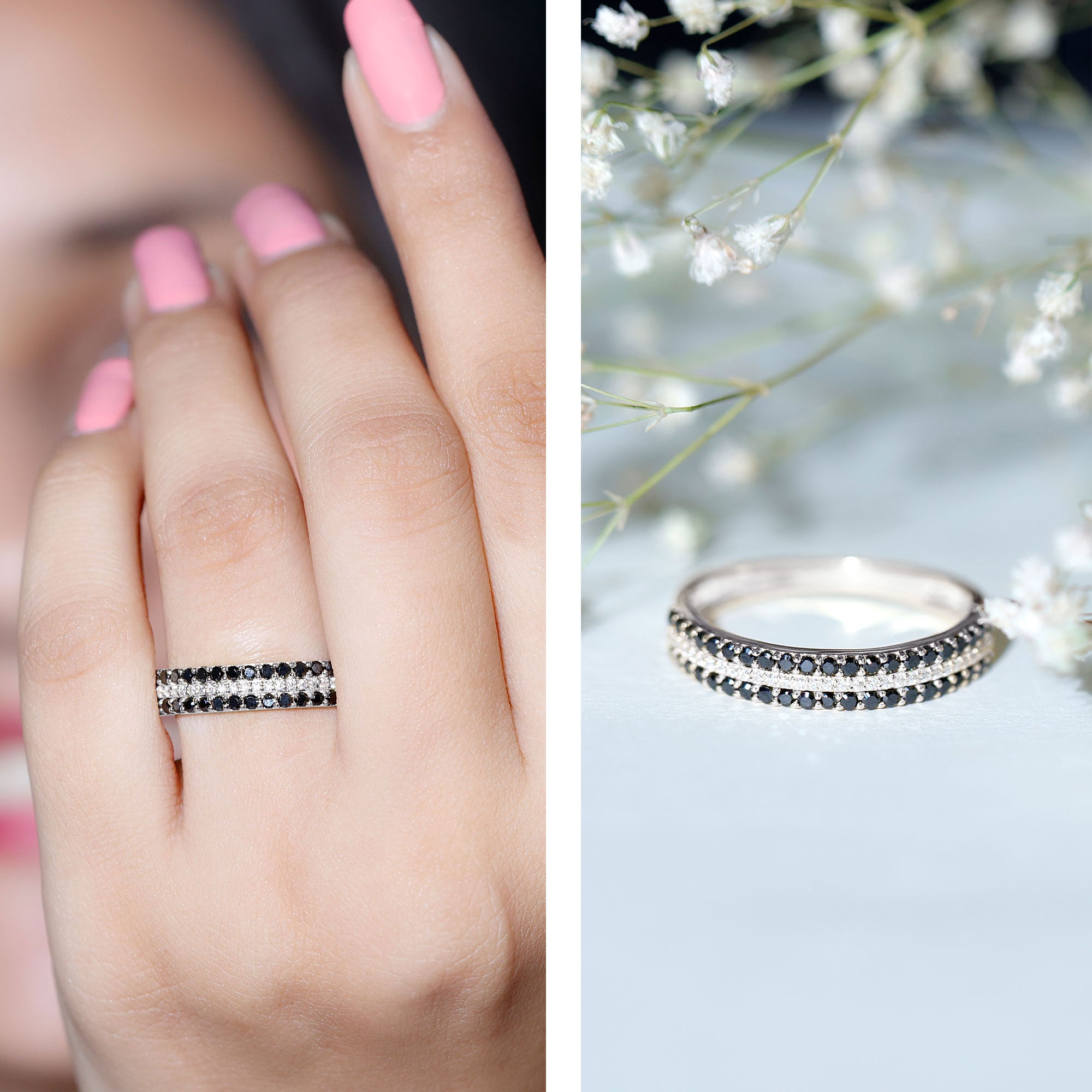 Celebrate your anniversary or special occasion with a lab black diamond eternity ring. This ring has a band of stunning black diamonds. It helps you stand out and enhances any other ring next to it. This includes wedding bands and engagement rings.