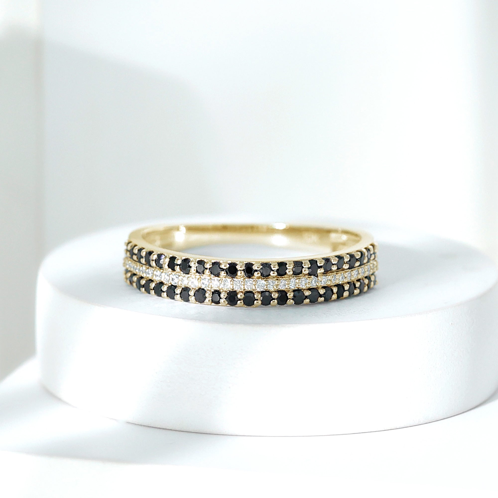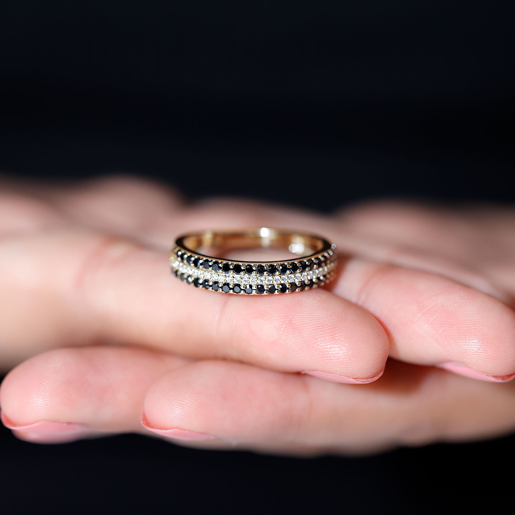 This ring style incorporates three sparkling lab-grown black diamonds that are embellished together. The triple gems of lab black diamond here shed upon the unique journey of a couple’s togetherness. Each of the three stones signifies the past, present, and future, respectively.