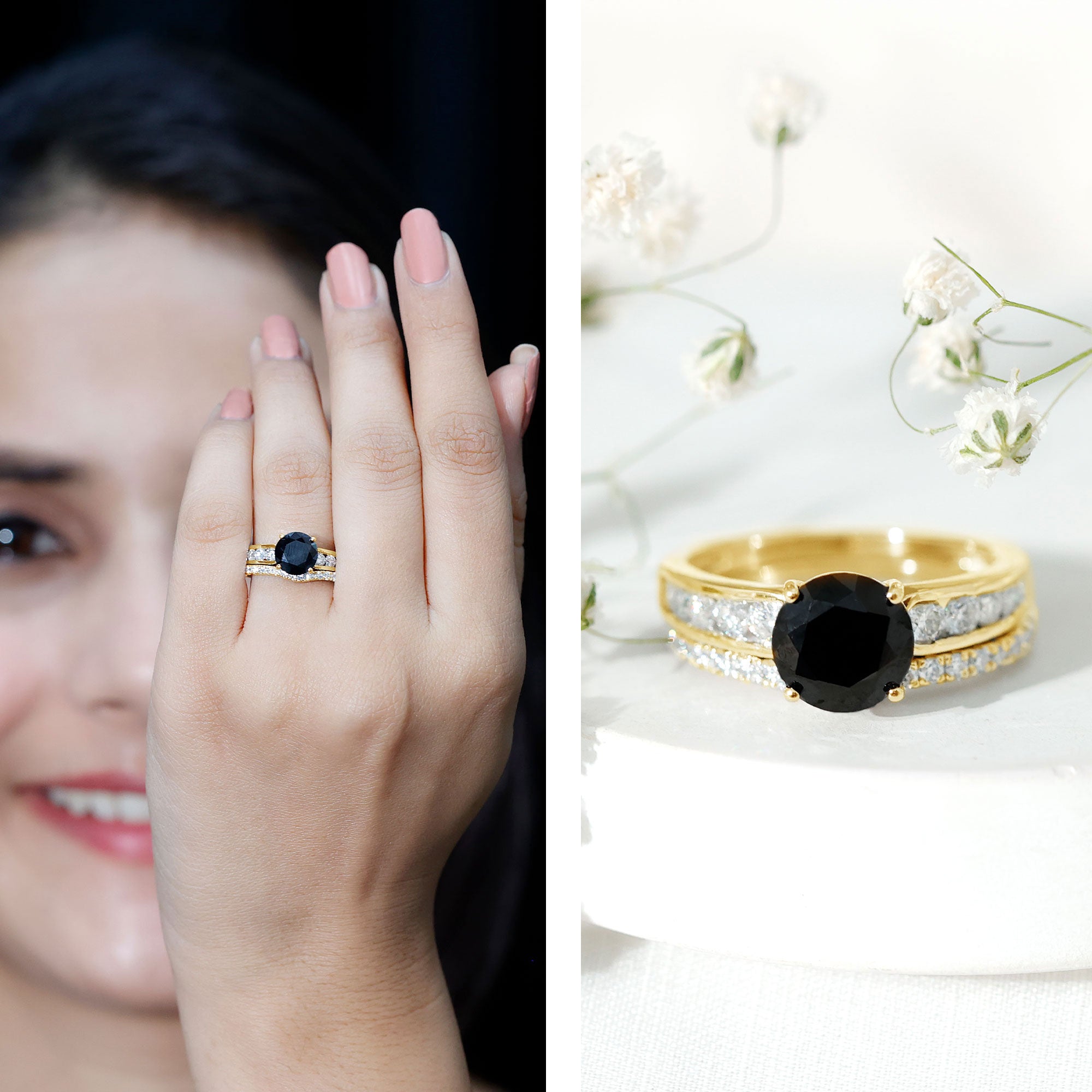• Type Of Metals: We have all three options of premium metals yellow gold, white gold, and rose gold. We also Have affordable and durable 92.5 silver metal options with lab black color gemstones.