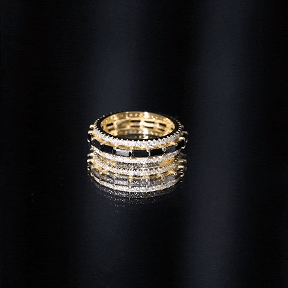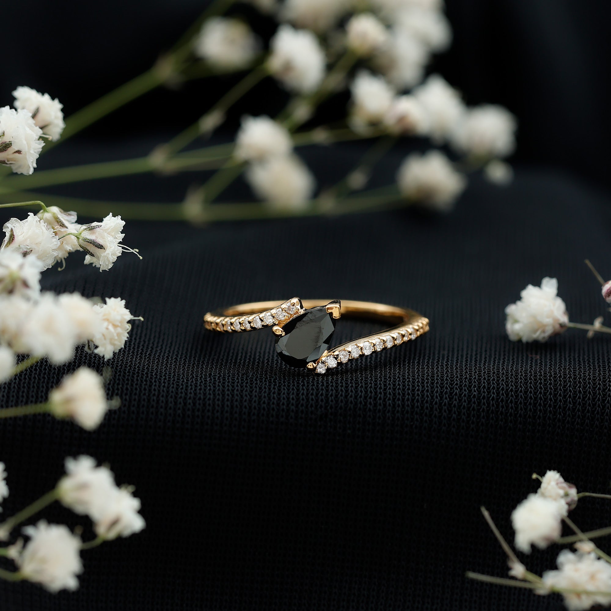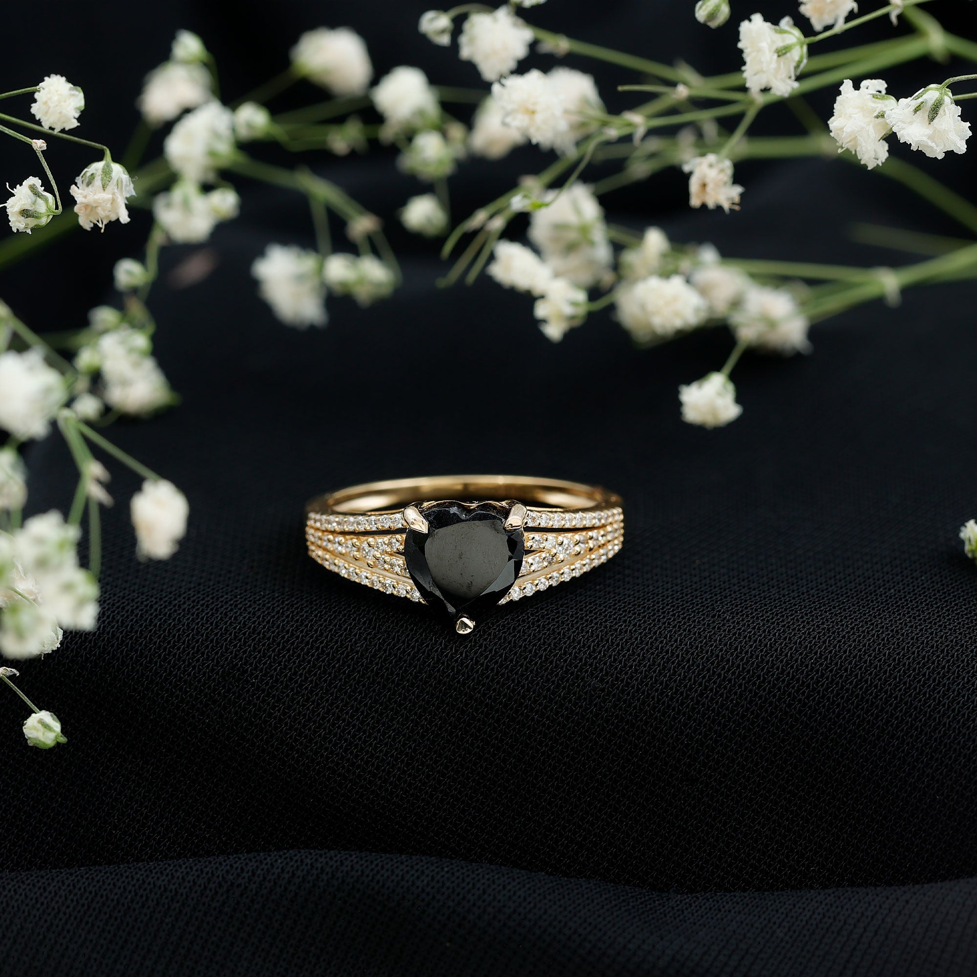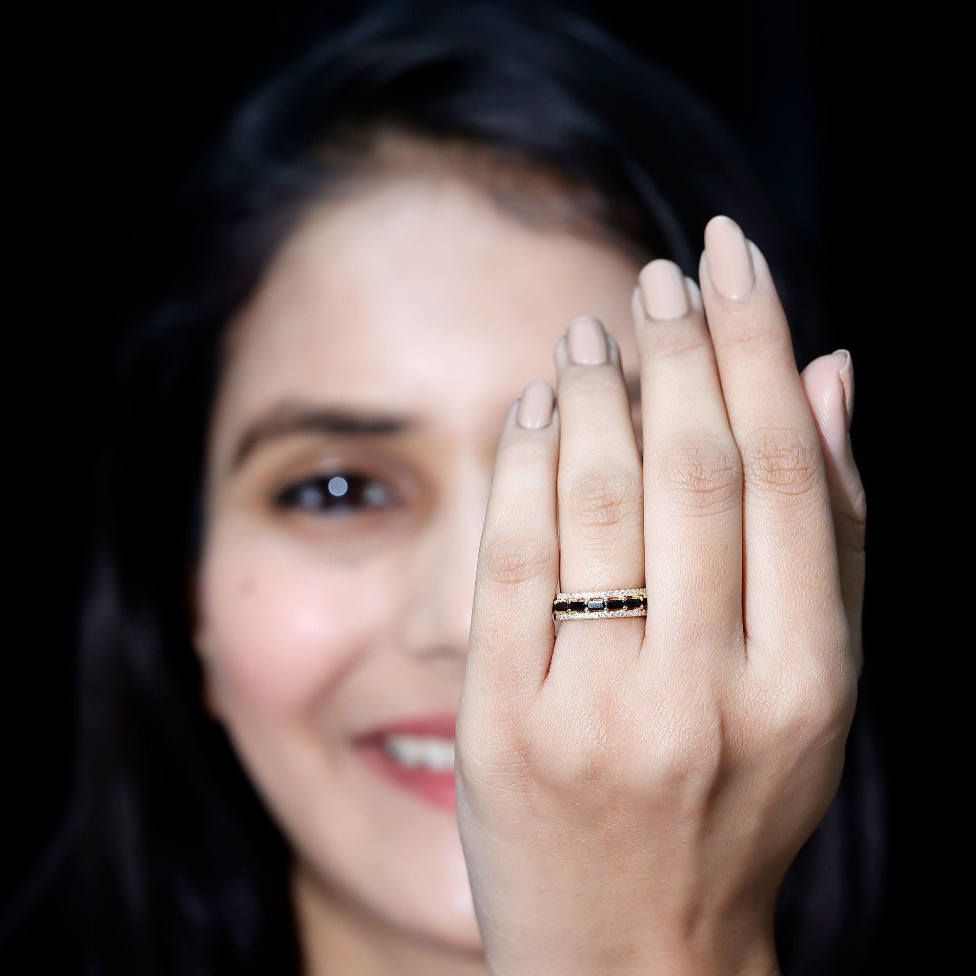 This ring style incorporates three sparkling lab-grown black diamonds that are embellished together. The triple gems of lab black diamond here shed upon the unique journey of a couple’s togetherness. Each of the three stones signifies the past, present, and future, respectively.