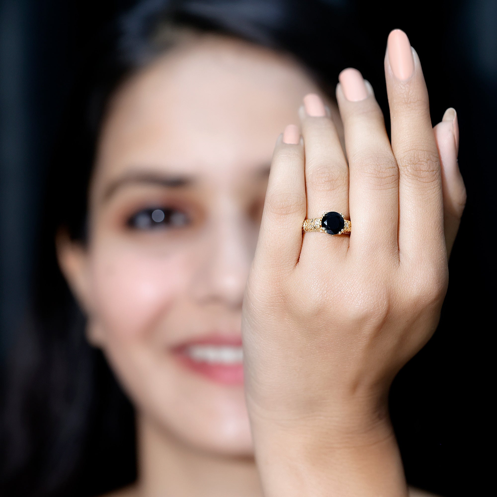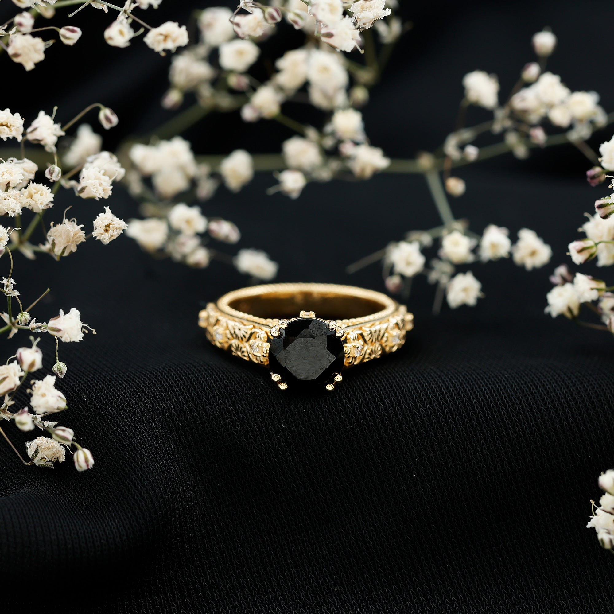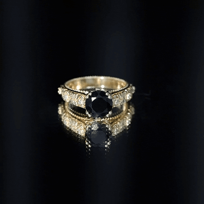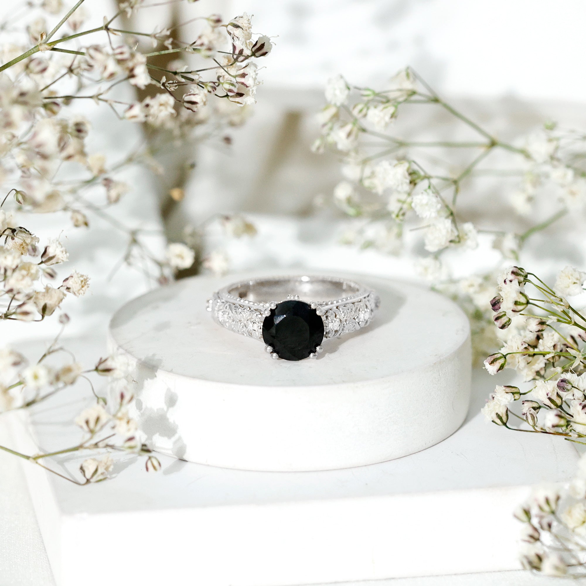 This style of ring is meant to speak old school couples, vintage style rings feature ornate designs that are symbolic of the Art Deco, Edwardian, and Victorian Eras. You’ll most likely come across antique designs that incorporate milgrain and filigree details, geometric patterns, or floral motifs that complement the exotic hue of lab black diamonds.