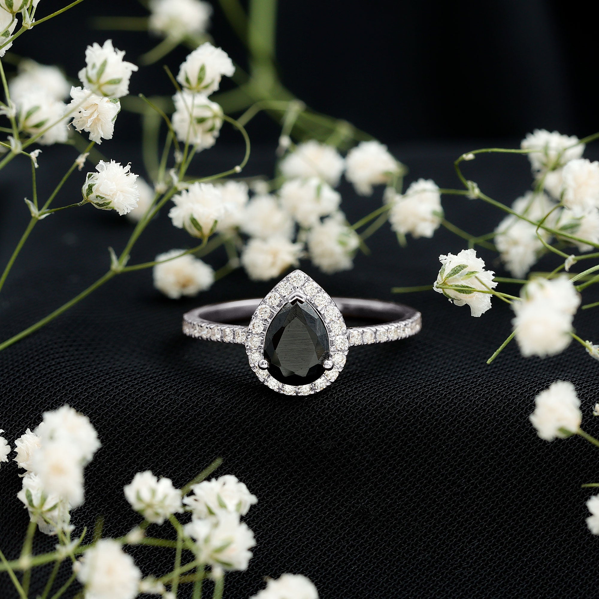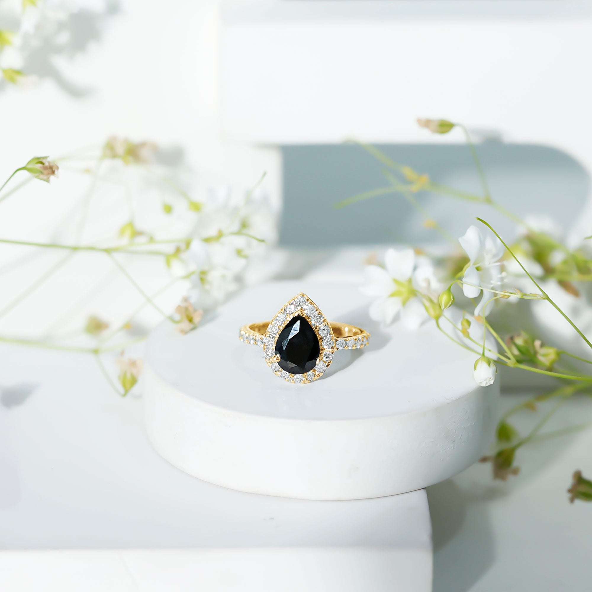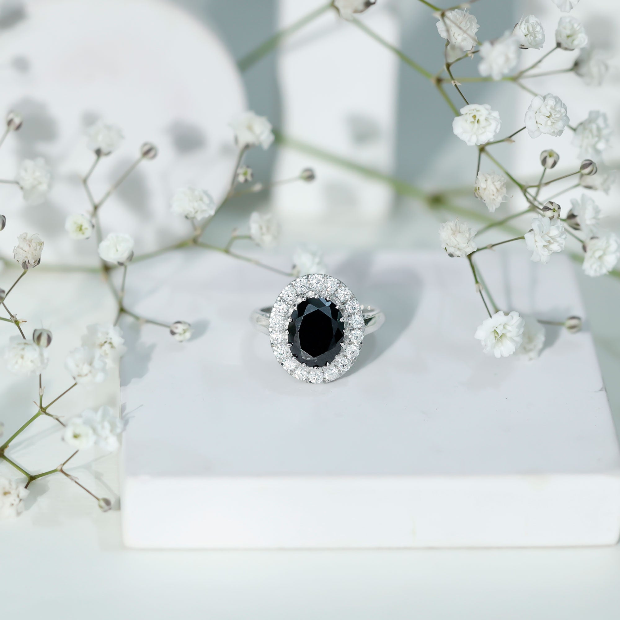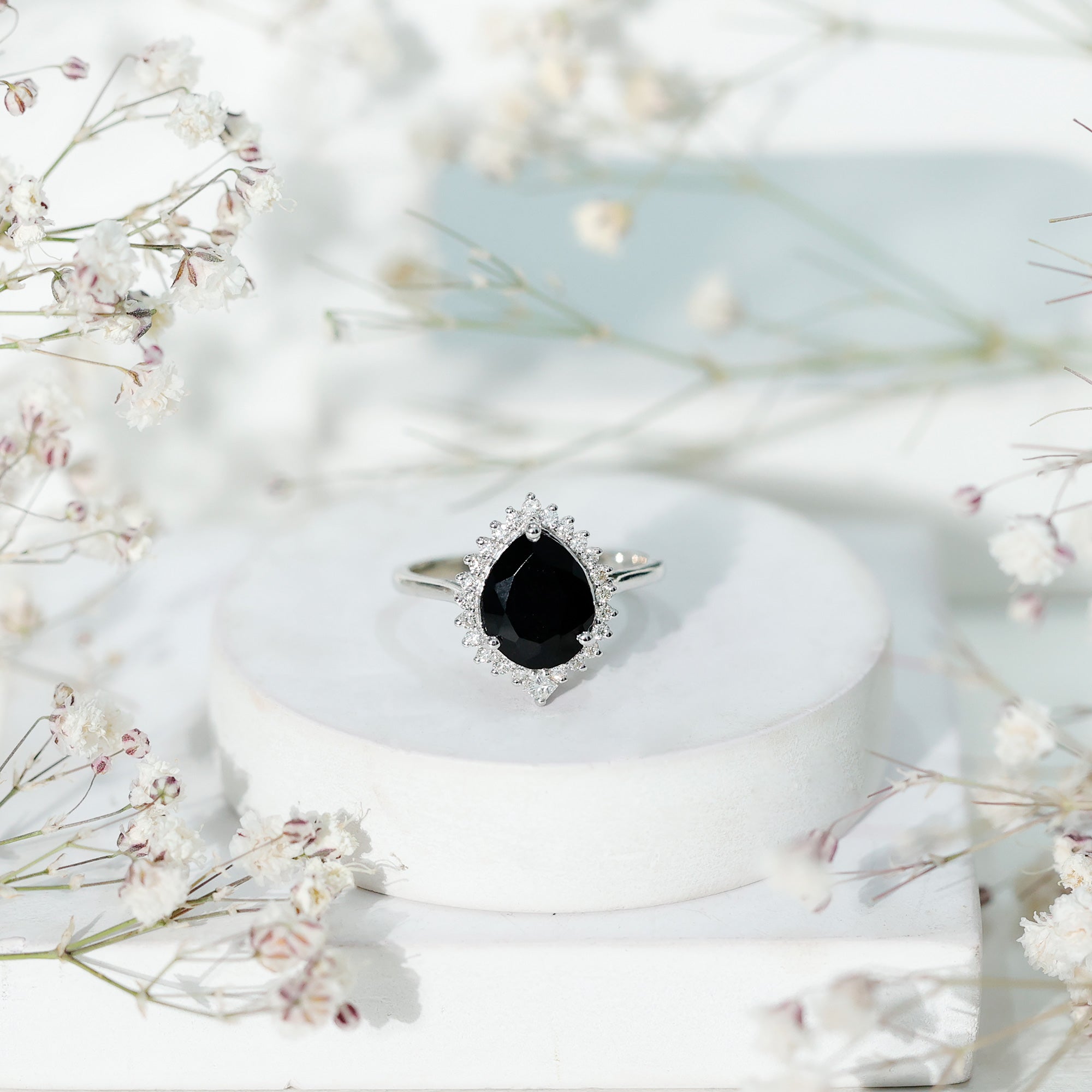 This ring style showcases a shimmering black diamond with dainty round diamonds or moissanites all around the centerpiece. It helps lend more character to the ring, adding an extra layer of sparkle (known as a halo).
