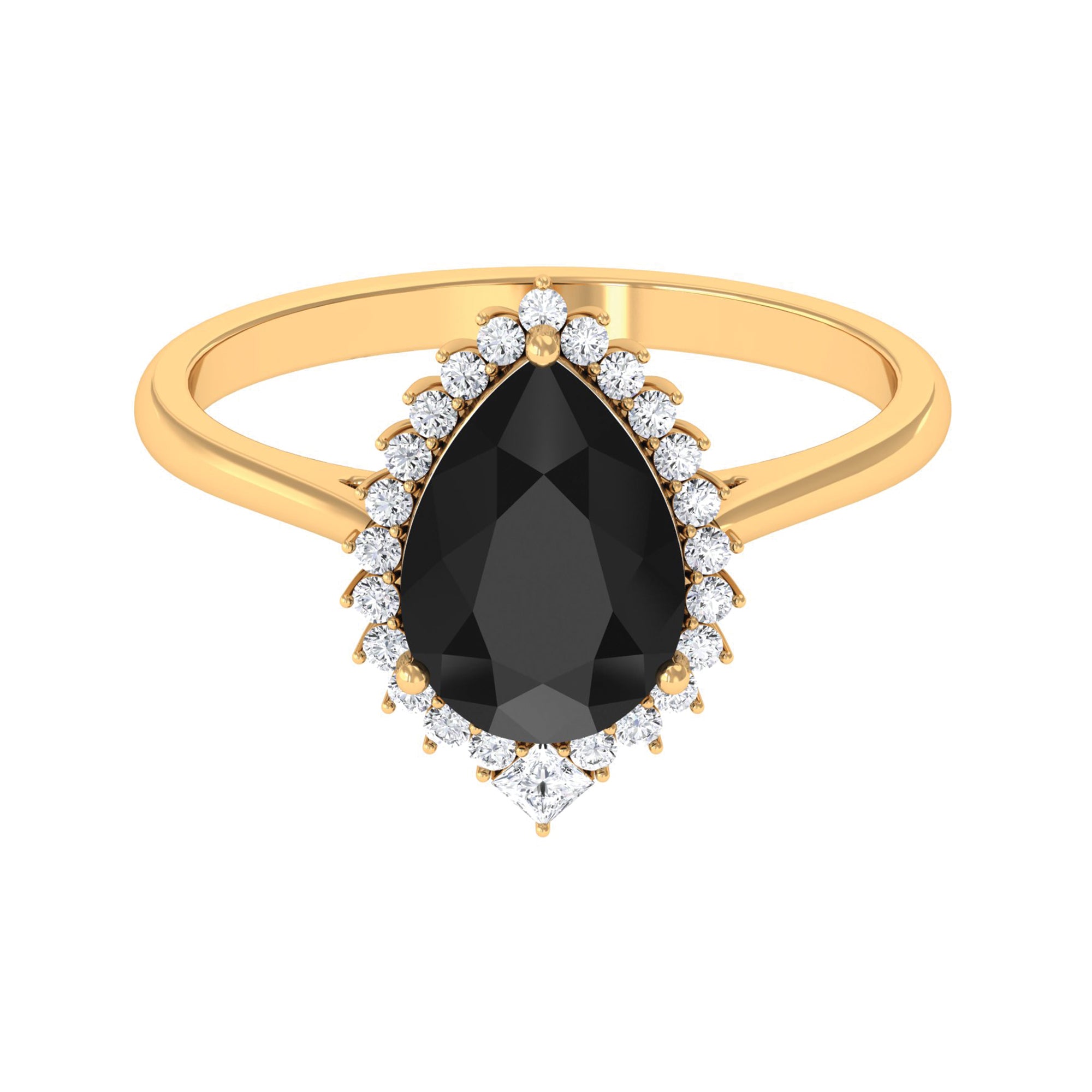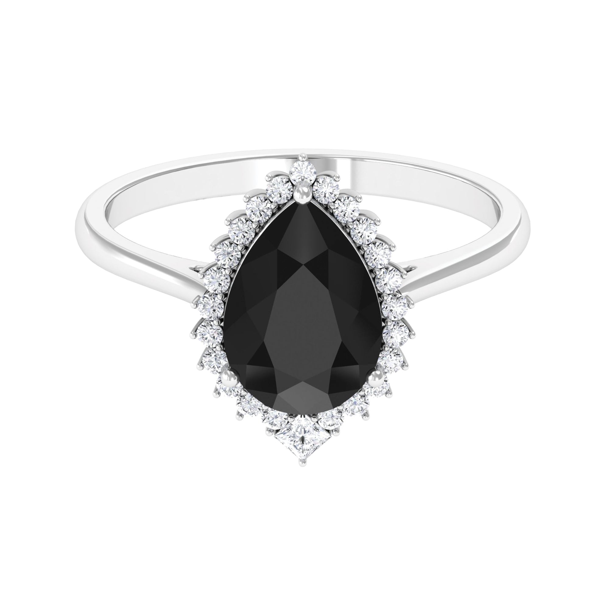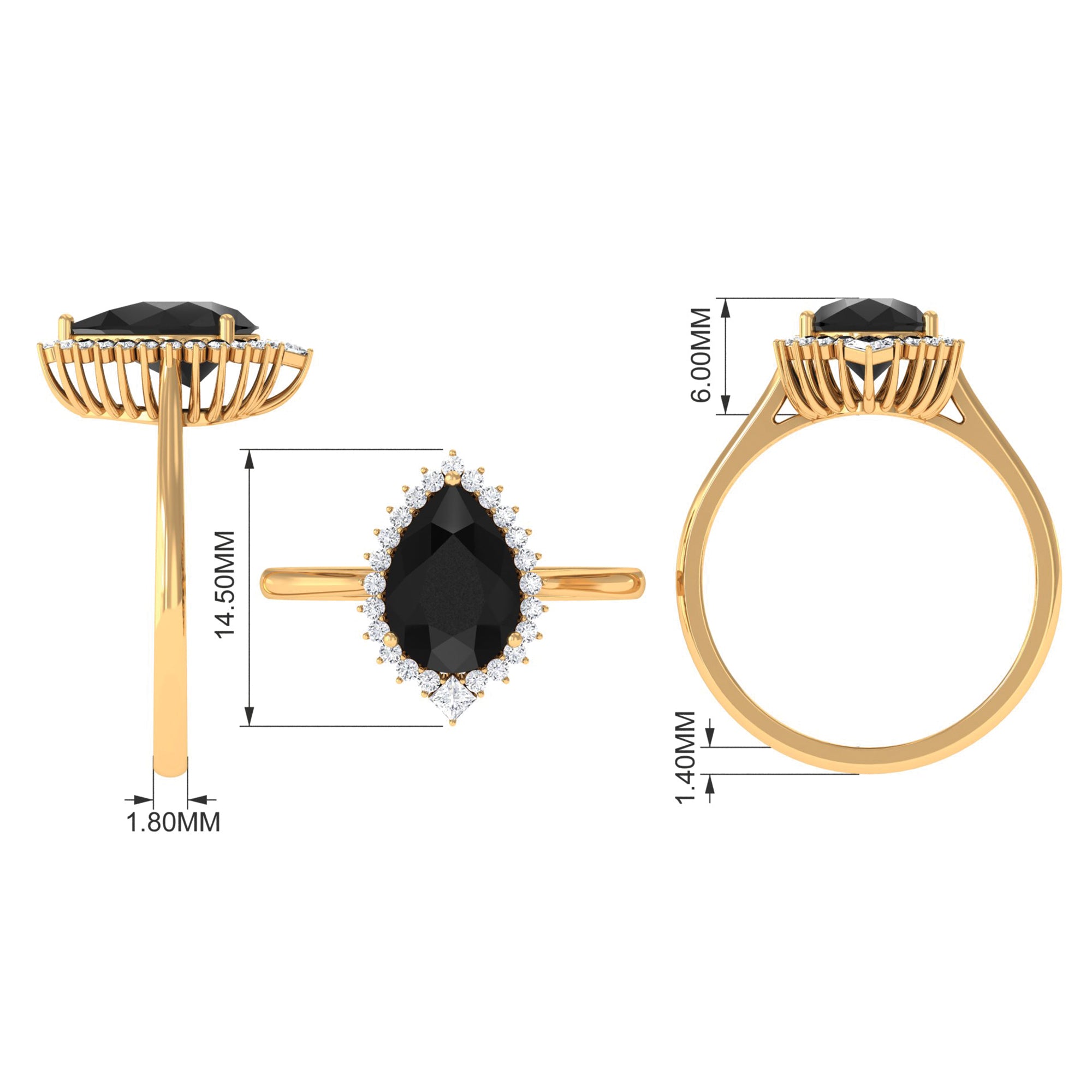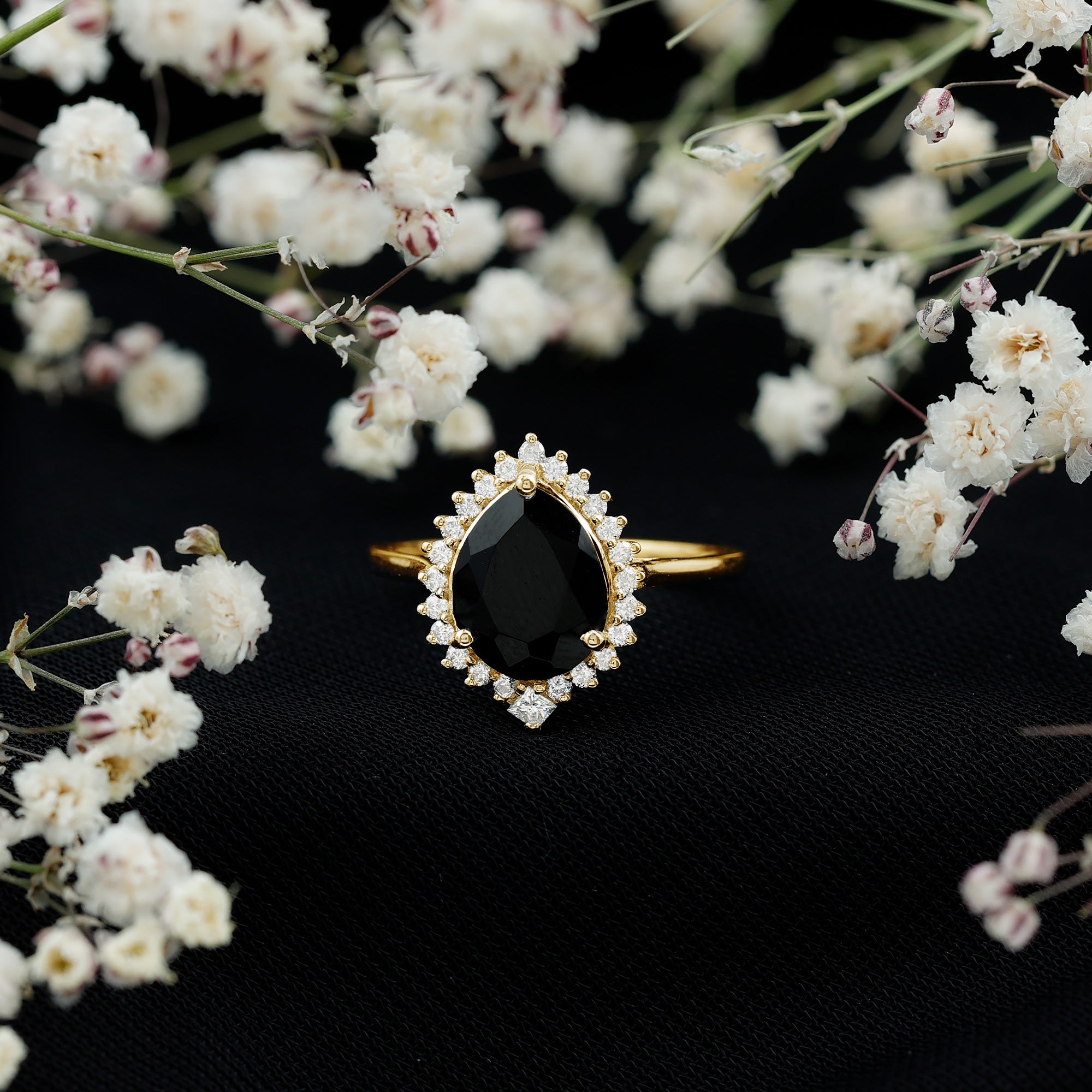 This ring style showcases a shimmering black diamond with dainty round diamonds or moissanites all around the centerpiece. It helps lend more character to the ring, adding an extra layer of sparkle (known as a halo).