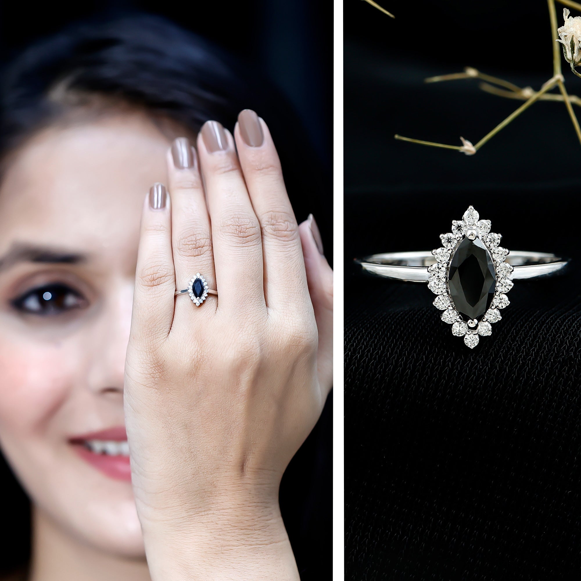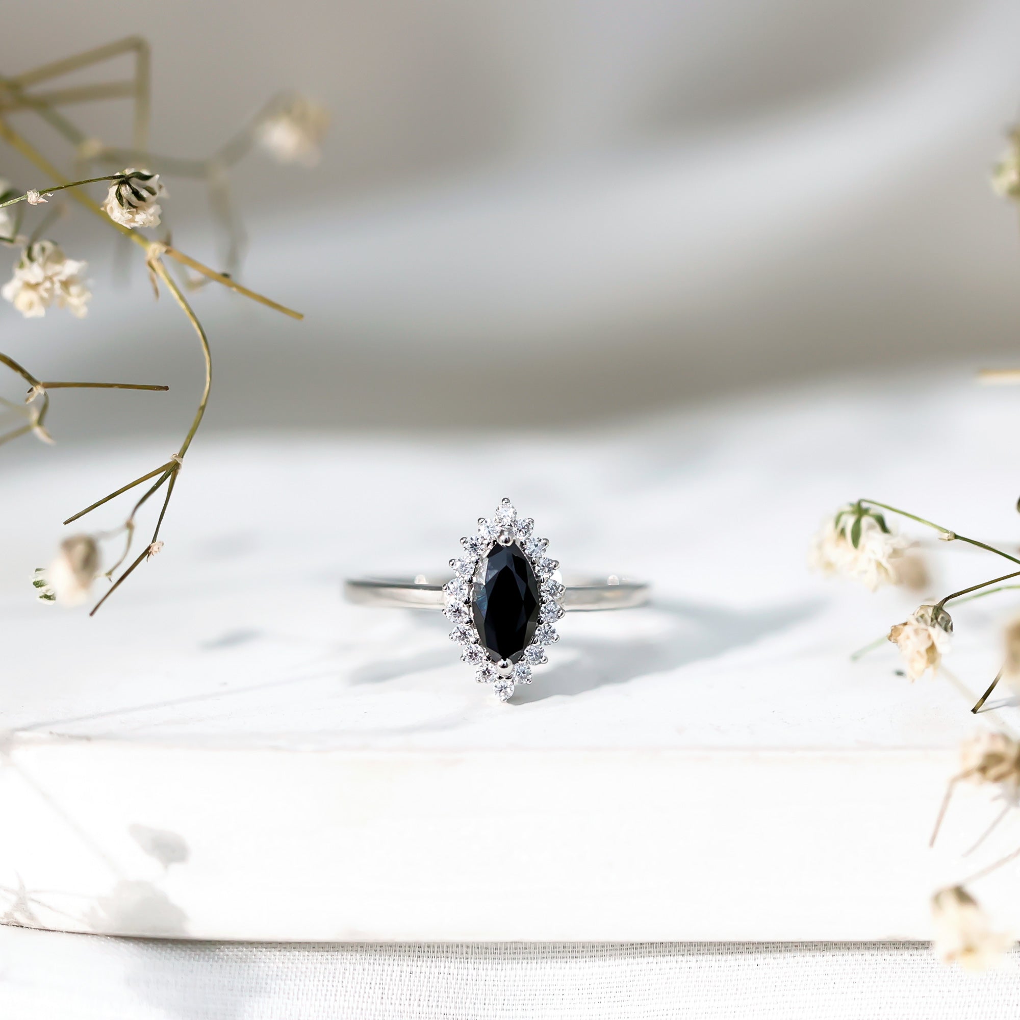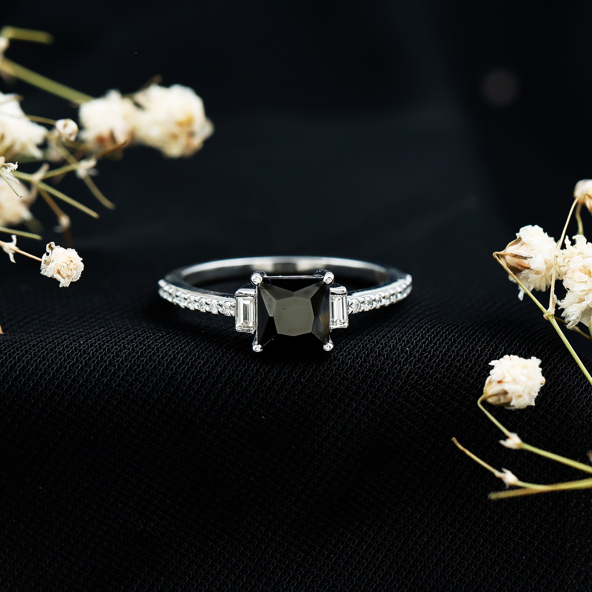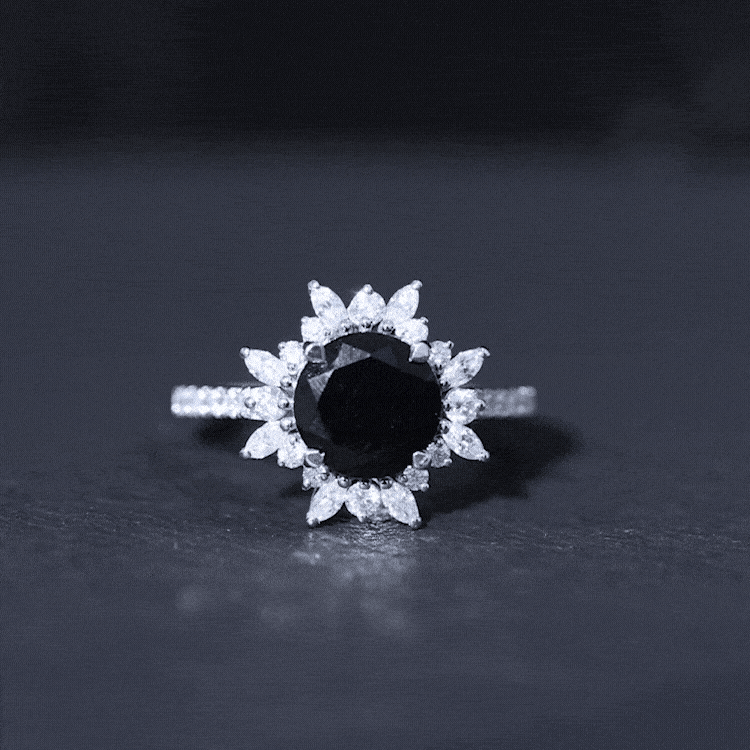 This ring style showcases a shimmering black diamond with dainty round diamonds or moissanites all around the centerpiece. It helps lend more character to the ring, adding an extra layer of sparkle (known as a halo).