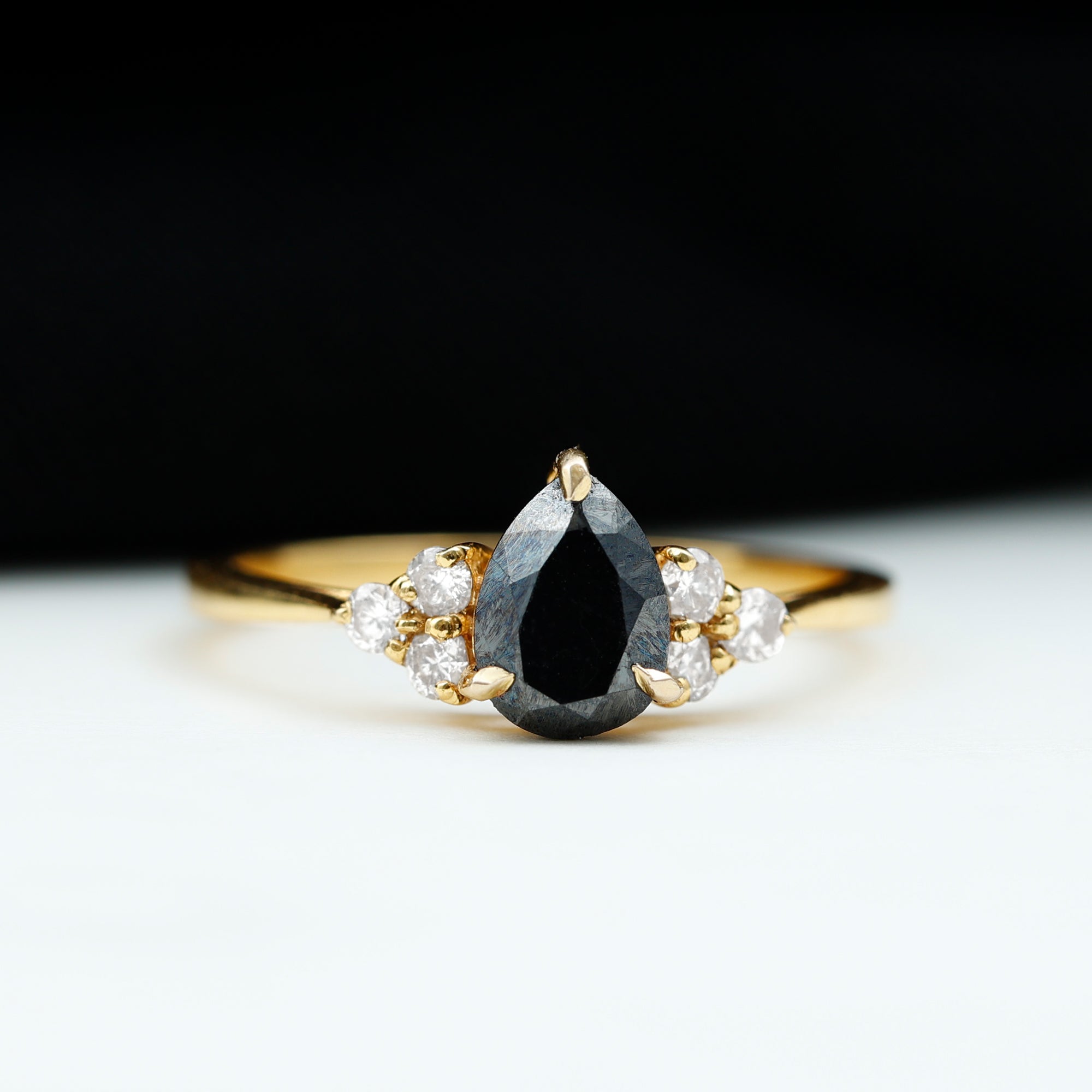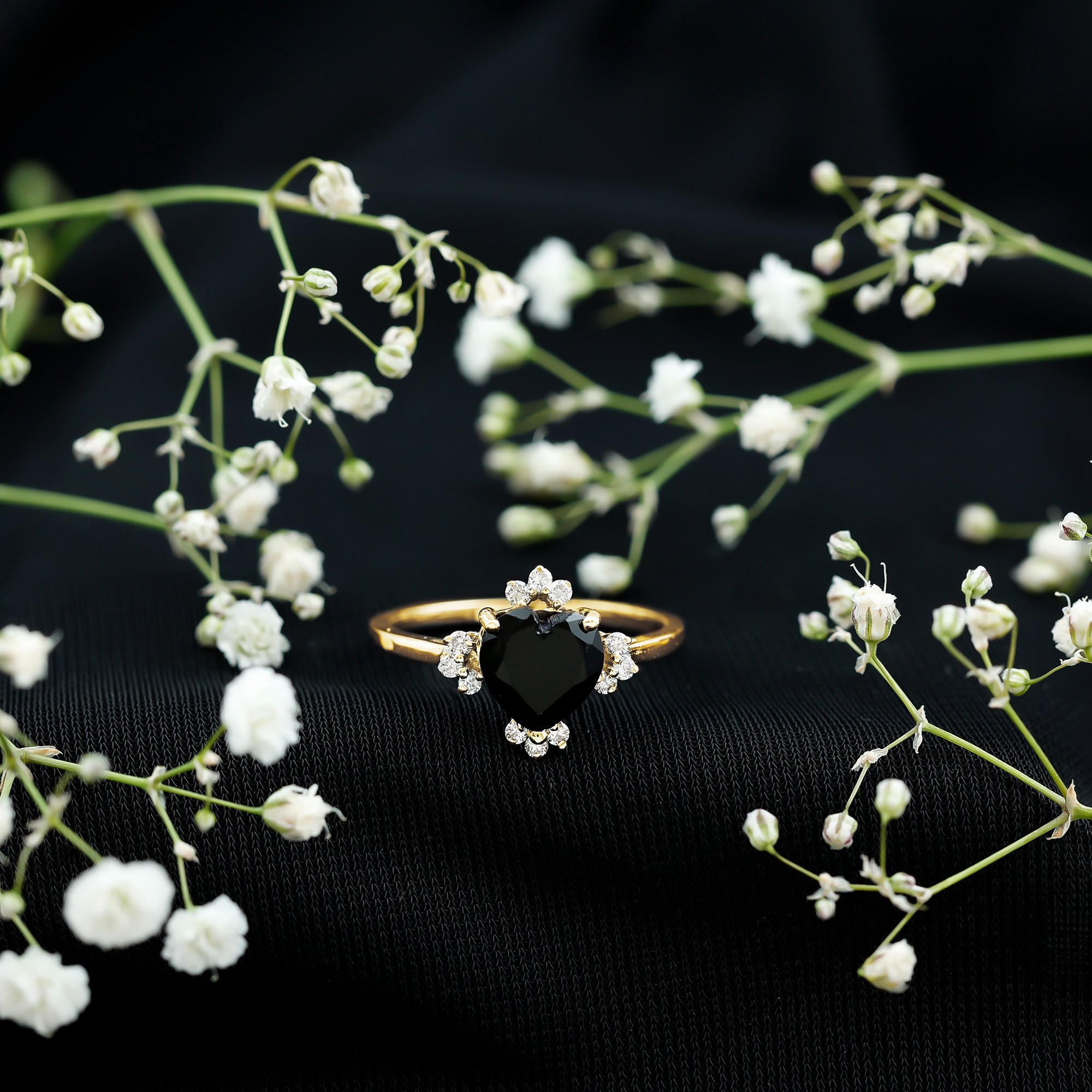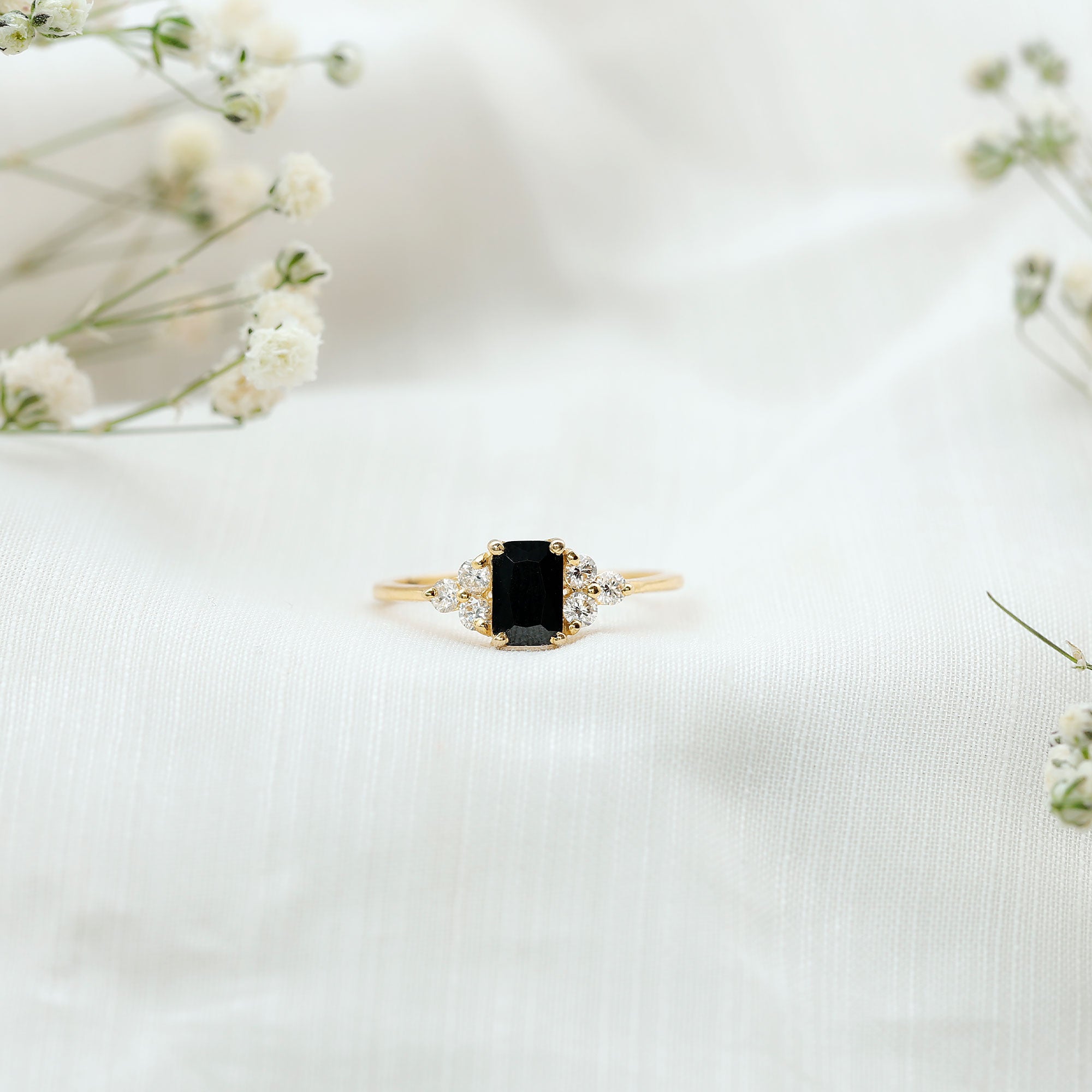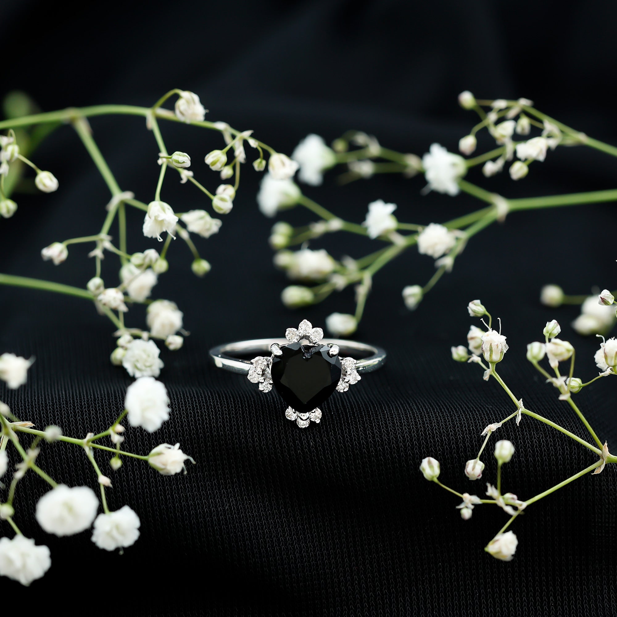 This ring style showcases a shimmering black diamond with dainty round diamonds or moissanites all around the centerpiece. It helps lend more character to the ring, adding an extra layer of sparkle (known as a halo).