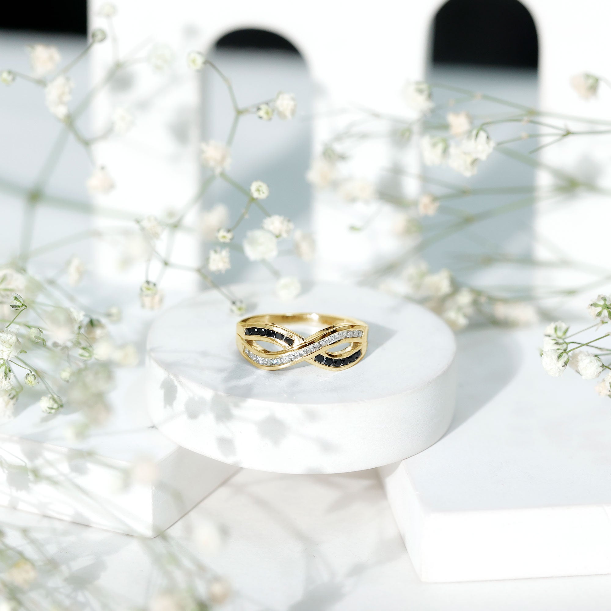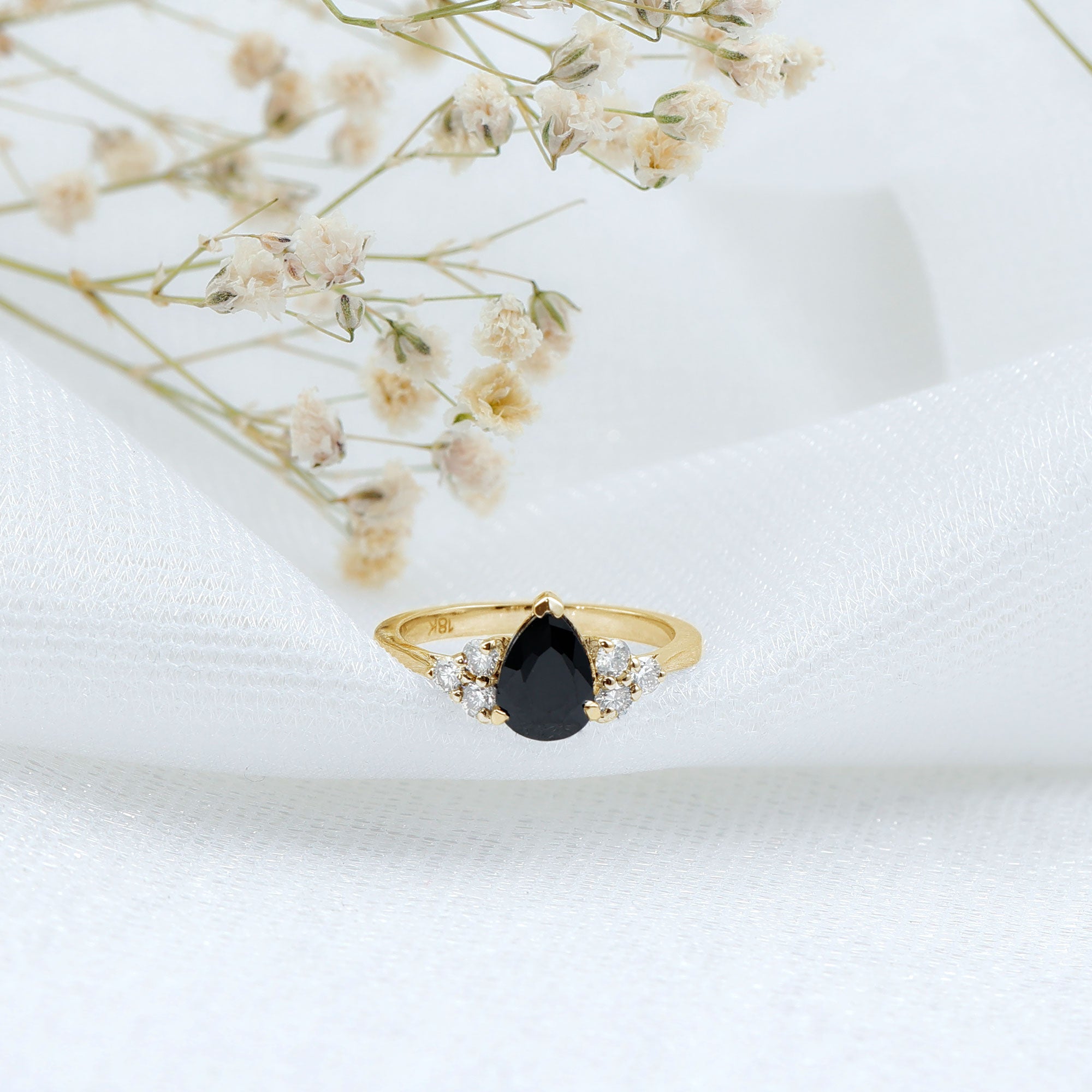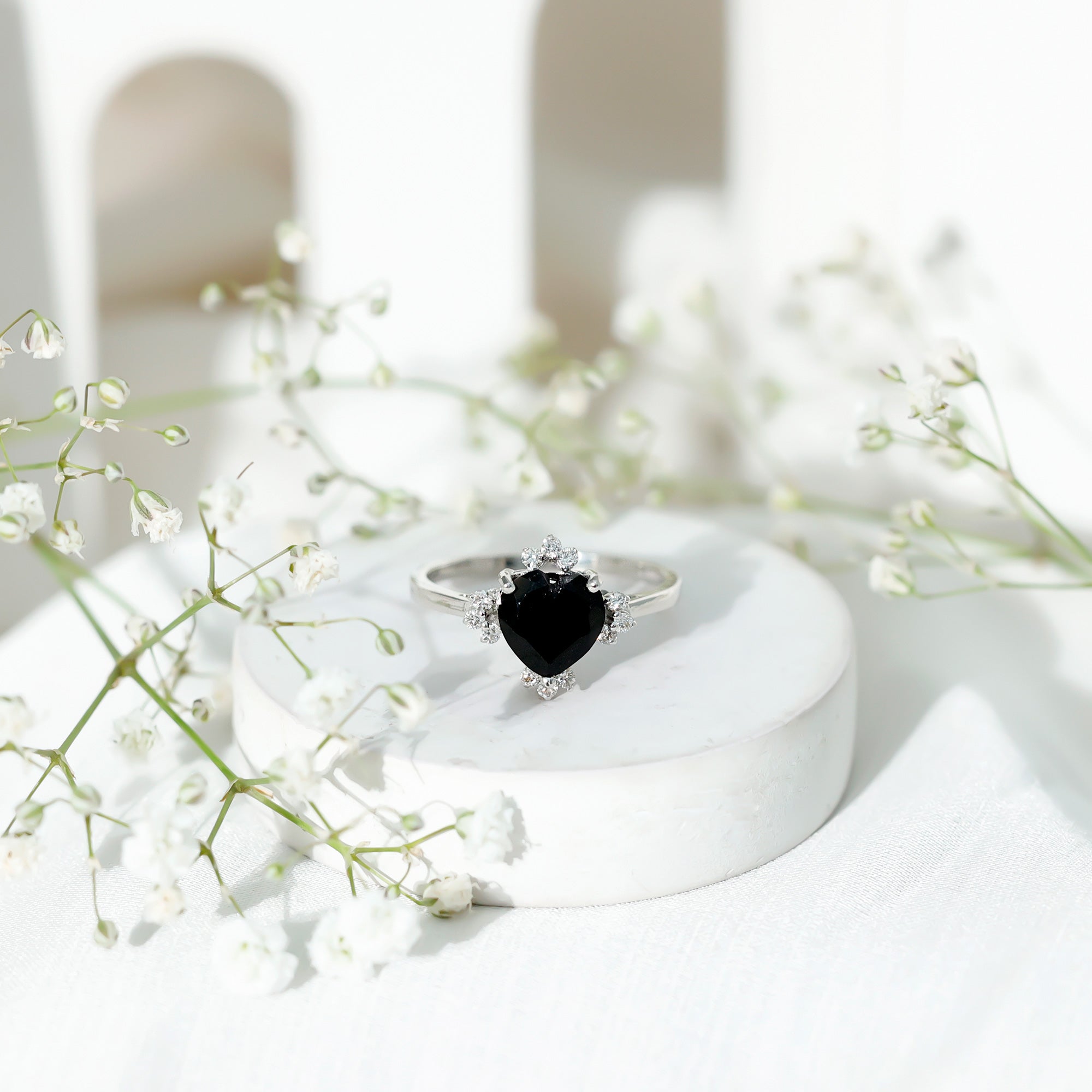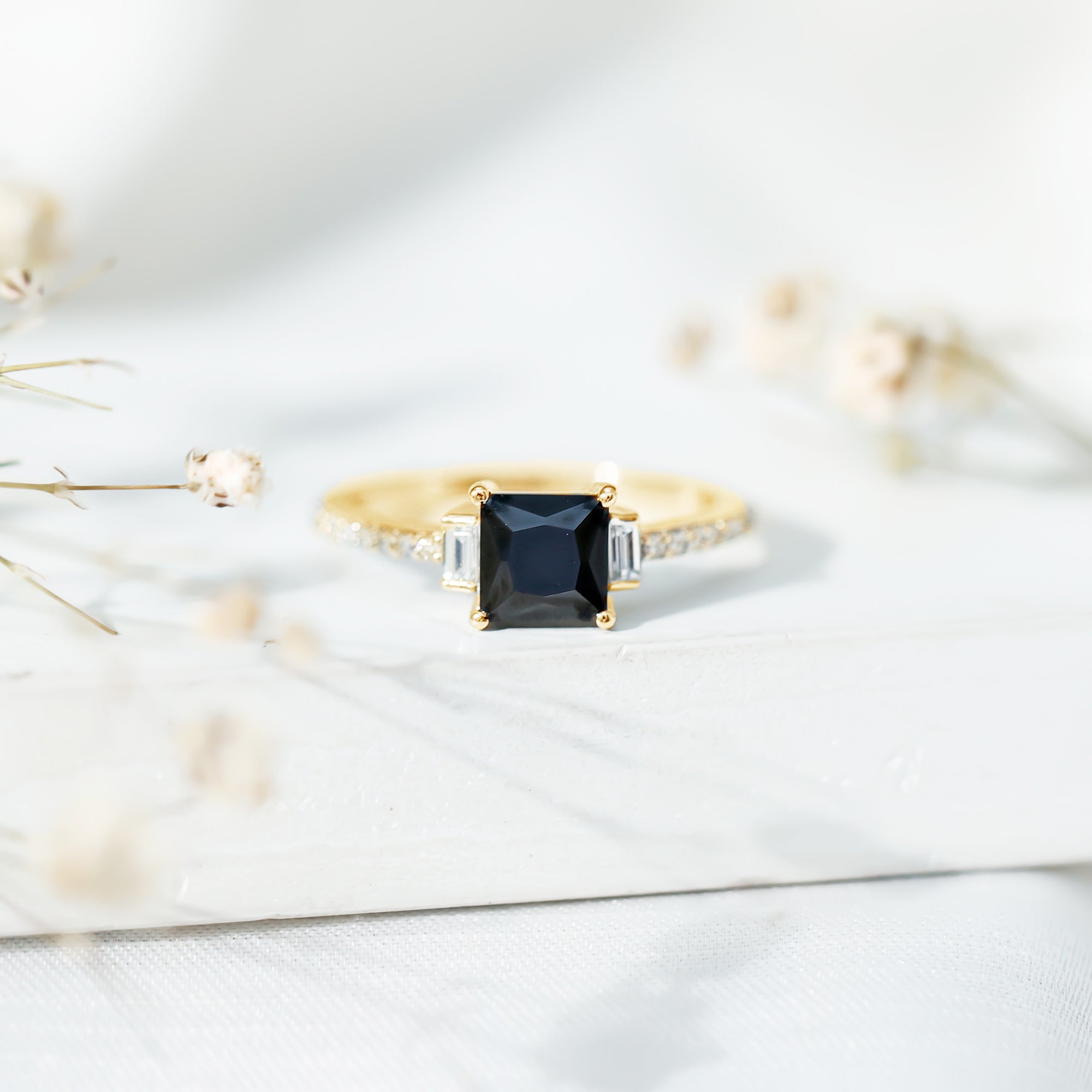 This ring style showcases a shimmering black diamond with dainty round diamonds or moissanites all around the centerpiece. It helps lend more character to the ring, adding an extra layer of sparkle (known as a halo).