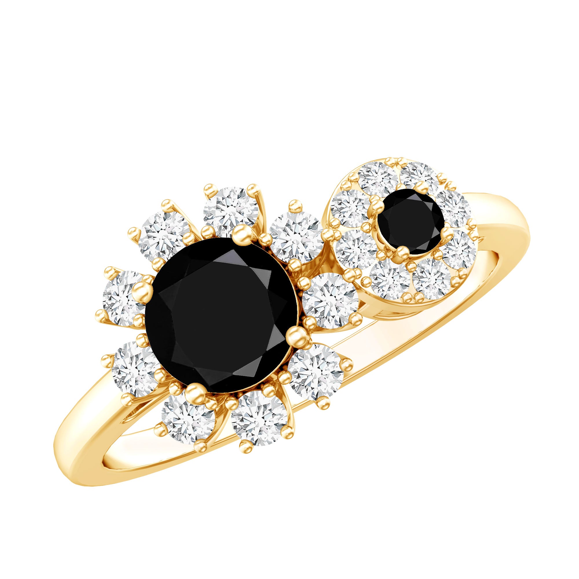 This ring style showcases a shimmering black diamond with dainty round diamonds or moissanites all around the centerpiece. It helps lend more character to the ring, adding an extra layer of sparkle (known as a halo).