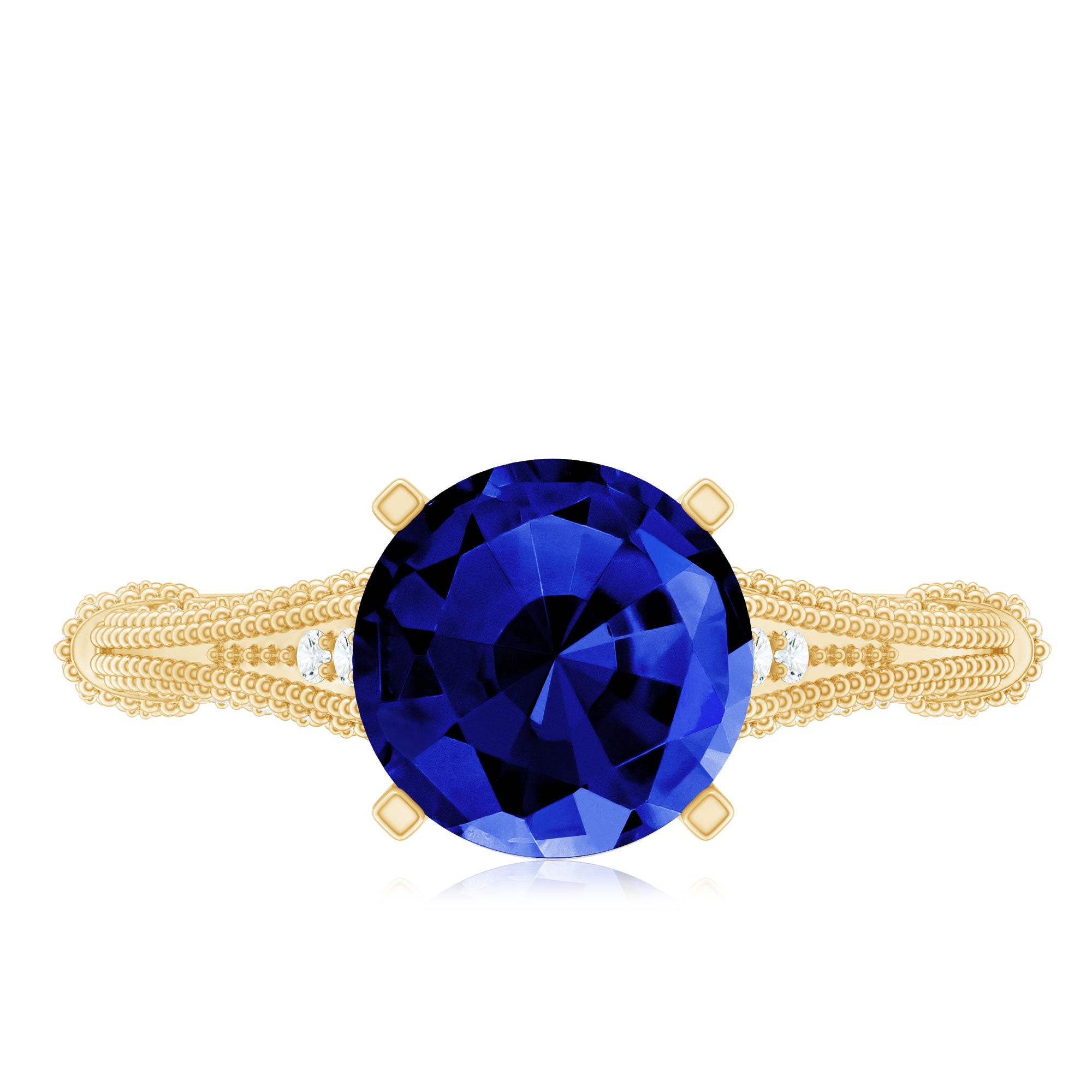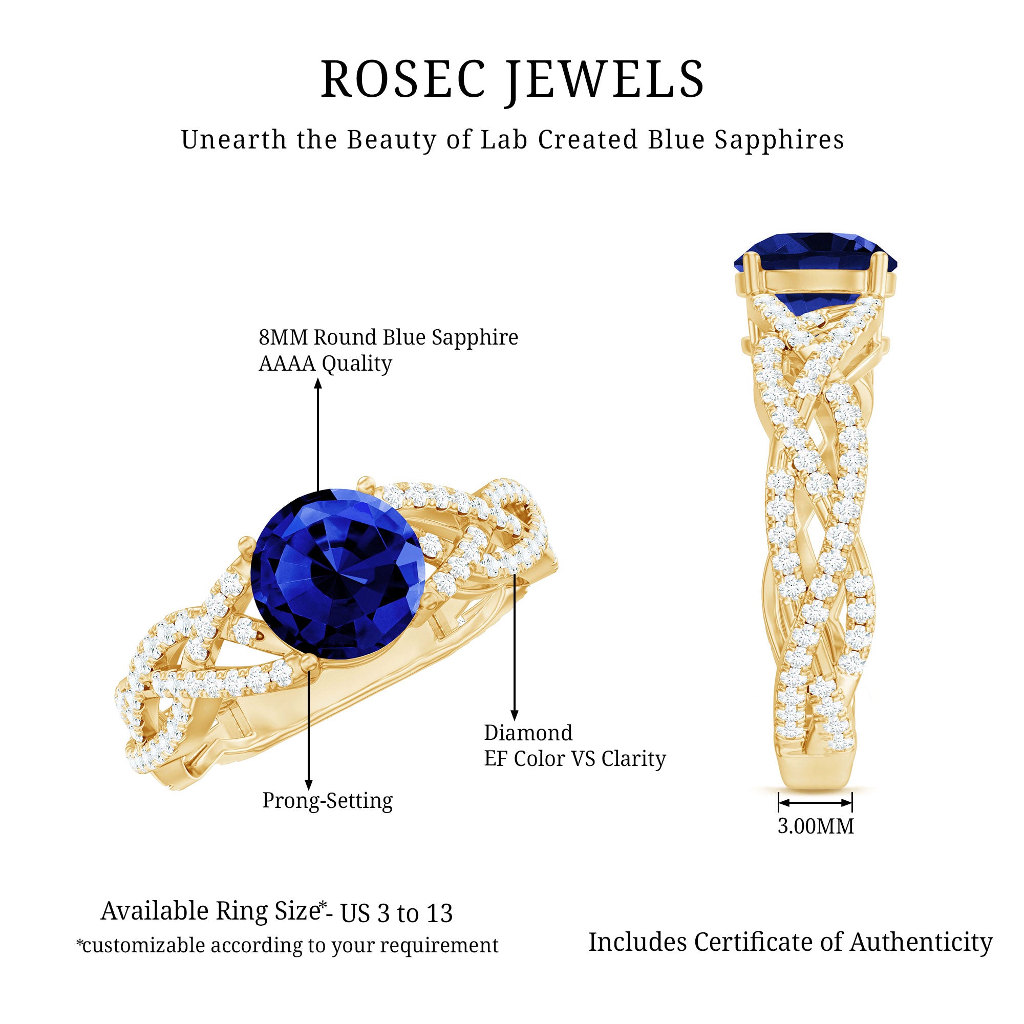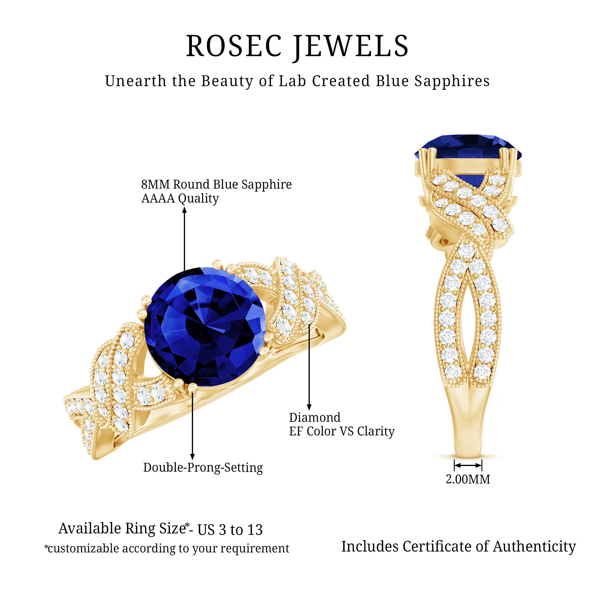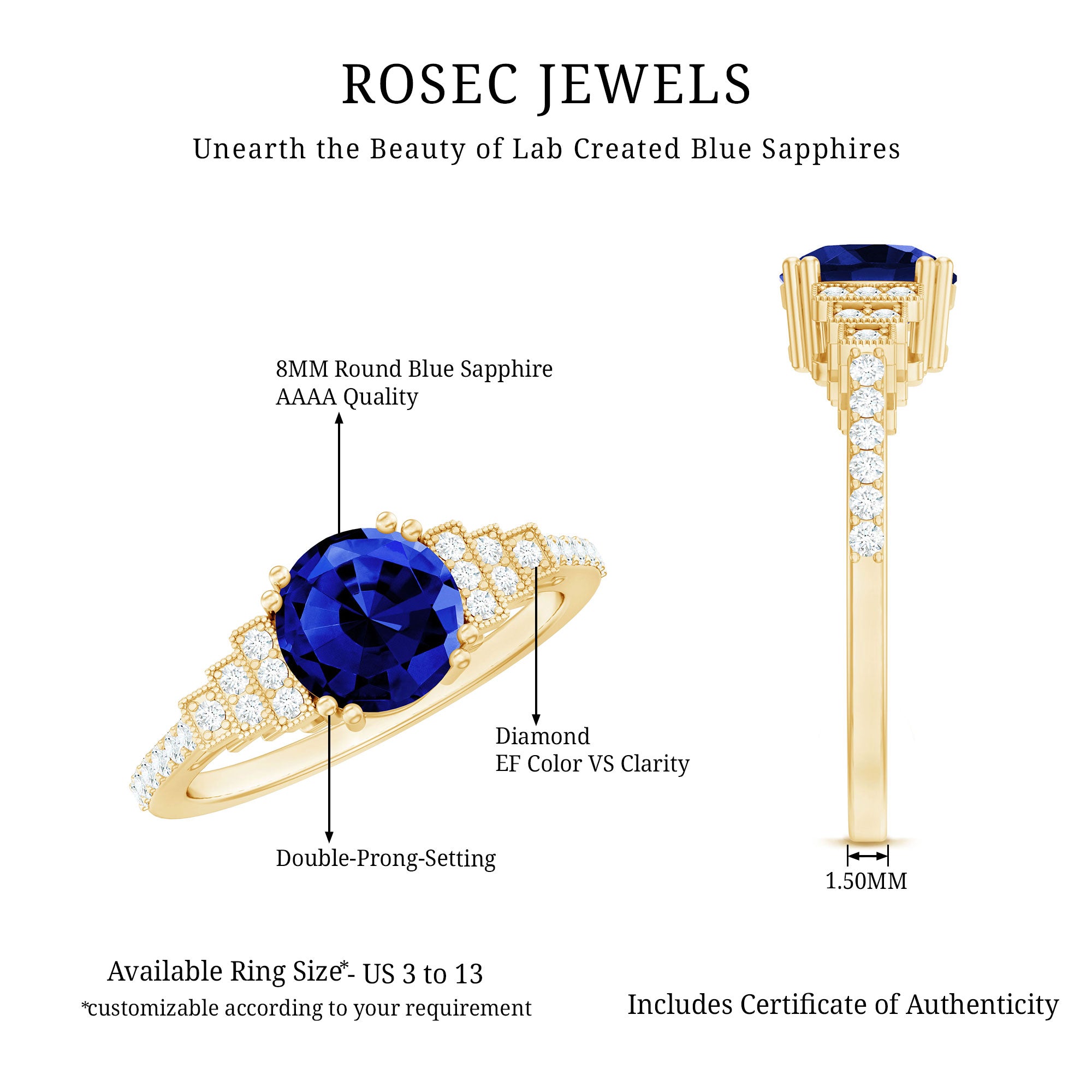 Our Lab Grown Blue Sapphire Rings are certified with AAAA quality gemstone, paired along with other precious stones such as Moissanite. These Lab Grown Blue Sapphire Rings are eco-friendly as they are grown in a lab instead of being extracted from the mines. Our rings are available in two precious metals, silver and gold (with two color choices available in gold only; white and yellow). Know more about our blue gemstone rings: