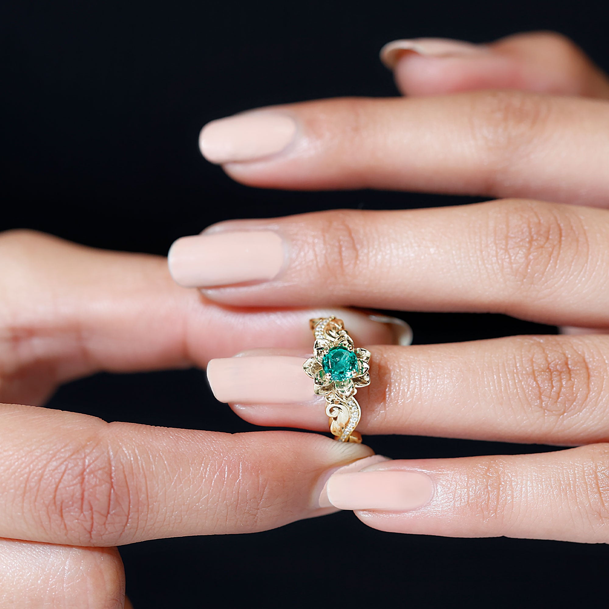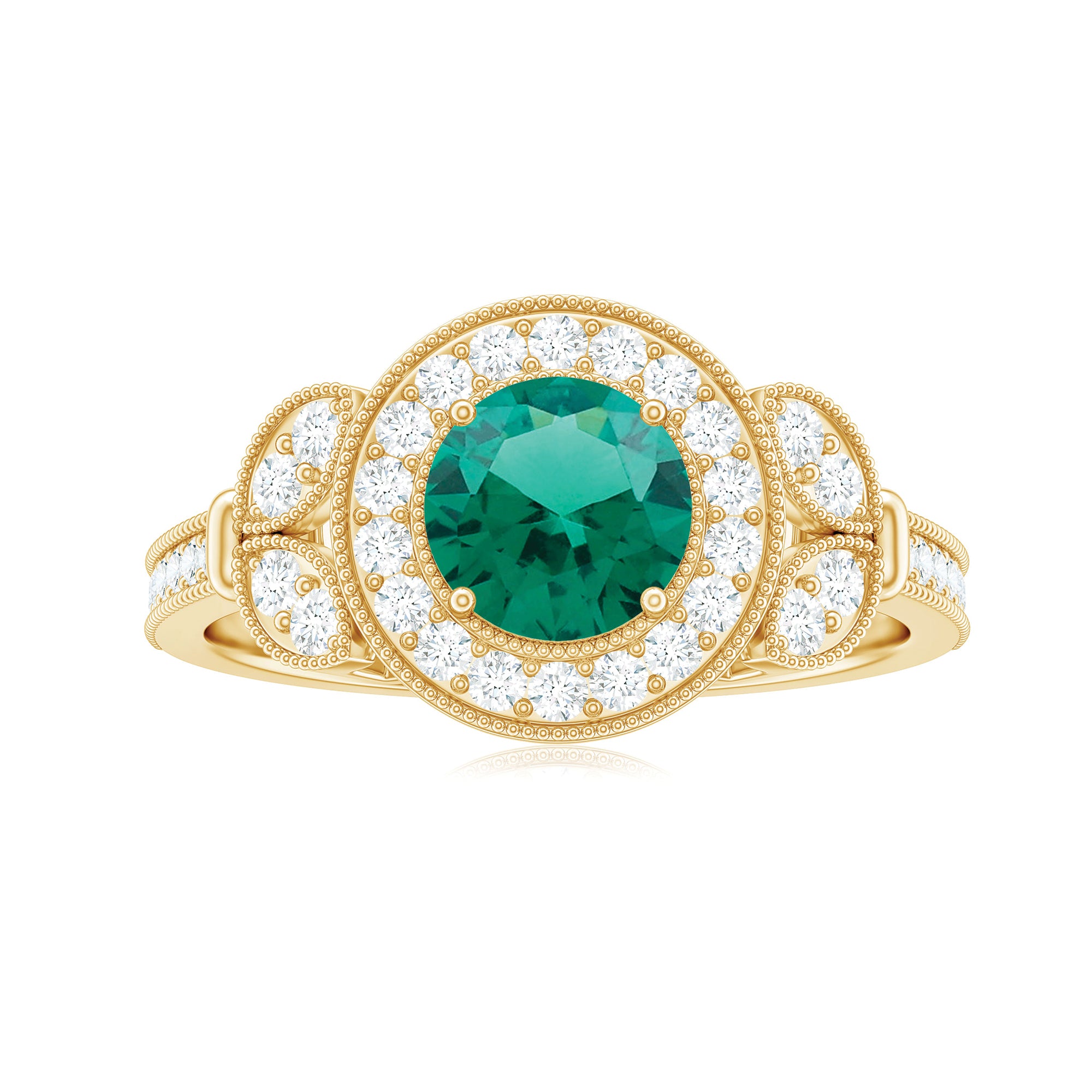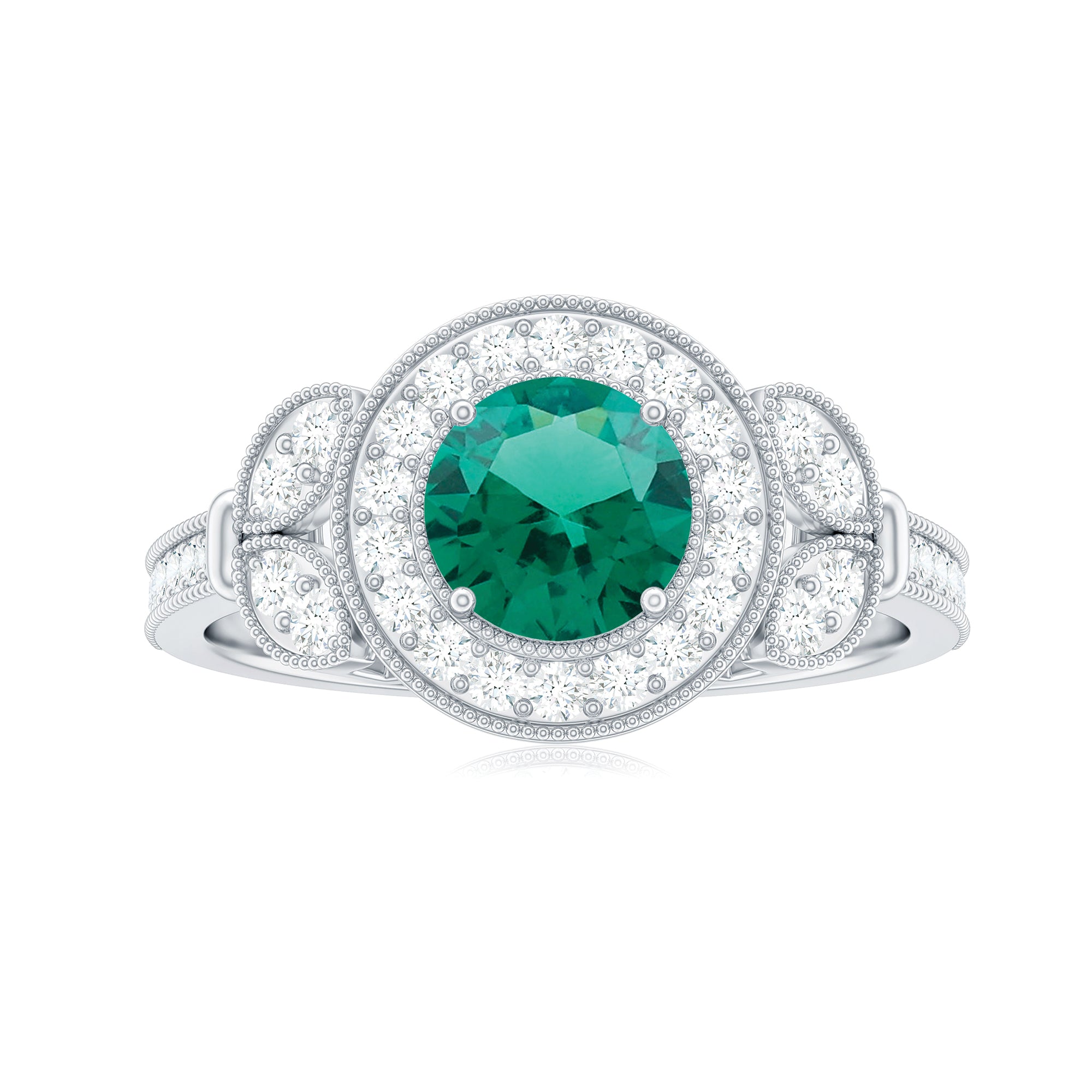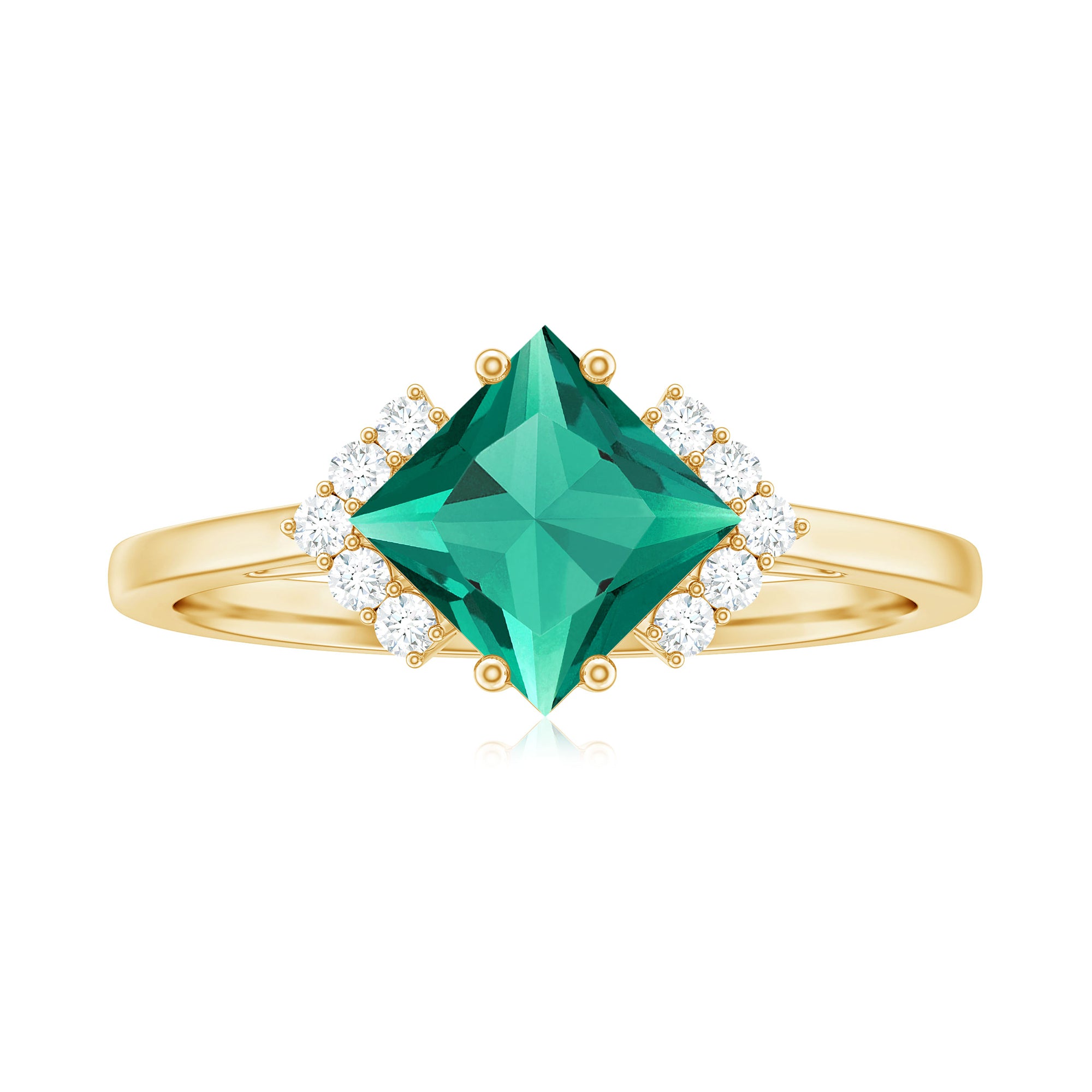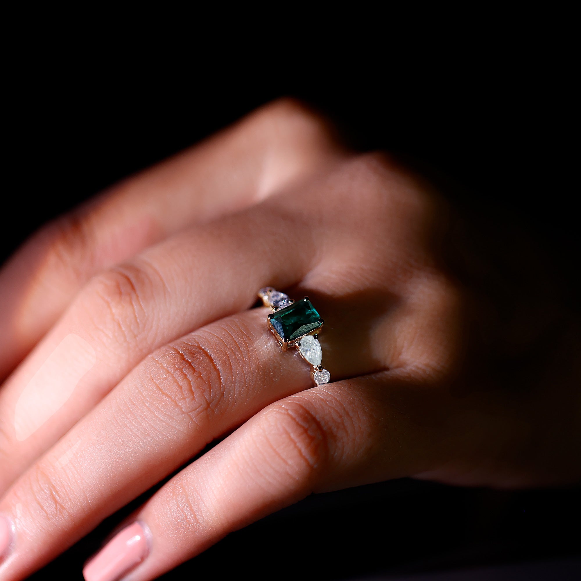 Like other gemstone engagement rings, lab created emerald engagement rings are crafted in almost all designs from timeless classics to stylish, trending styles. If you prefer to shine just with the elegance of emerald gemstone, then lab created emerald solitaire rings reflecting your bold identity can be a great choice. If looking for something unique and trending, then check our toi et moi lab created emerald engagement rings. Symbolising your soulful union with your partner, through two similar or different gemstones, this design stands out for its beauty. A more meaningful piece reflecting your love journey, is a three stone lab created emerald ring. It symbolizes the past, present, and future of your relationship. Vintage inspired lab created emerald engagement rings reflecting lab emeralds beauty in art deco settings are a unique choice of vintage charm lovers. Those looking for sparkling ring designs should check lab created emerald halo engagement rings that feature brilliant emeralds surrounded by smaller shining or other colored gemstone accents.