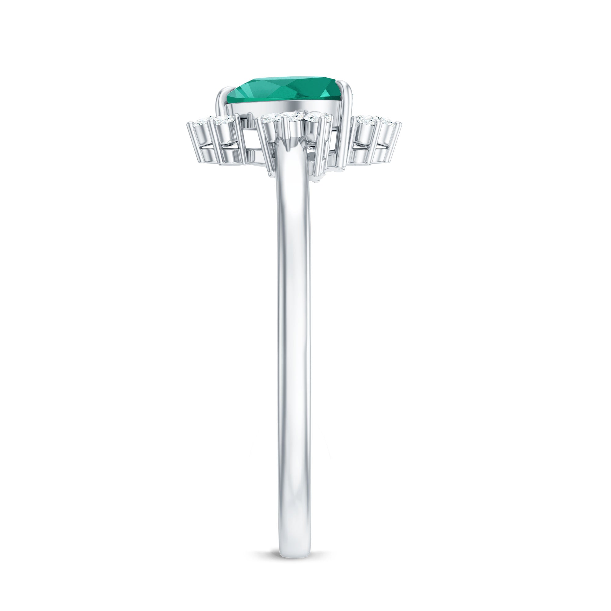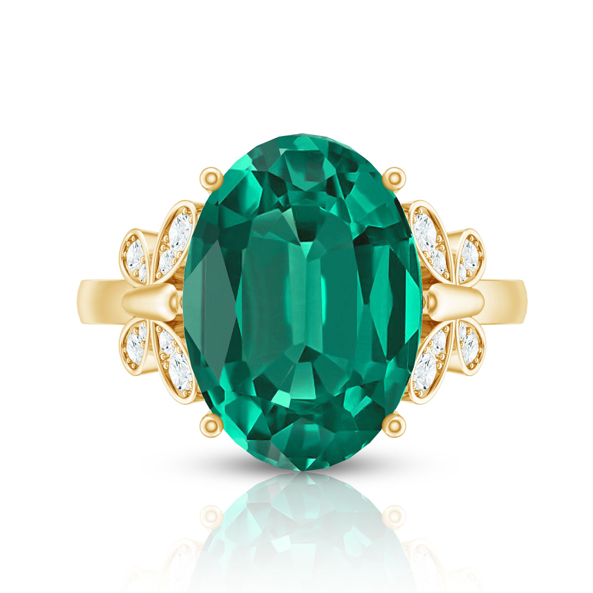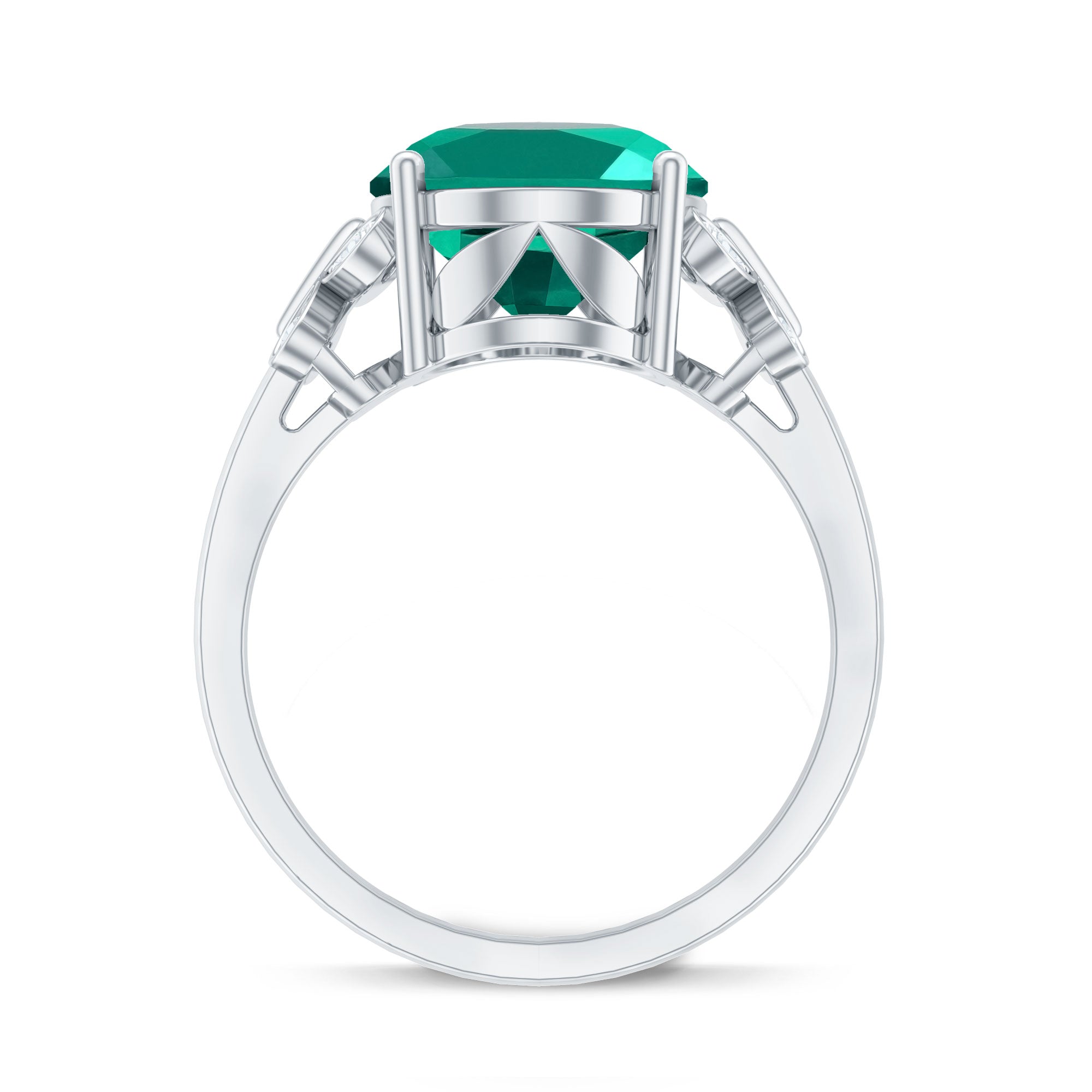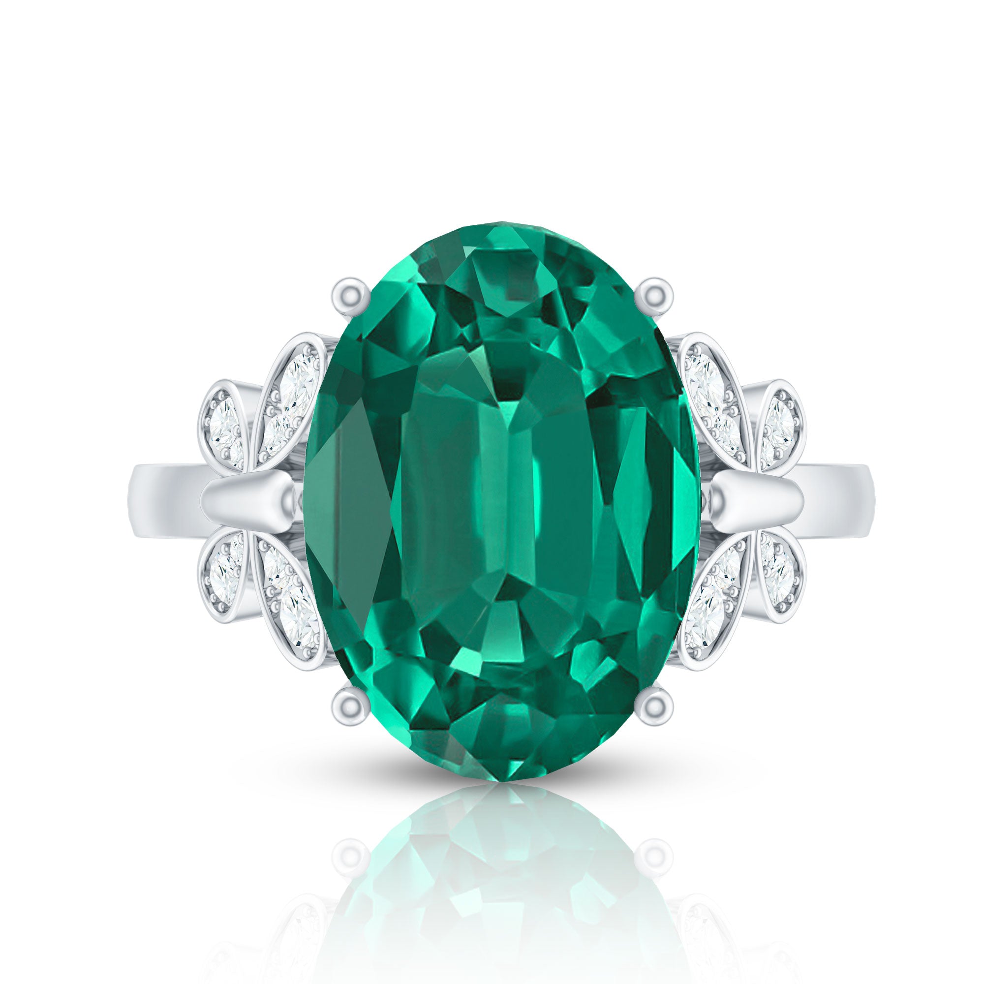 White gold, yellow gold, and silver all look beautiful with lab-created emeralds. The choice depends on personal taste, like yellow gold for traditional warmth and silver for stylish rings.