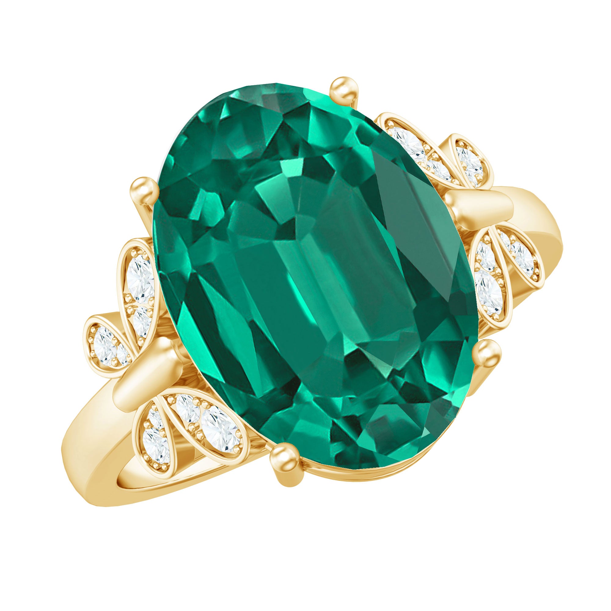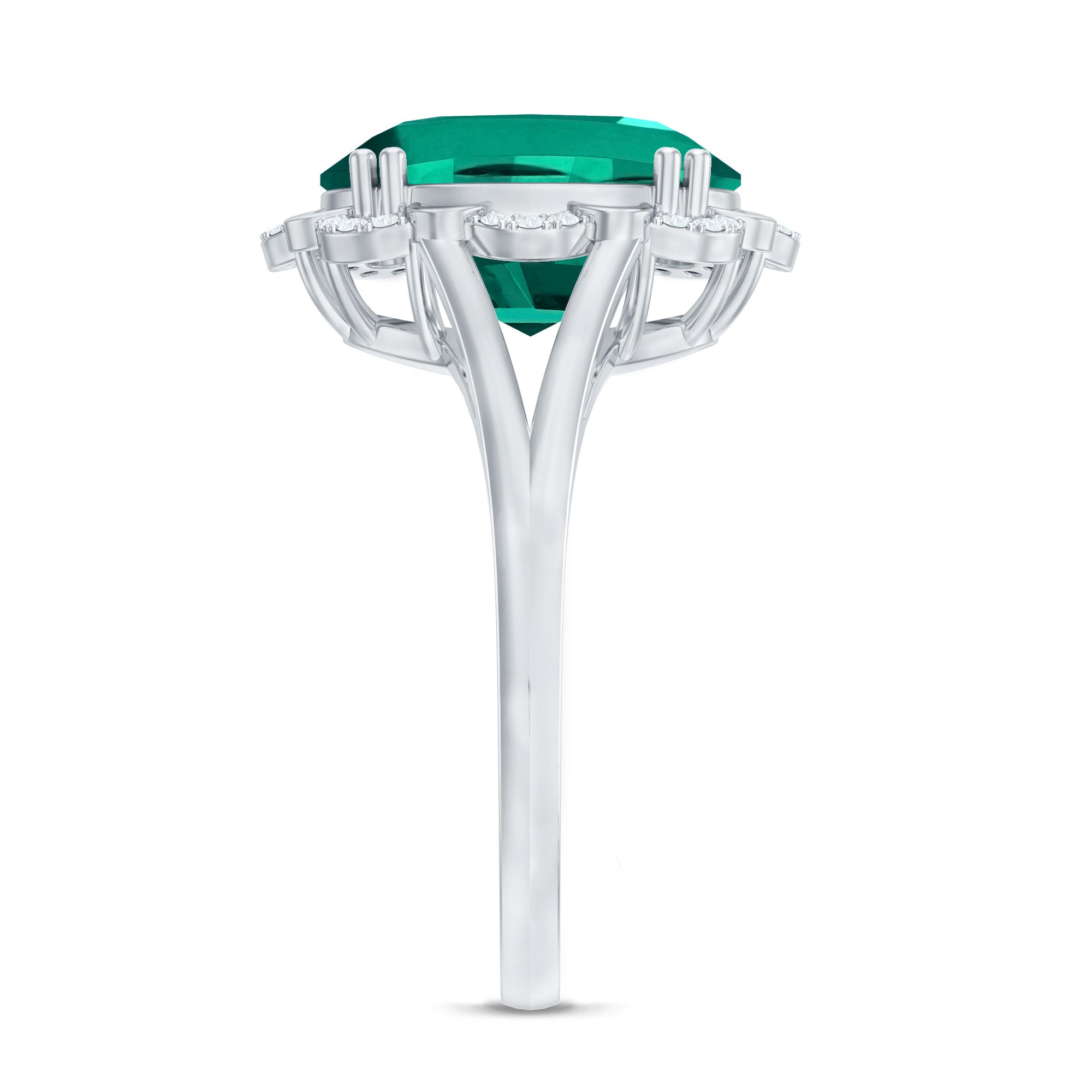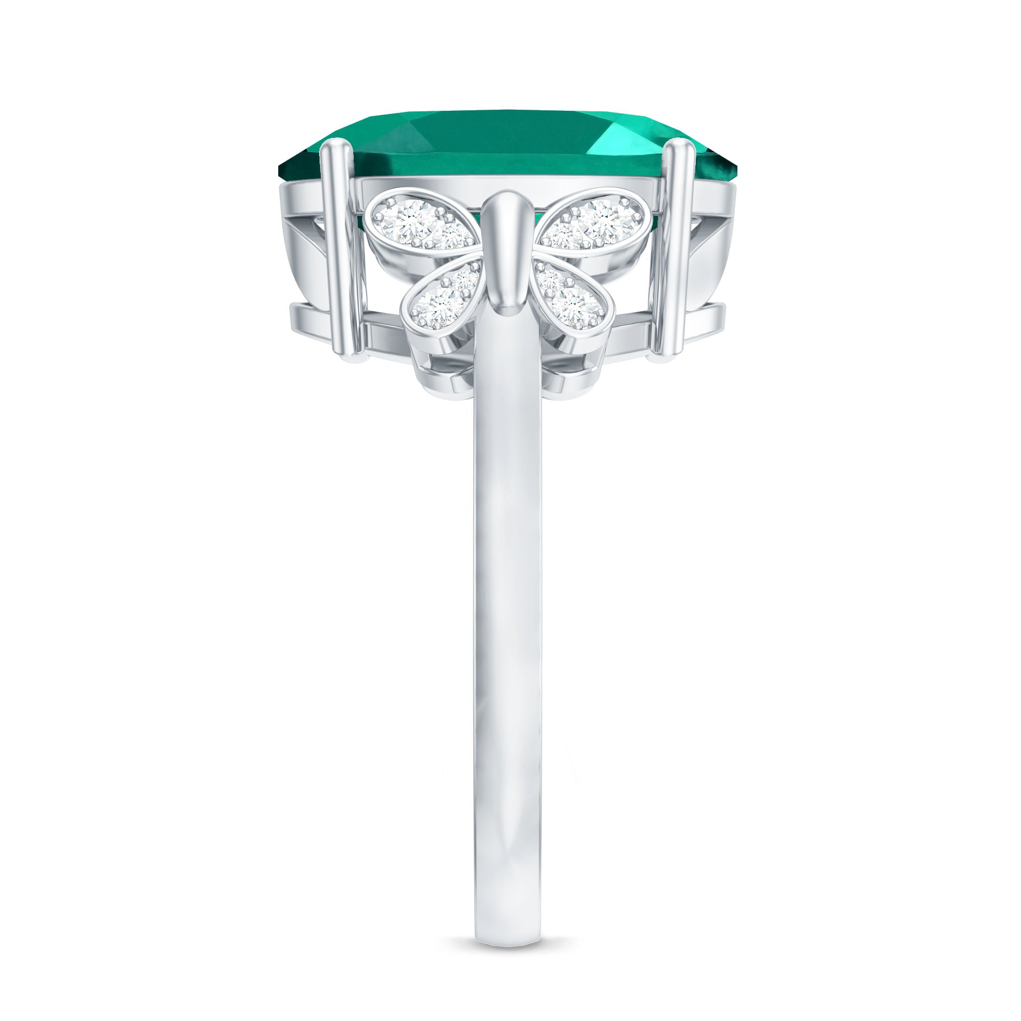 White gold, yellow gold, and silver all look beautiful with lab-created emeralds. The choice depends on personal taste, like yellow gold for traditional warmth and silver for stylish rings.