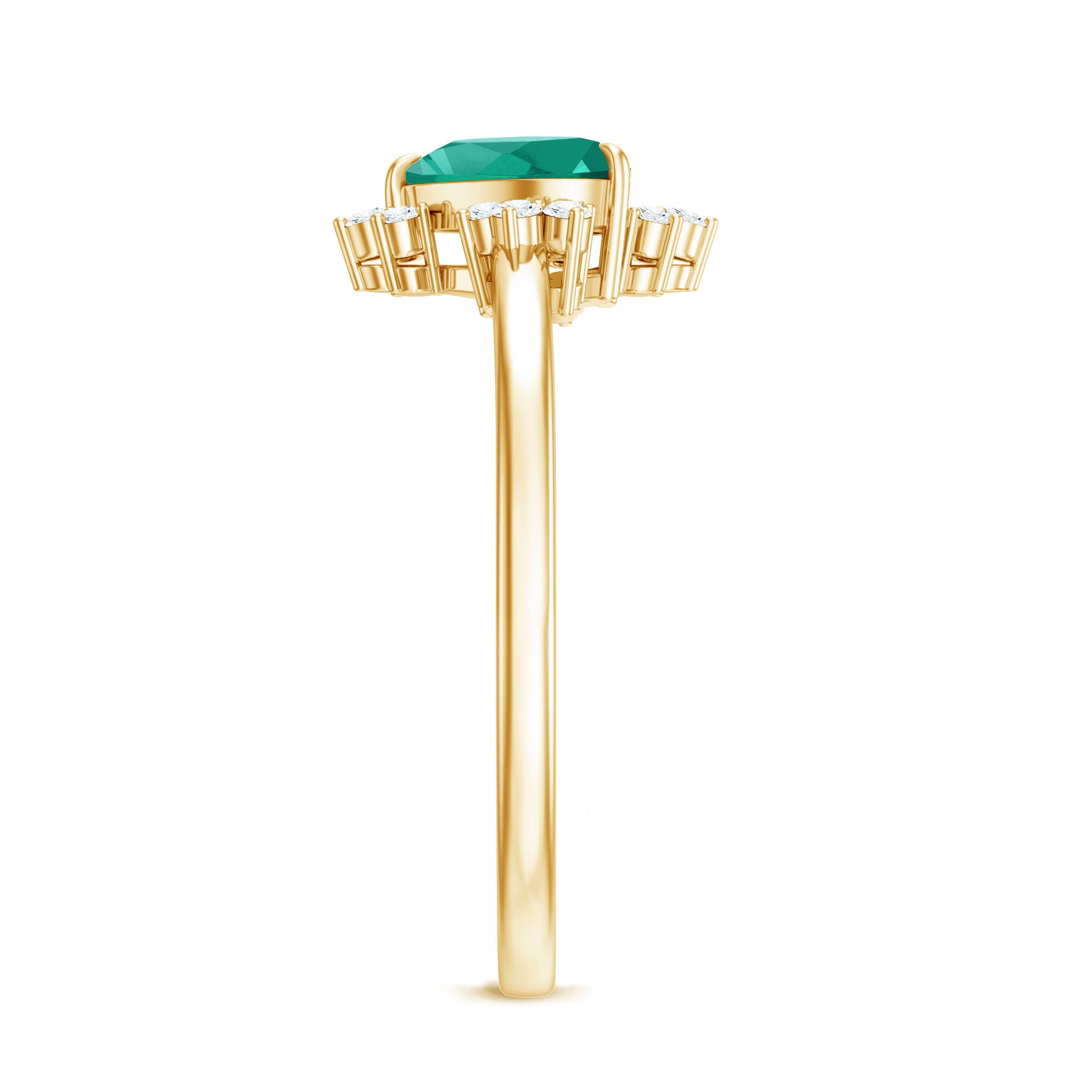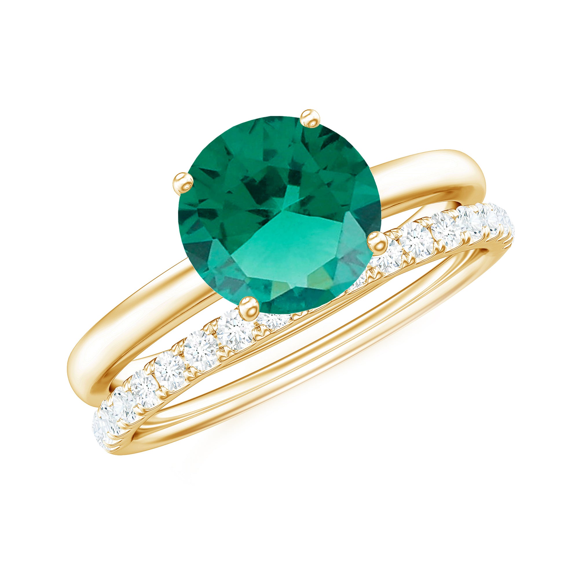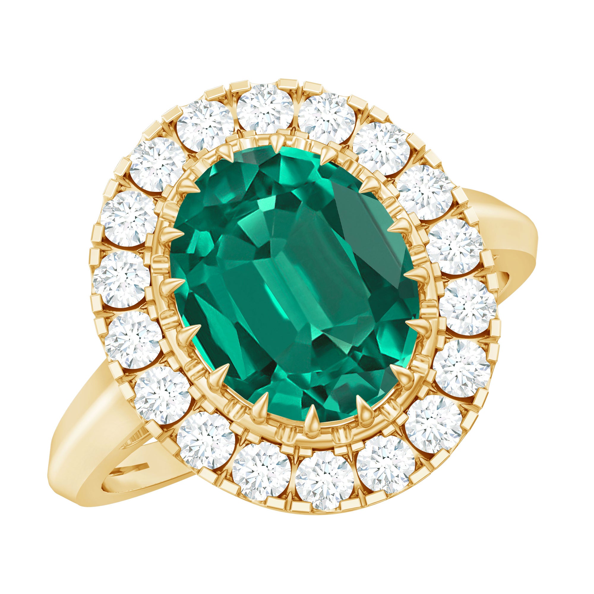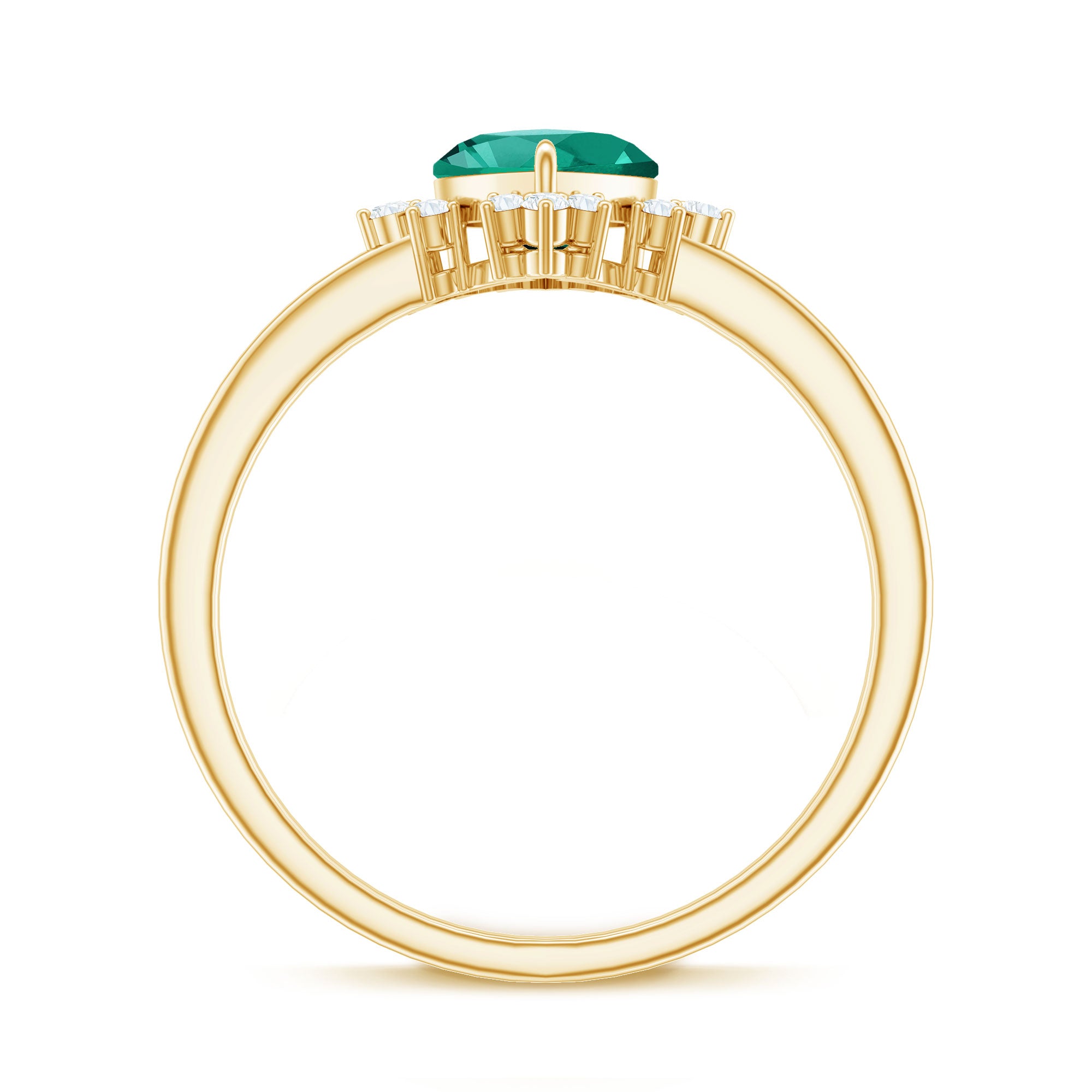 White gold, yellow gold, and silver all look beautiful with lab-created emeralds. The choice depends on personal taste, like yellow gold for traditional warmth and silver for stylish rings.