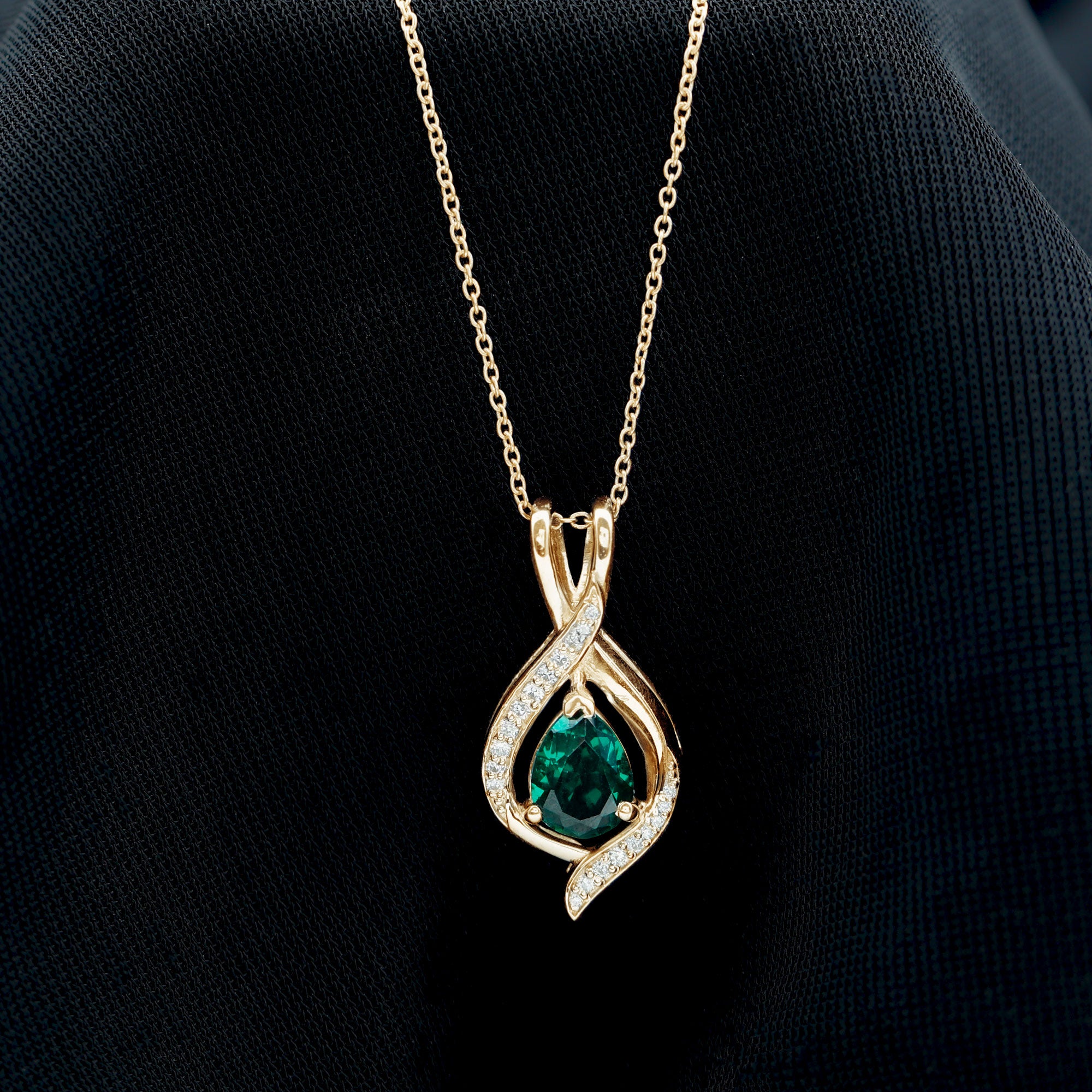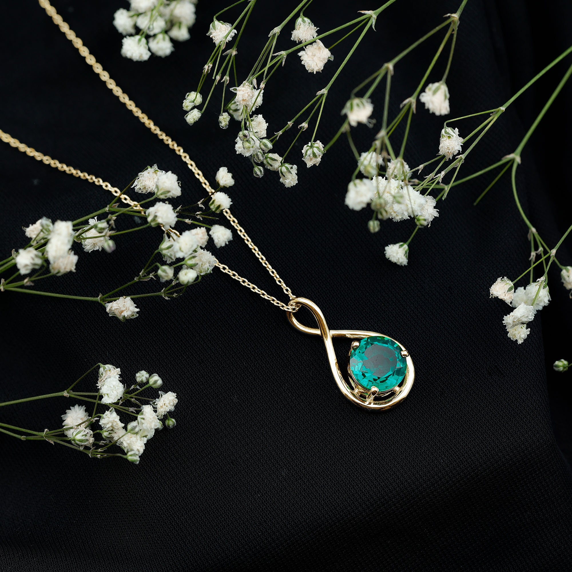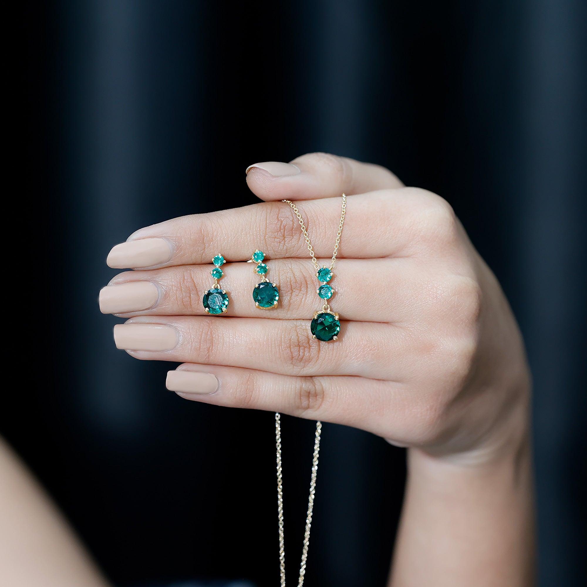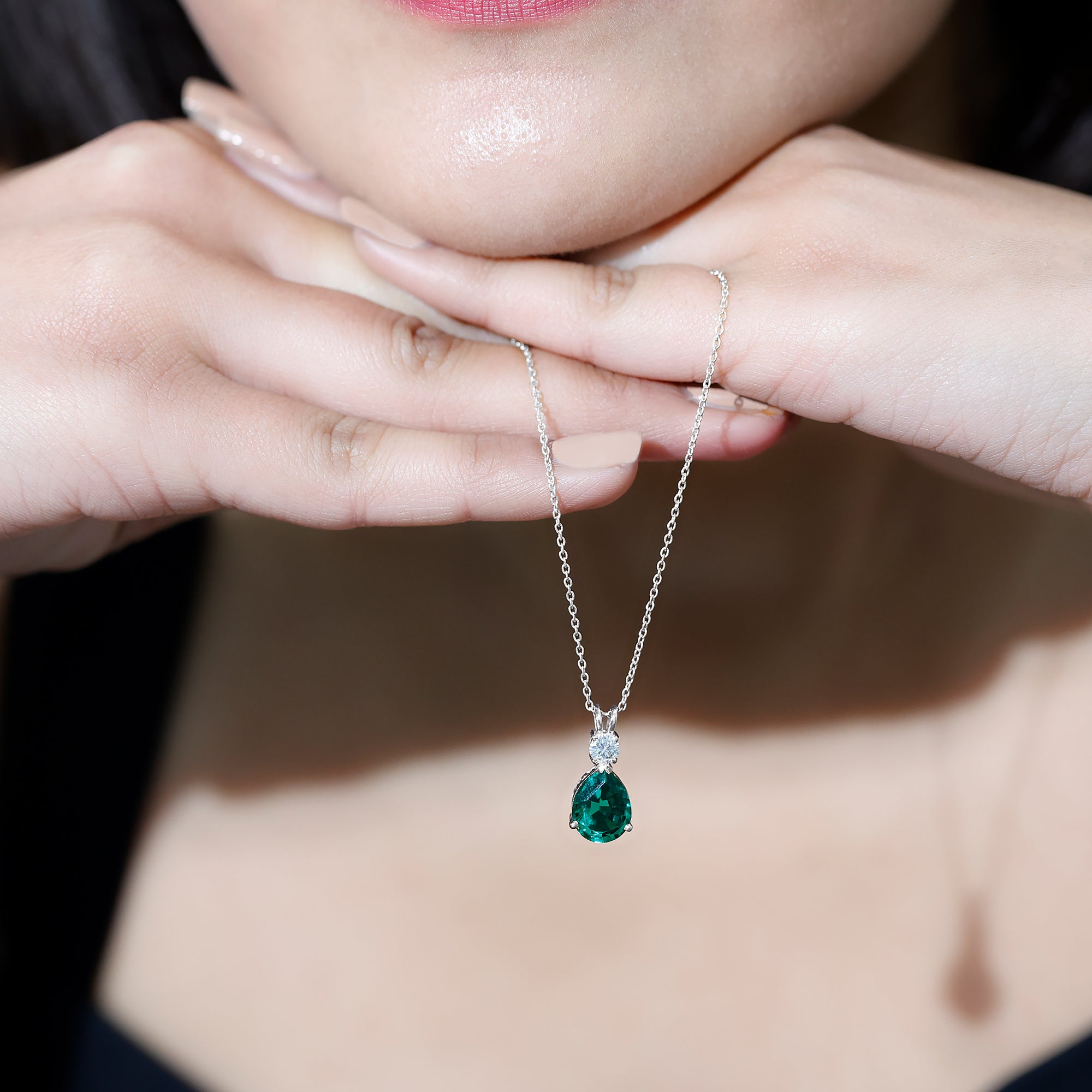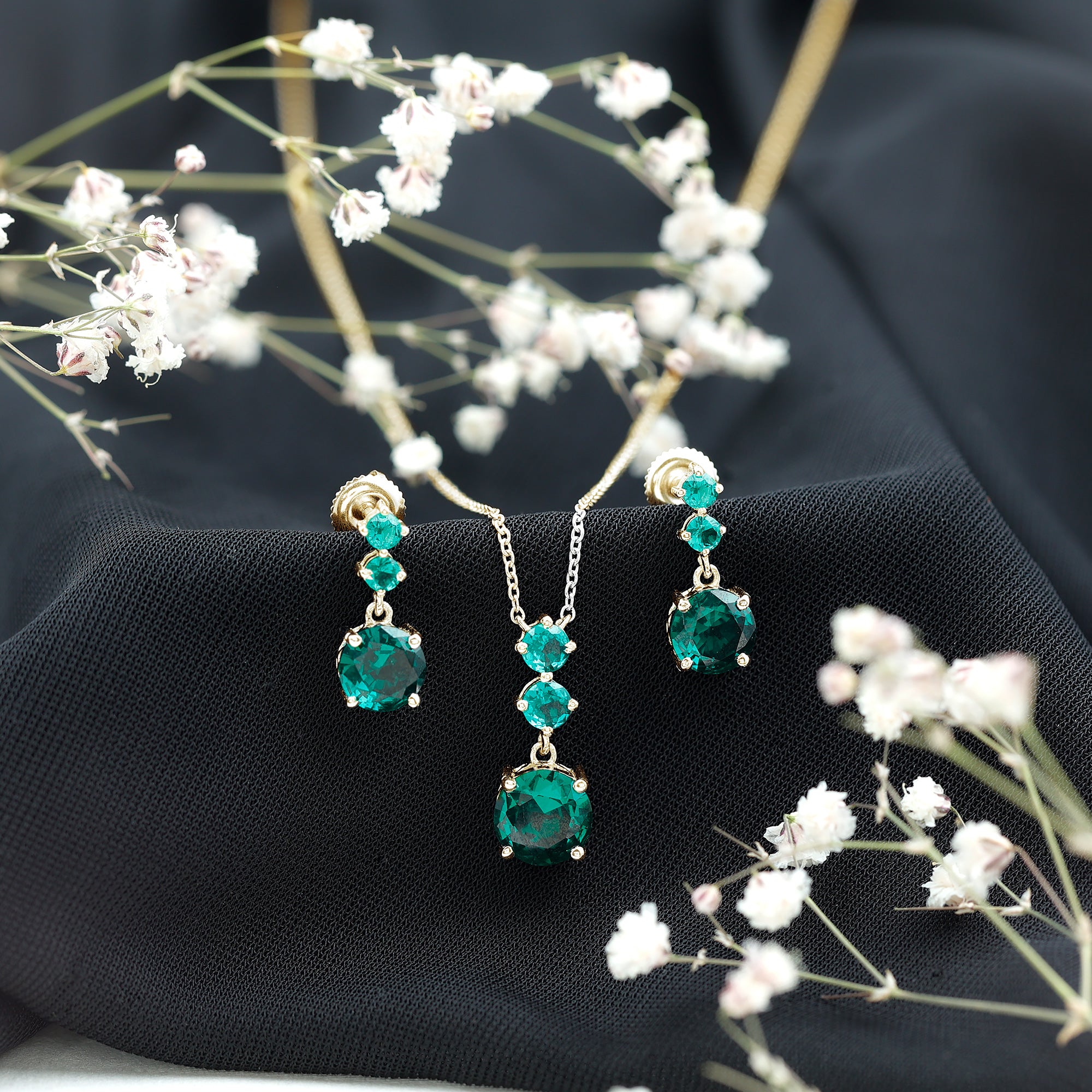 Emerald hanging from a chain shines as a drop in different shapes like pear, round and more in a lab created emerald pendant. While the dangle design fixed for to and fro motion draws attention with emeralds green hue. Dainty to large gemstones make this style perfect for special evenings and casual mornings.