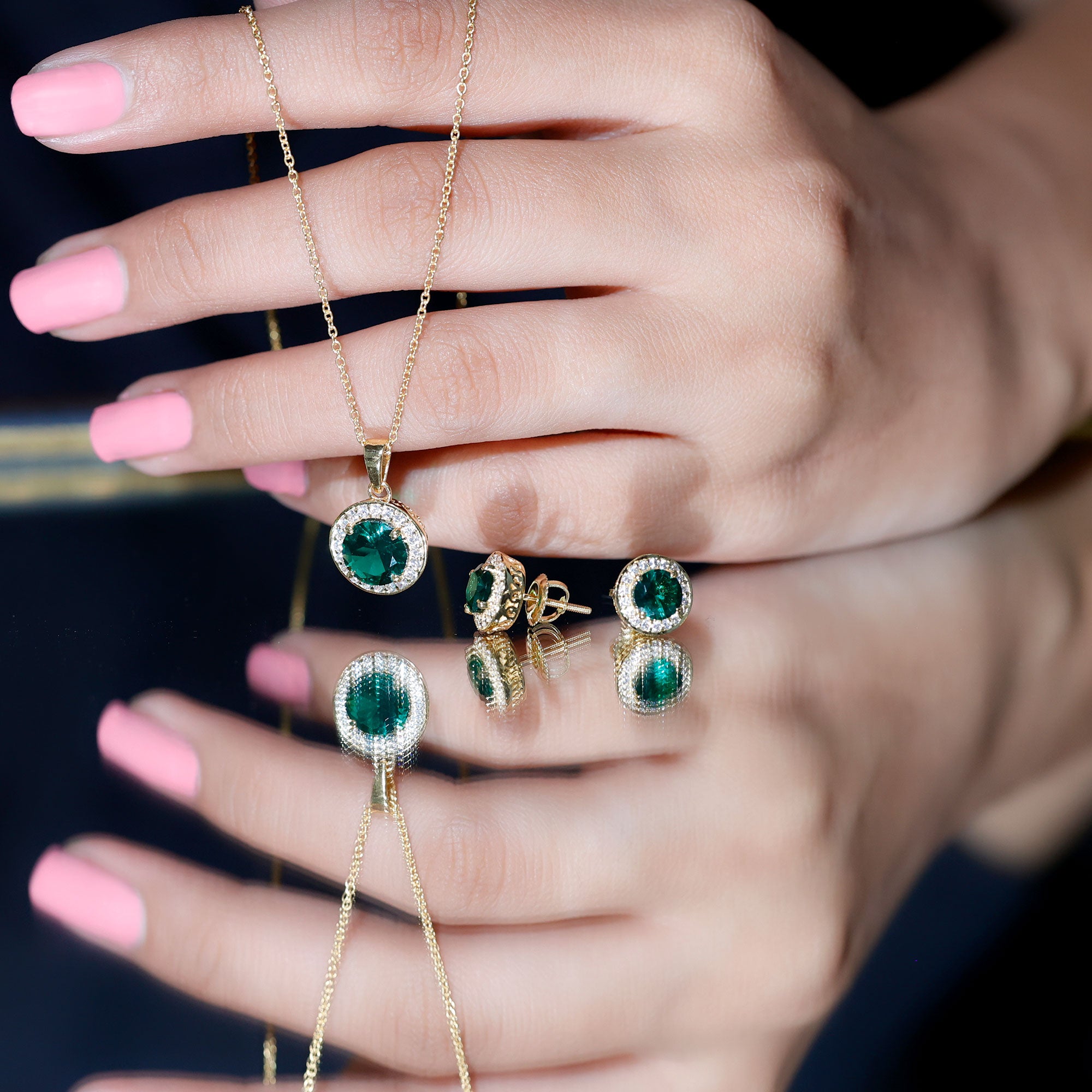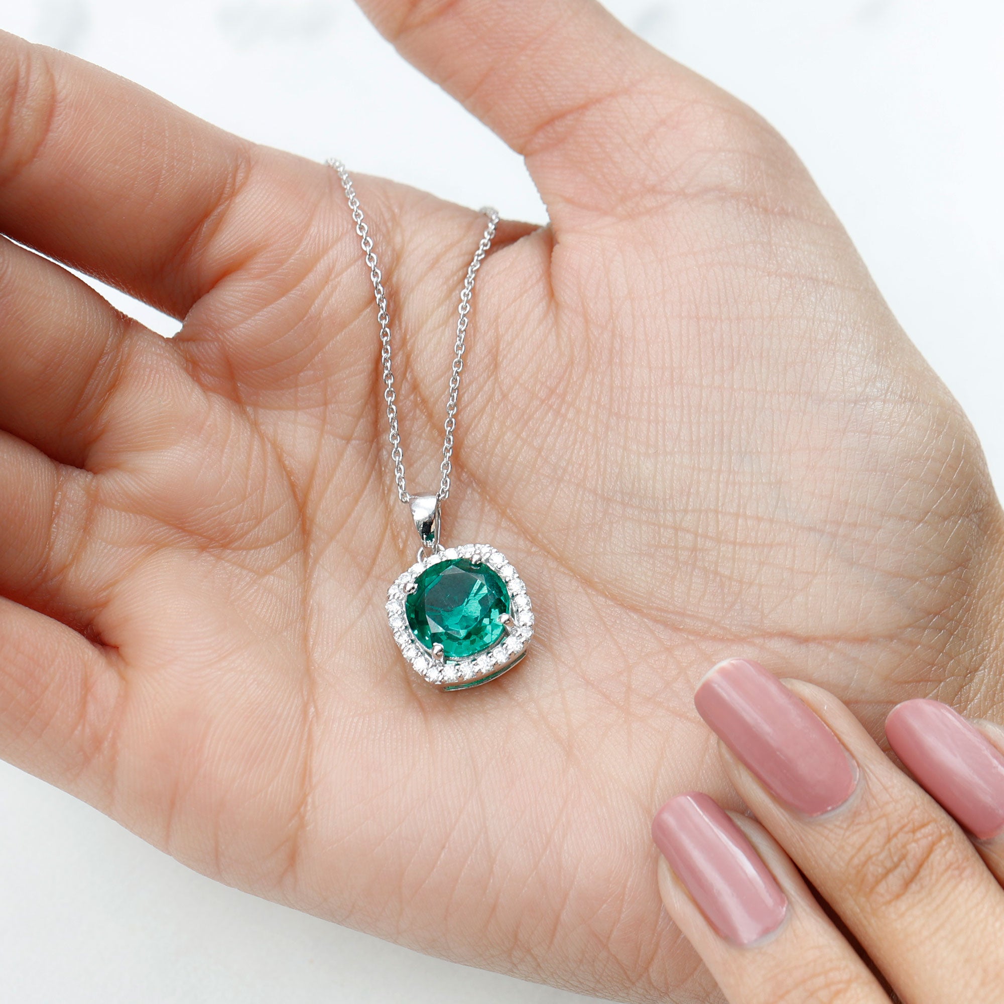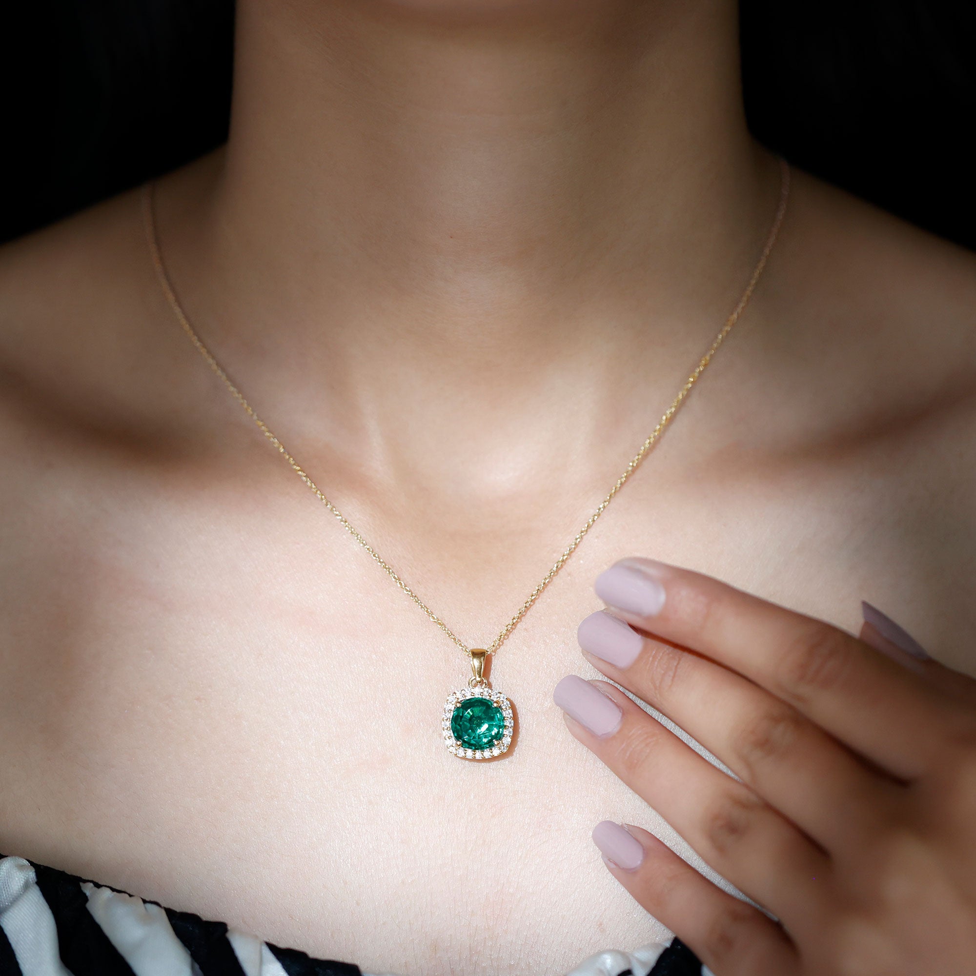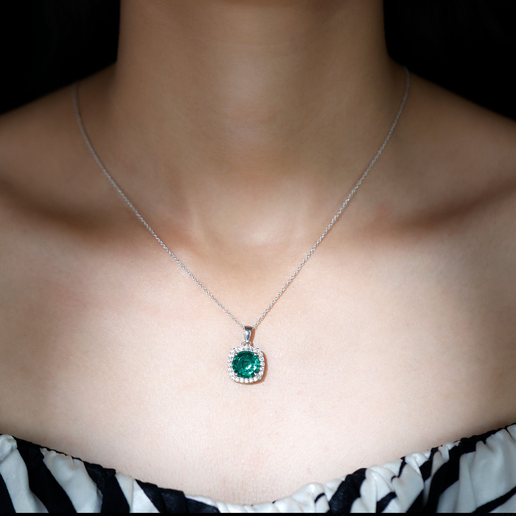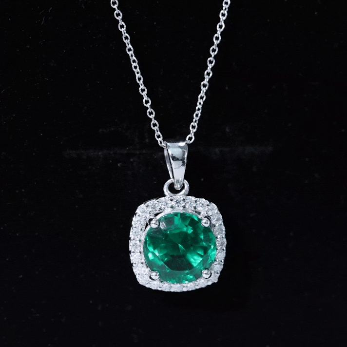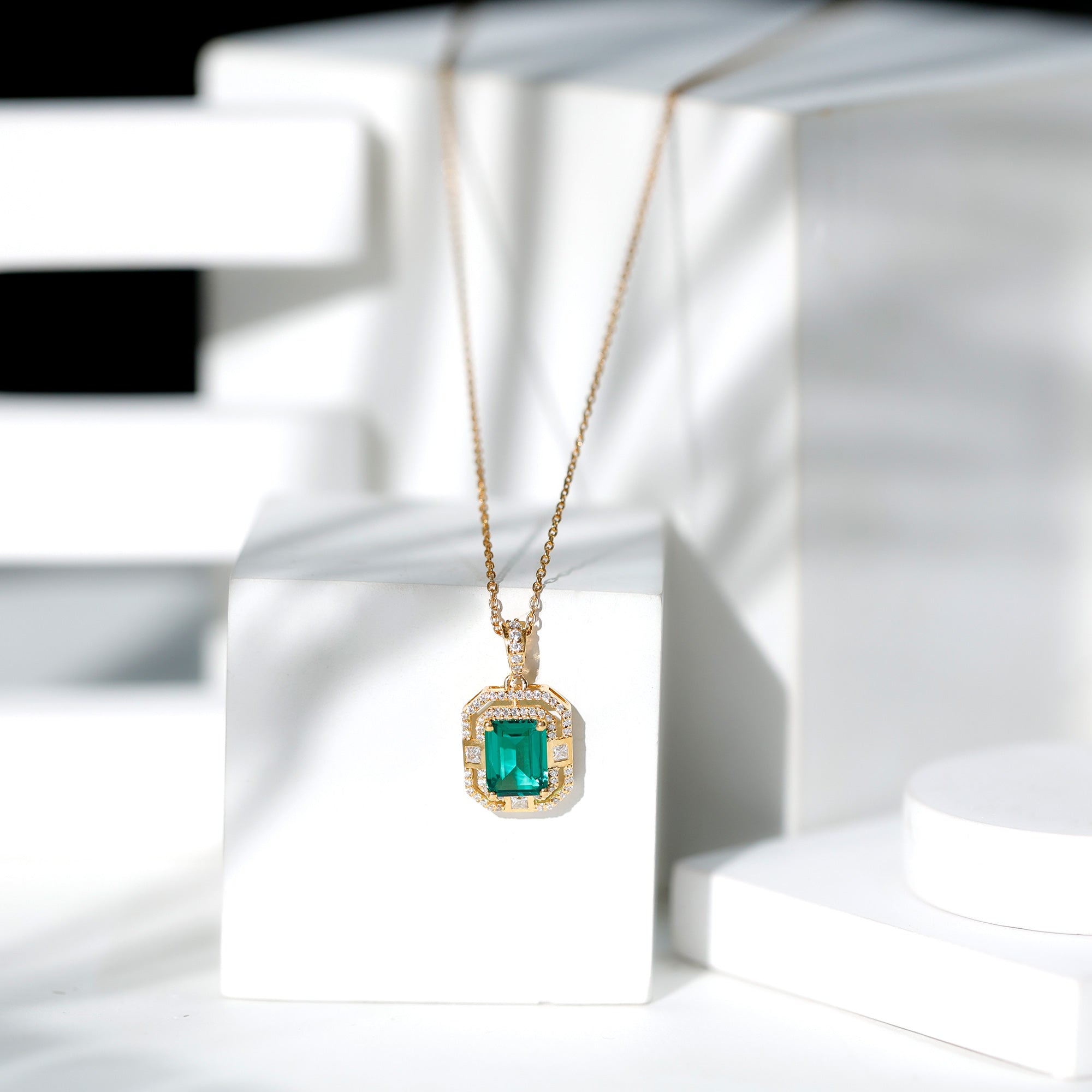 Created Emerald halo necklace design is all about a lab emerald gemstone in the center protected by small shining gemstones for added sparkle or colored gemstones for a more vibrant look. These stylish neck pieces can add a touch of glamour to any look.