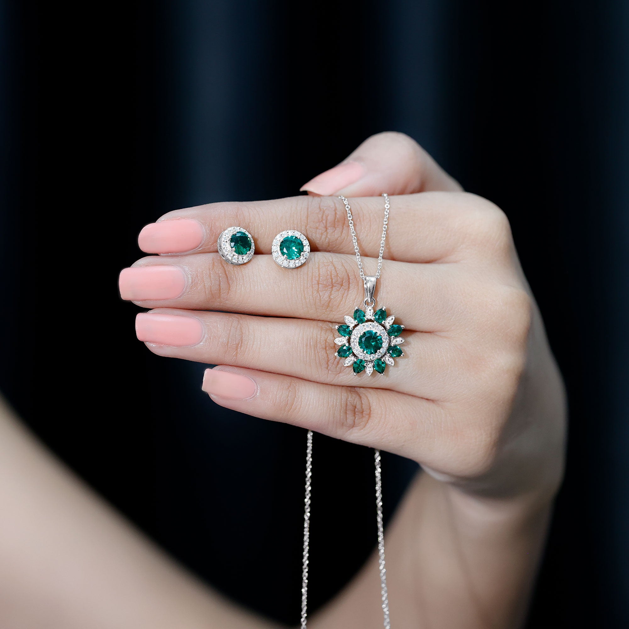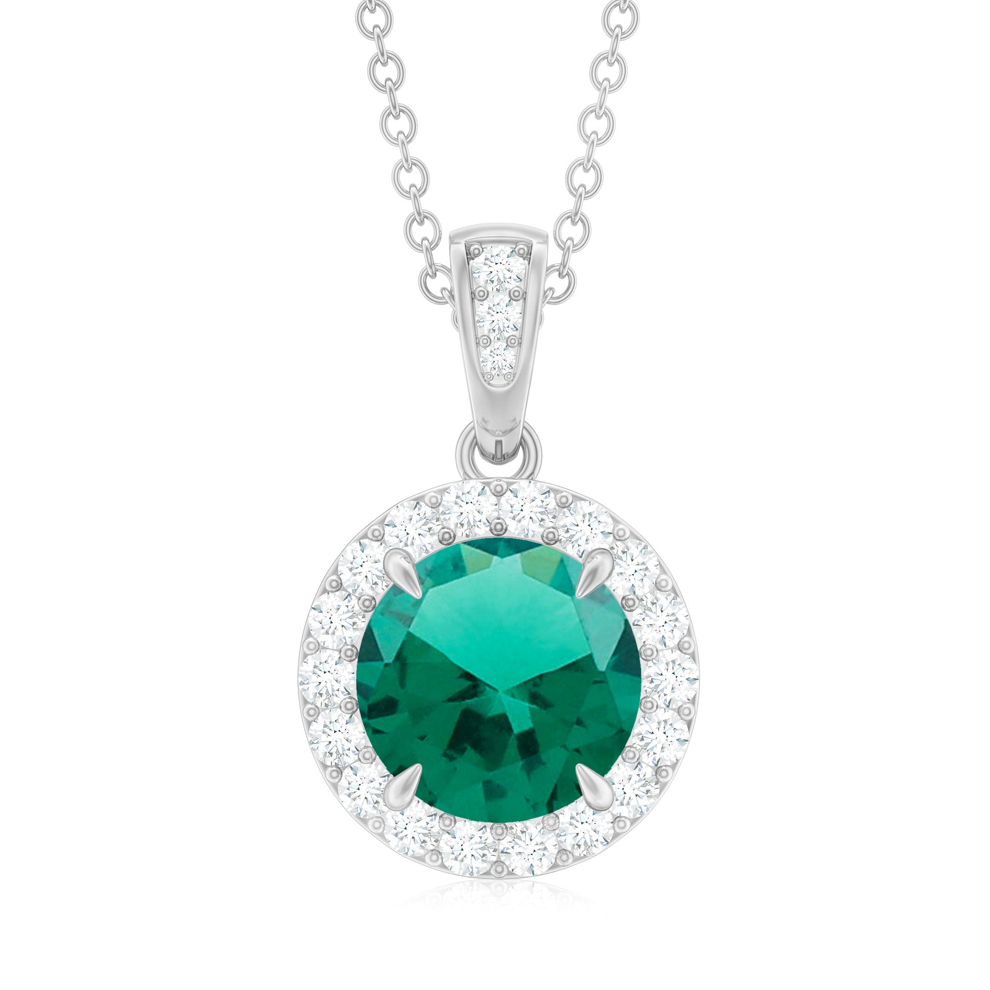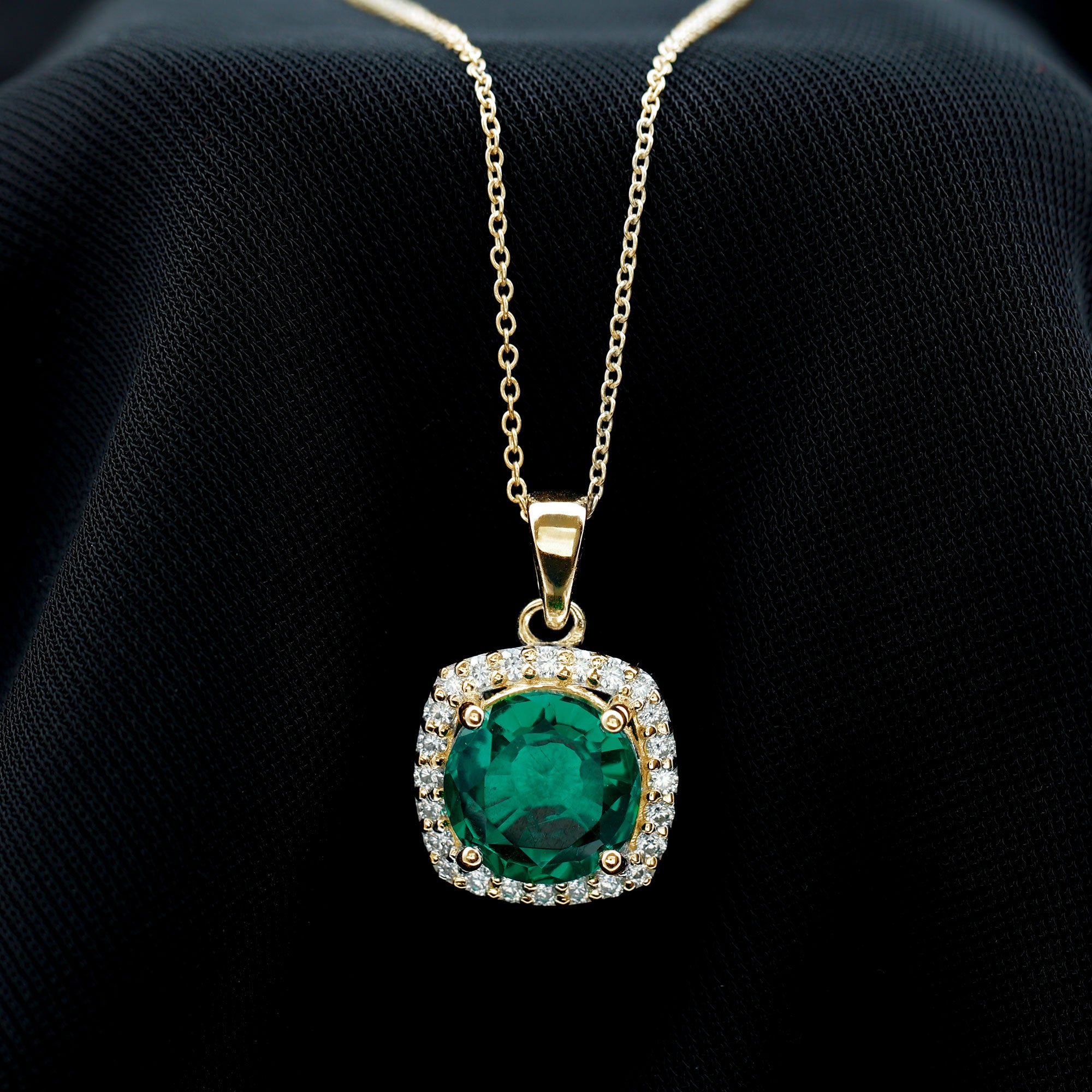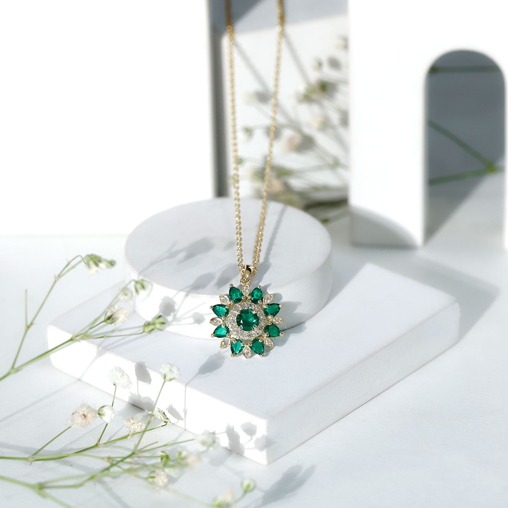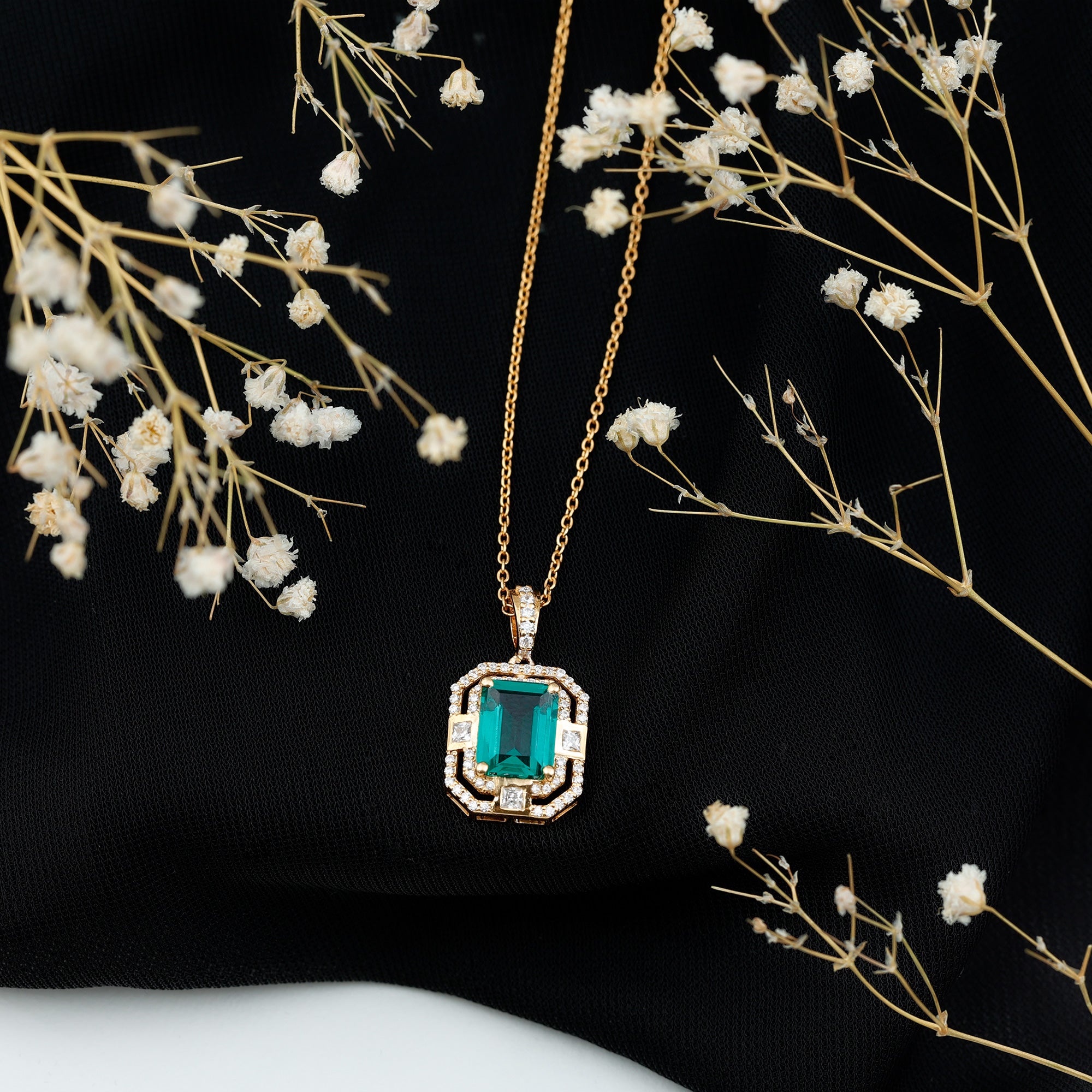 Created Emerald halo necklace design is all about a lab emerald gemstone in the center protected by small shining gemstones for added sparkle or colored gemstones for a more vibrant look. These stylish neck pieces can add a touch of glamour to any look.