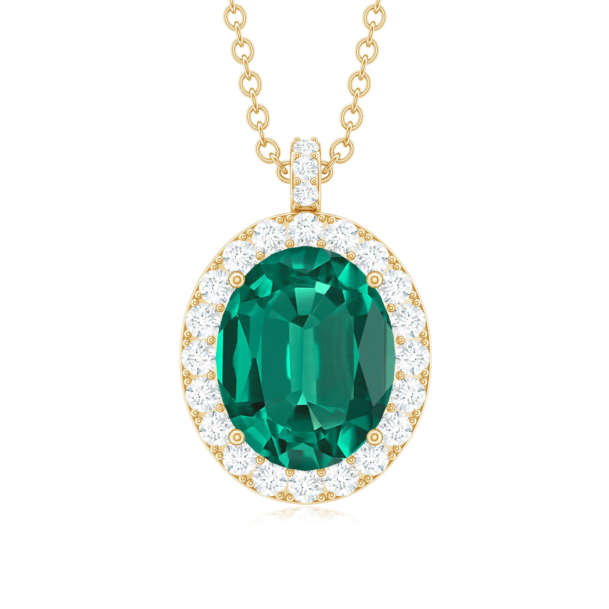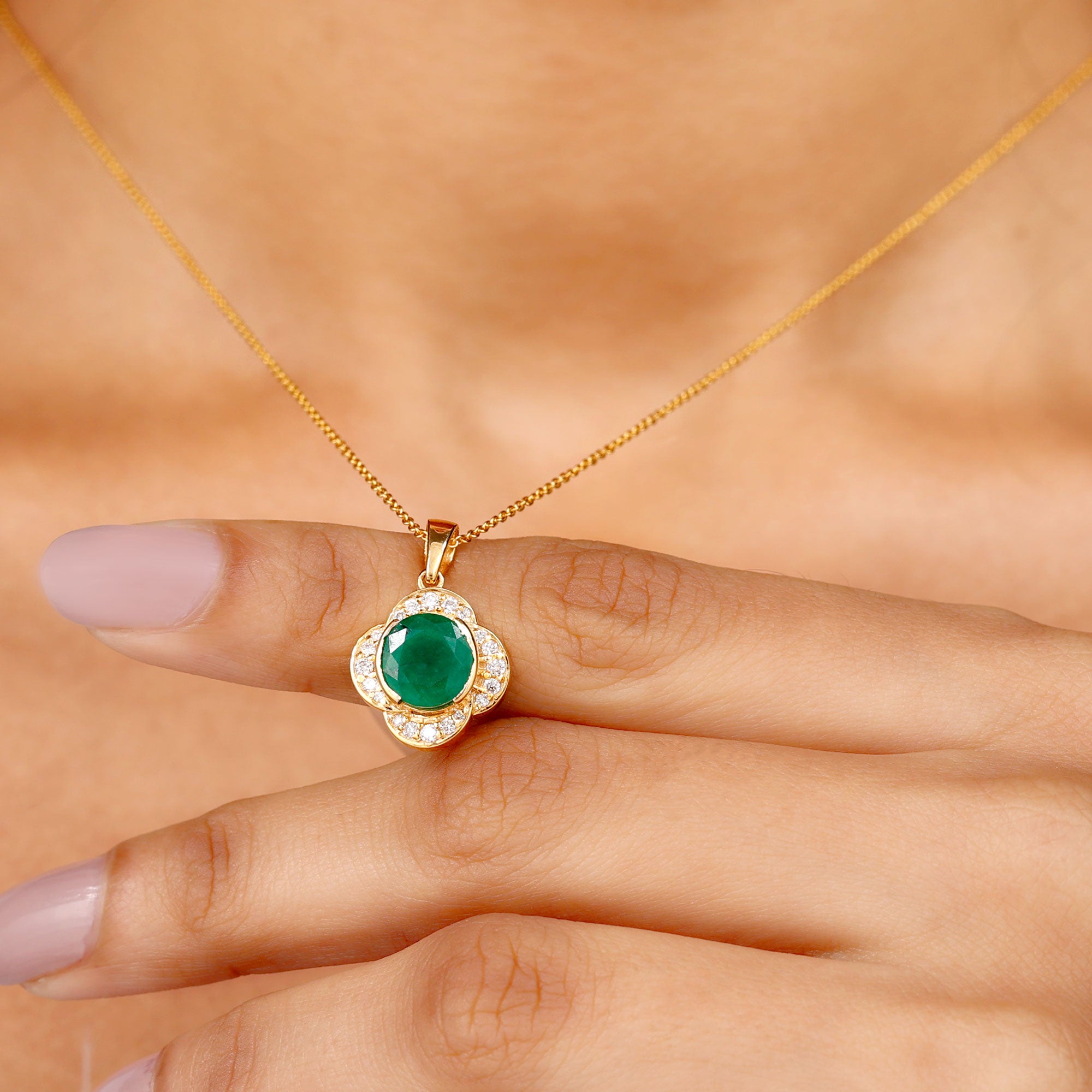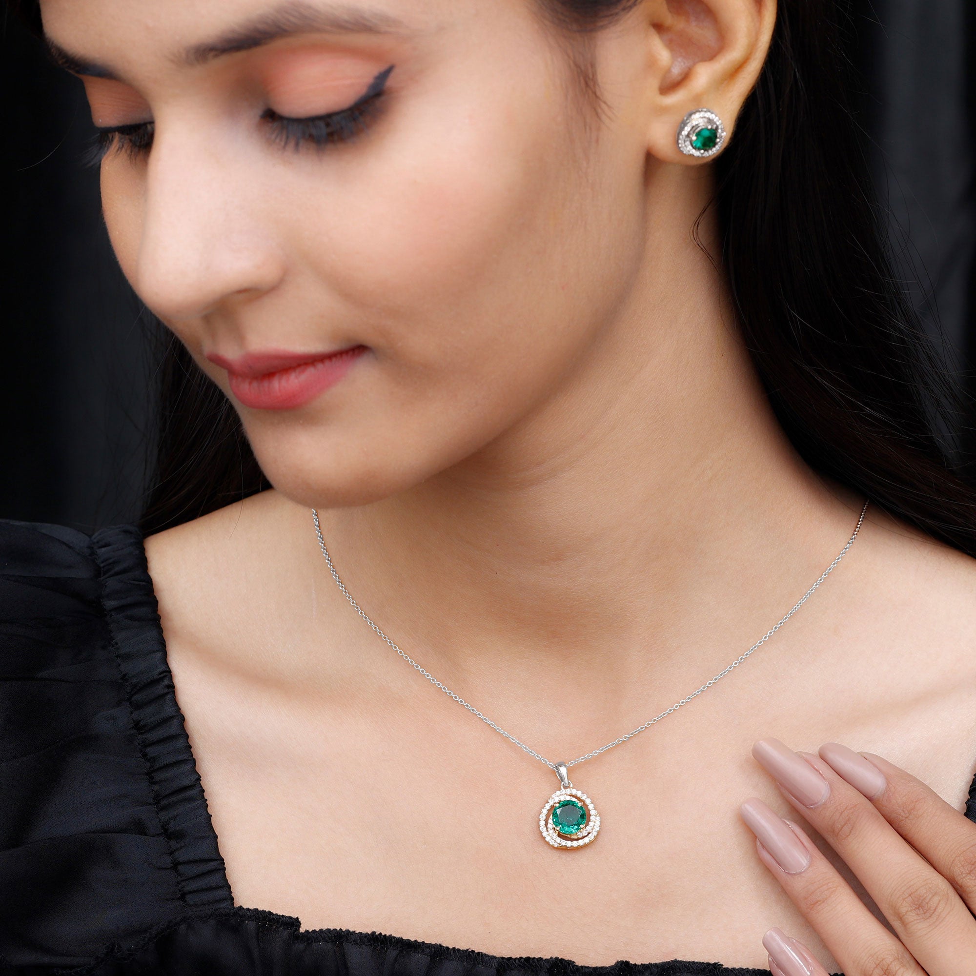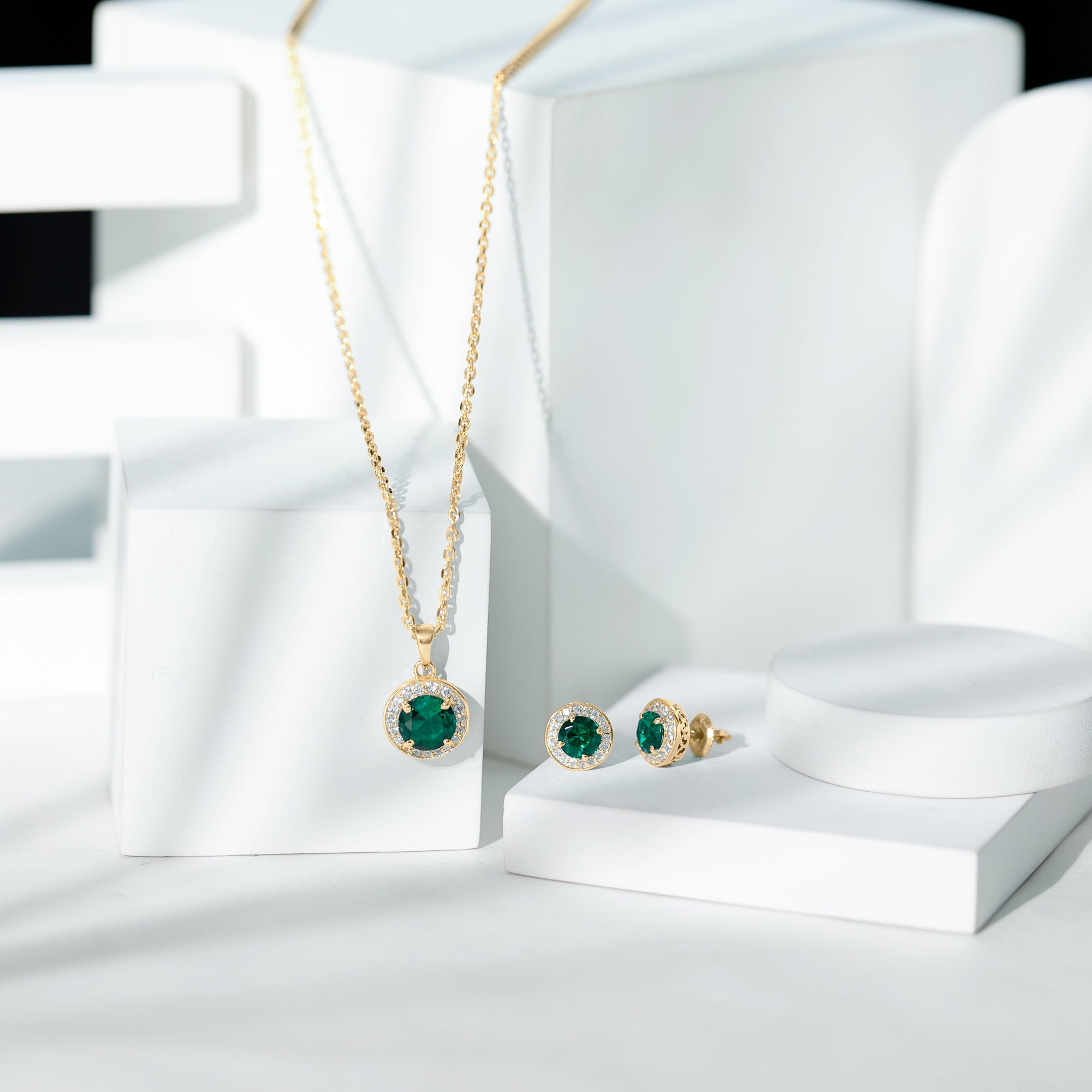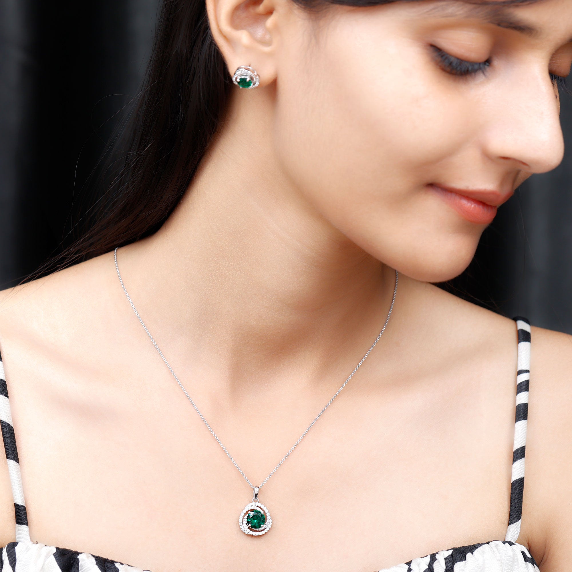 Created Emerald halo necklace design is all about a lab emerald gemstone in the center protected by small shining gemstones for added sparkle or colored gemstones for a more vibrant look. These stylish neck pieces can add a touch of glamour to any look.