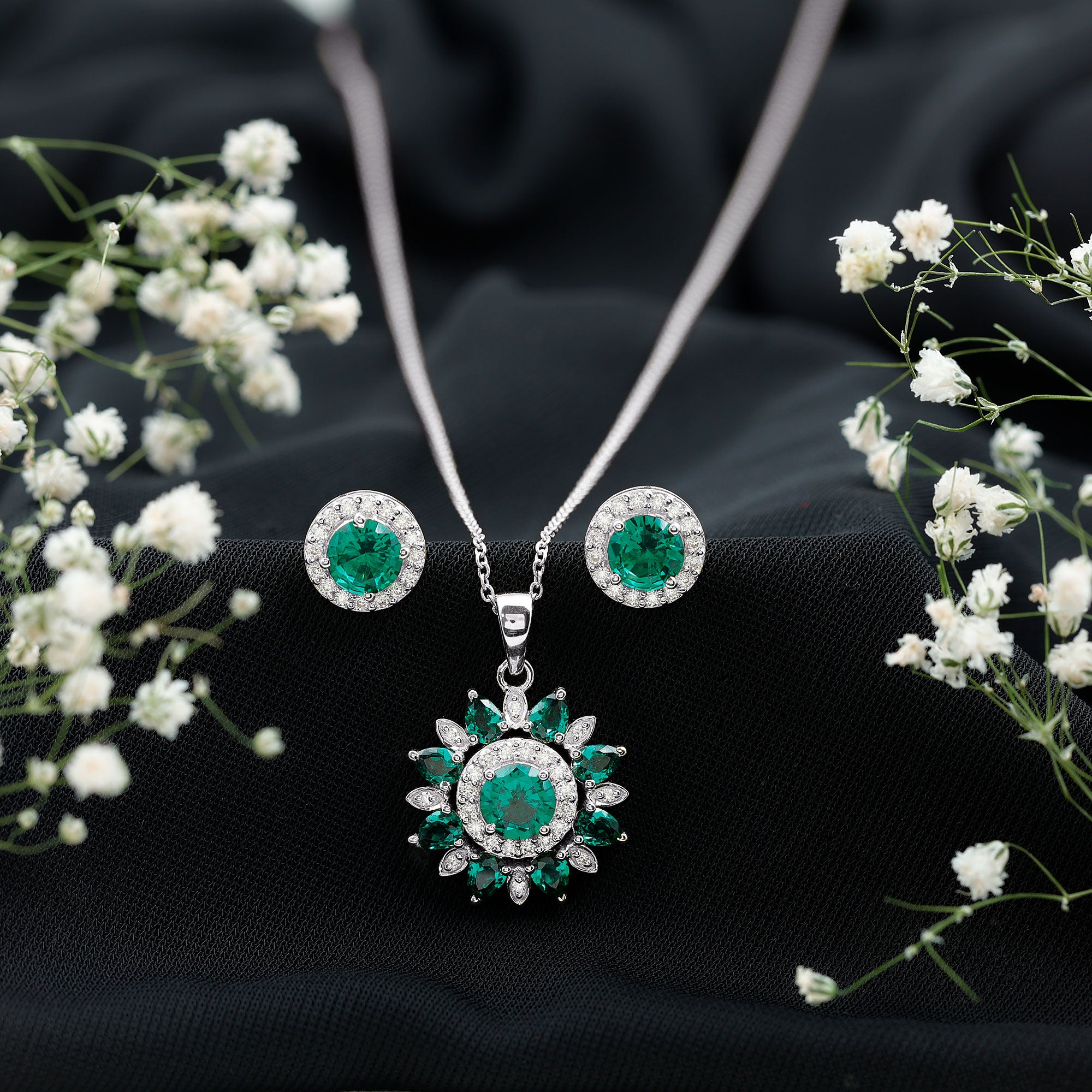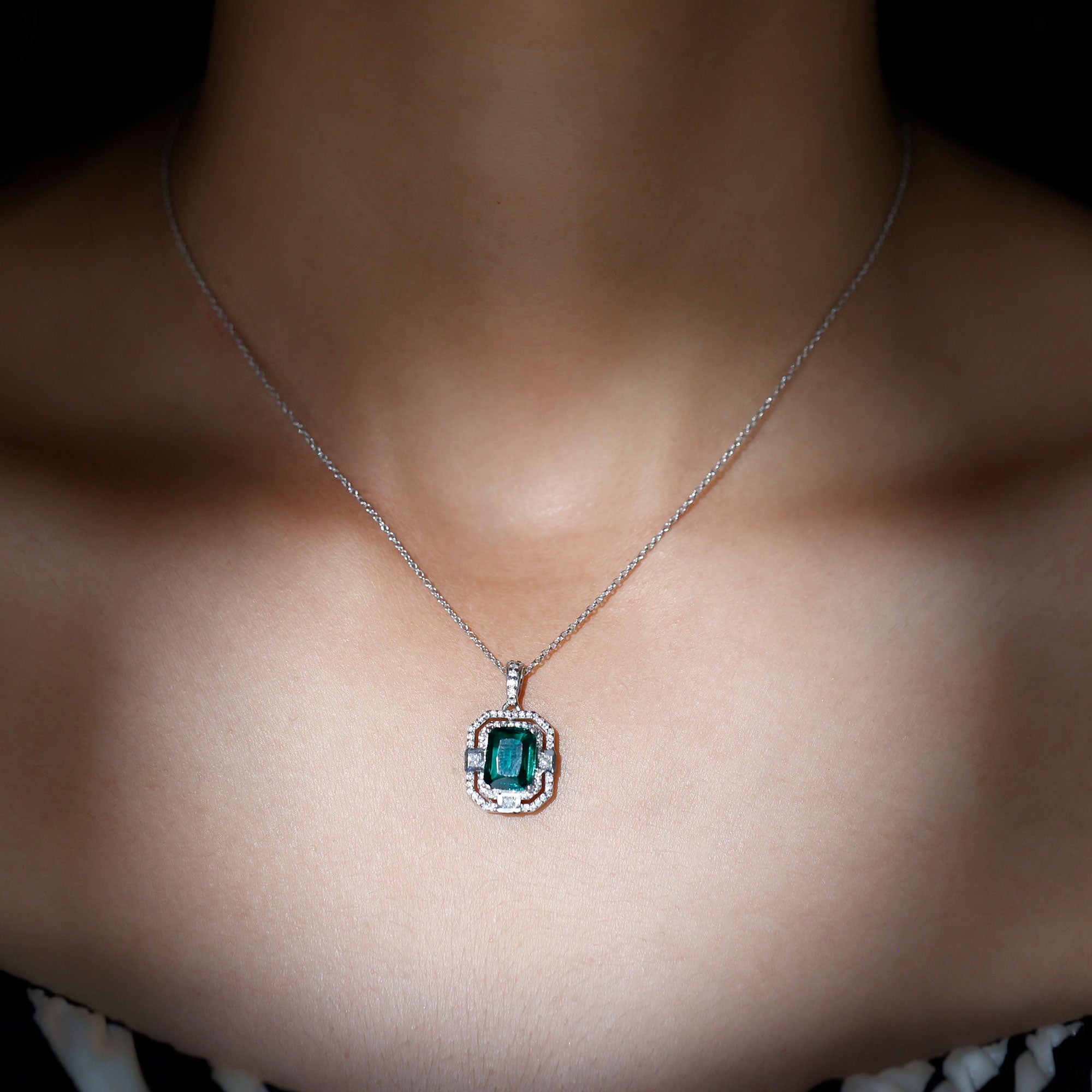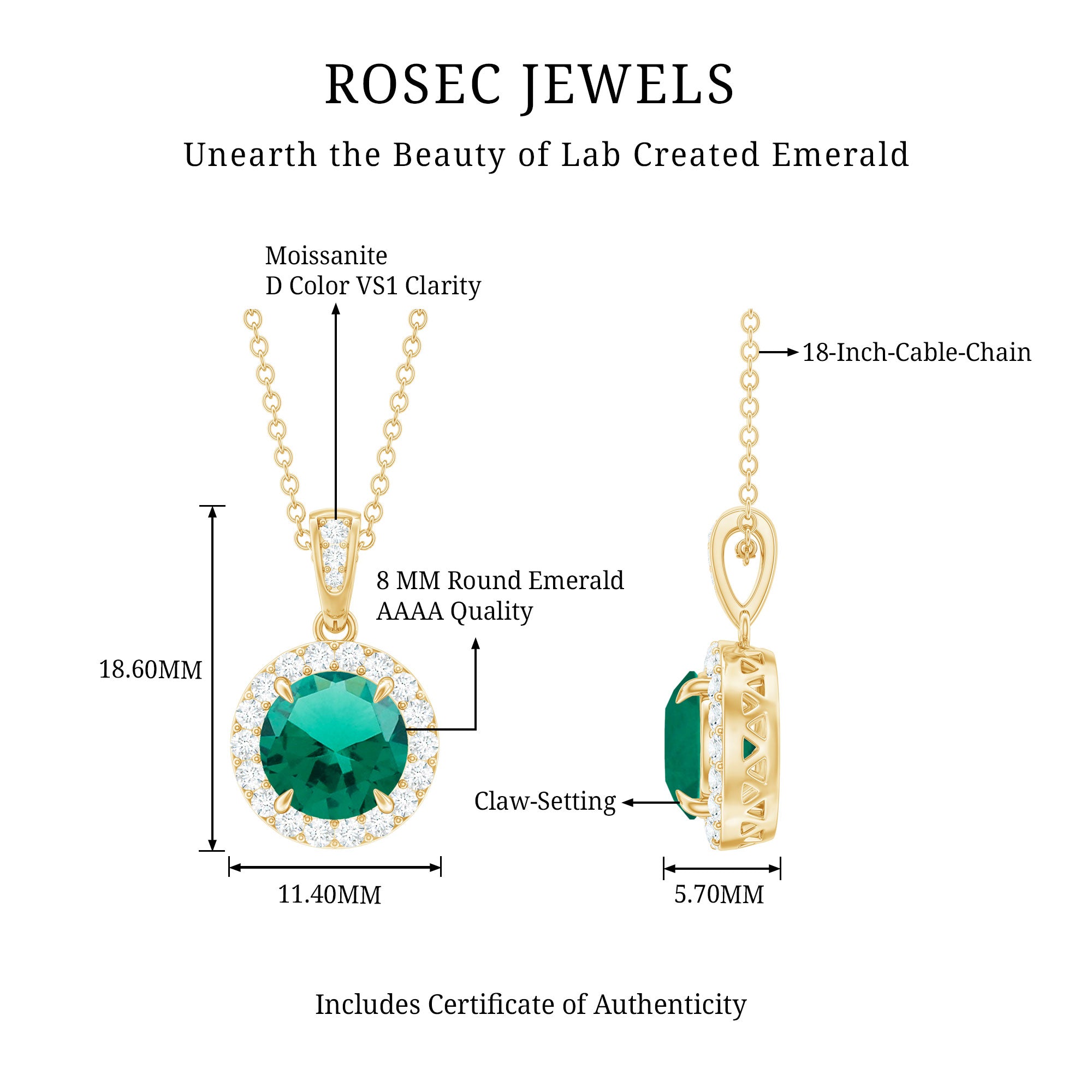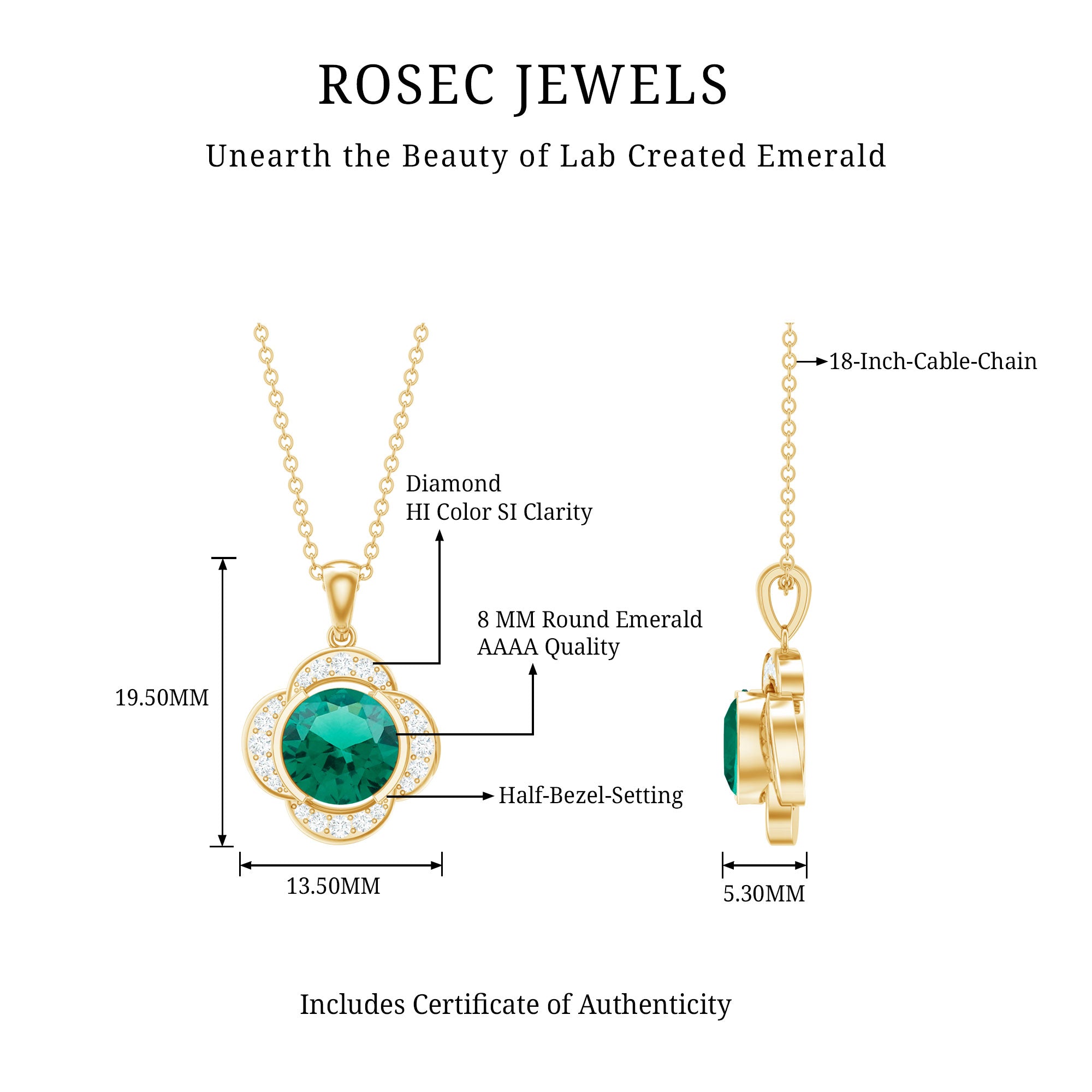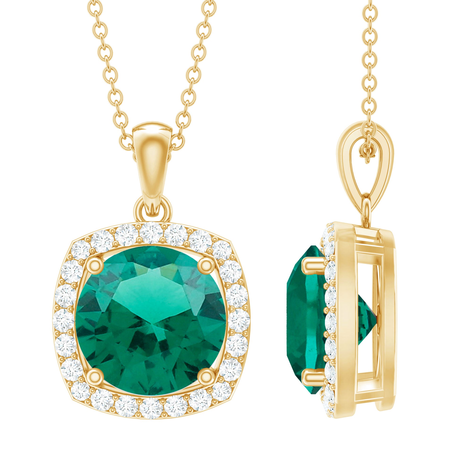Created Emerald halo necklace design is all about a lab emerald gemstone in the center protected by small shining gemstones for added sparkle or colored gemstones for a more vibrant look. These stylish neck pieces can add a touch of glamour to any look.