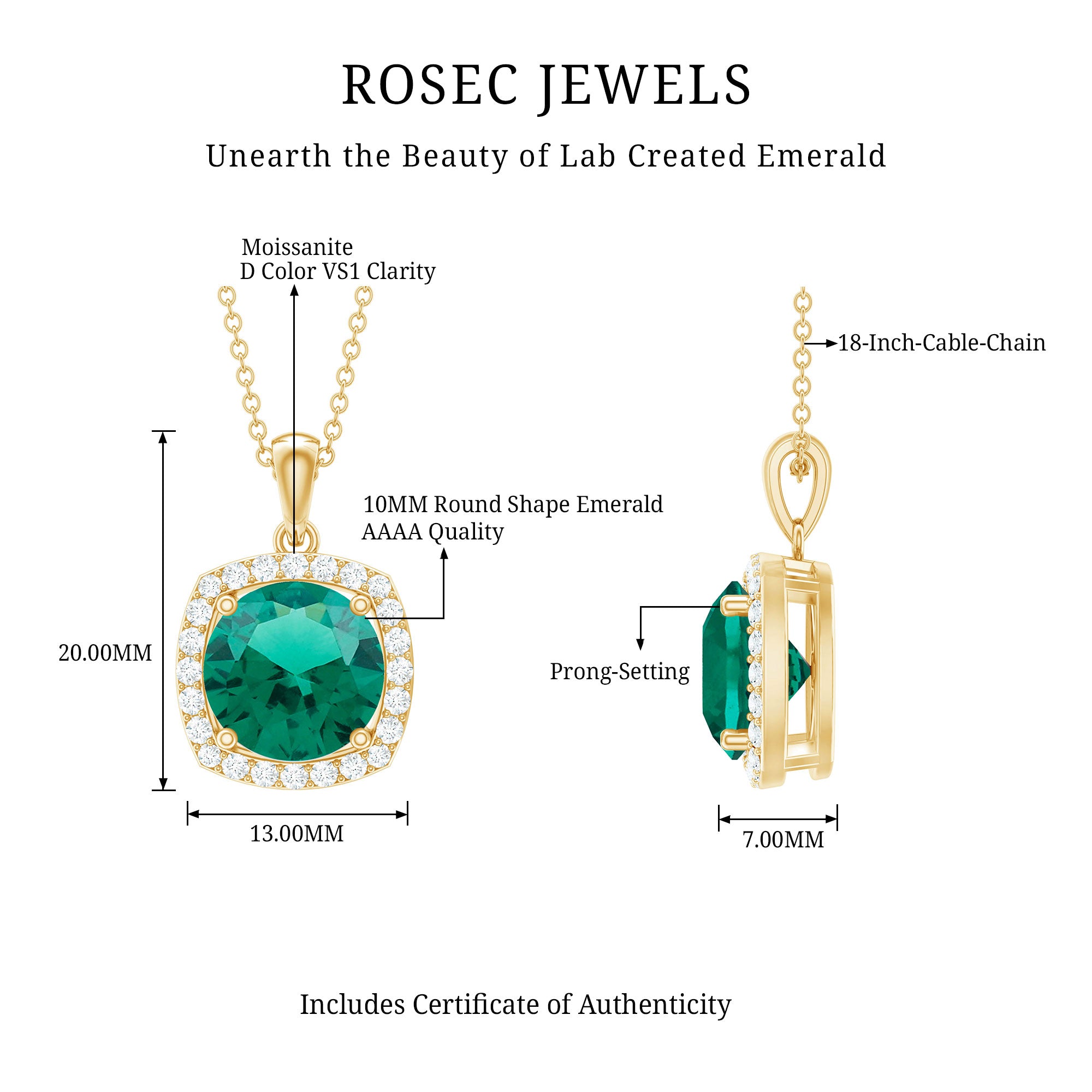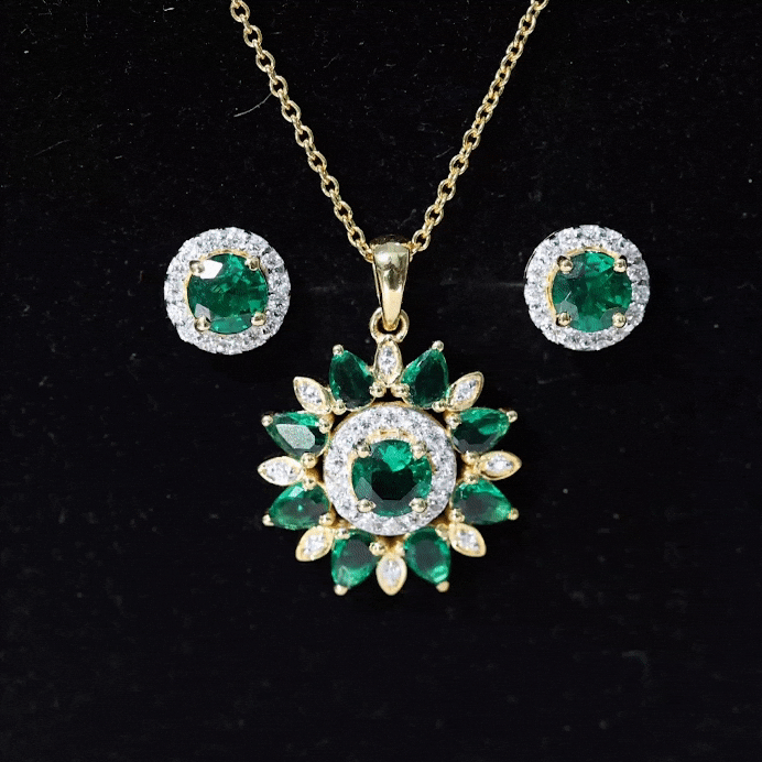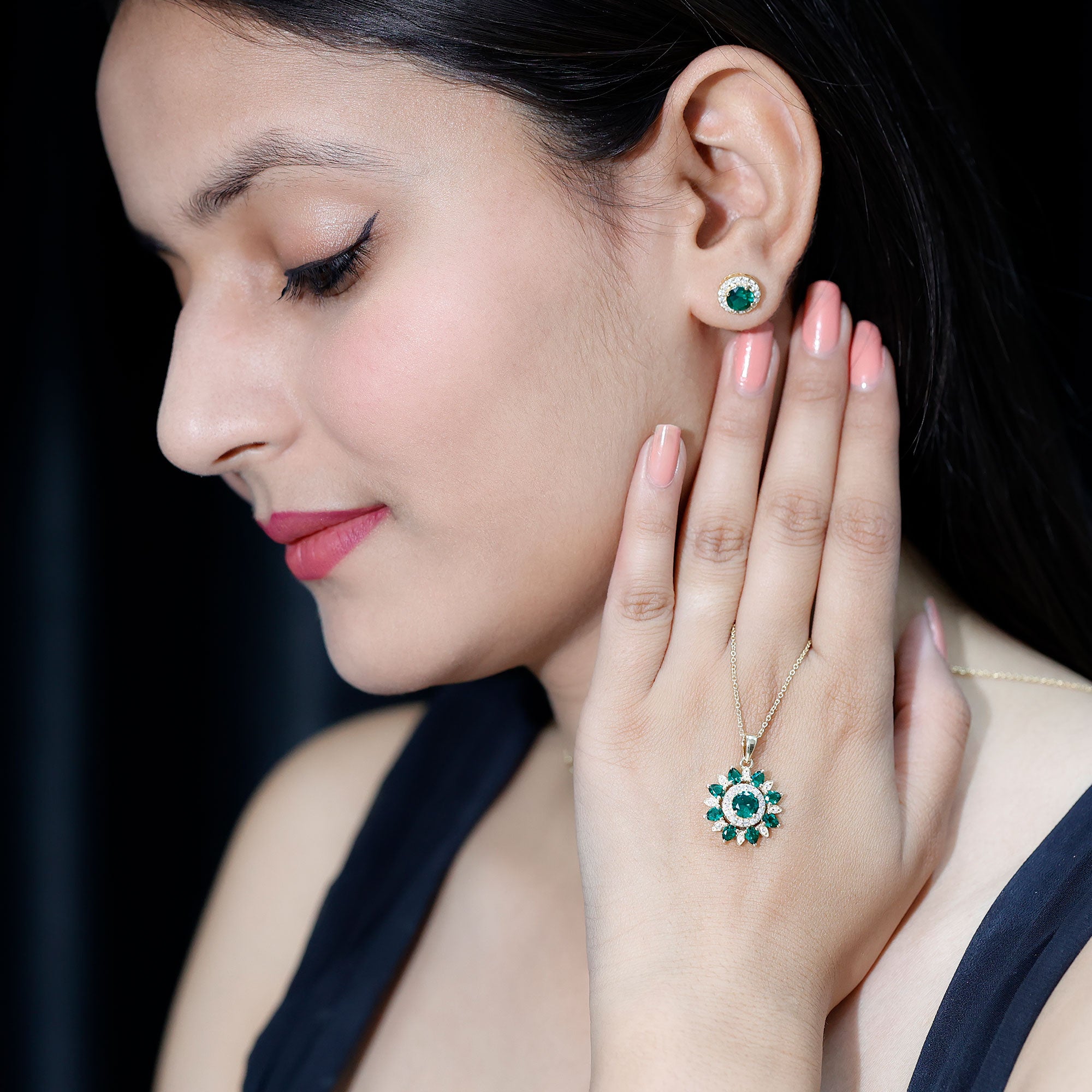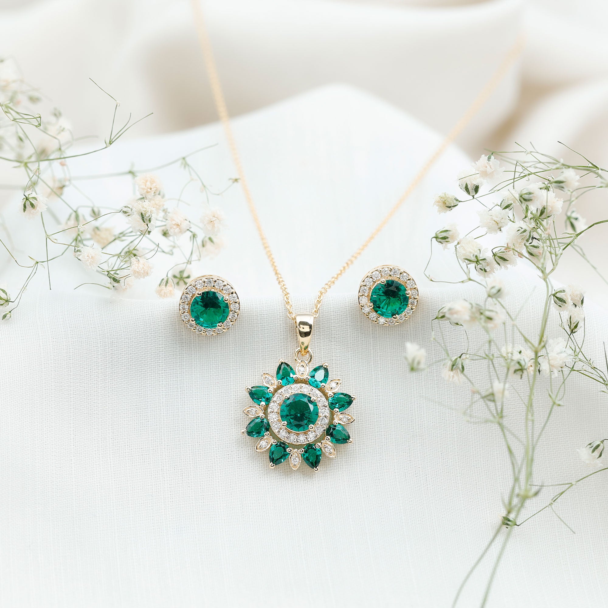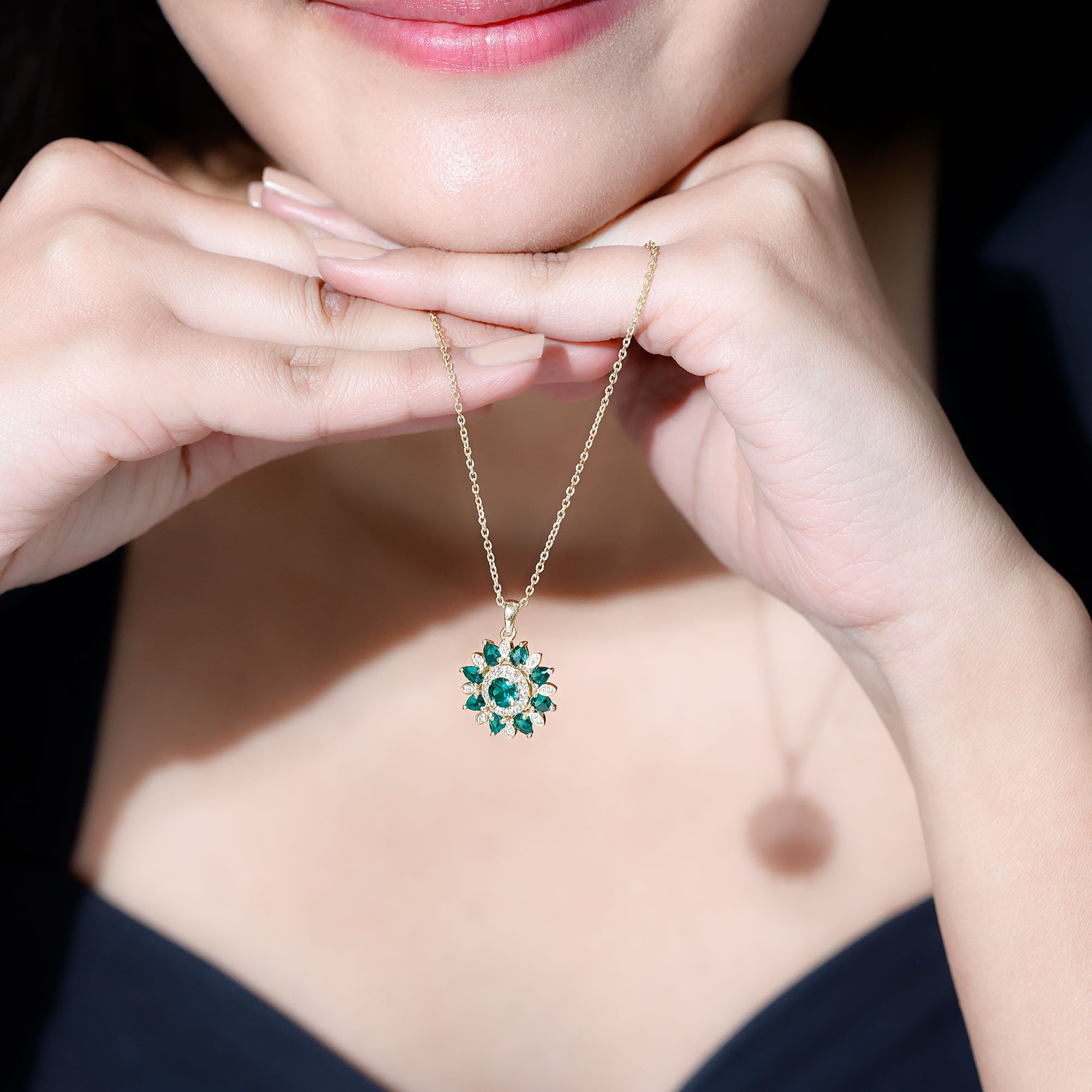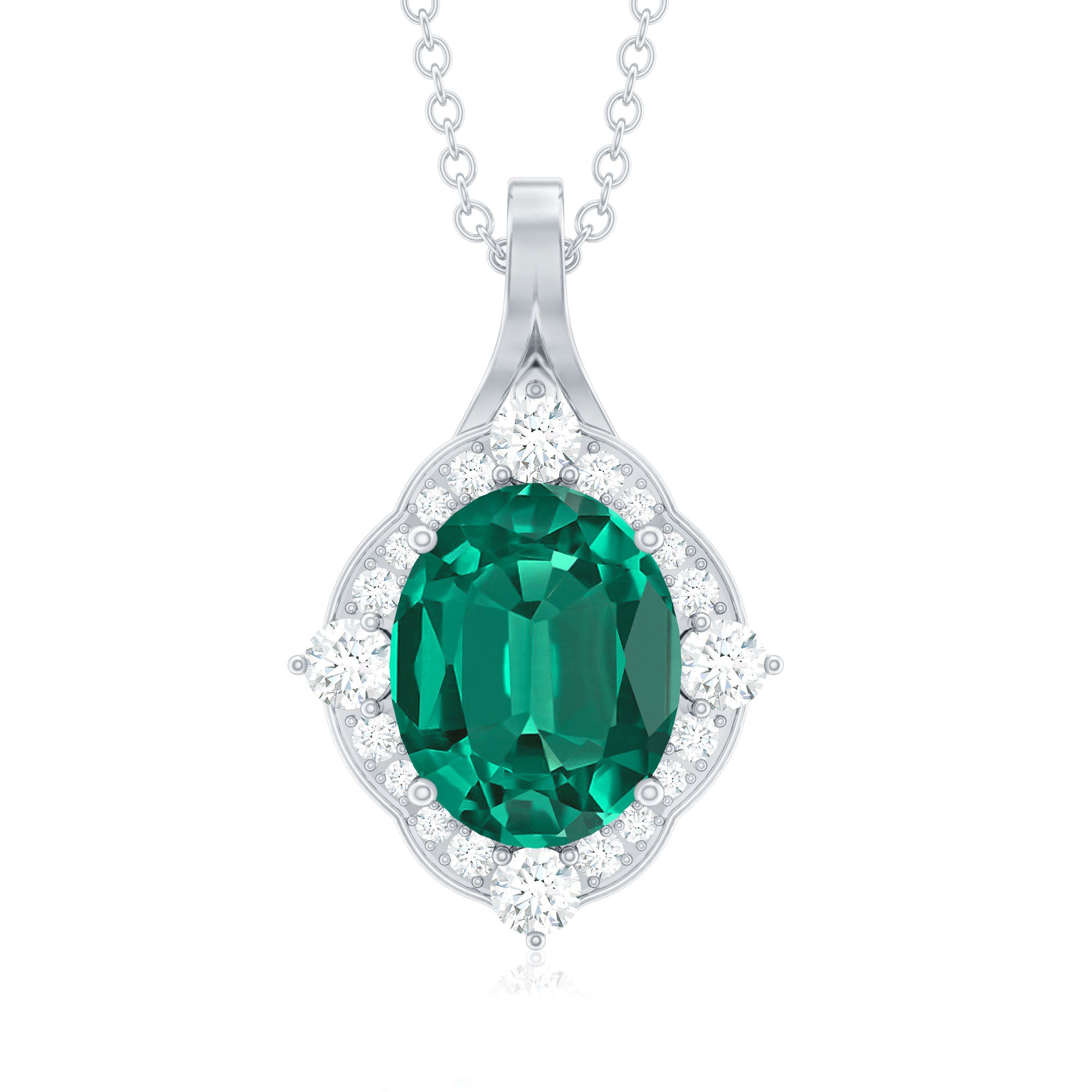 Created Emerald halo necklace design is all about a lab emerald gemstone in the center protected by small shining gemstones for added sparkle or colored gemstones for a more vibrant look. These stylish neck pieces can add a touch of glamour to any look.