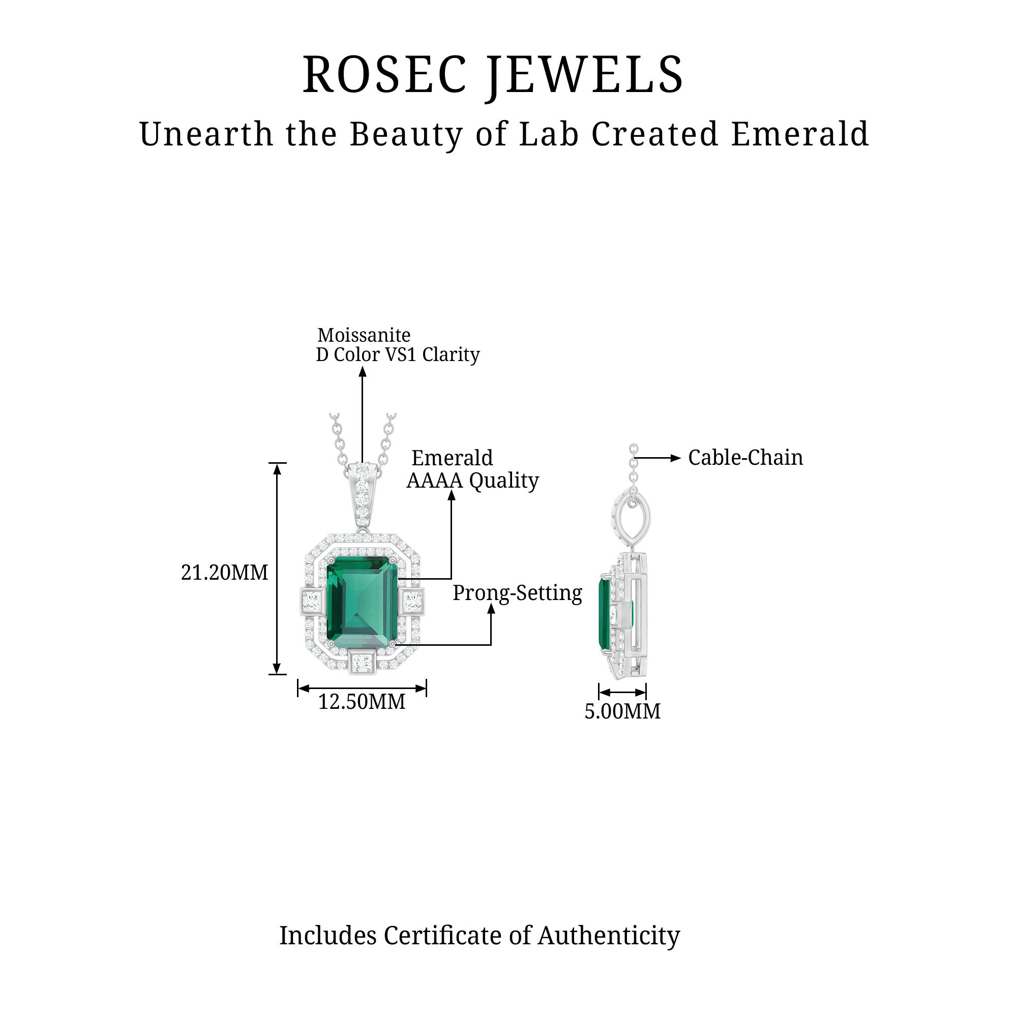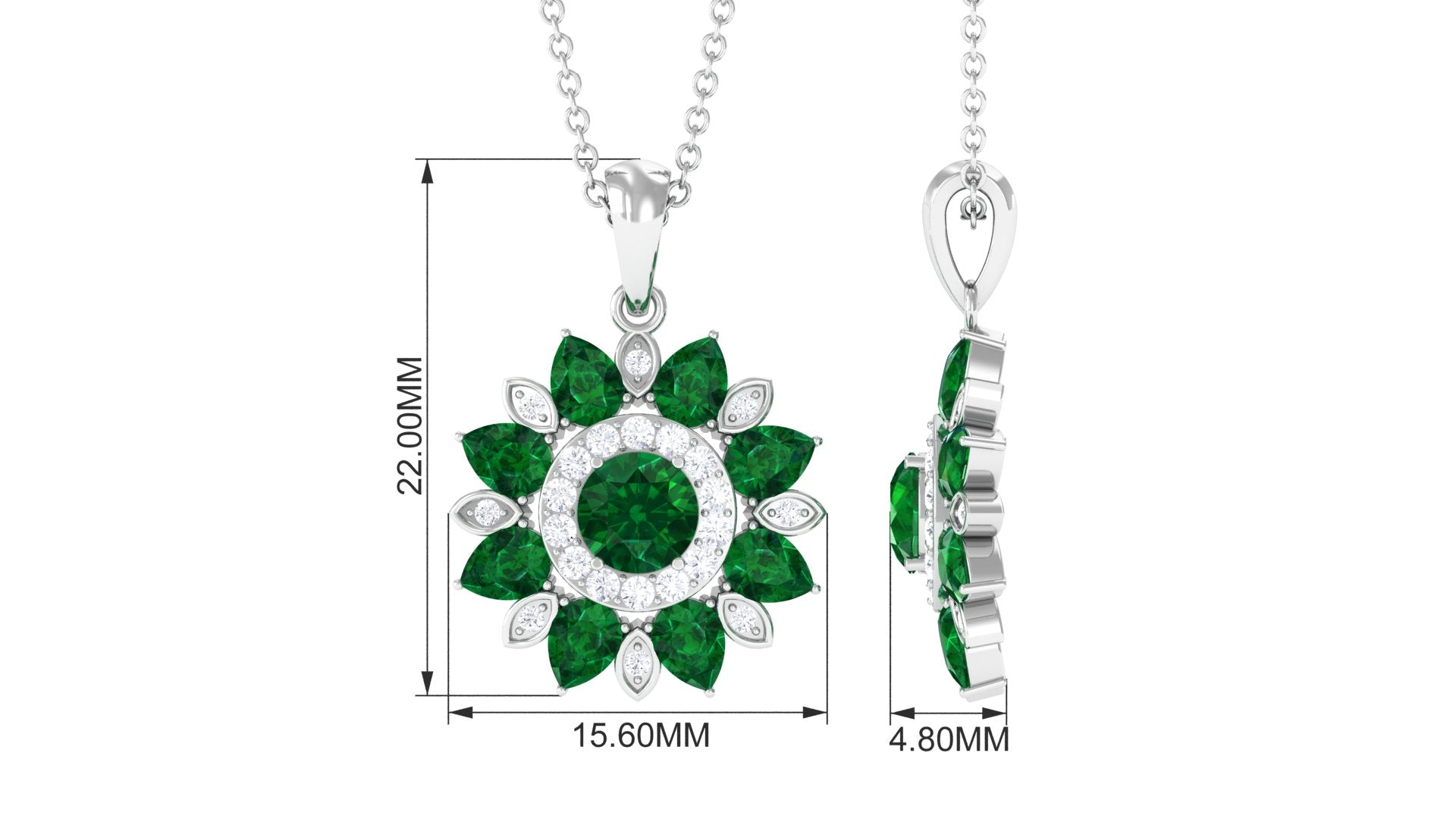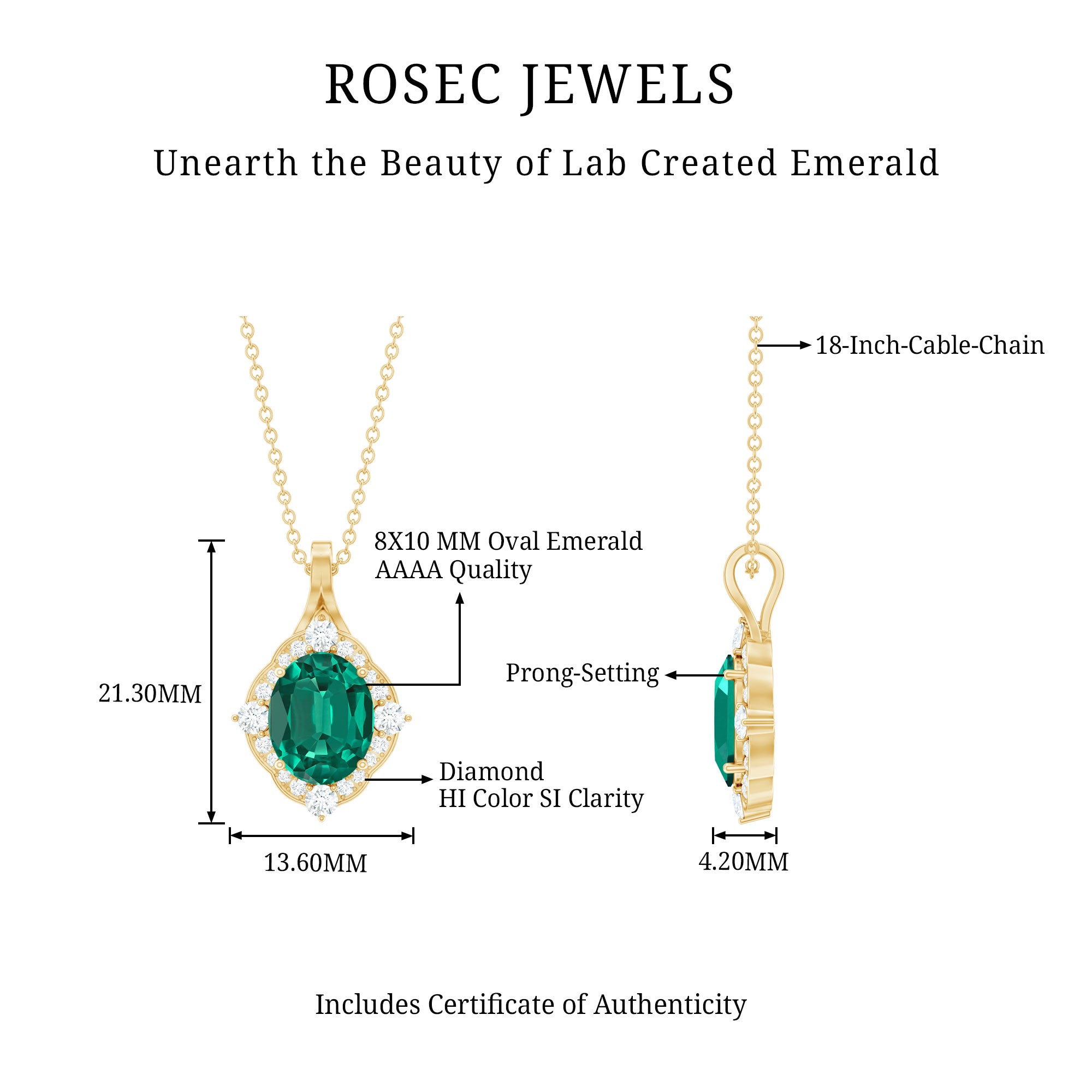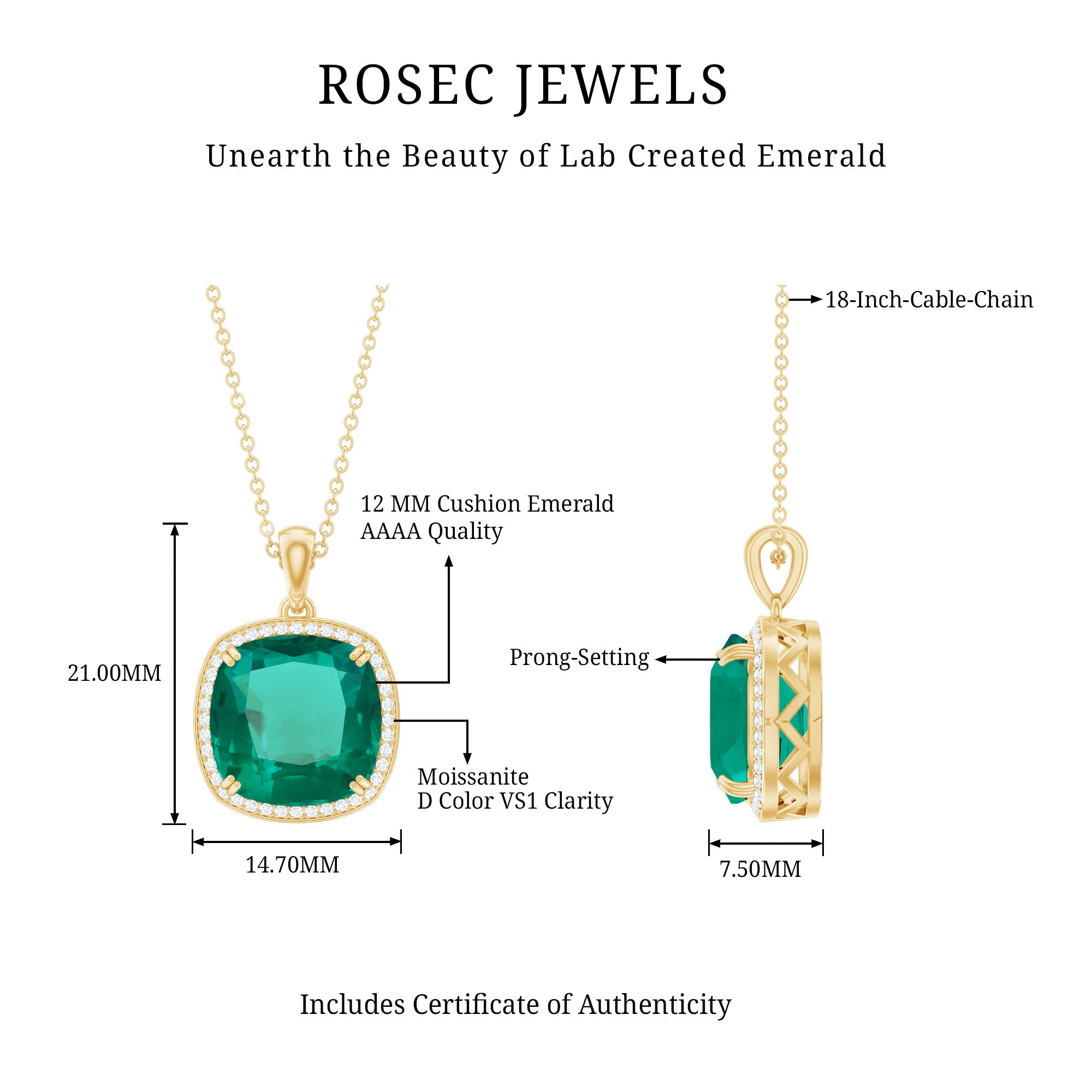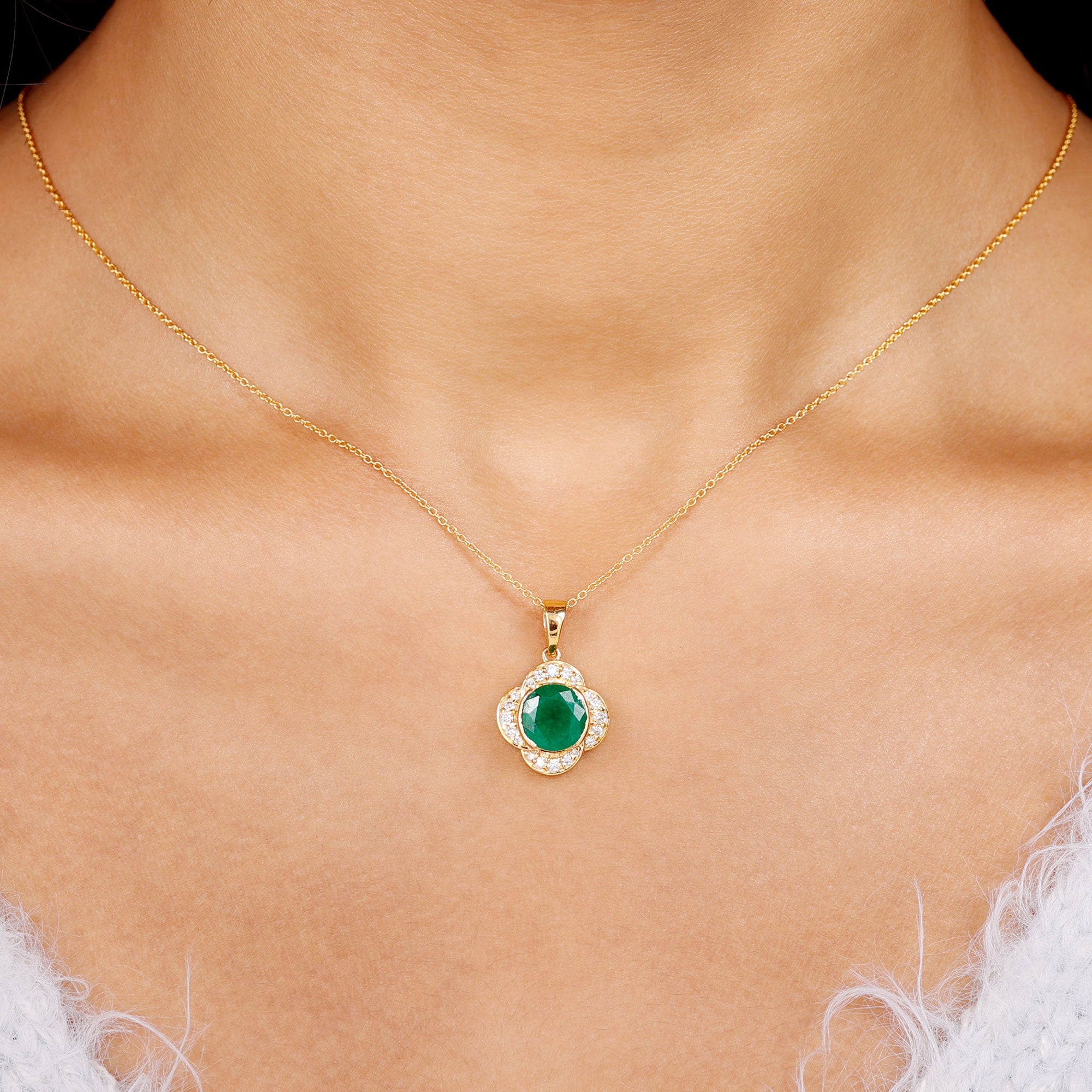 Created Emerald halo necklace design is all about a lab emerald gemstone in the center protected by small shining gemstones for added sparkle or colored gemstones for a more vibrant look. These stylish neck pieces can add a touch of glamour to any look.