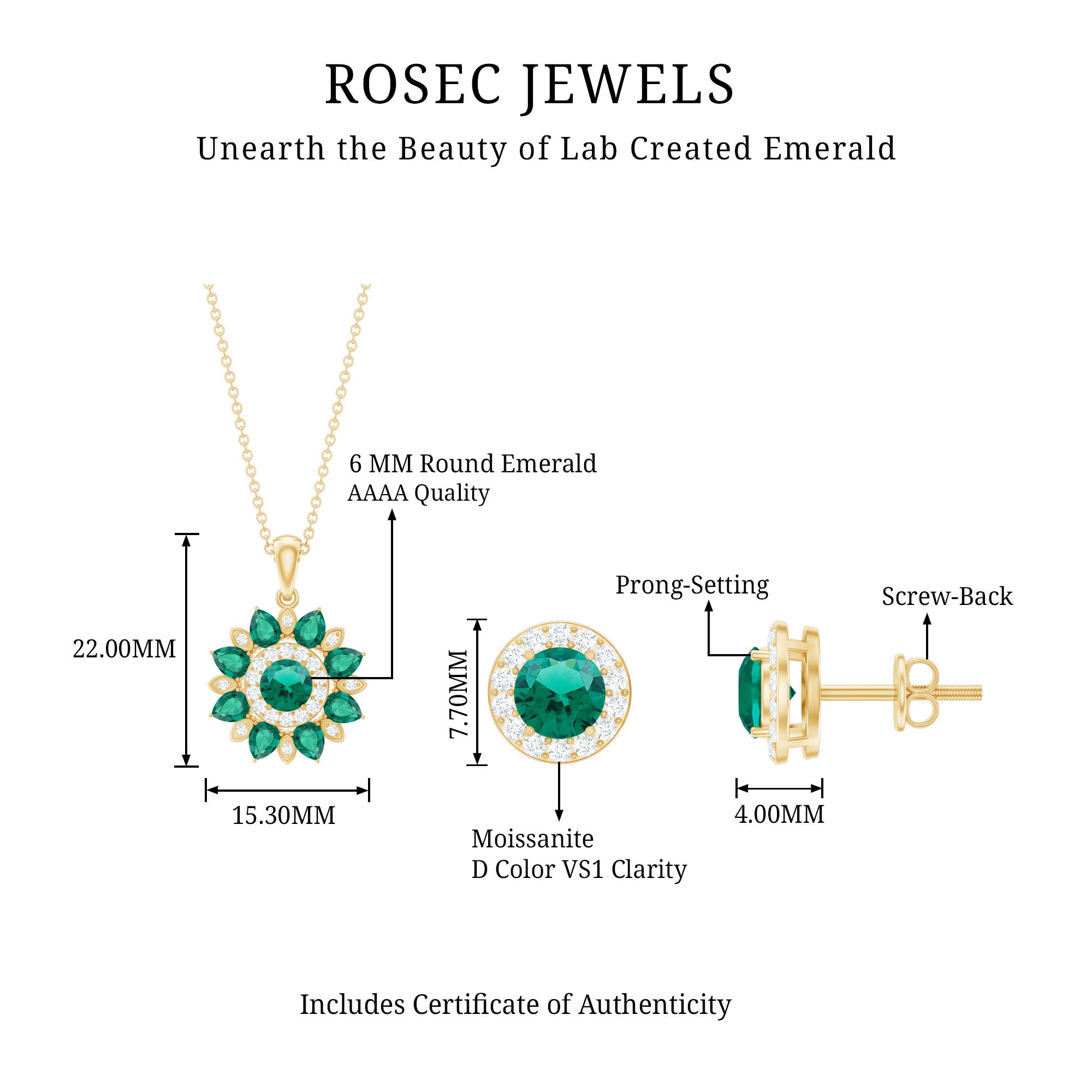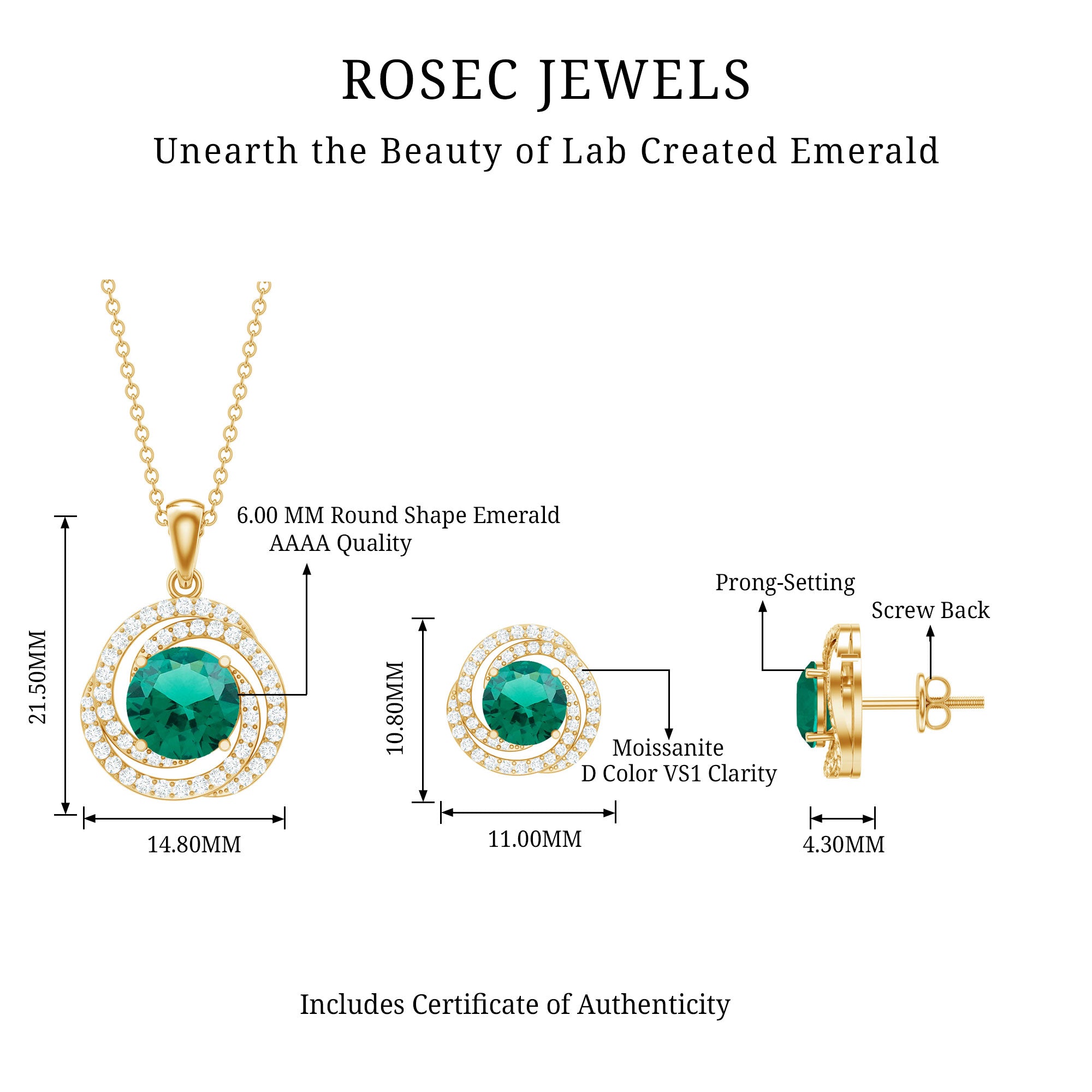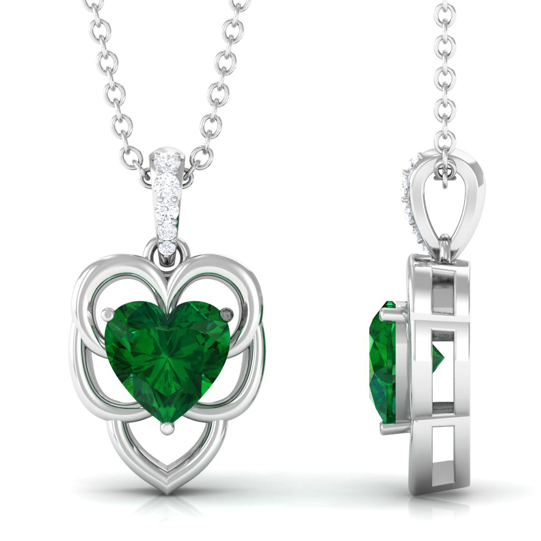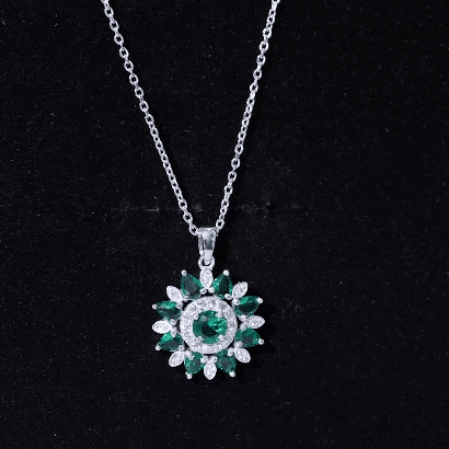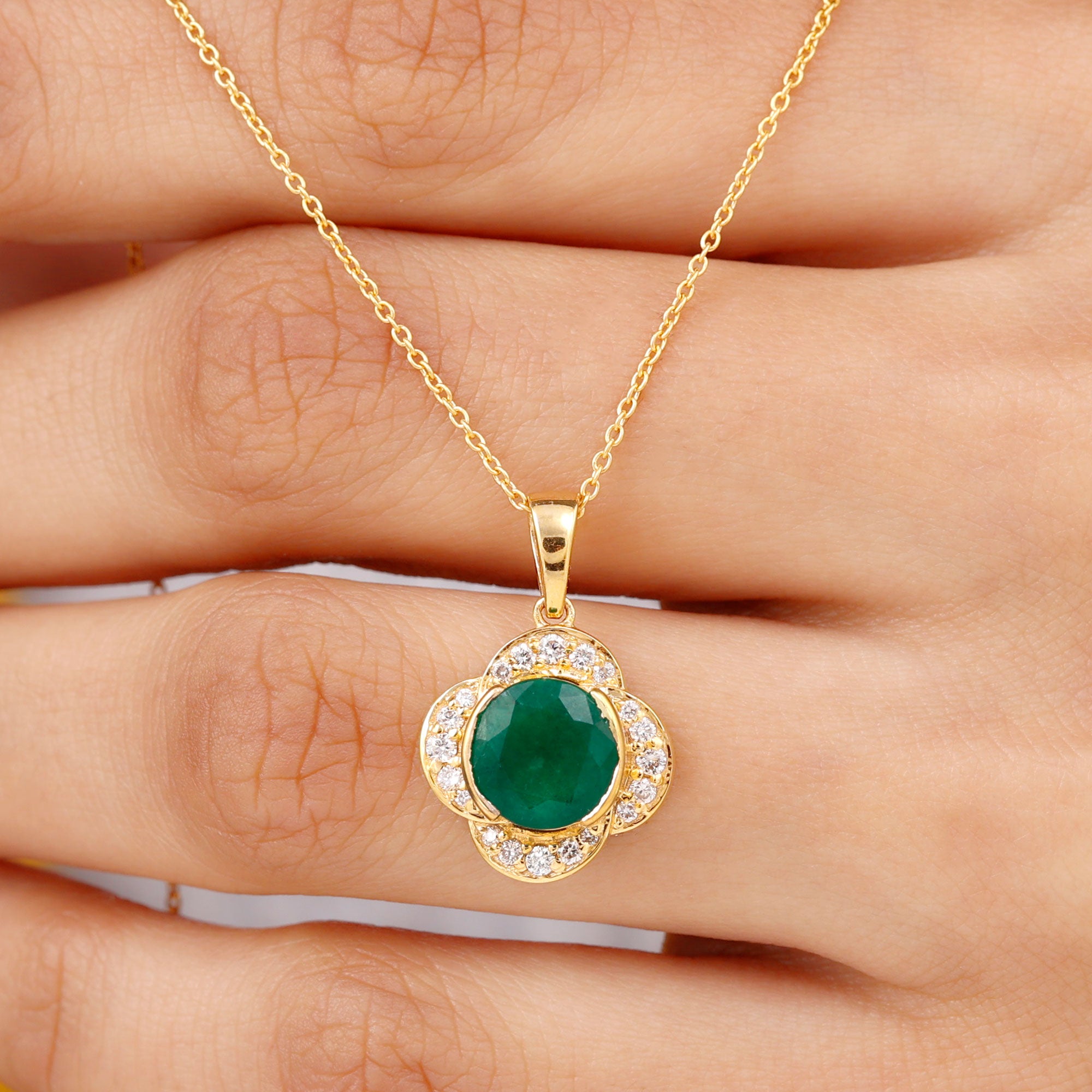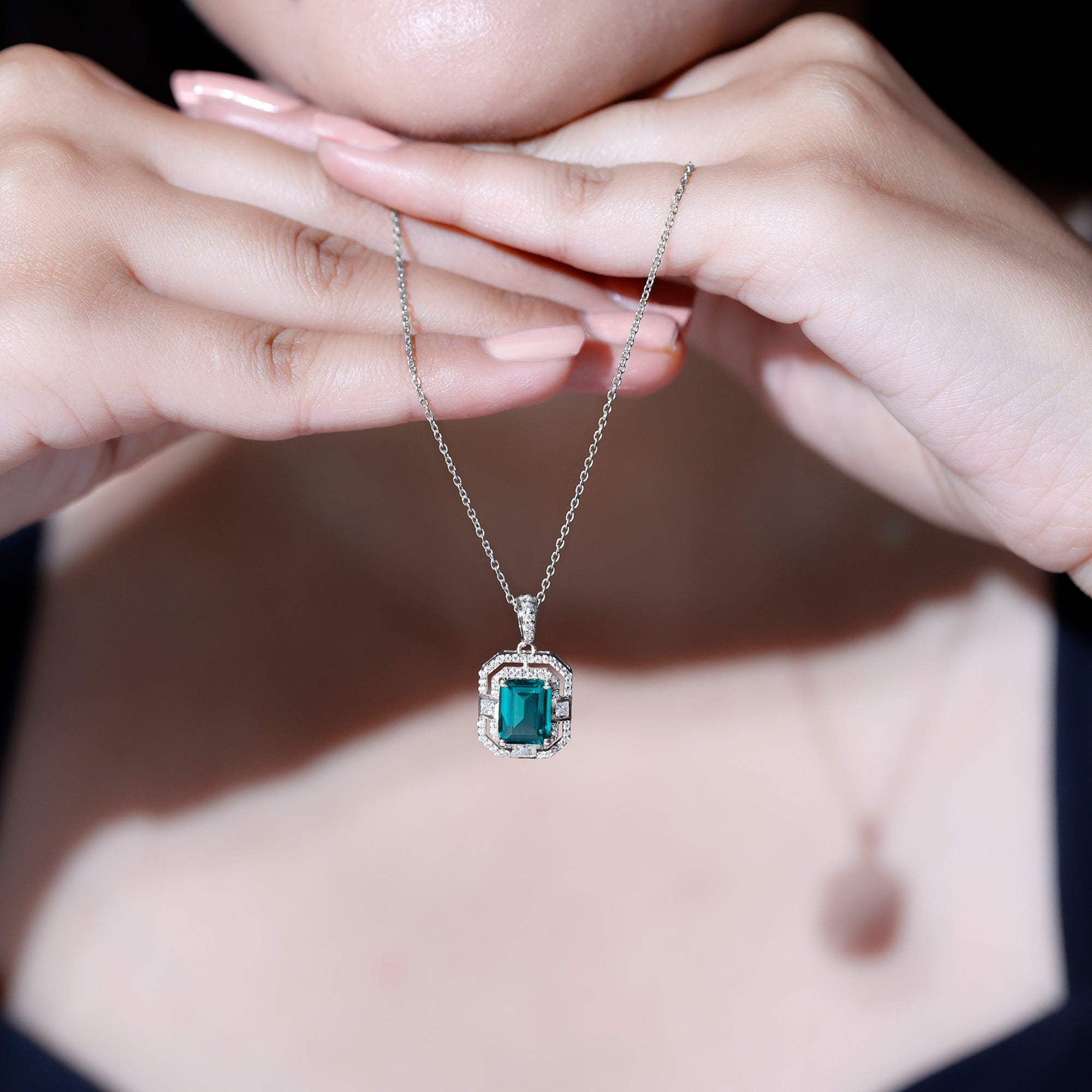 Created Emerald halo necklace design is all about a lab emerald gemstone in the center protected by small shining gemstones for added sparkle or colored gemstones for a more vibrant look. These stylish neck pieces can add a touch of glamour to any look.