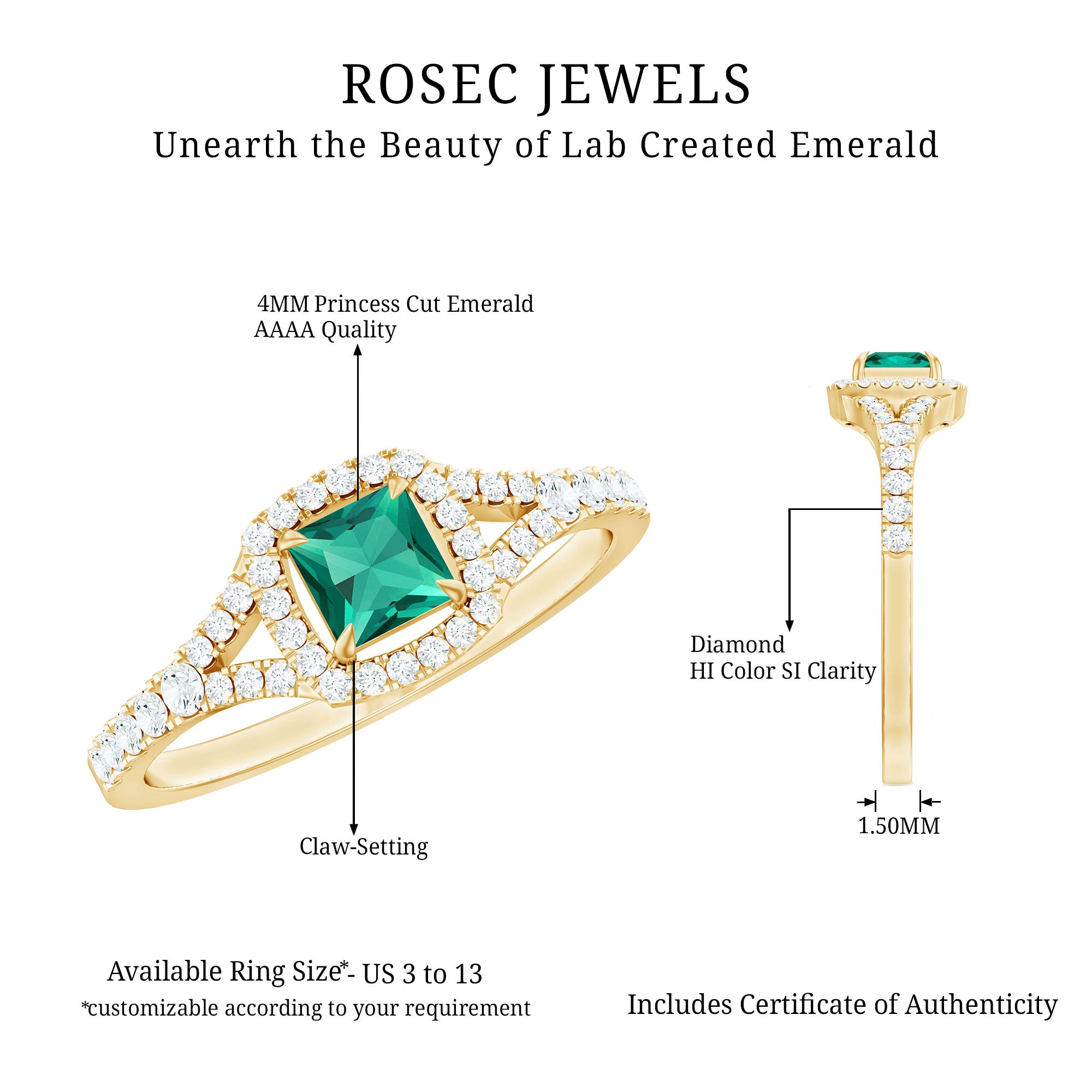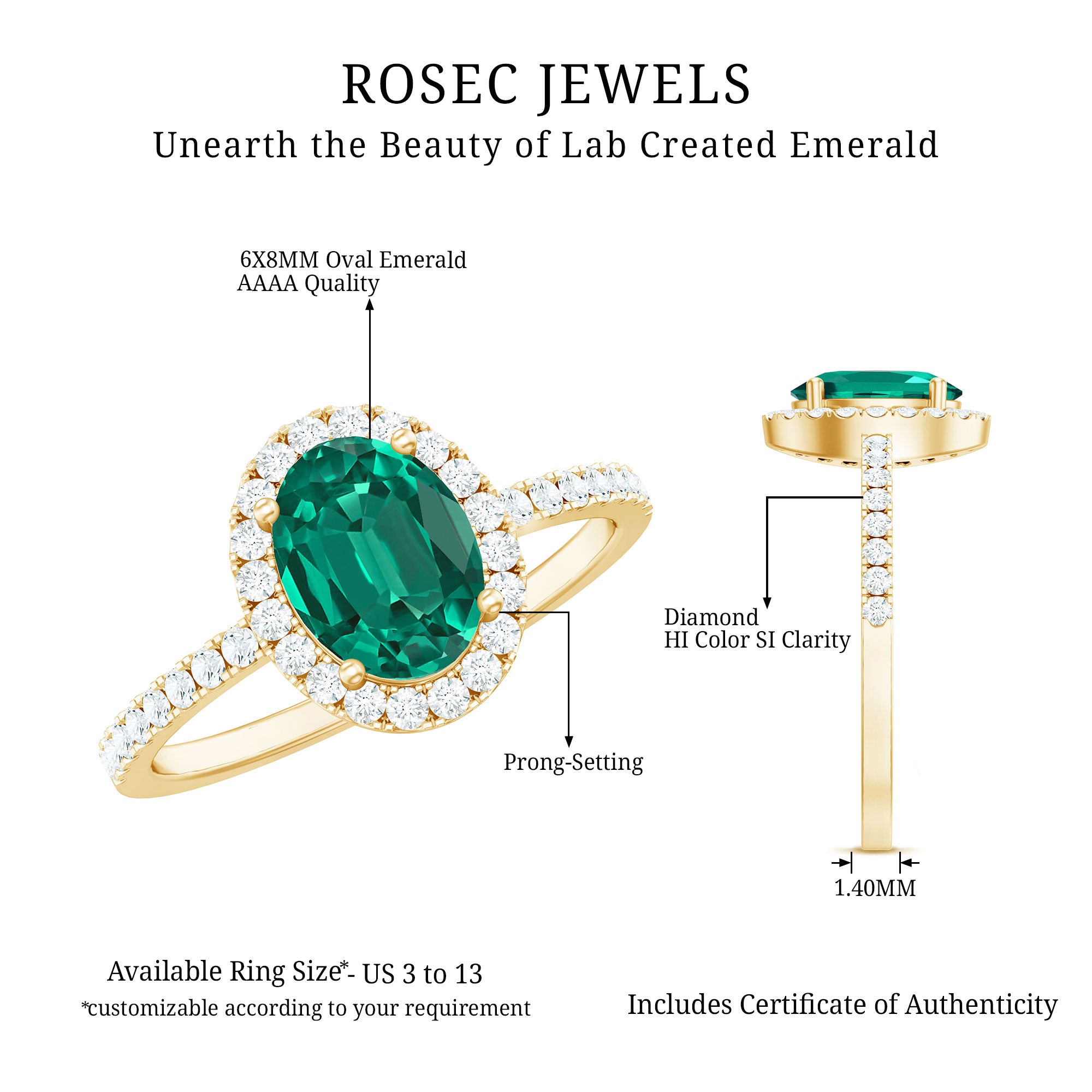 At Rosec Jewels, every piece is crafted with a focus on lasting wear and refined design. For lab grown emerald rings, we prioritize setting security and balanced proportions across everyday and statement styles. We provide our own certificate of stone authenticity/details with purchase.